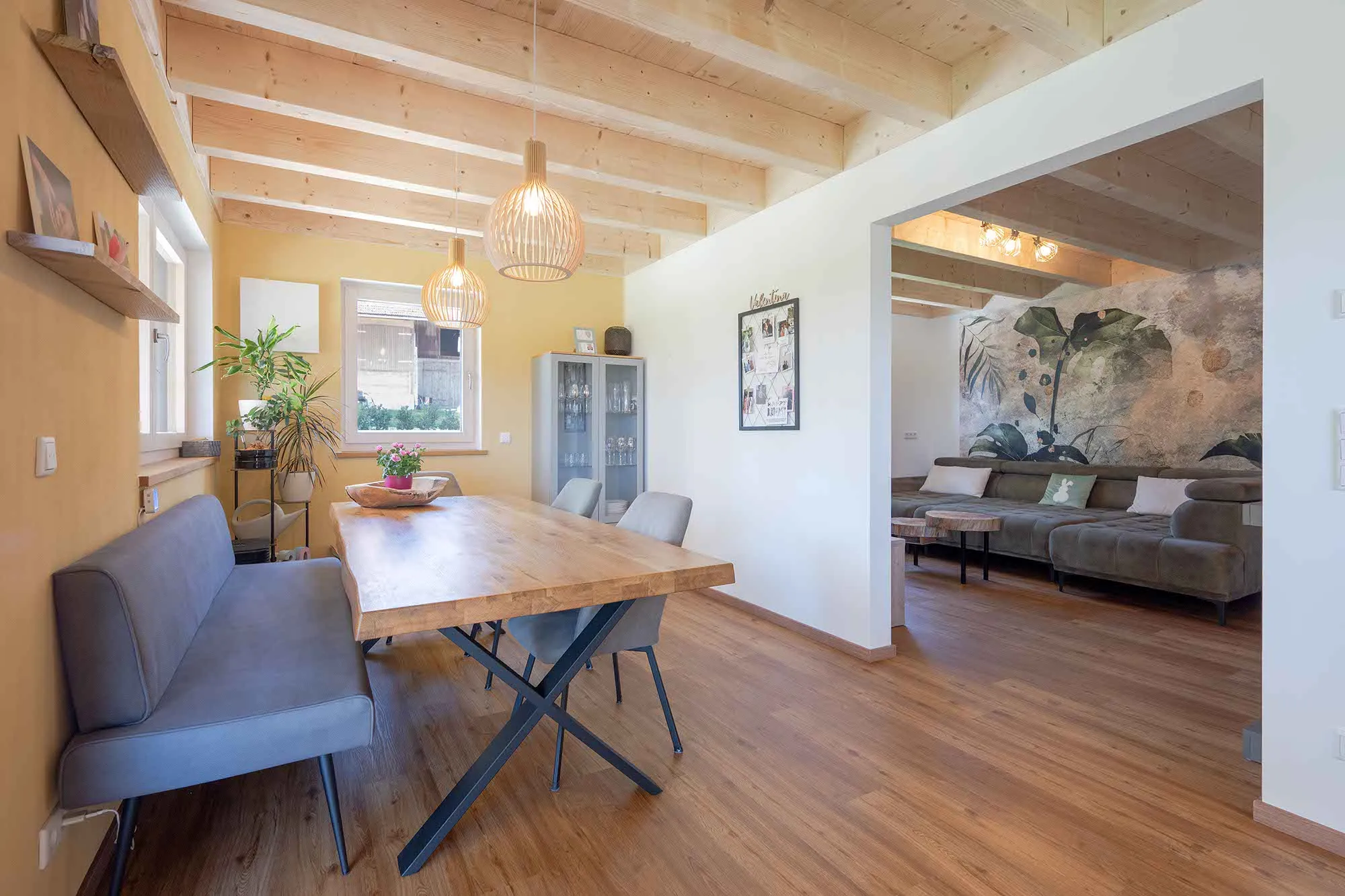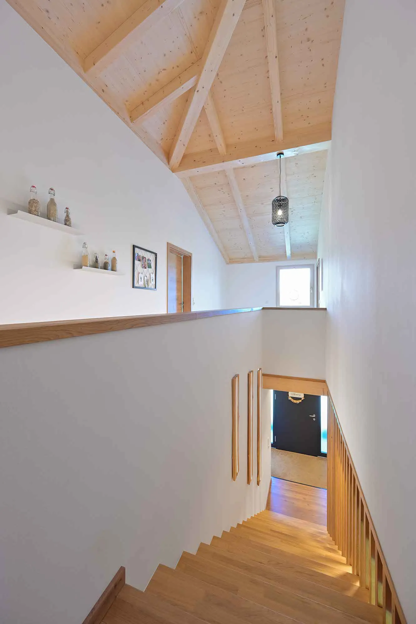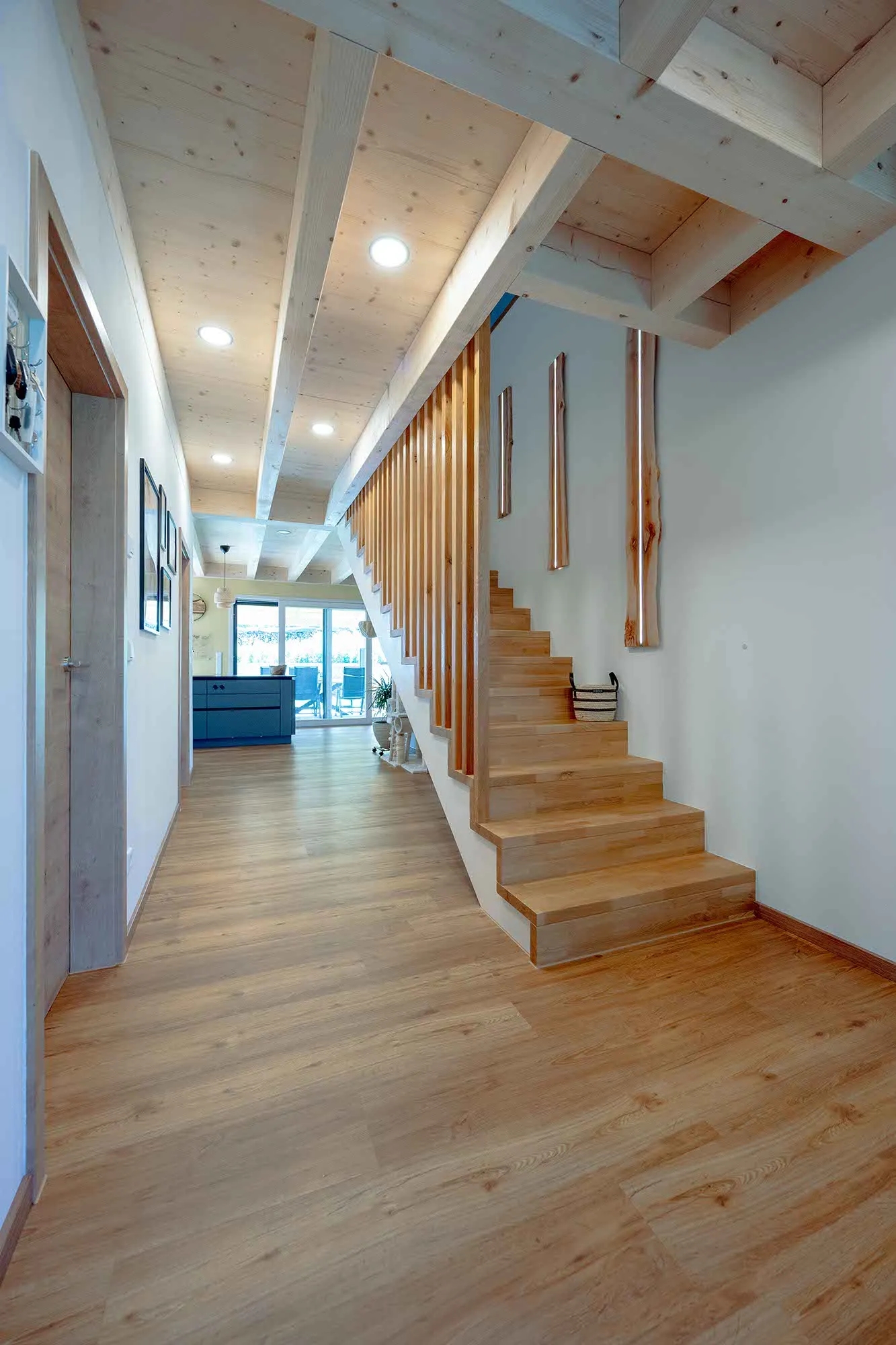 Treppe mit Harfengeländer, Technikraum und Abstellraum in Garage integriert, Tapetenwand im Wohnzimmer