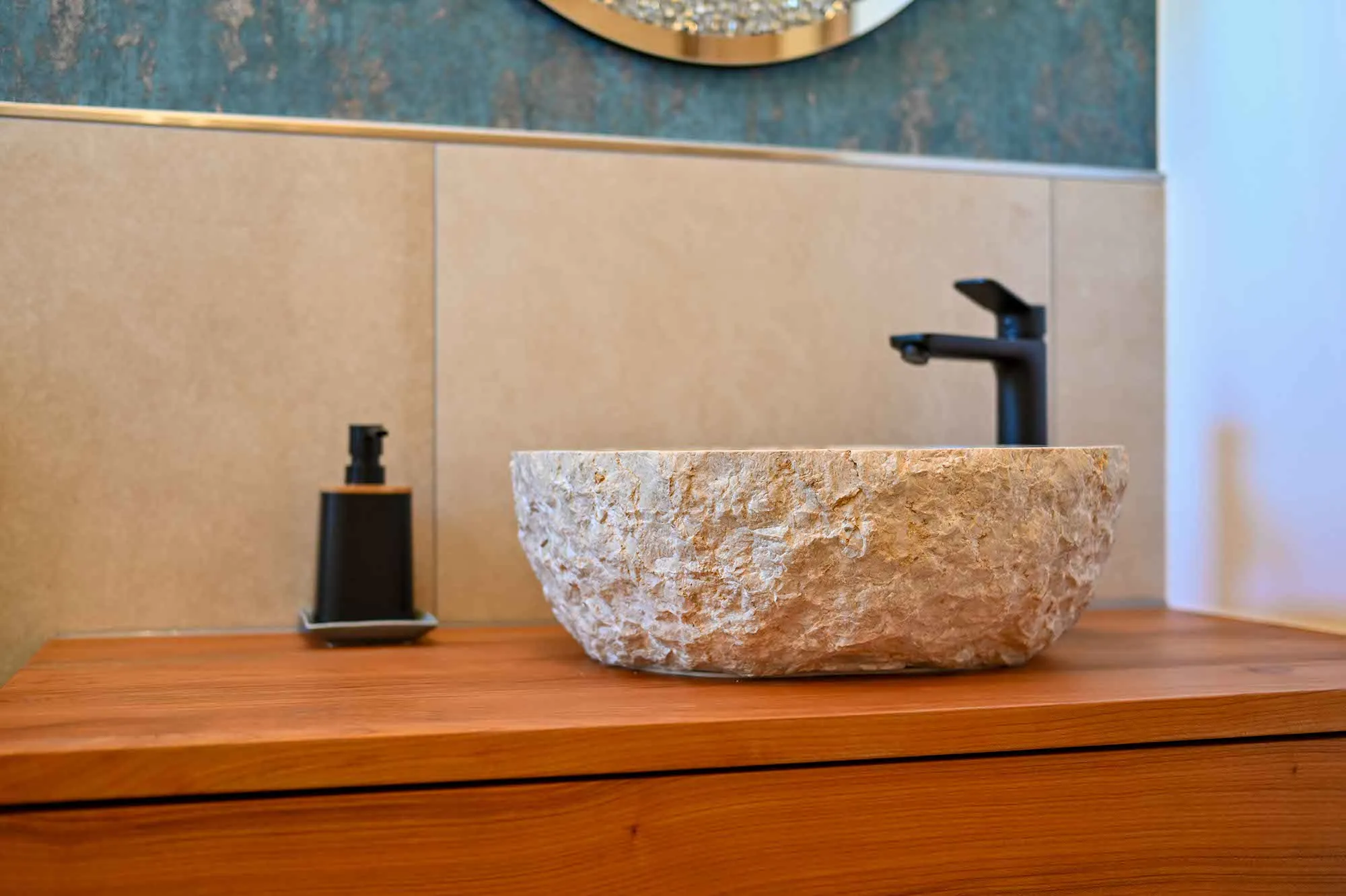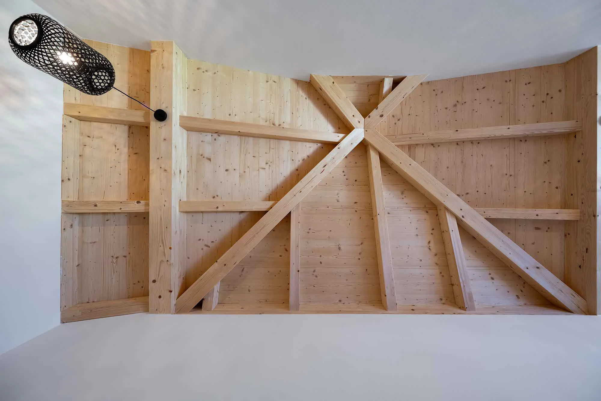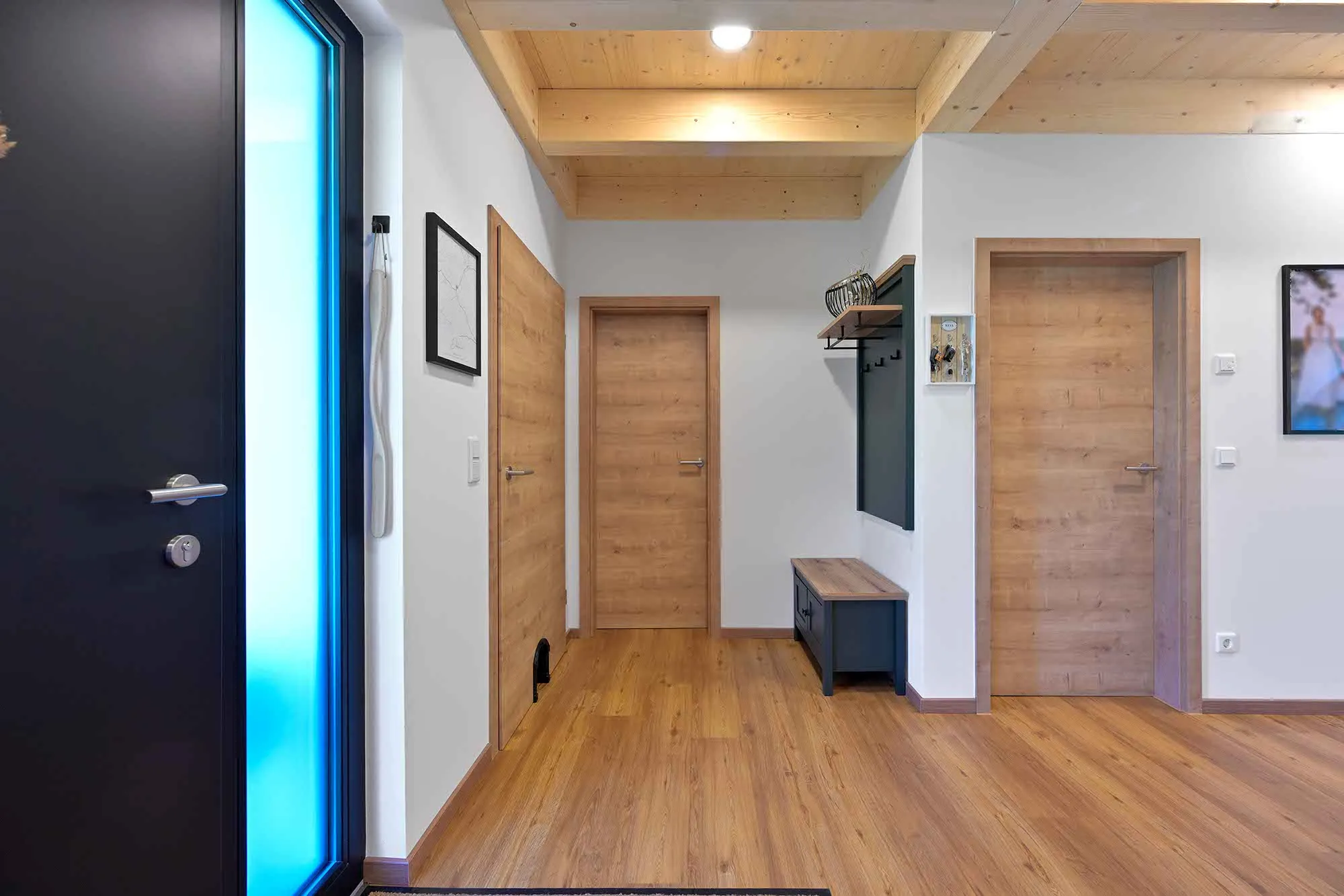 Treppe mit Harfengeländer, Technikraum und Abstellraum in Garage integriert, Tapetenwand im Wohnzimmer