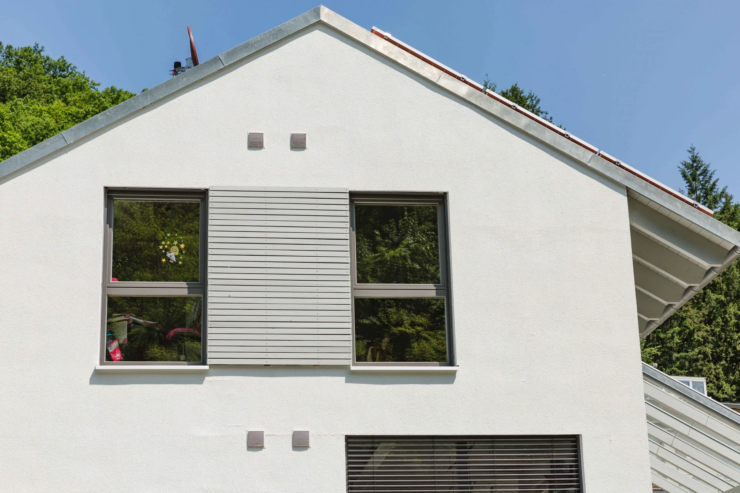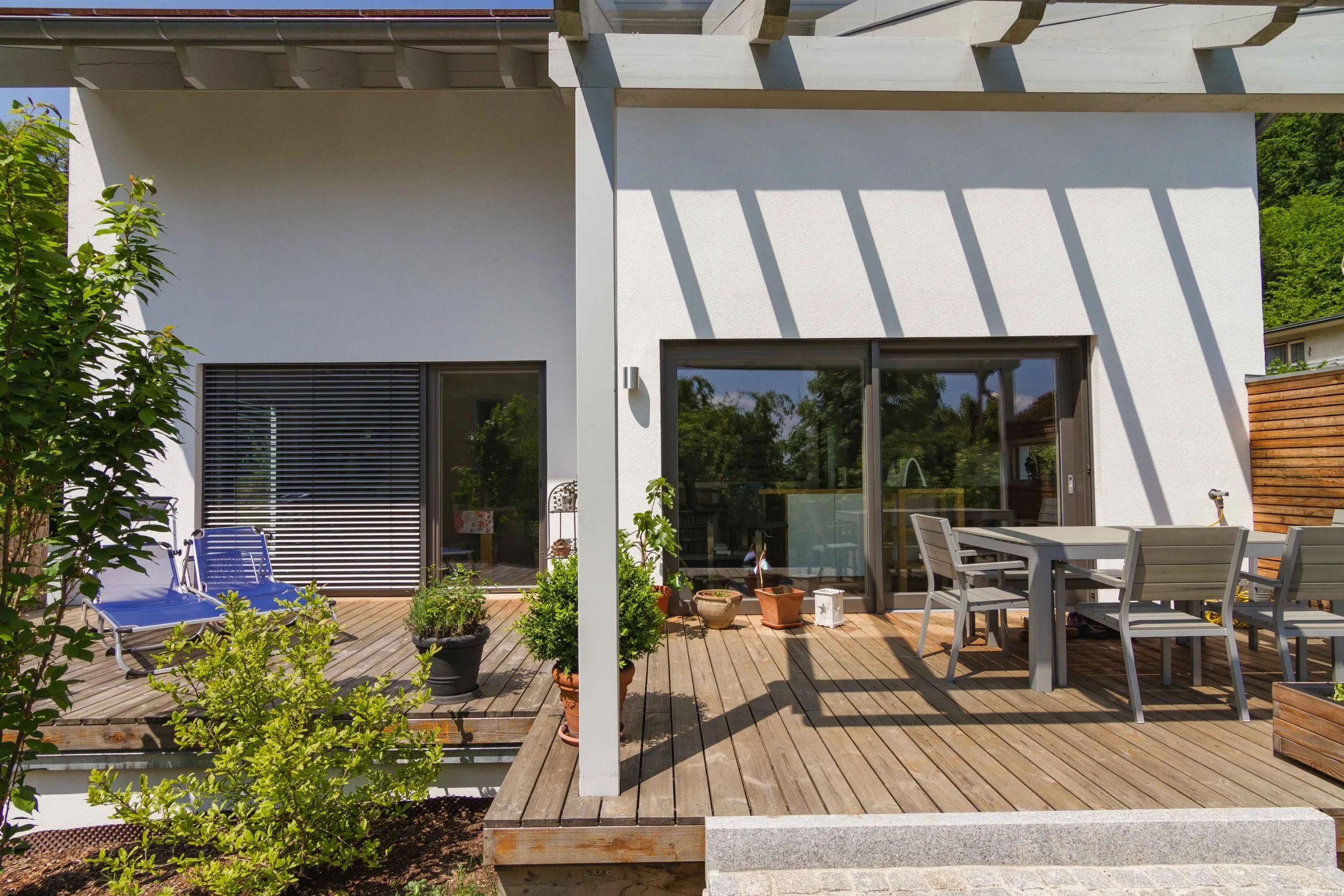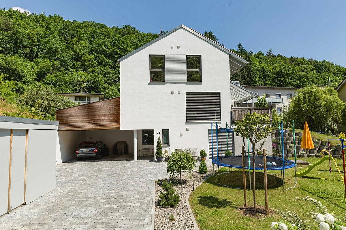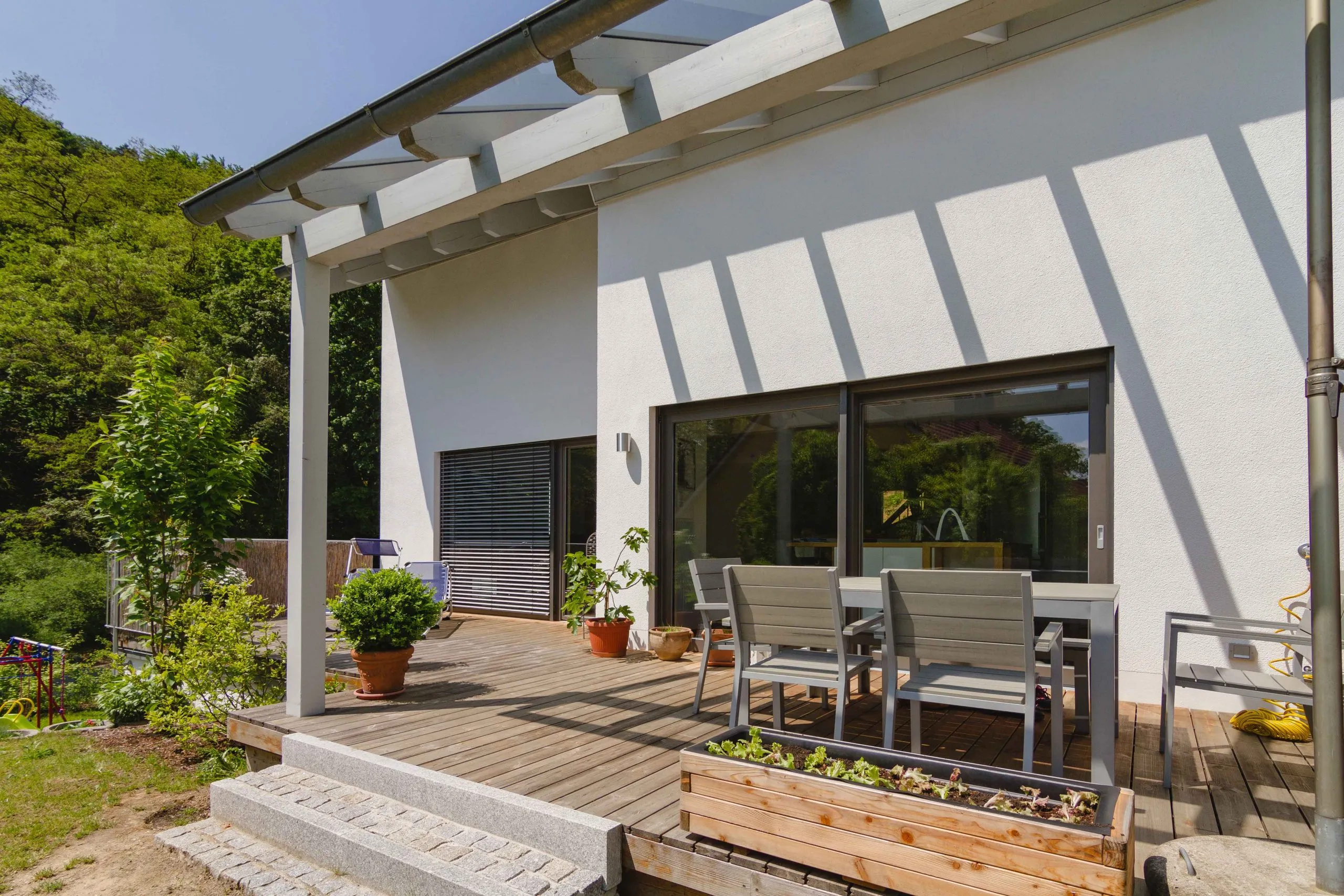 Hanghaus mit Einliegerwohnung und verlängerte Überdachung durch Glaspergola. Sichtholzelemente mit grauer Lasur gestrichen.
