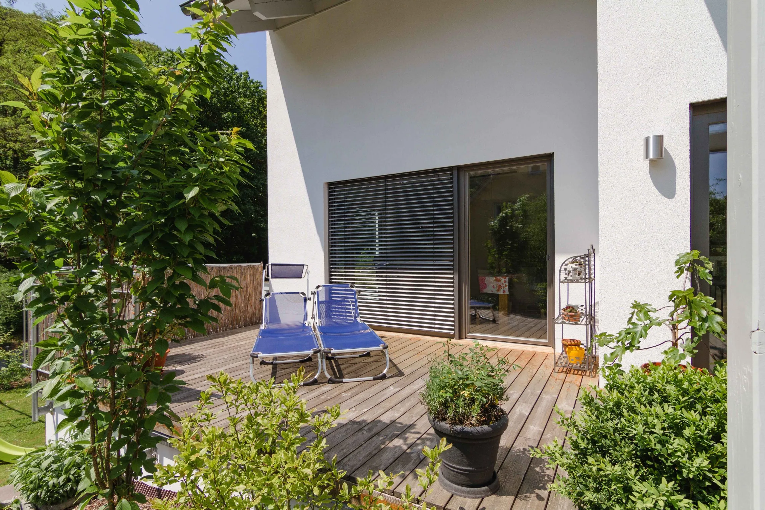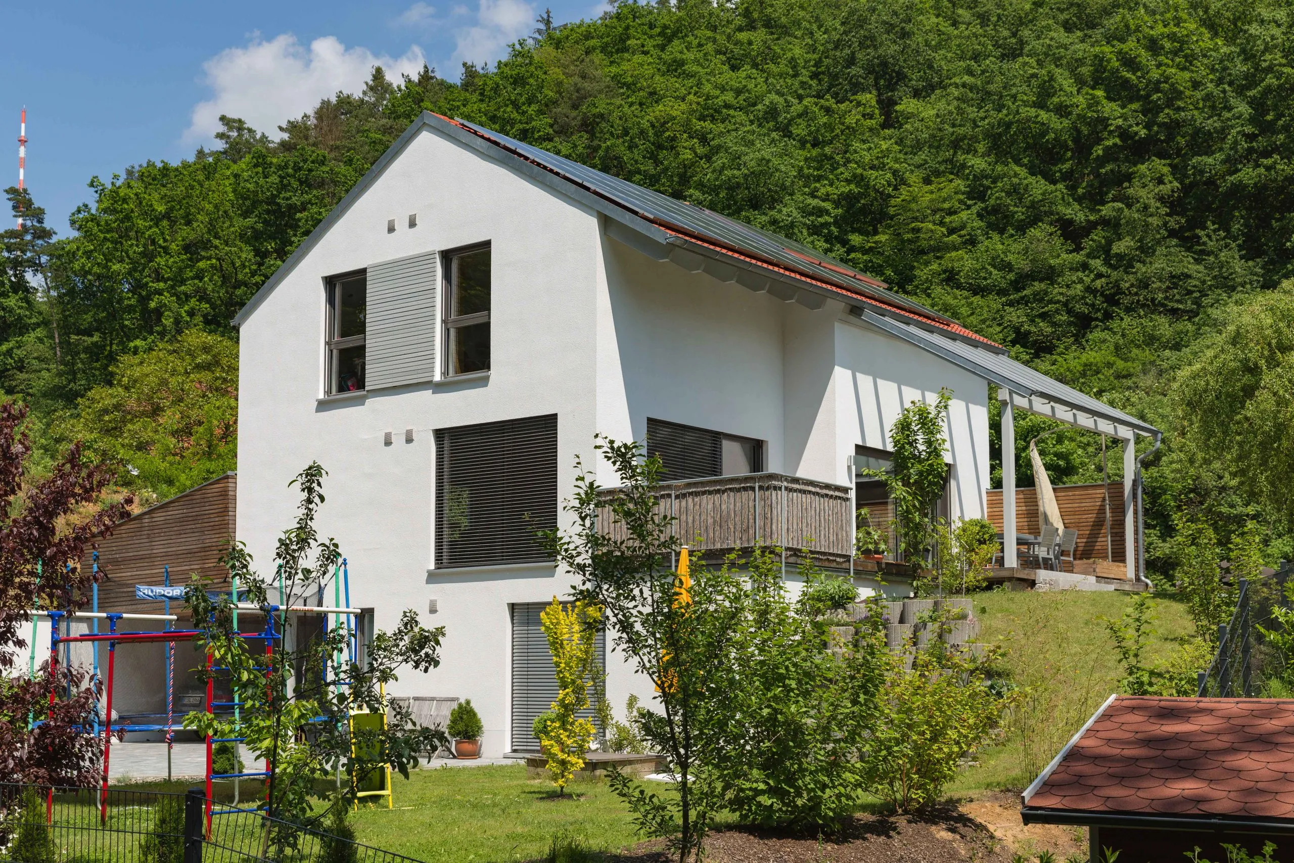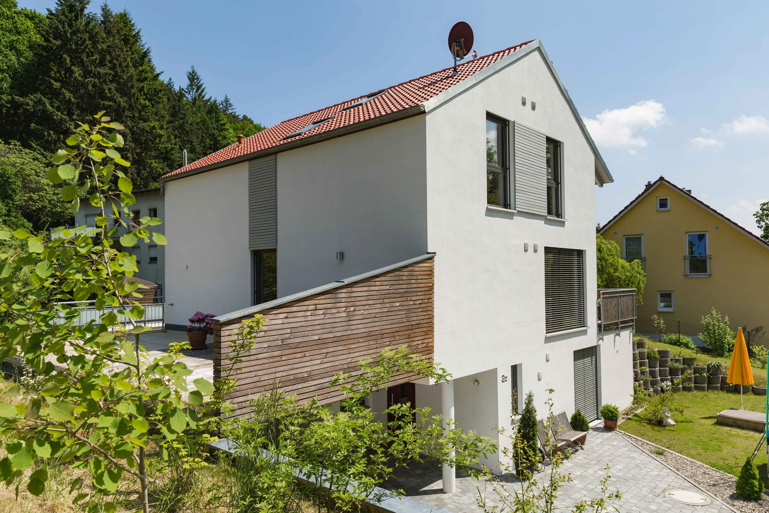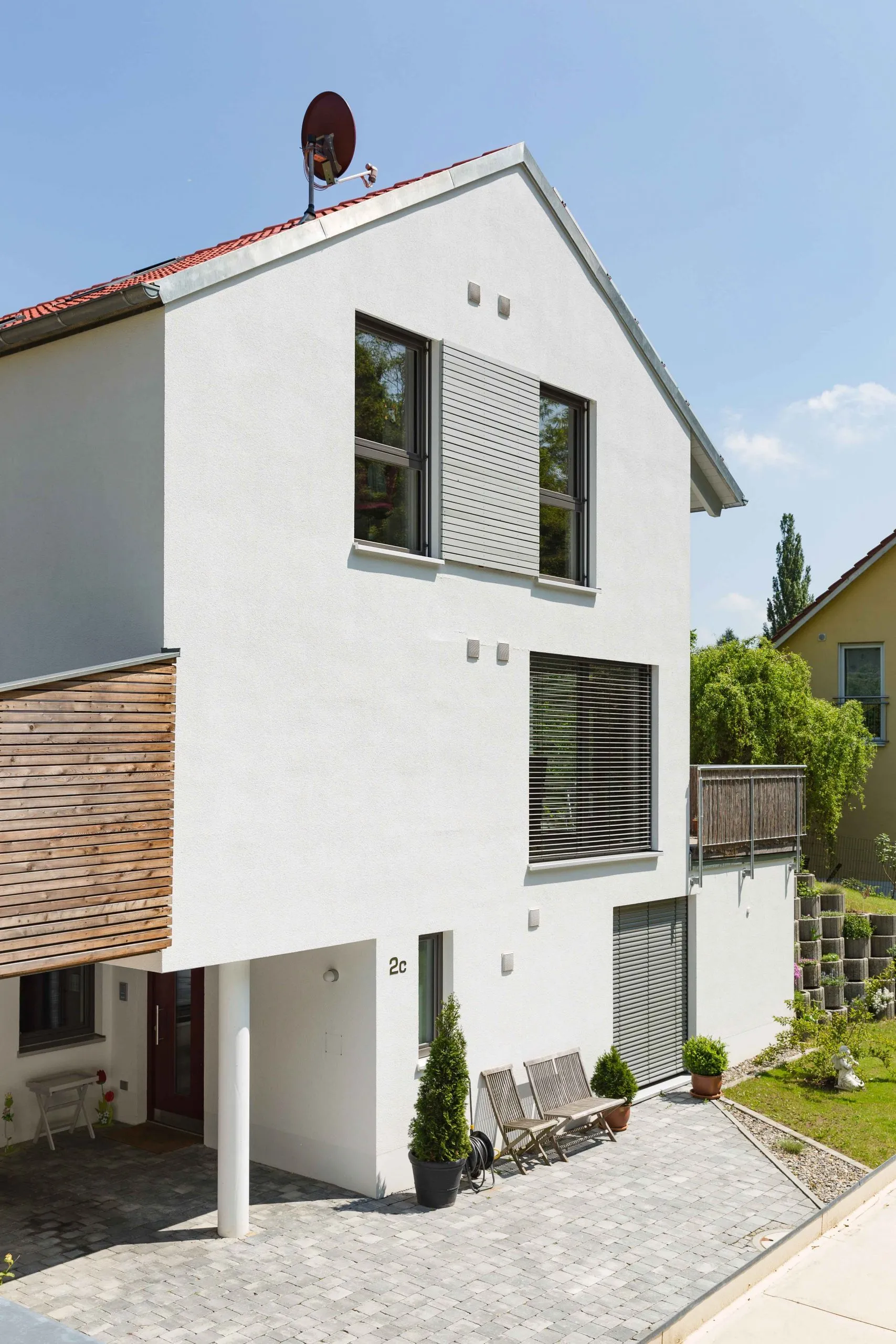 Hanghaus mit Einliegerwohnung und verlängerte Überdachung durch Glaspergola. Sichtholzelemente mit grauer Lasur gestrichen.