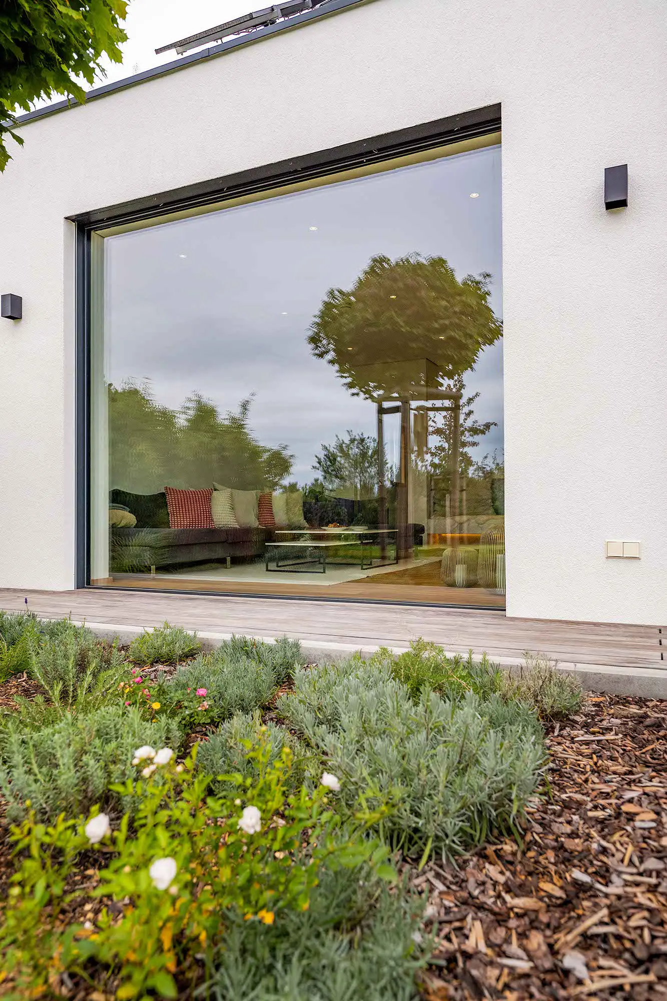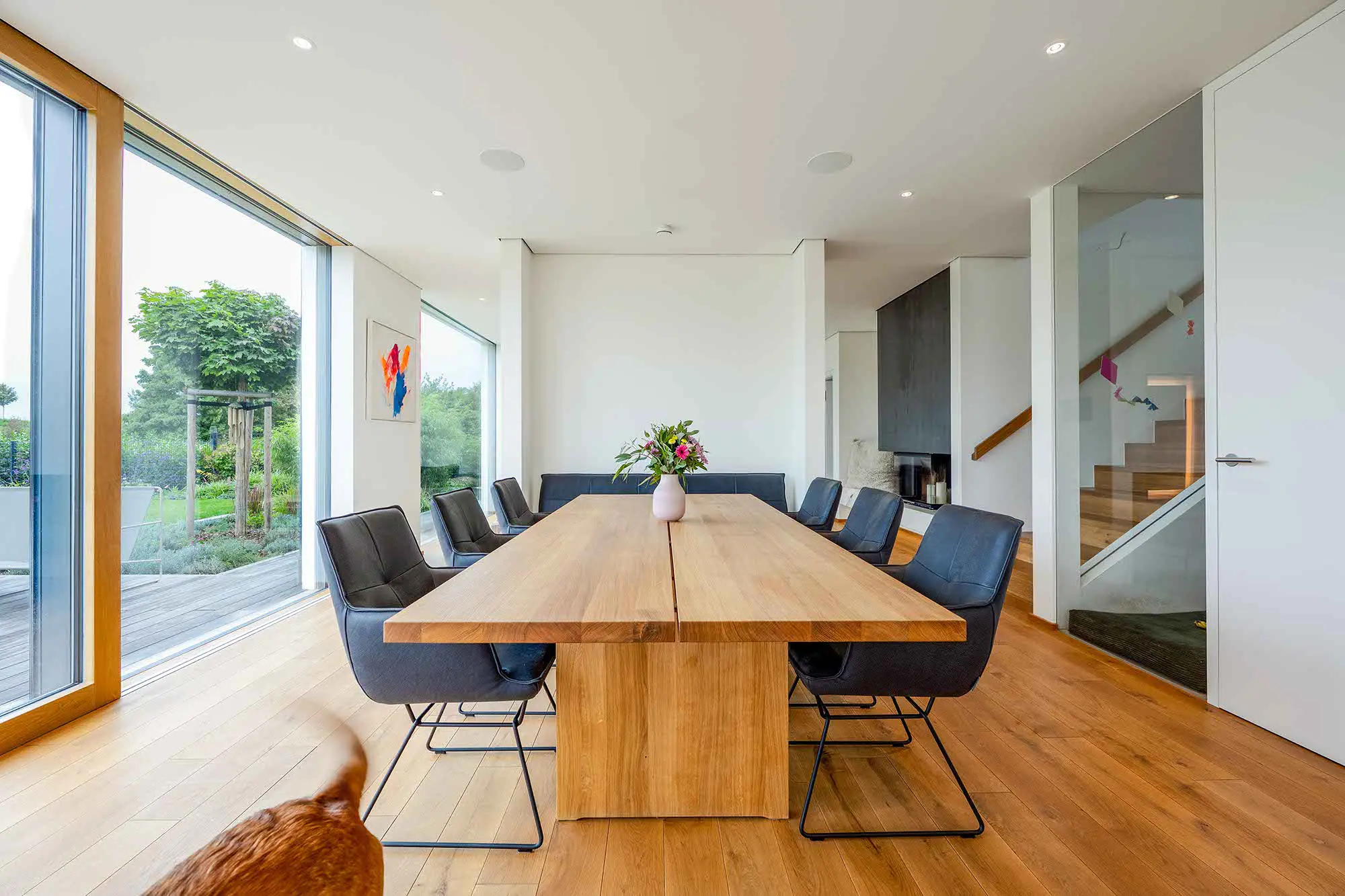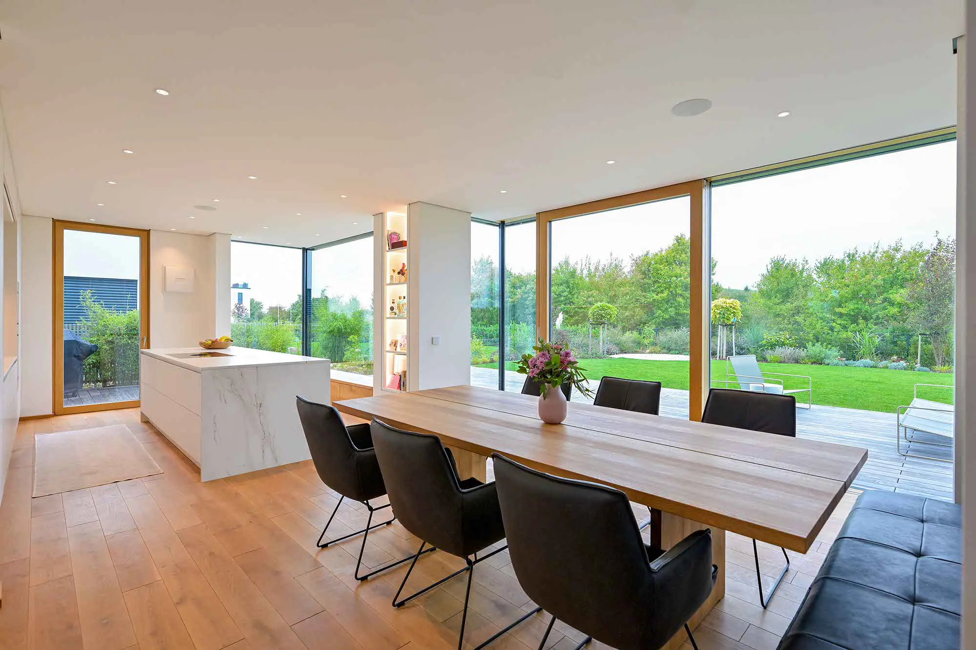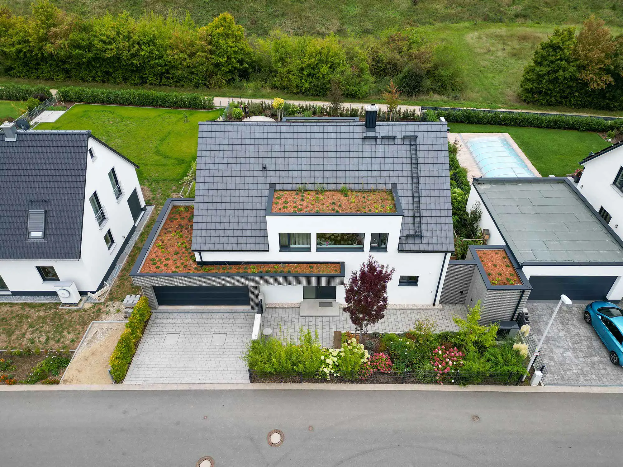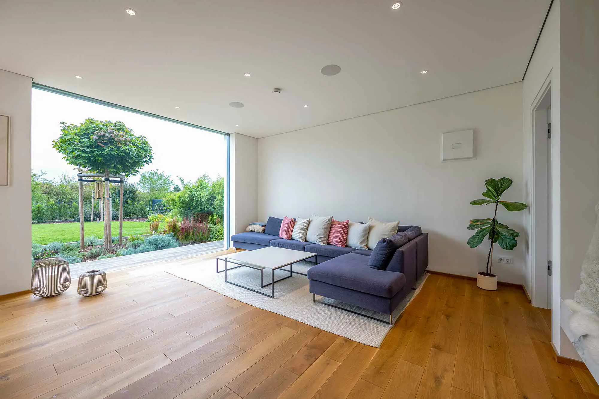 raumhohe Fenster, abgehängte Decke mit Schattenfuge, Wohnraumofen als Blickfang, Dachbegrünung auf Flachdächern