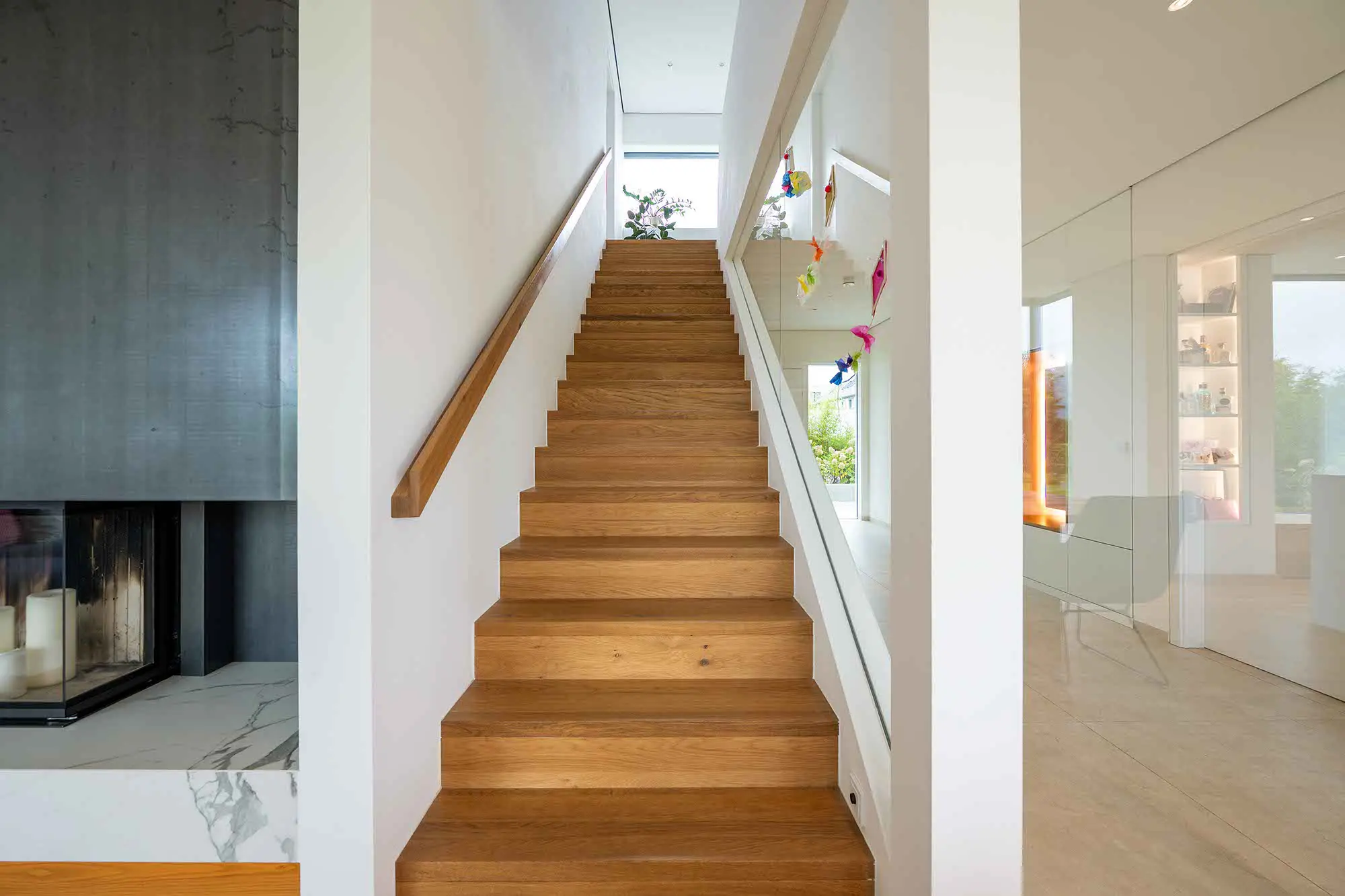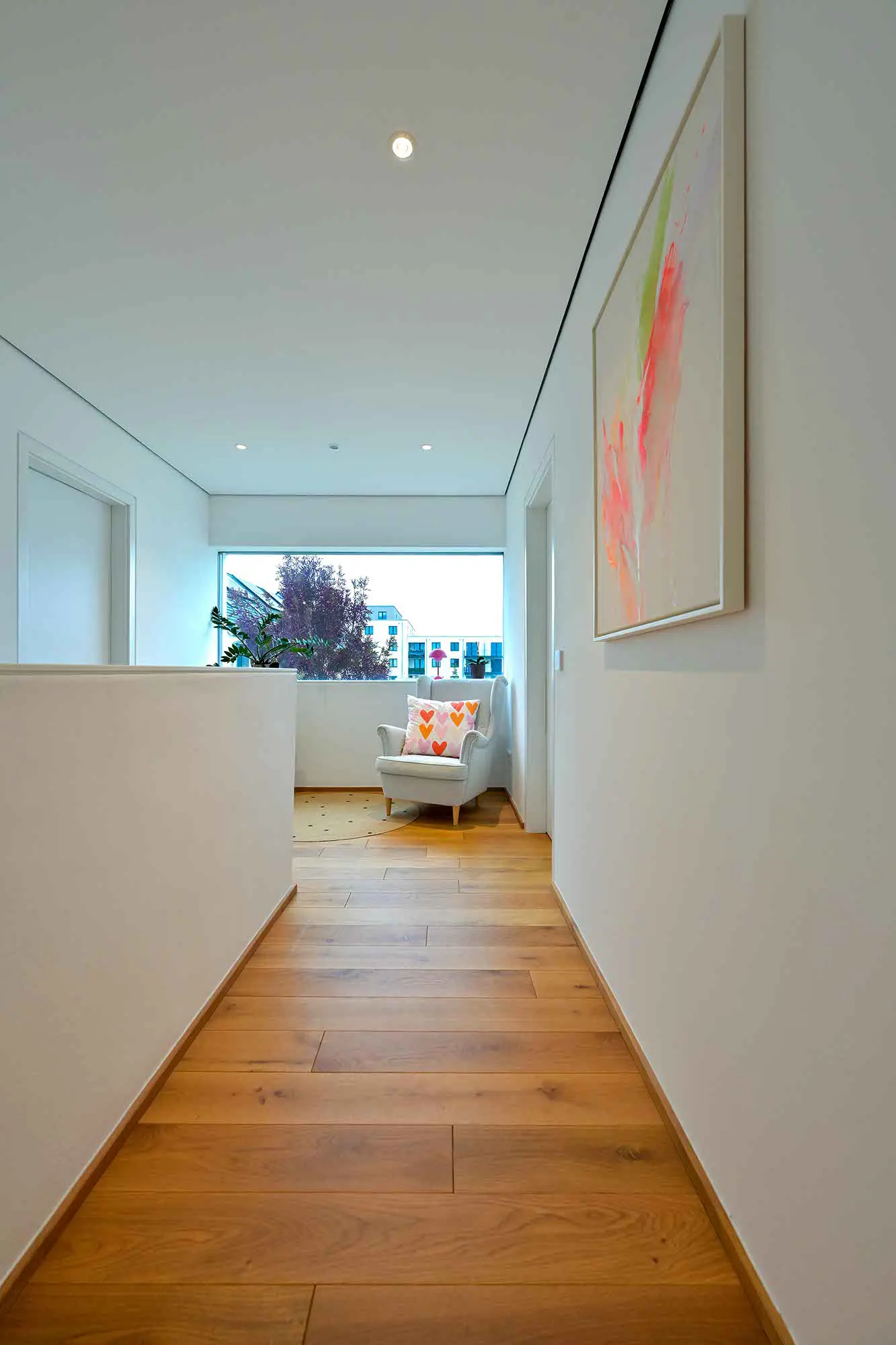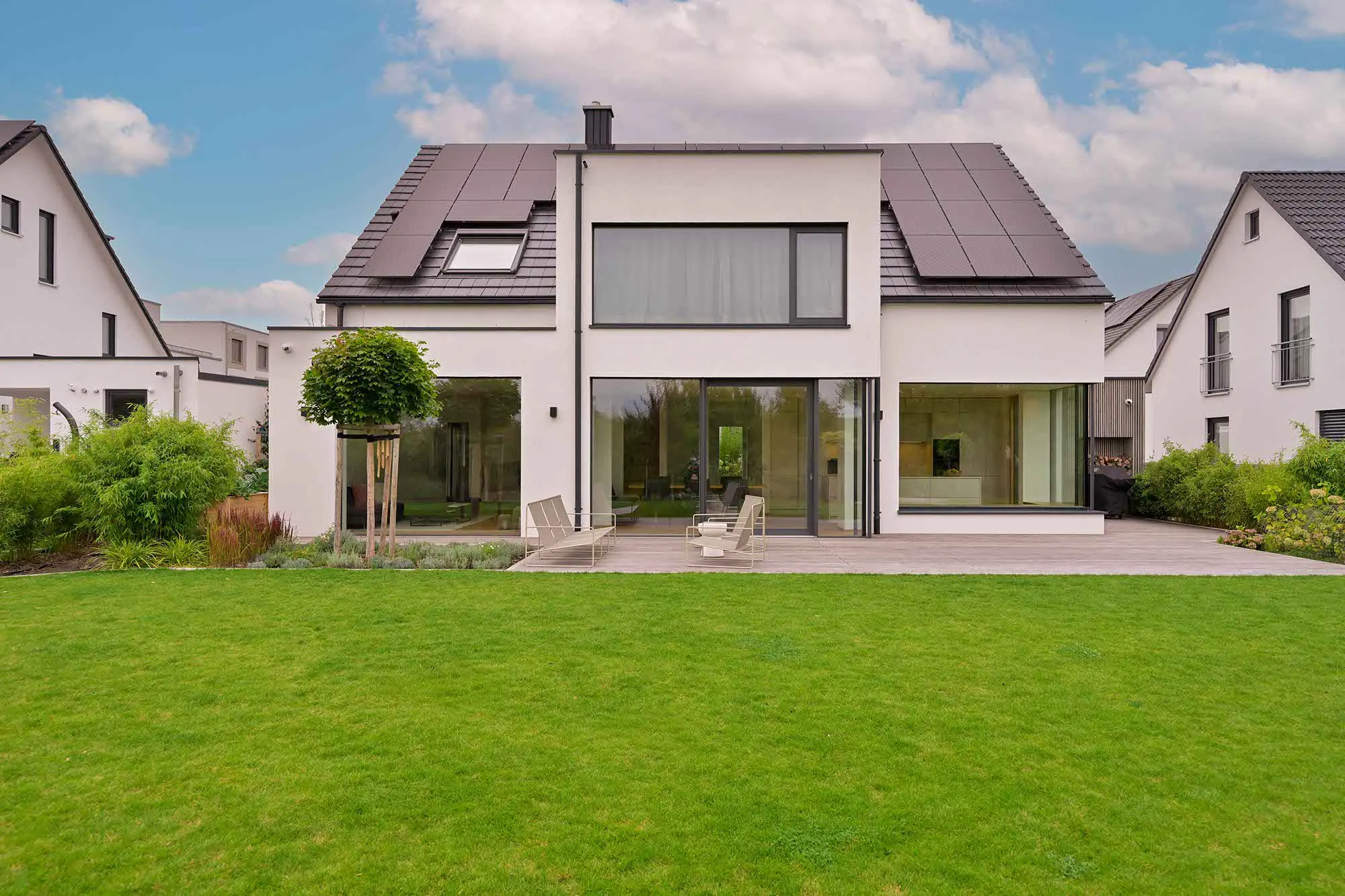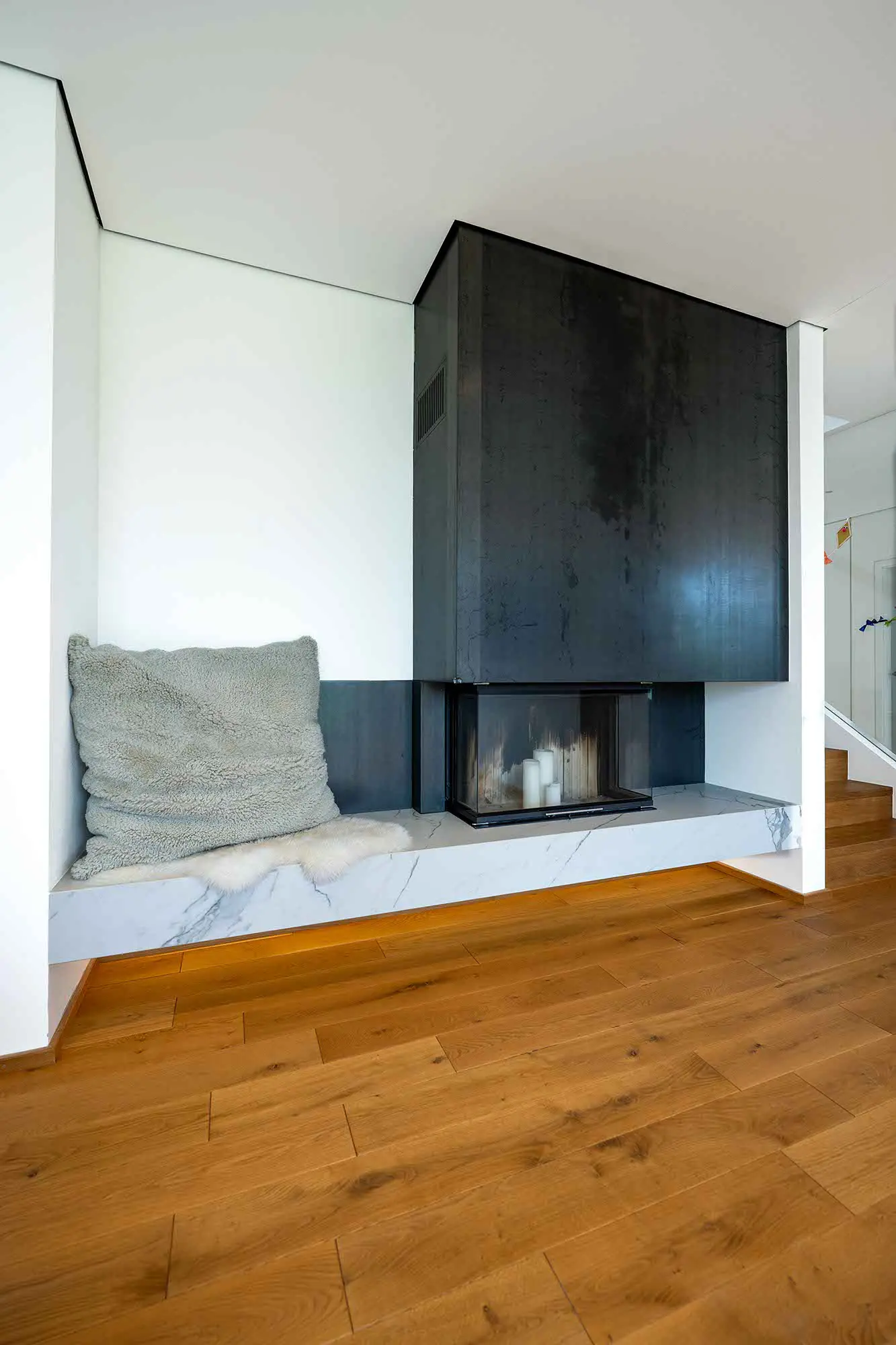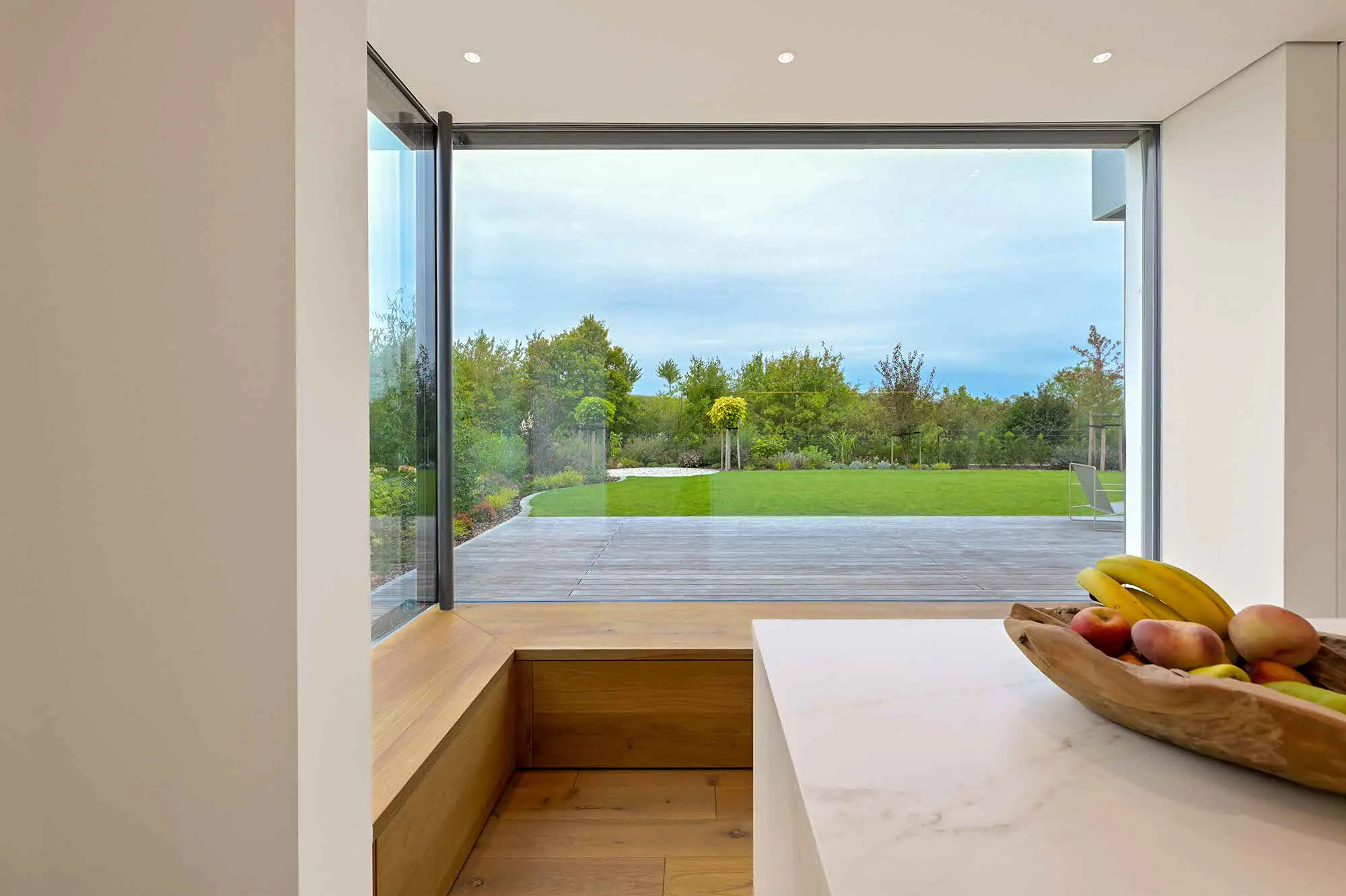 raumhohe Fenster, abgehängte Decke mit Schattenfuge, Wohnraumofen als Blickfang, Dachbegrünung auf Flachdächern