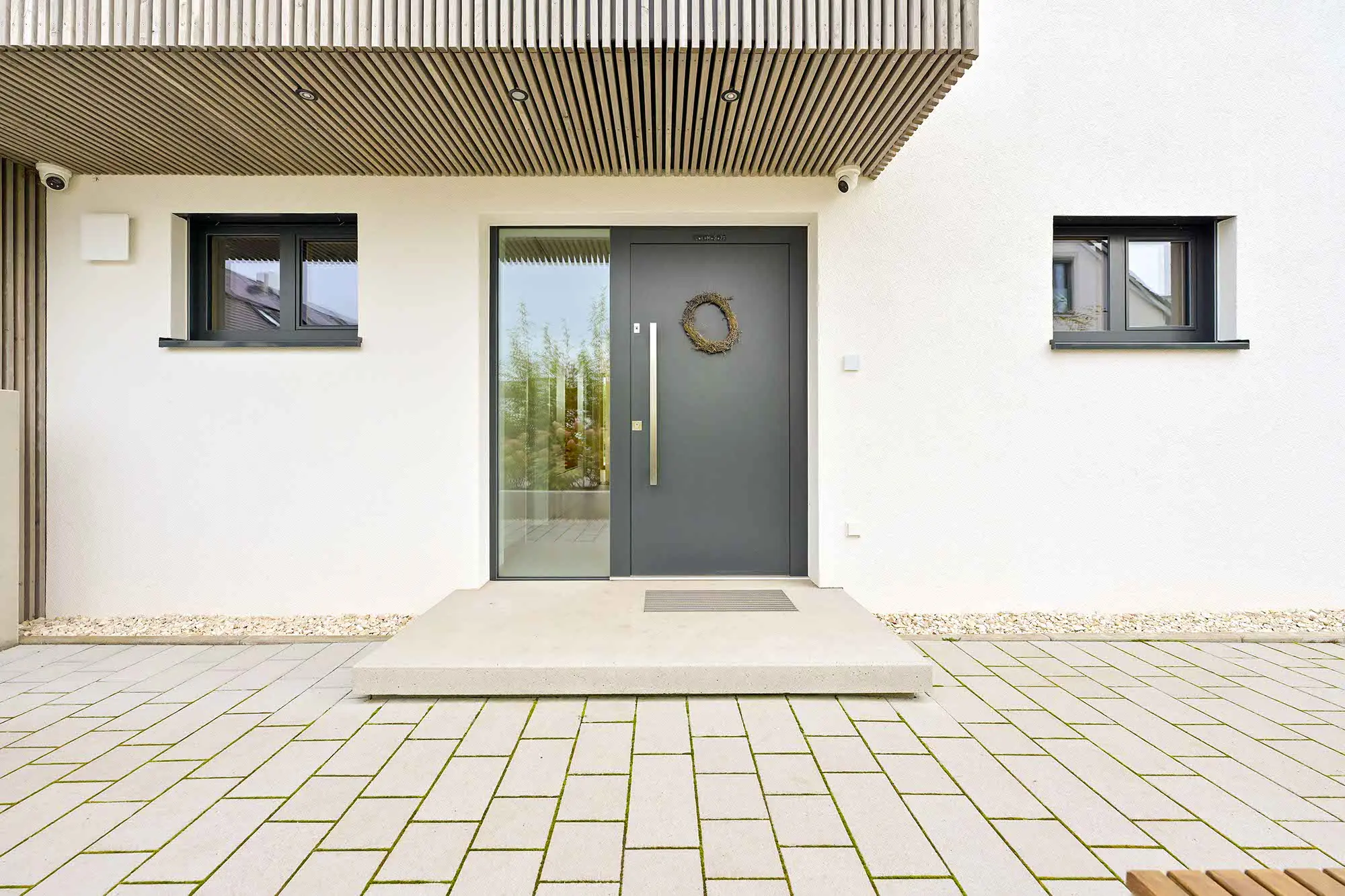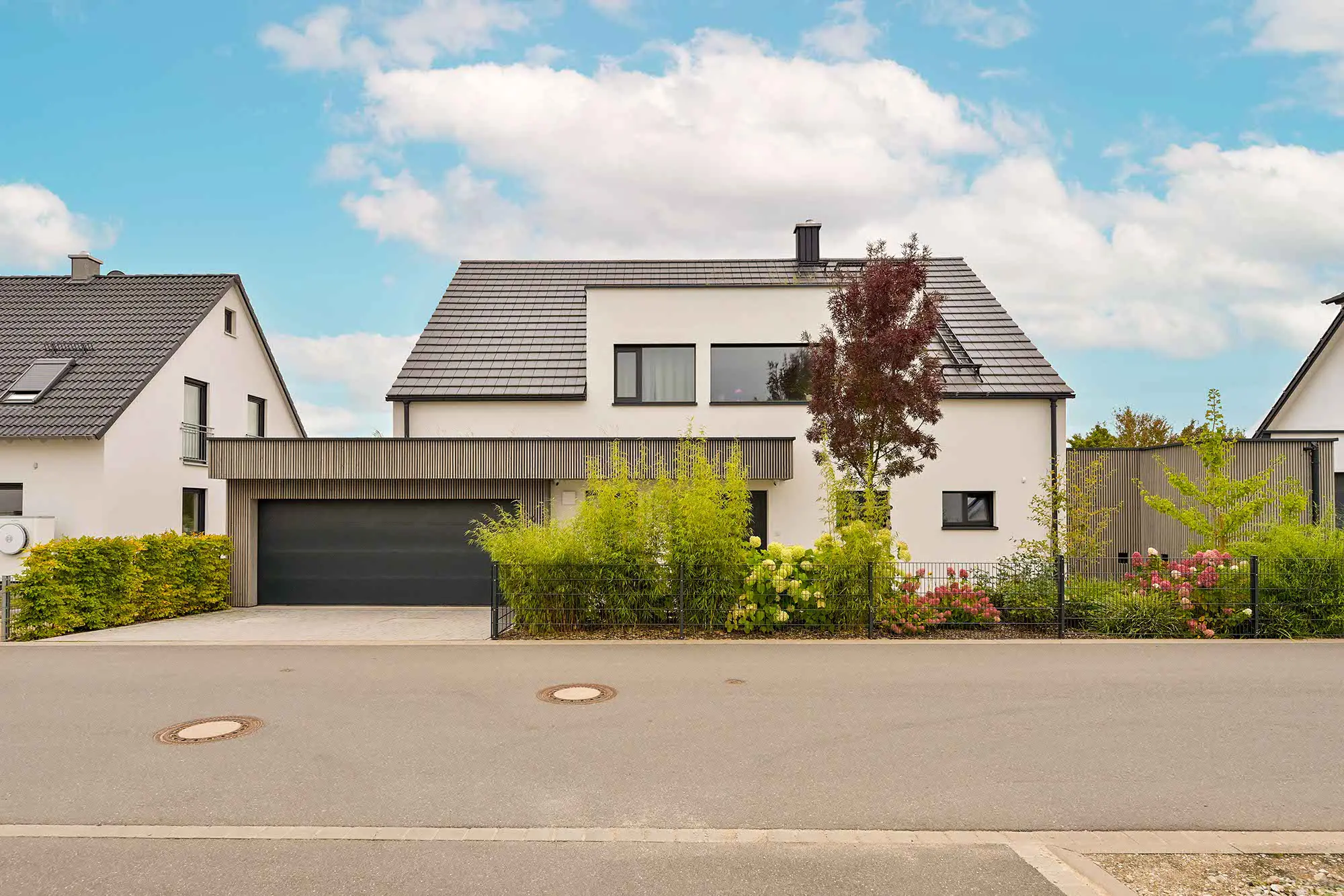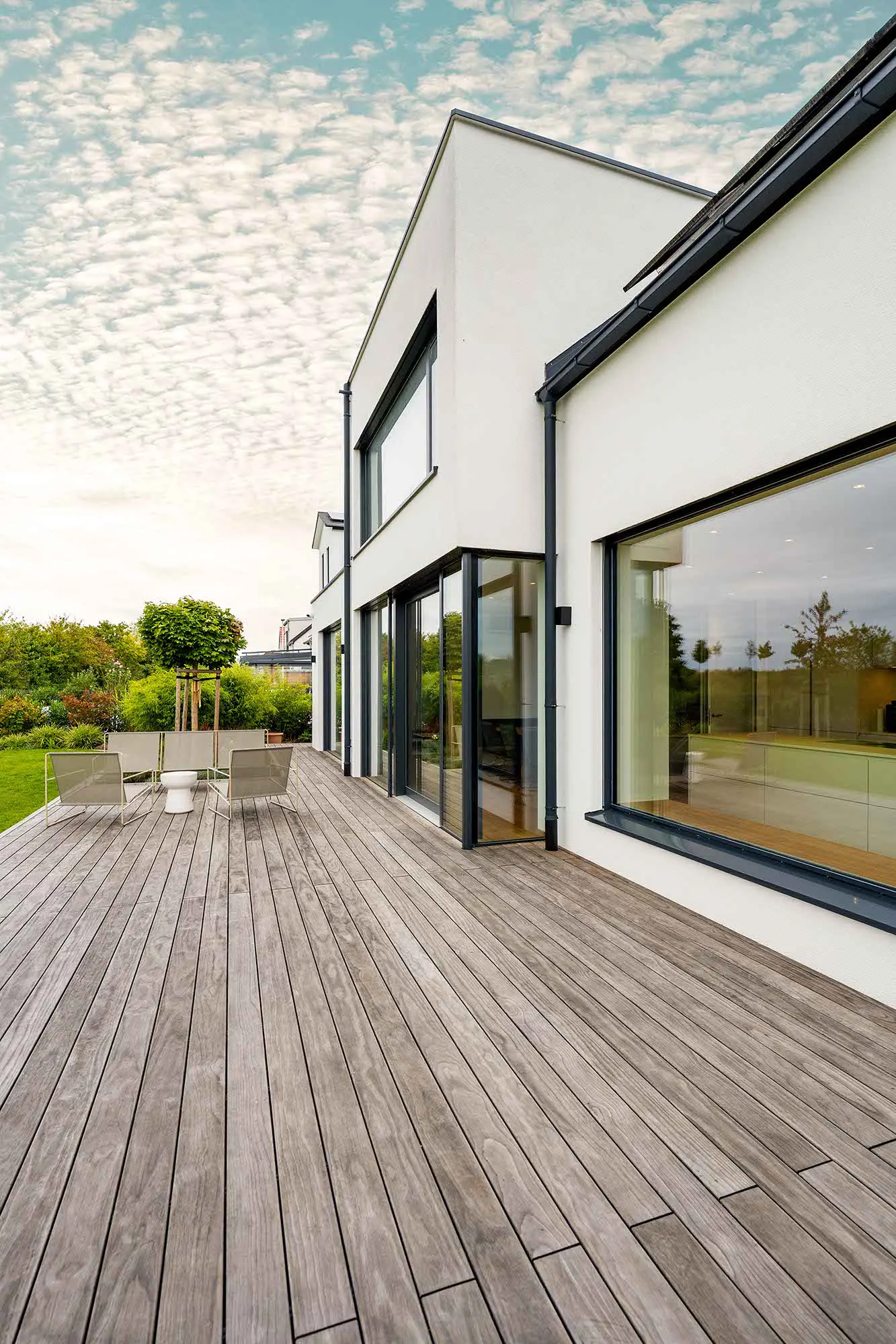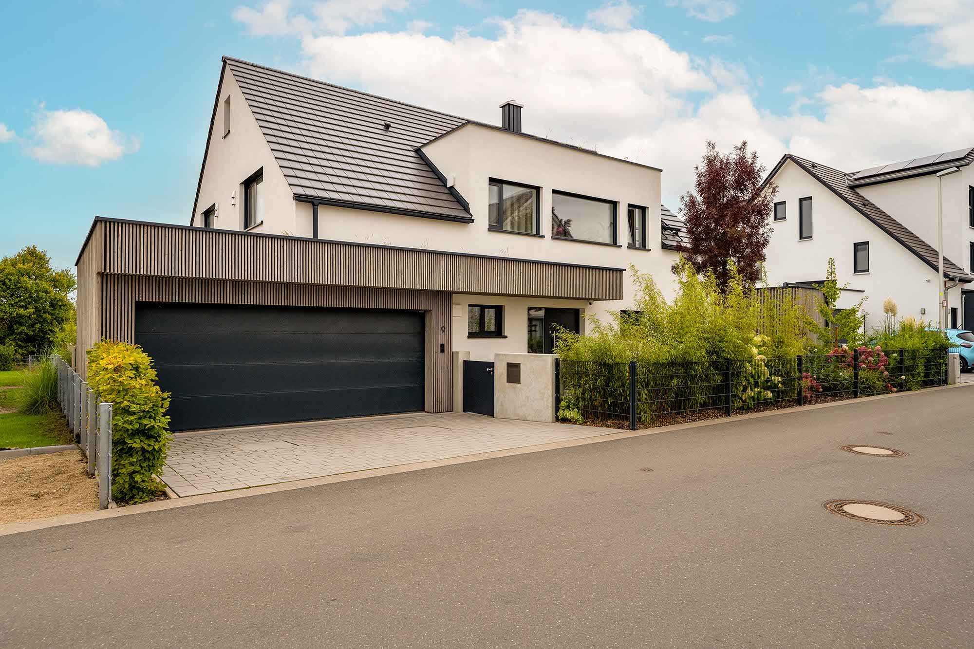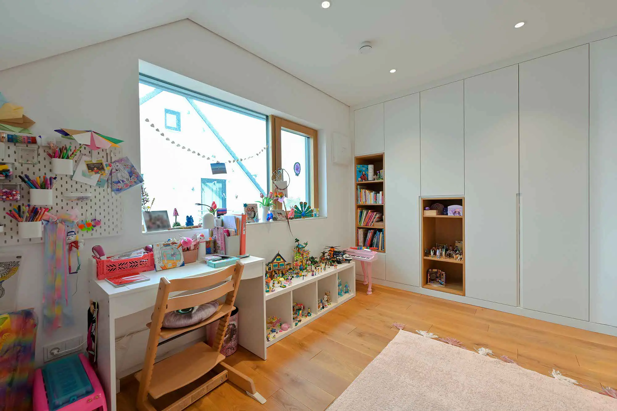 raumhohe Fenster, abgehängte Decke mit Schattenfuge, Wohnraumofen als Blickfang, Dachbegrünung auf Flachdächern