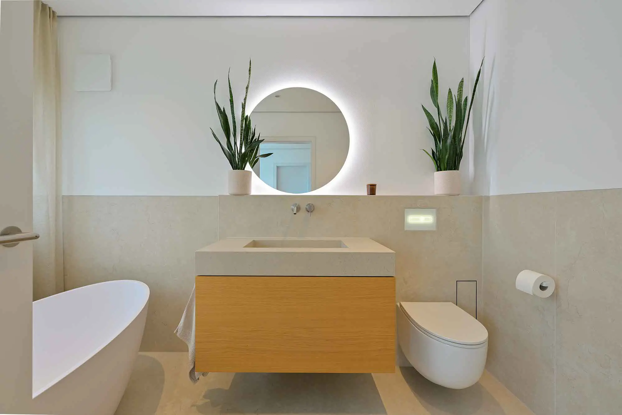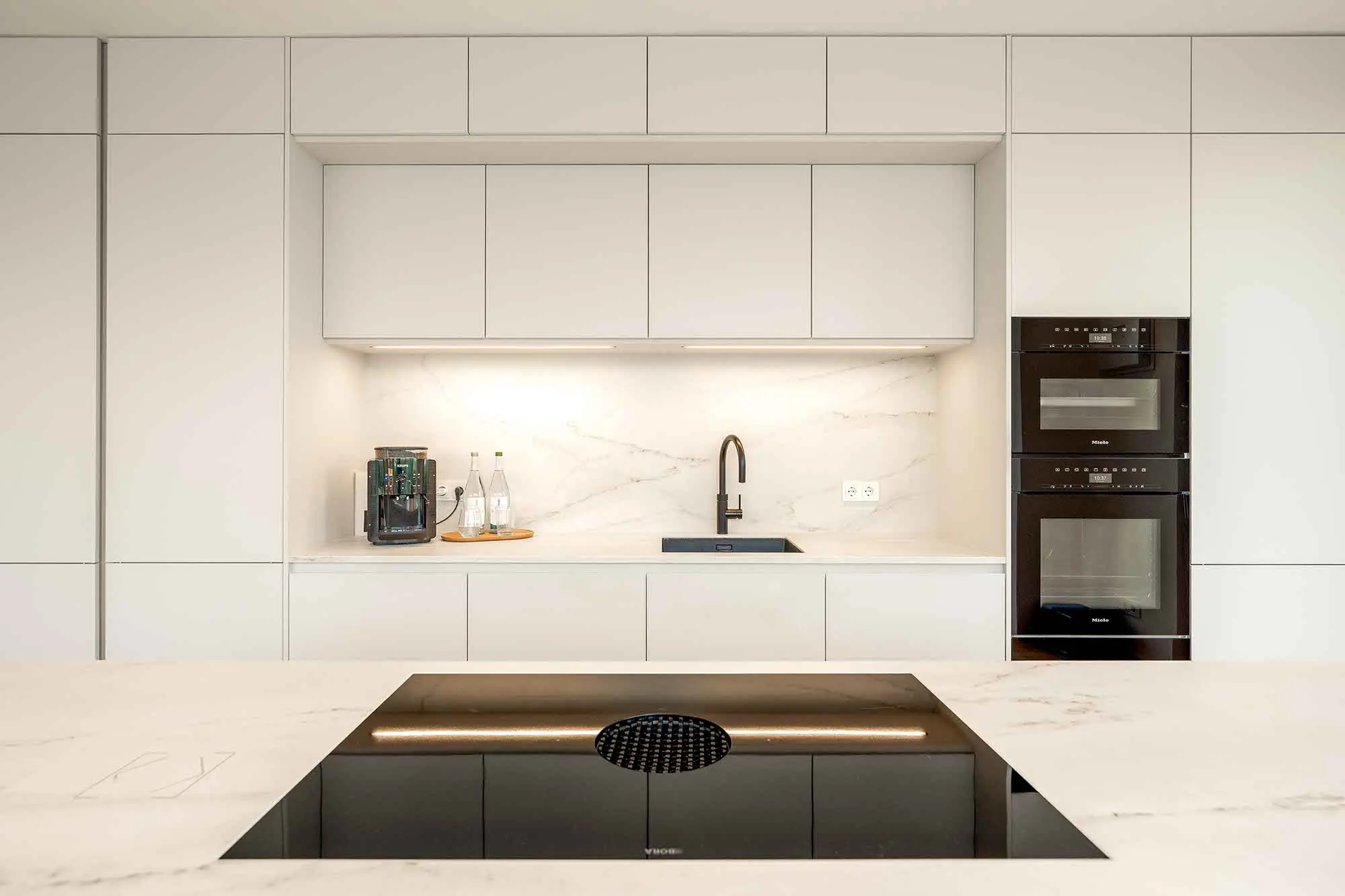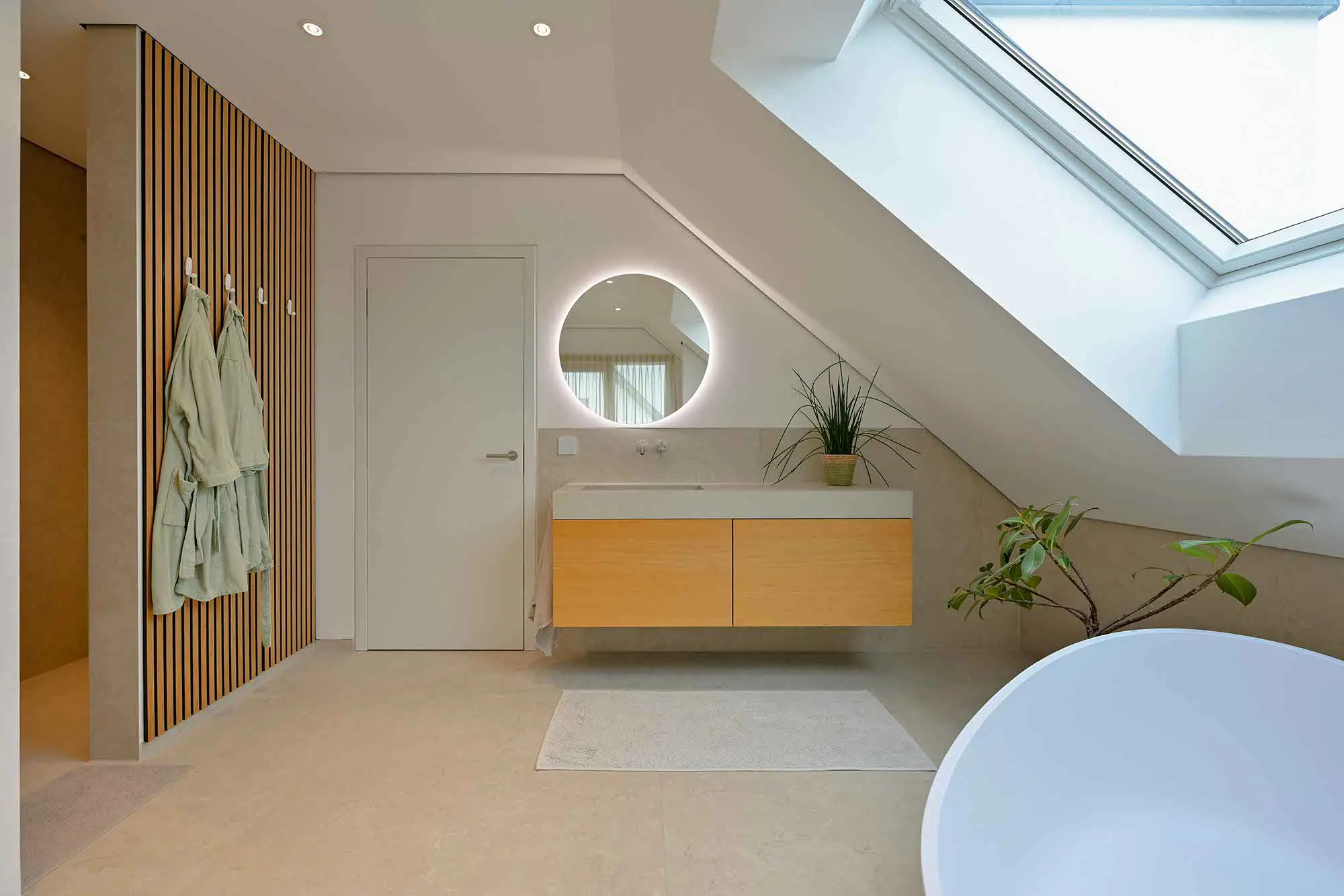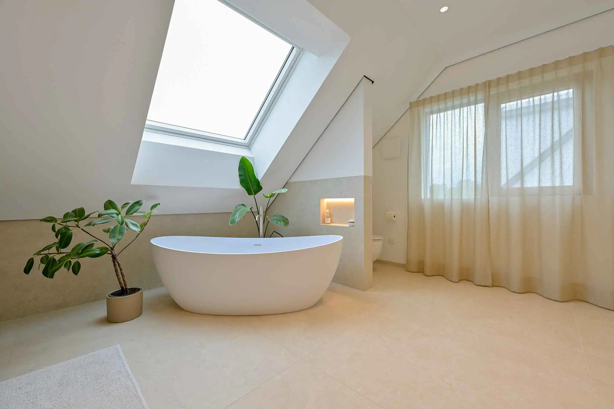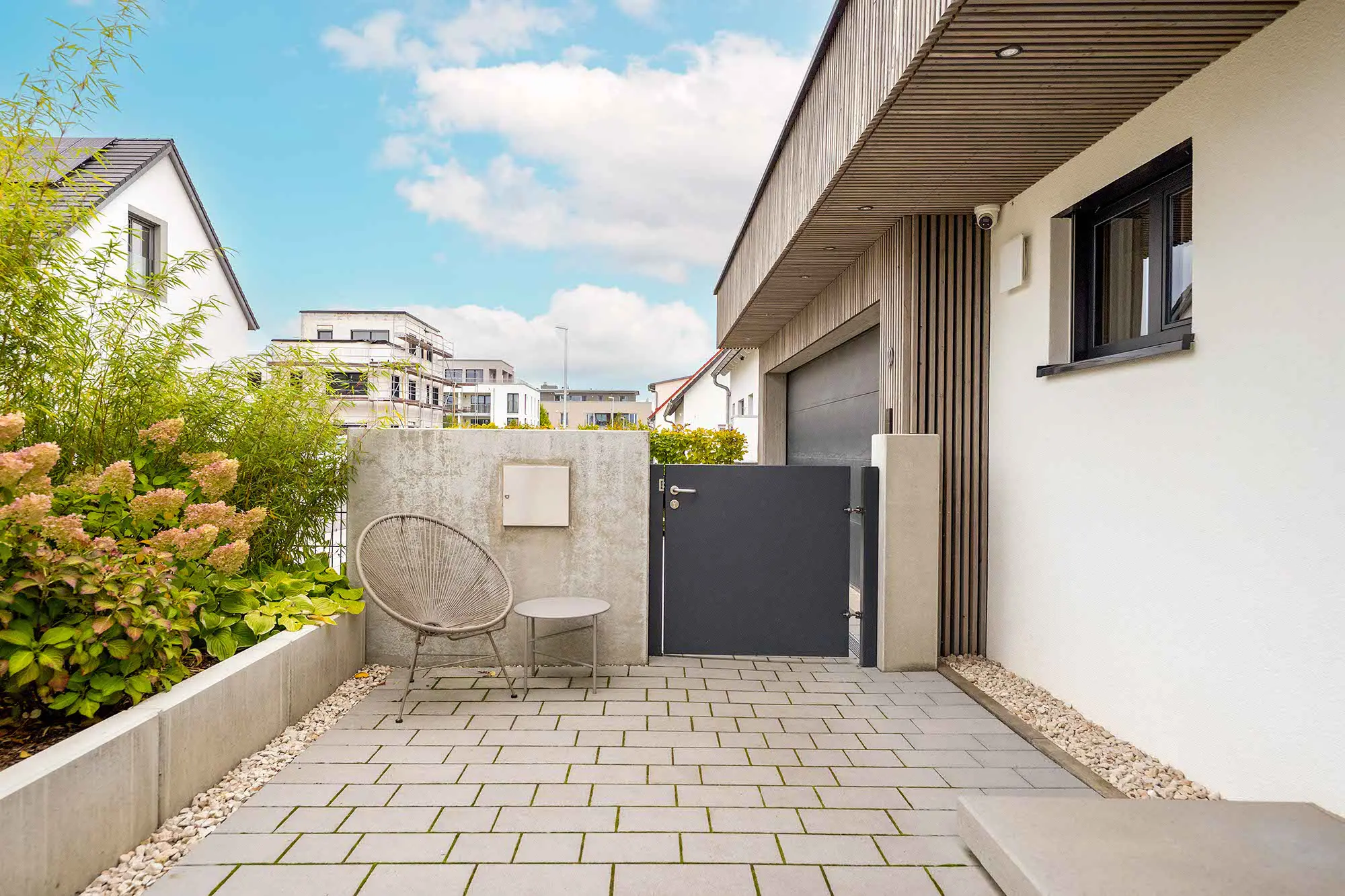 raumhohe Fenster, abgehängte Decke mit Schattenfuge, Wohnraumofen als Blickfang, Dachbegrünung auf Flachdächern
