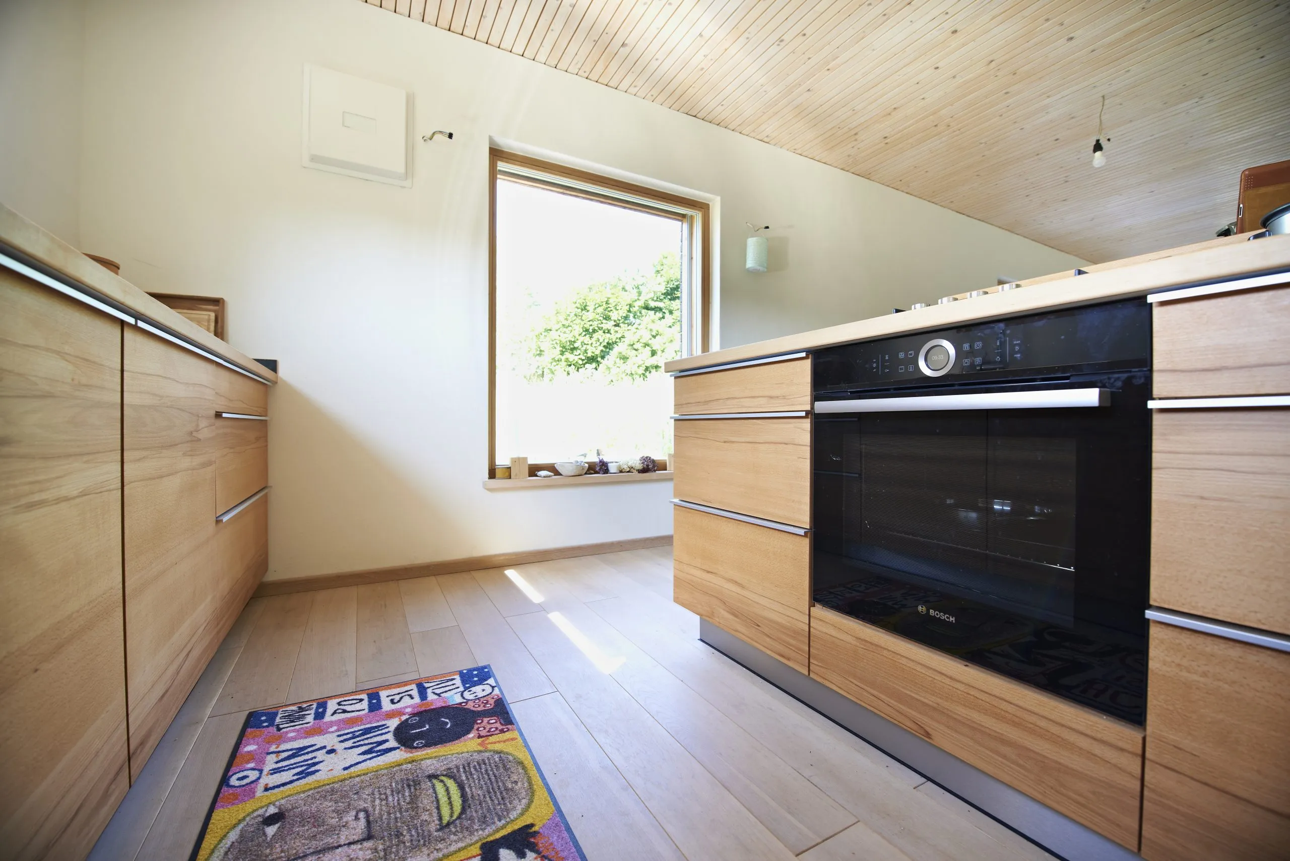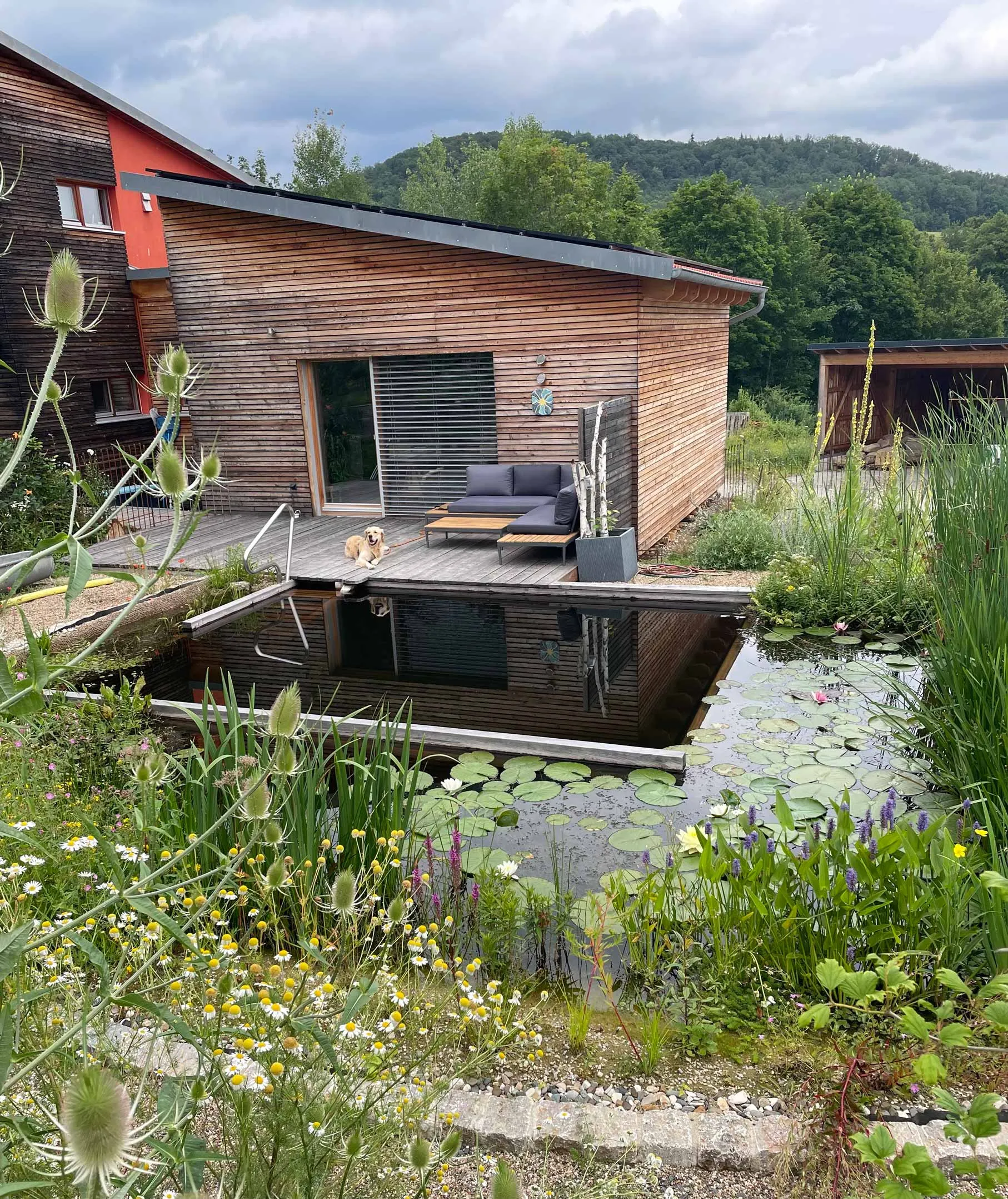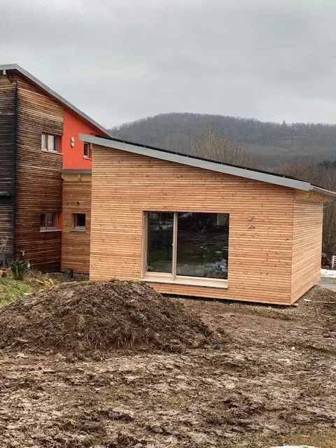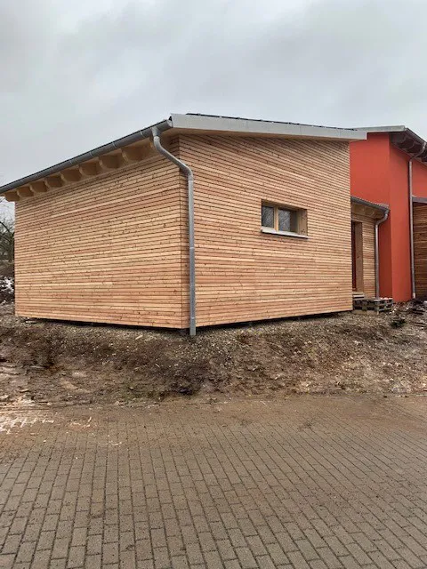 Sehr schönes kleines Haus auf Betonpfählen mit einem Pultdach und einem Anbau auf einem Schraubenfundament, der 2020 entstand.