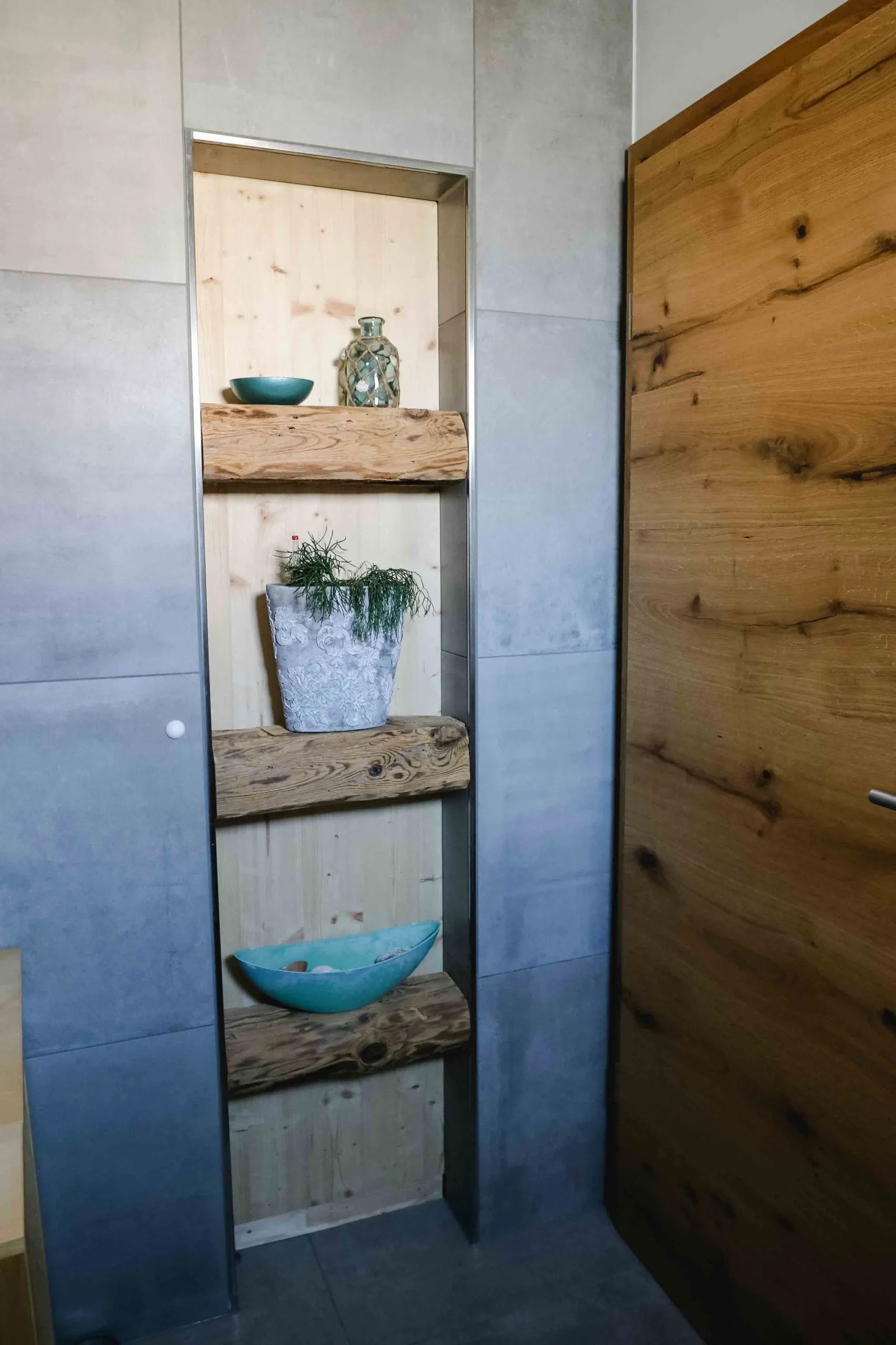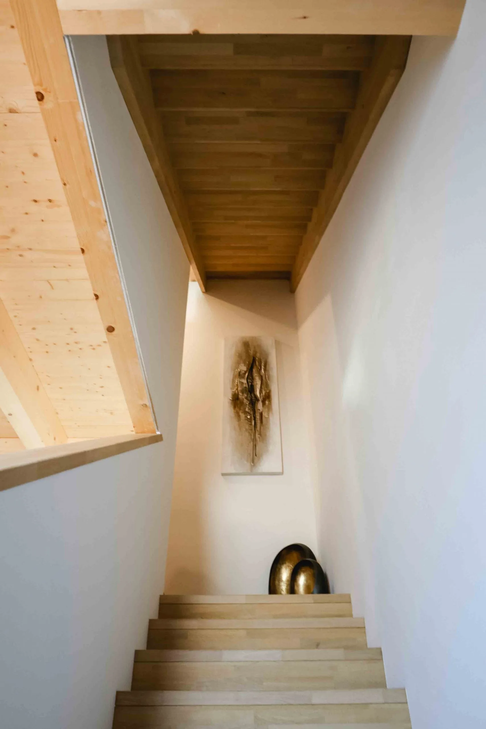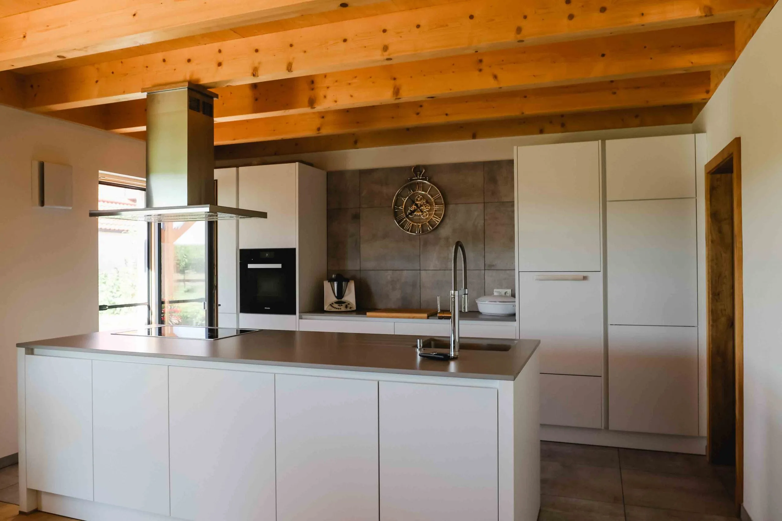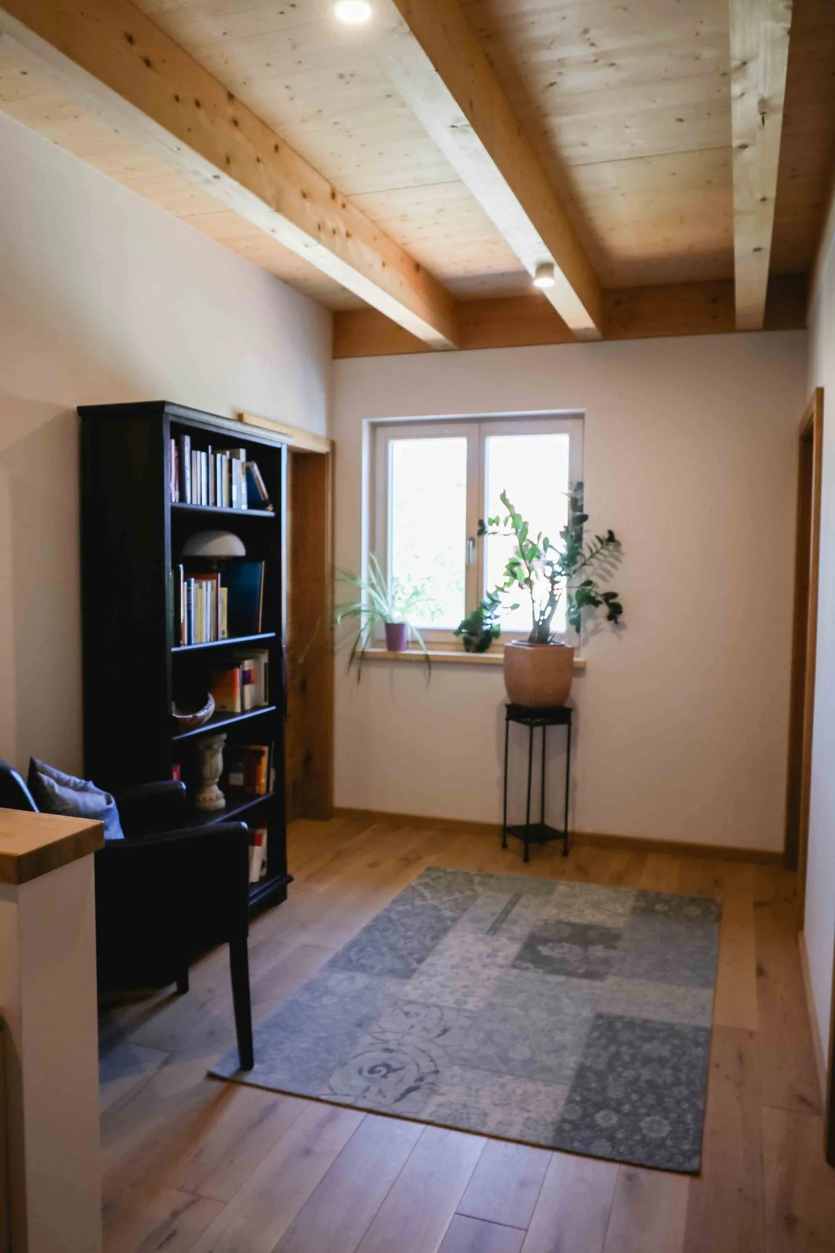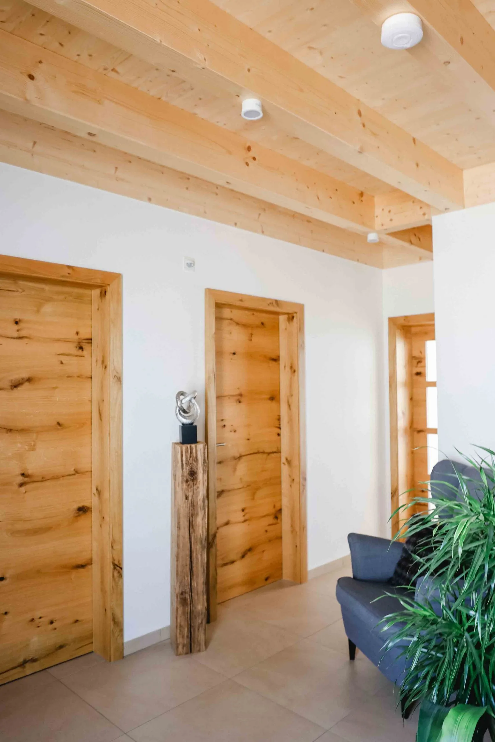 Sichtdecke farblos gestrichen, massiver Eichendielenboden mit Weißpigmenten, Vollholztüren aus Eiche