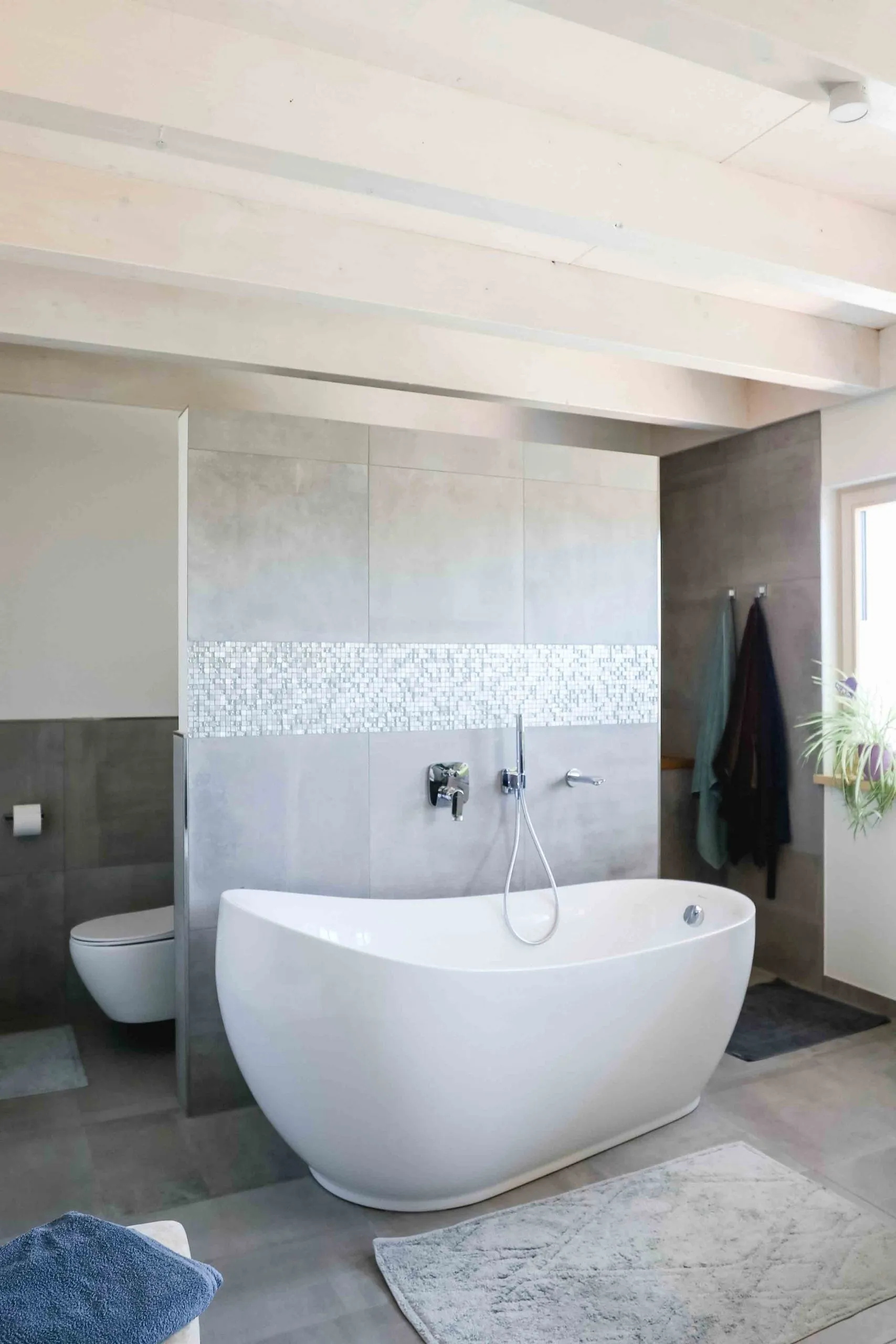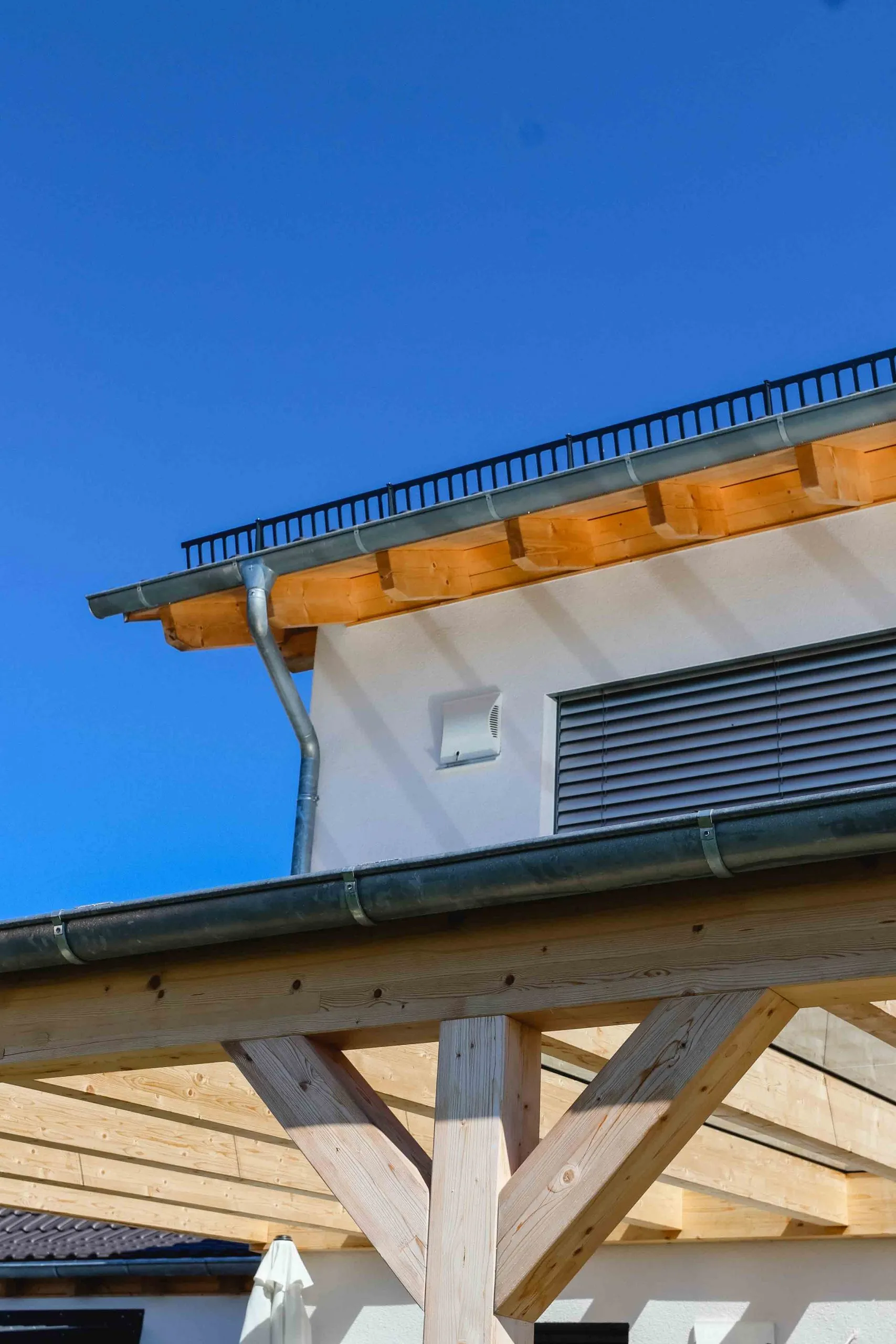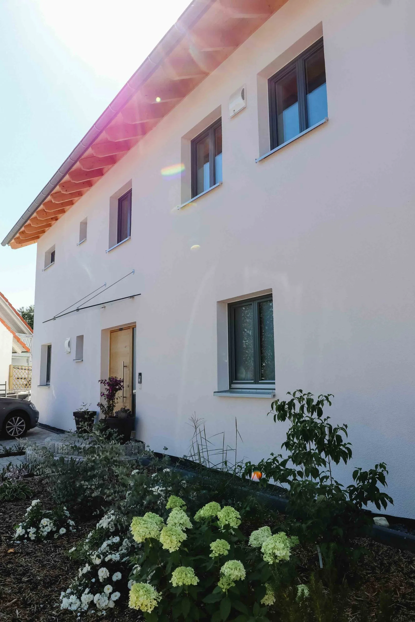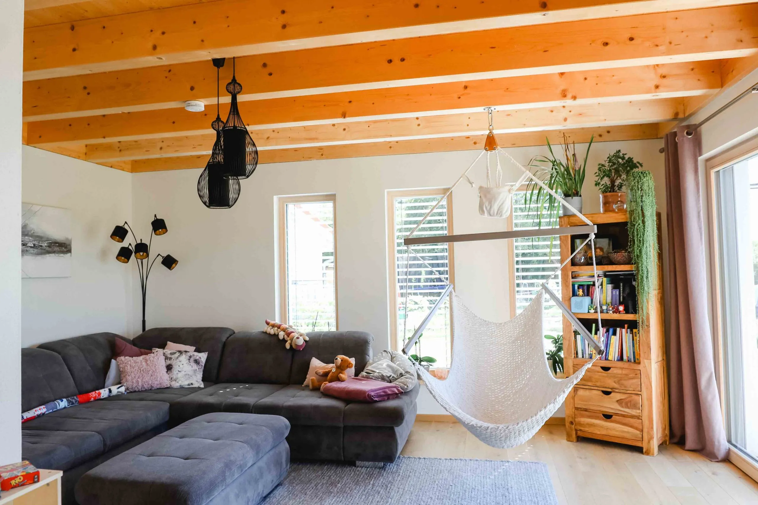 Sichtdecke farblos gestrichen, massiver Eichendielenboden mit Weißpigmenten, Vollholztüren aus Eiche