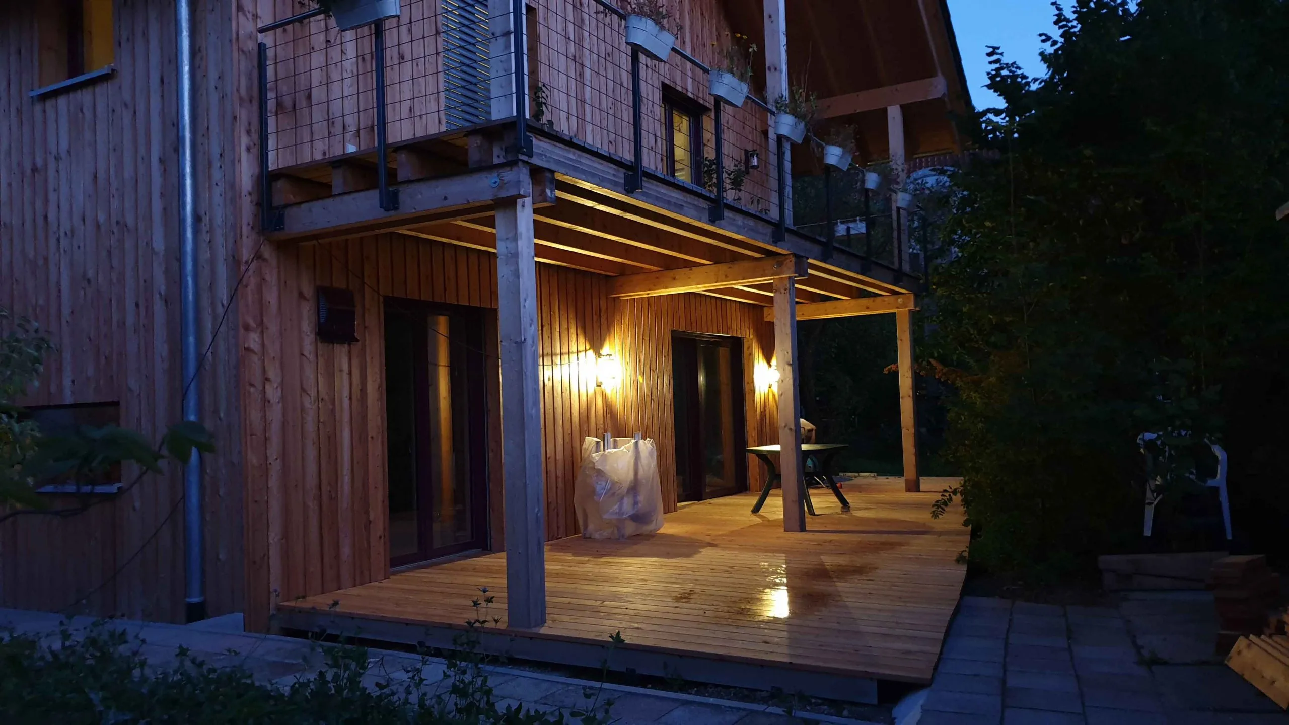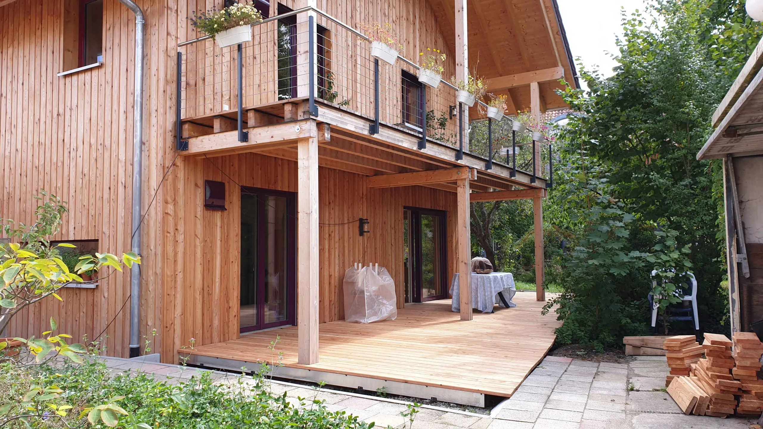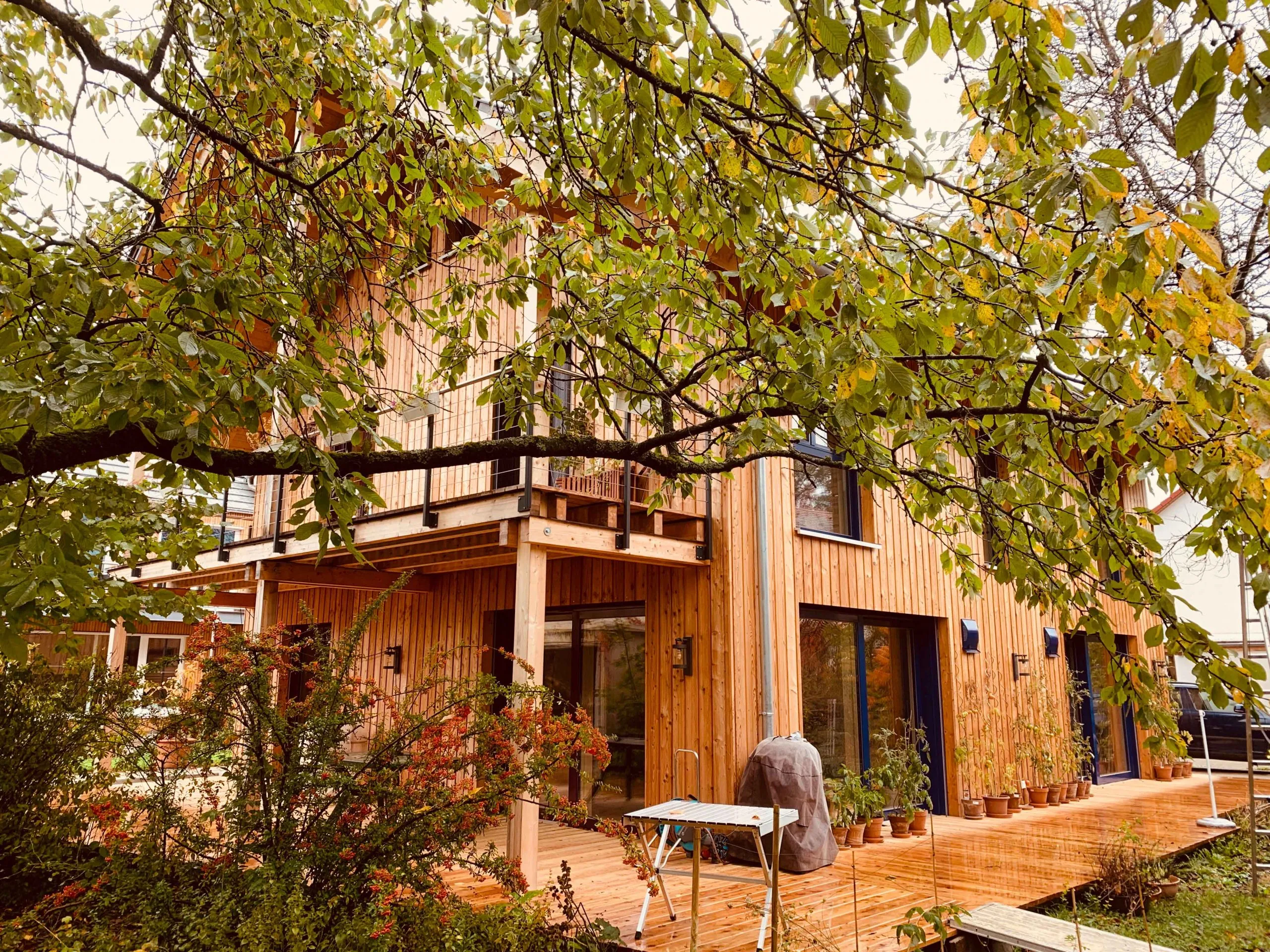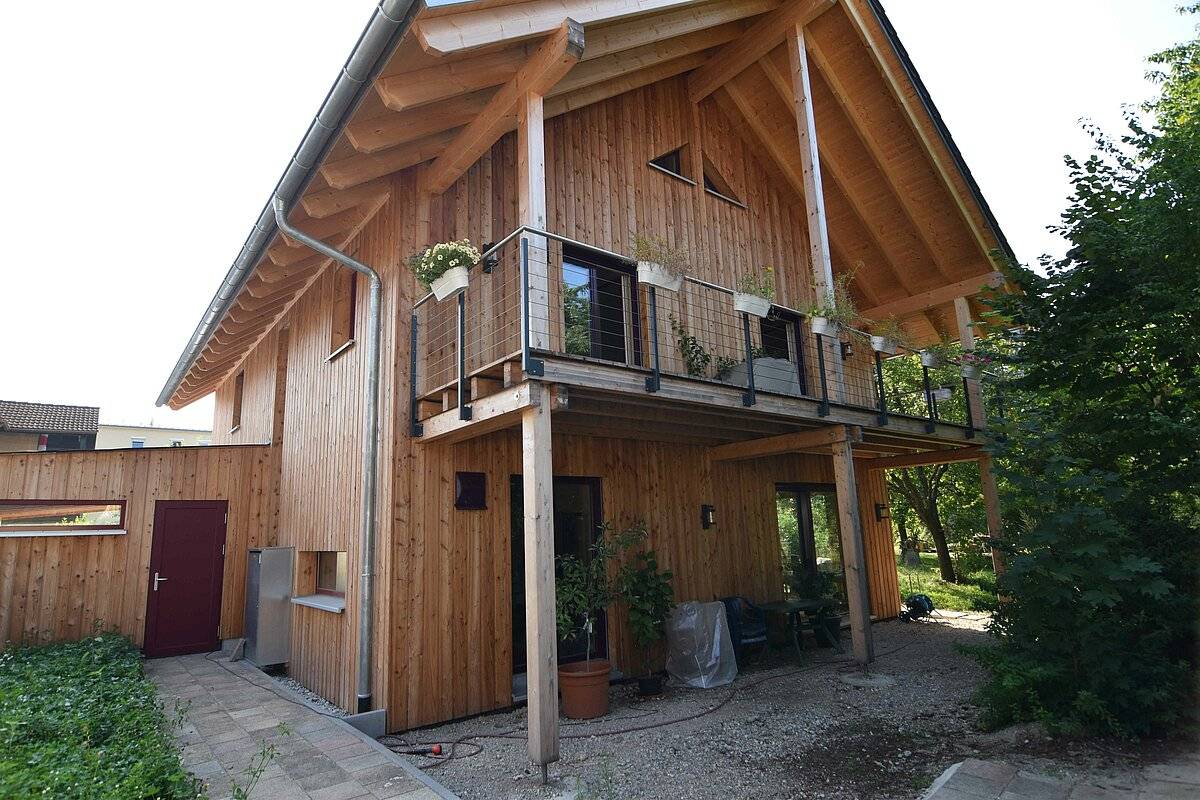 Barrierefreies Haus mit unbehandelter Lärchenholzfassade, einem großen Balkon und als besonderen Hingucker hat das Haus in jeder Himmelsrichtung eine andere Fensterfarbe. Durch den integrierten Aufzug ist das obere Stockwerk barrierefrei erreichbar.