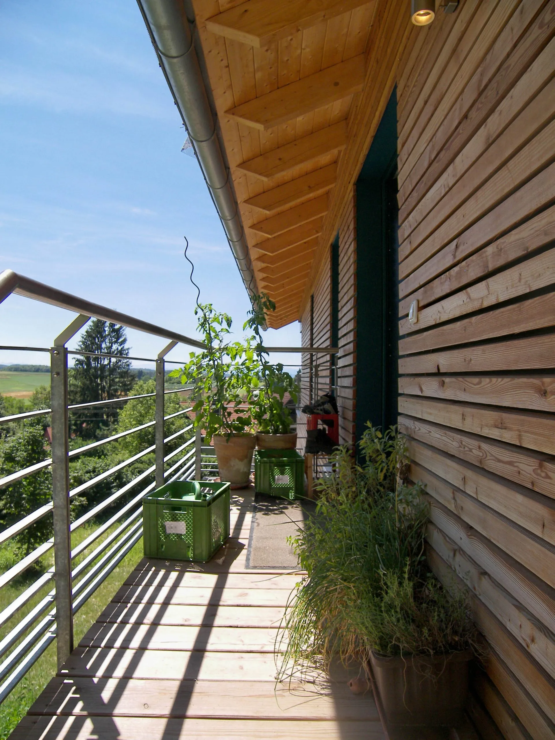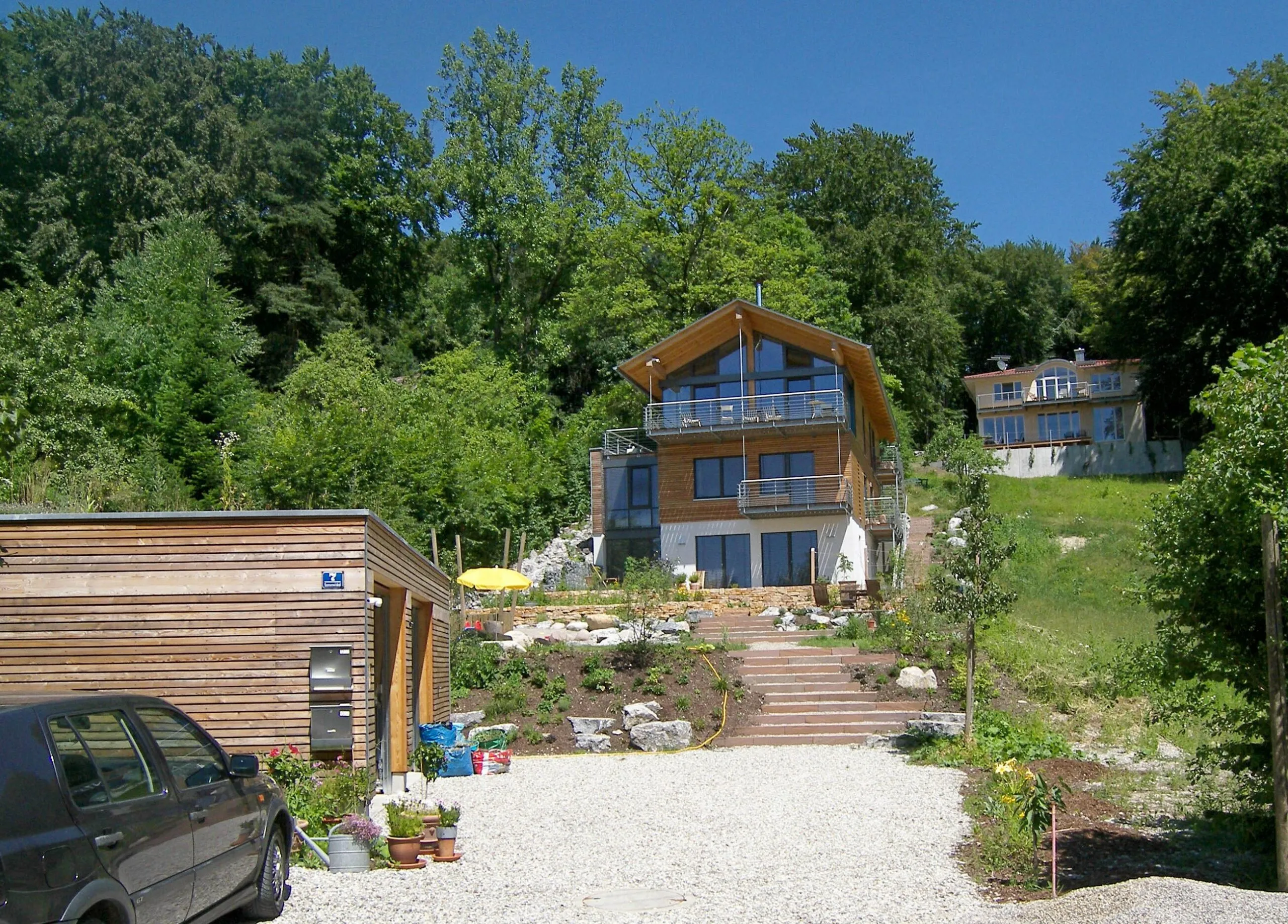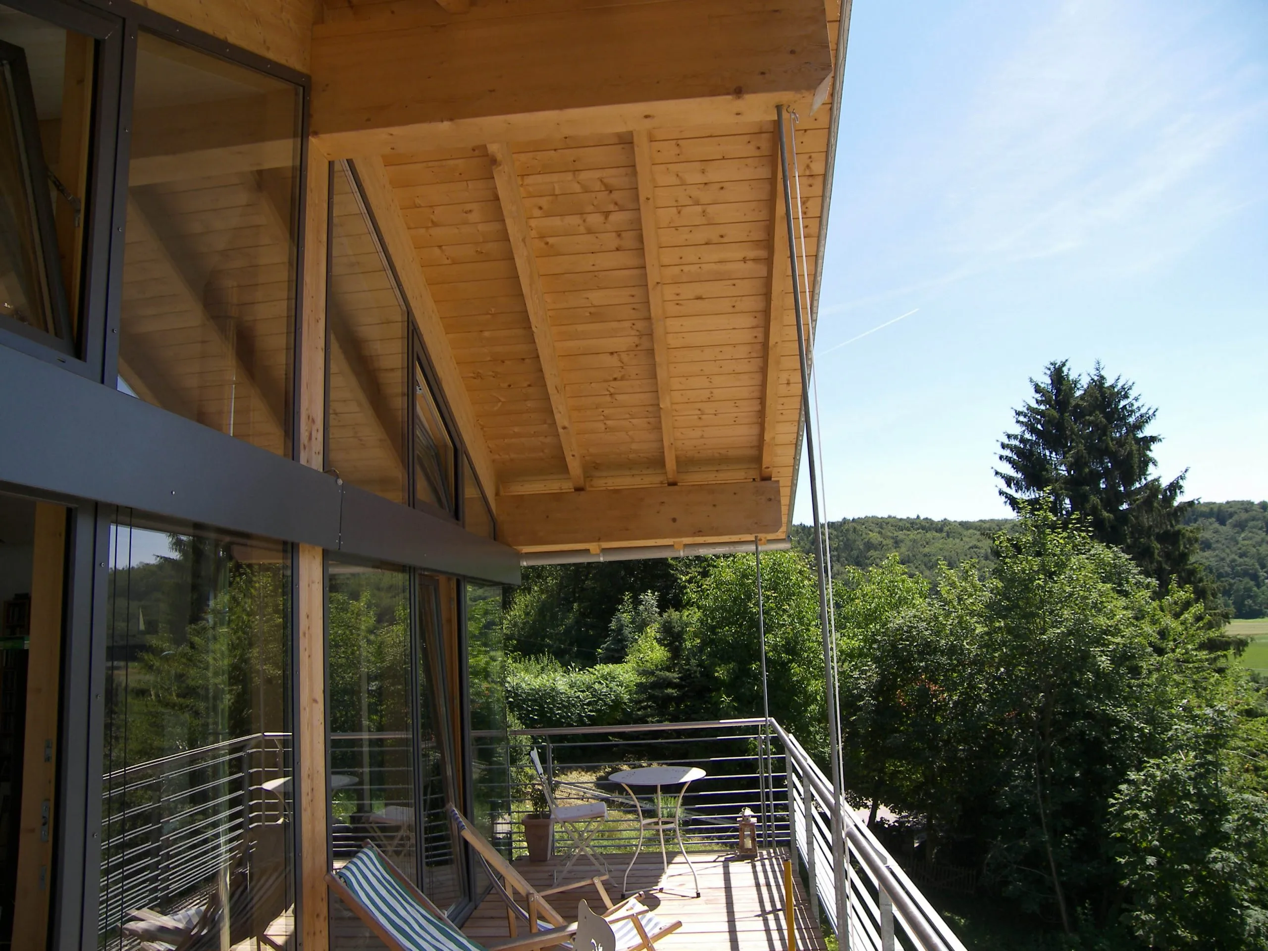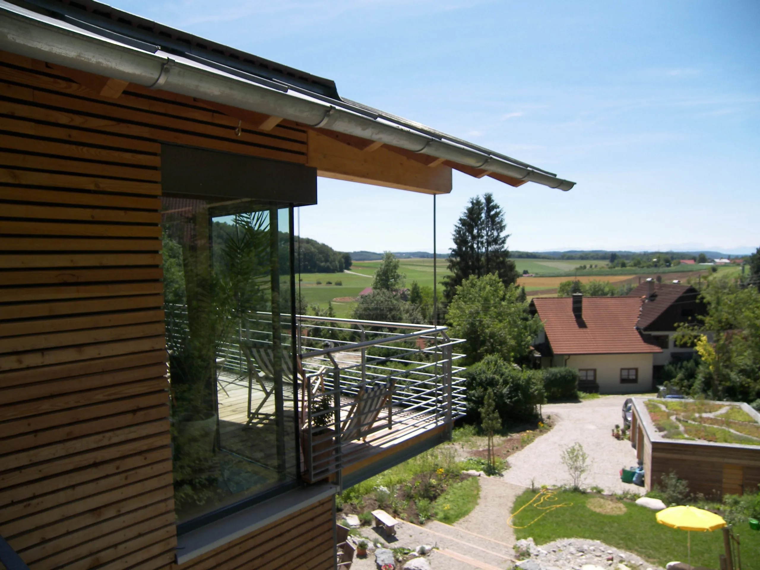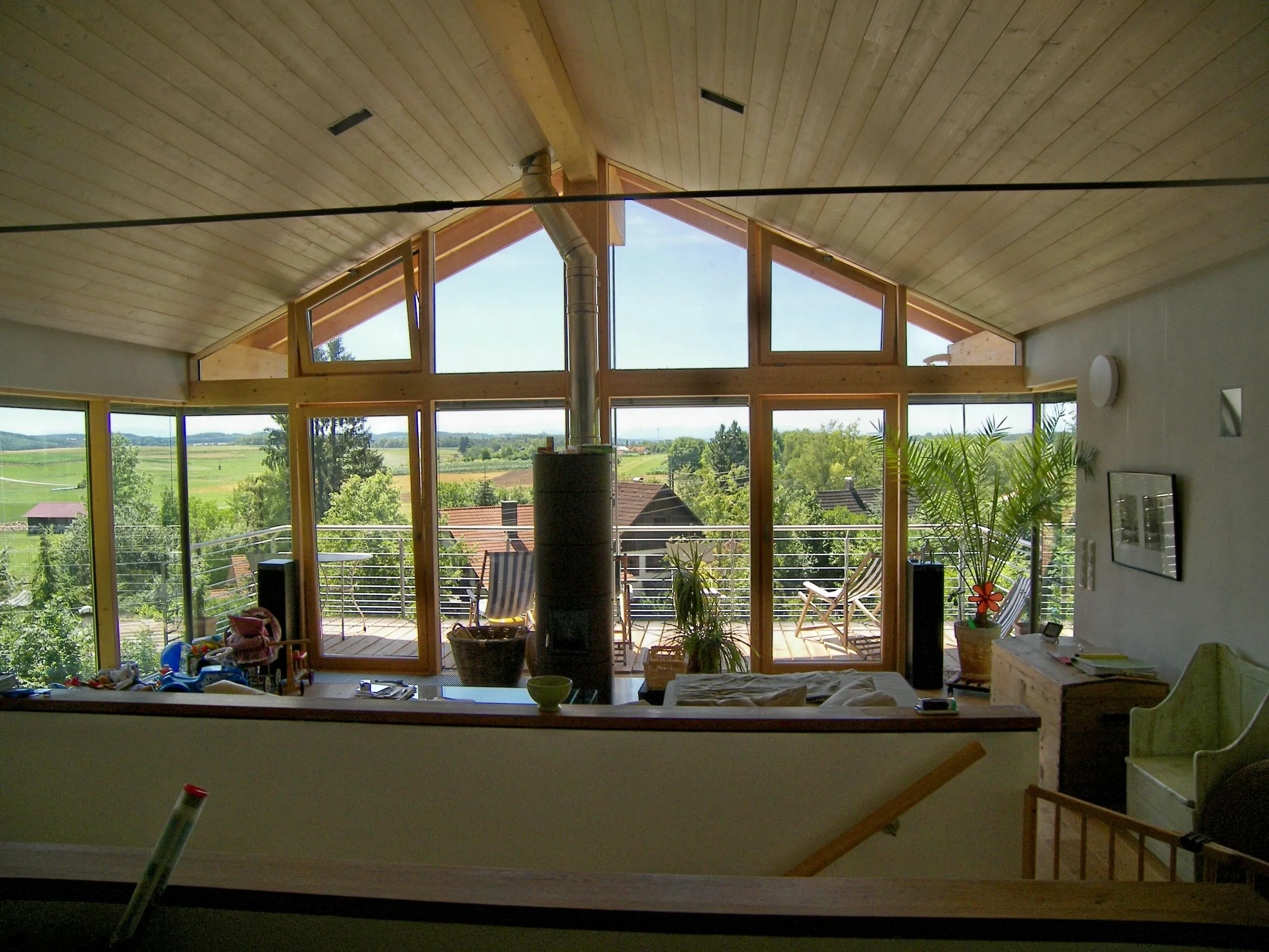 Wohnen im DG mit großem Glasgiebel für schöne Aussicht in die Berge, Balkonkonstruktion aus Stahl aufgehängt an Dachstuhl, Einliegerwohnung im KGHaus, Pelletsheizung, Abschirmgewebe unter Fassade und Dach für hochfrequente Abschirmung