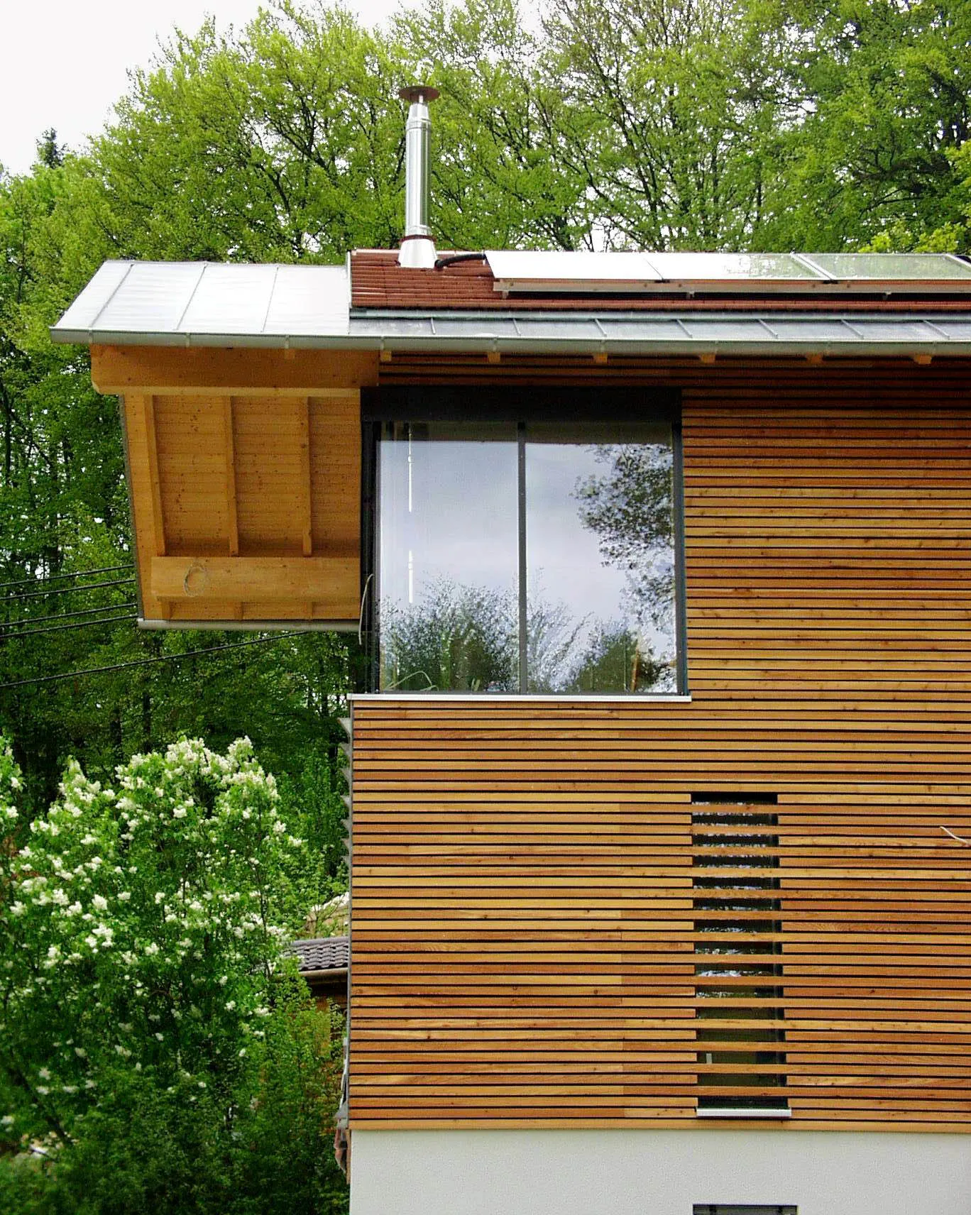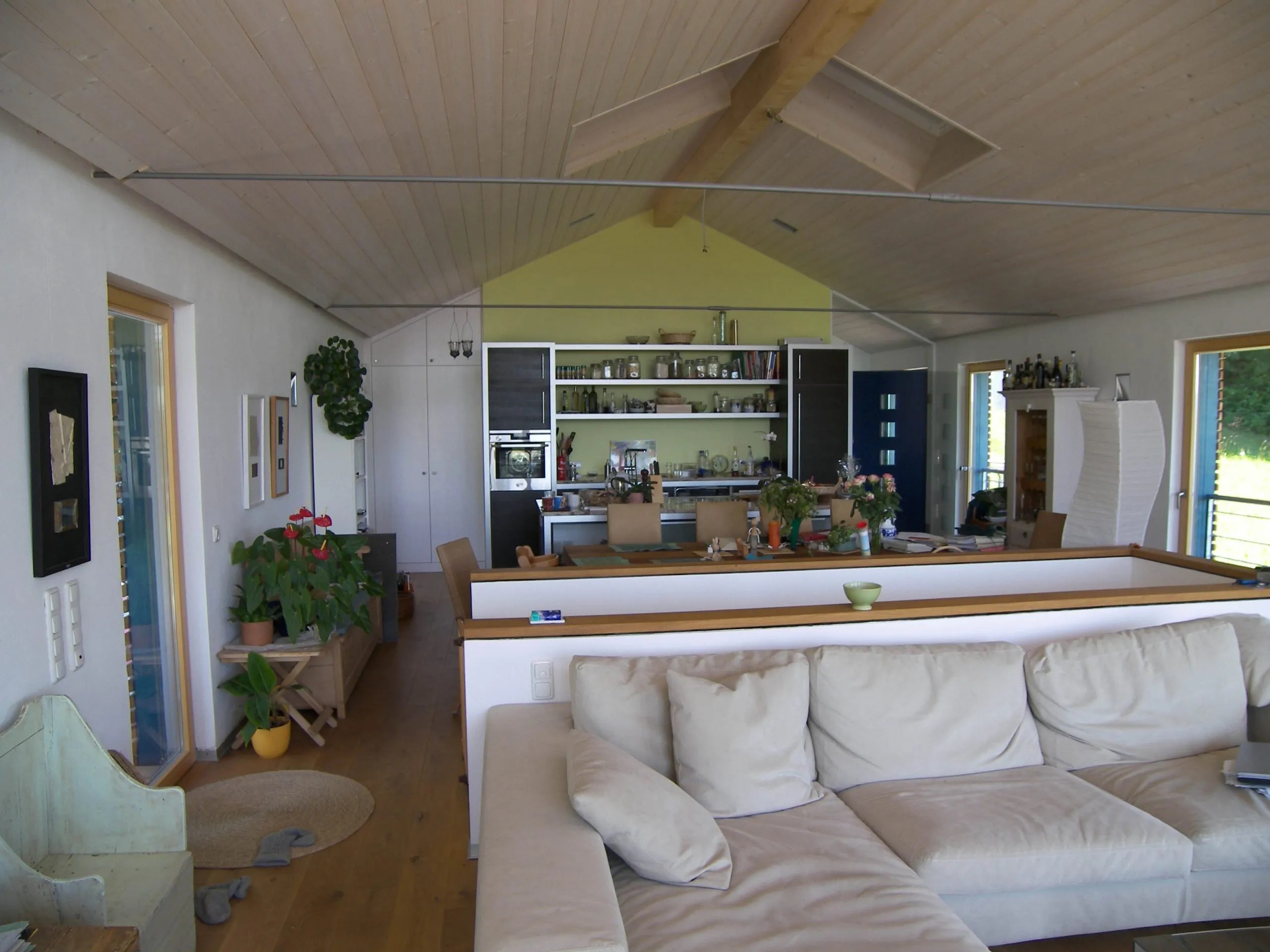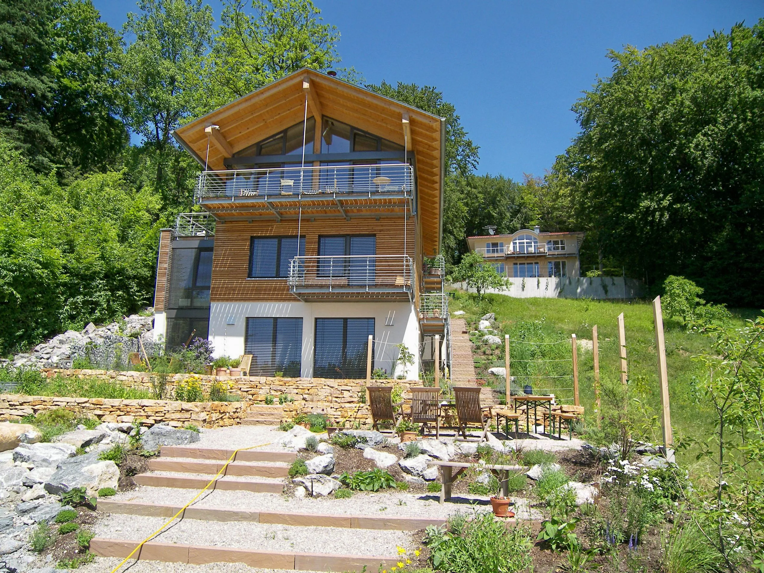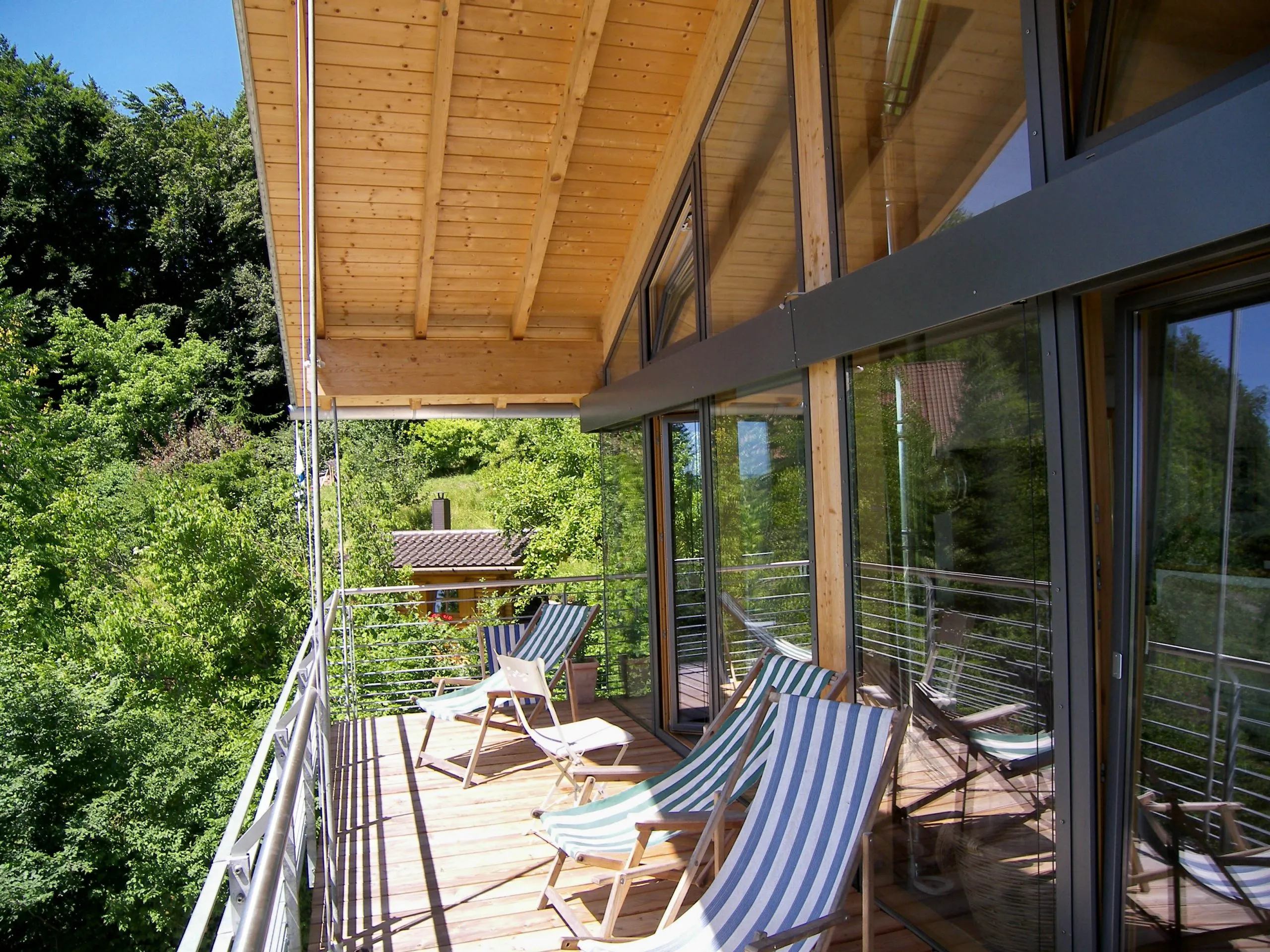 Wohnen im DG mit großem Glasgiebel für schöne Aussicht in die Berge, Balkonkonstruktion aus Stahl aufgehängt an Dachstuhl, Einliegerwohnung im KGHaus, Pelletsheizung, Abschirmgewebe unter Fassade und Dach für hochfrequente Abschirmung