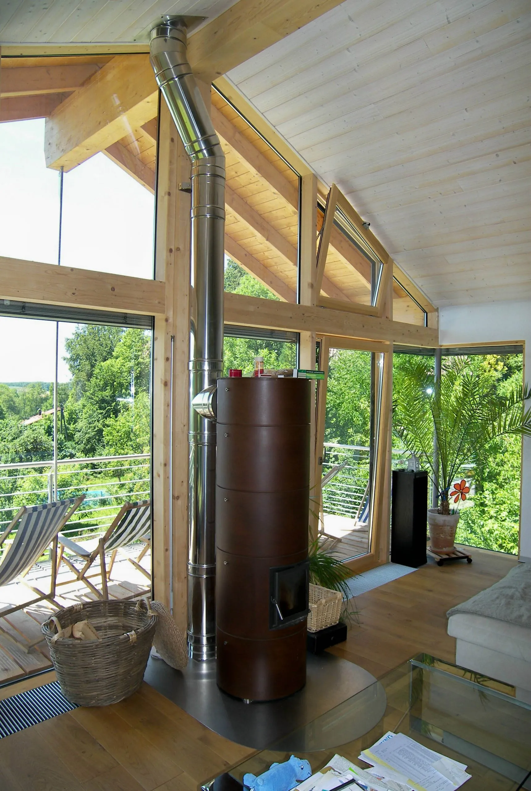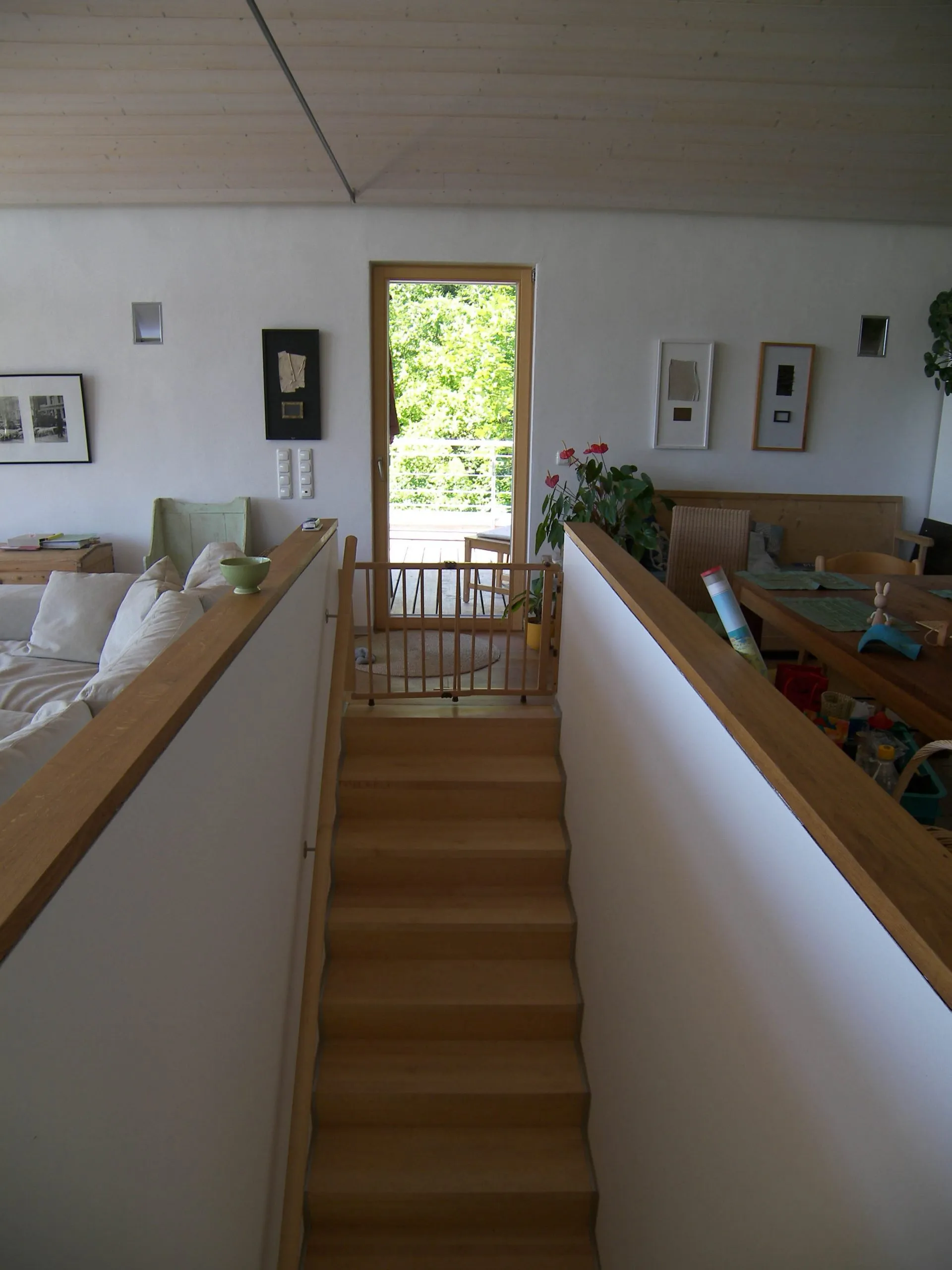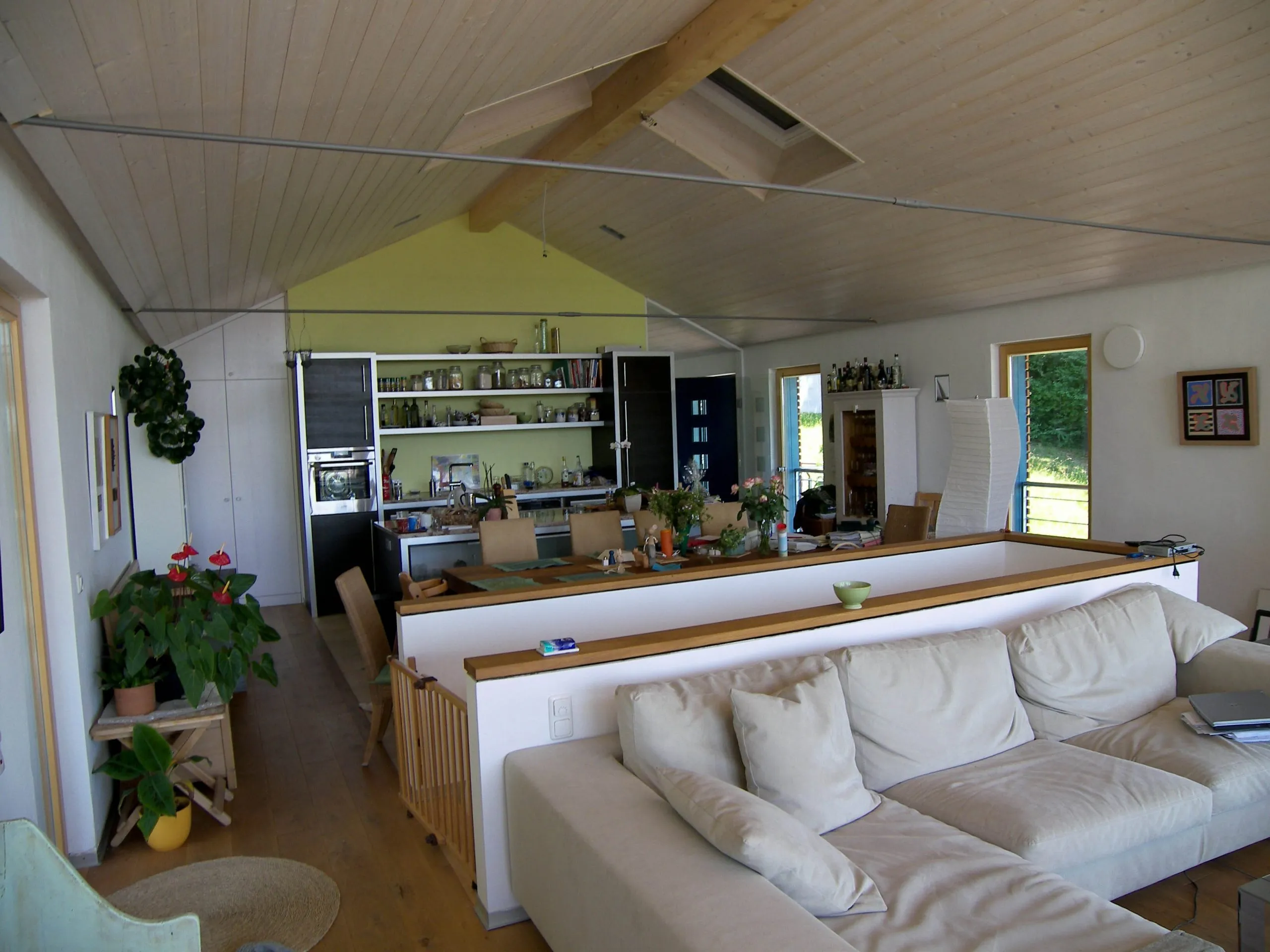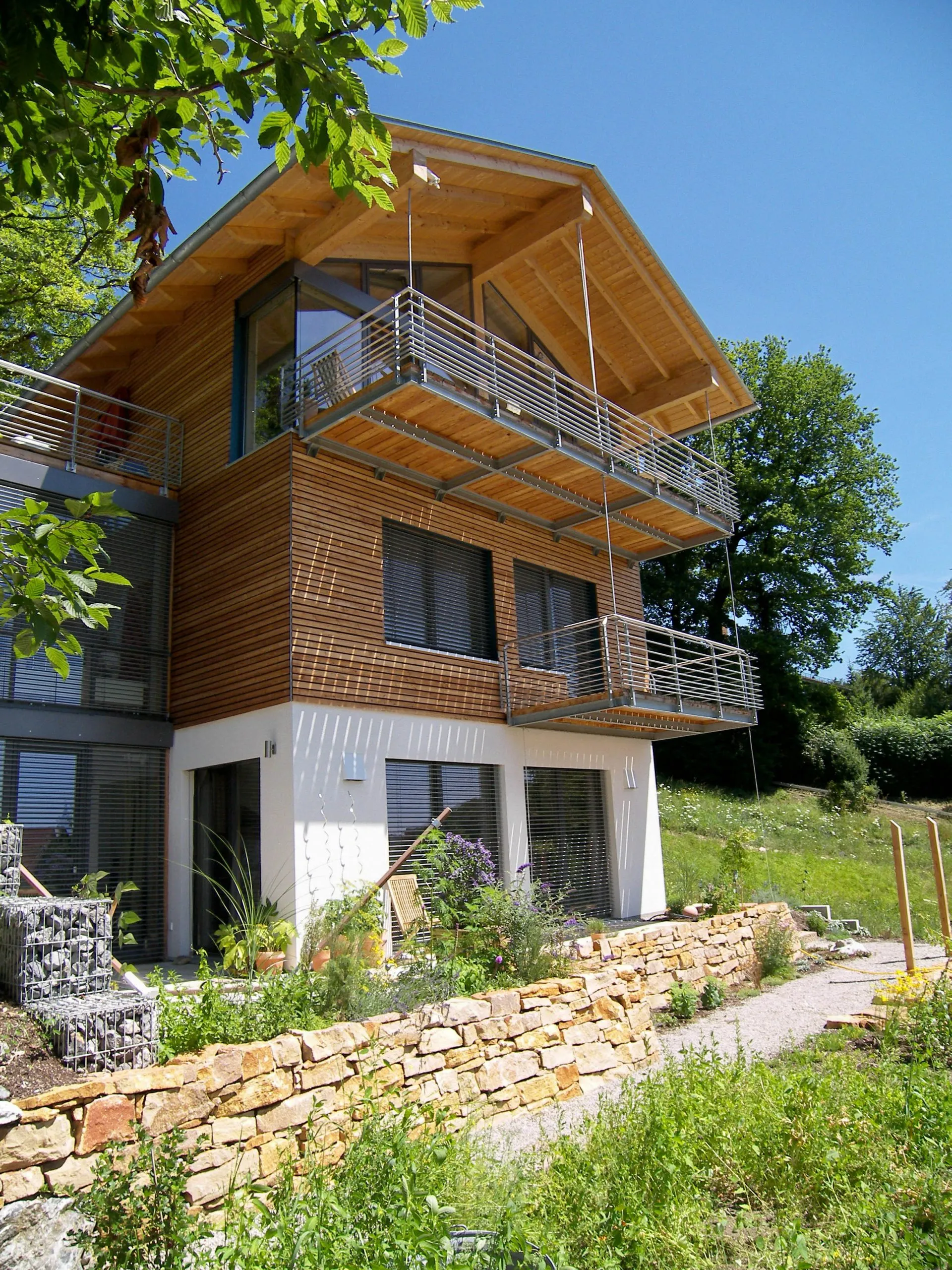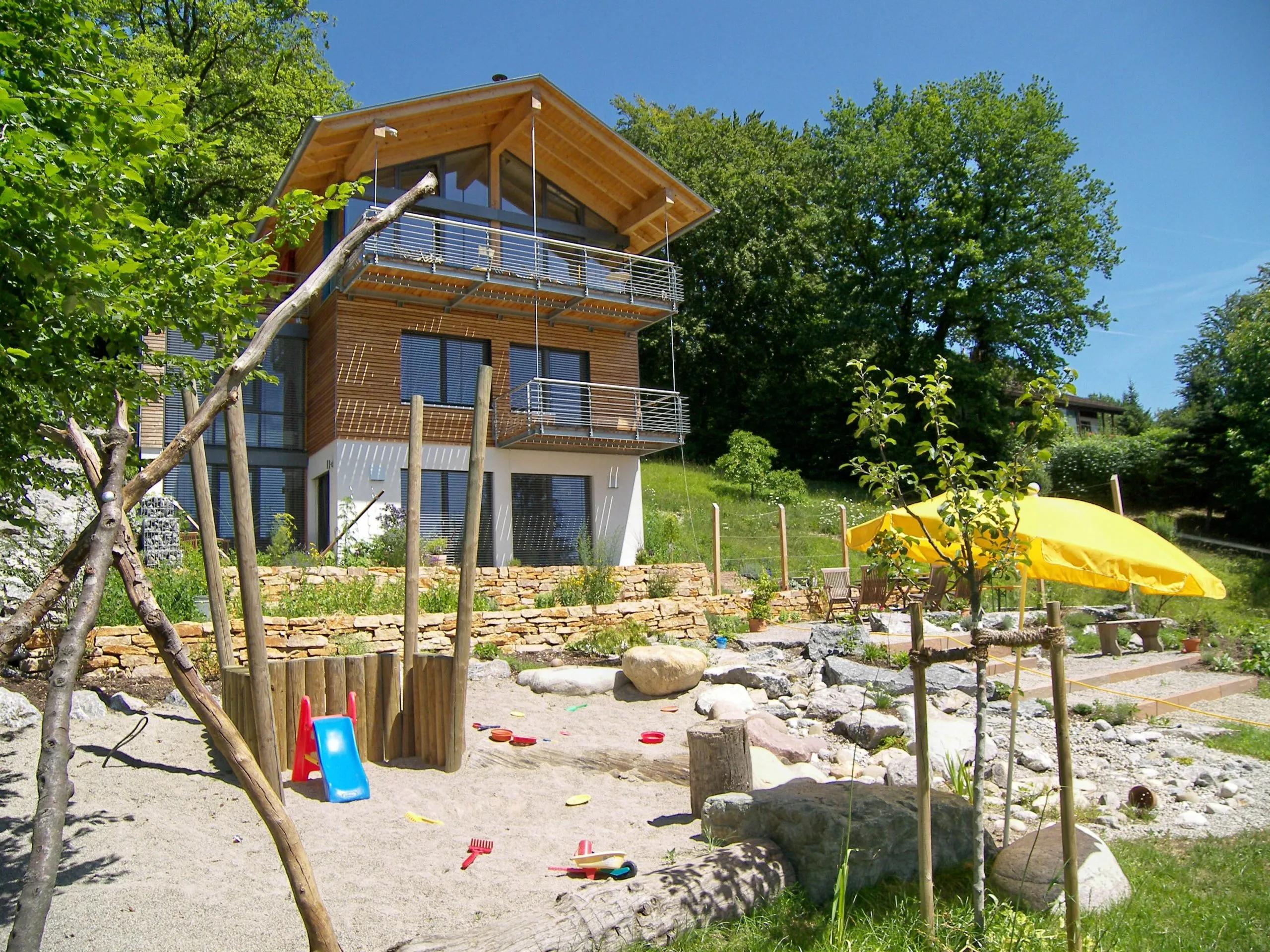 Wohnen im DG mit großem Glasgiebel für schöne Aussicht in die Berge, Balkonkonstruktion aus Stahl aufgehängt an Dachstuhl, Einliegerwohnung im KGHaus, Pelletsheizung, Abschirmgewebe unter Fassade und Dach für hochfrequente Abschirmung
