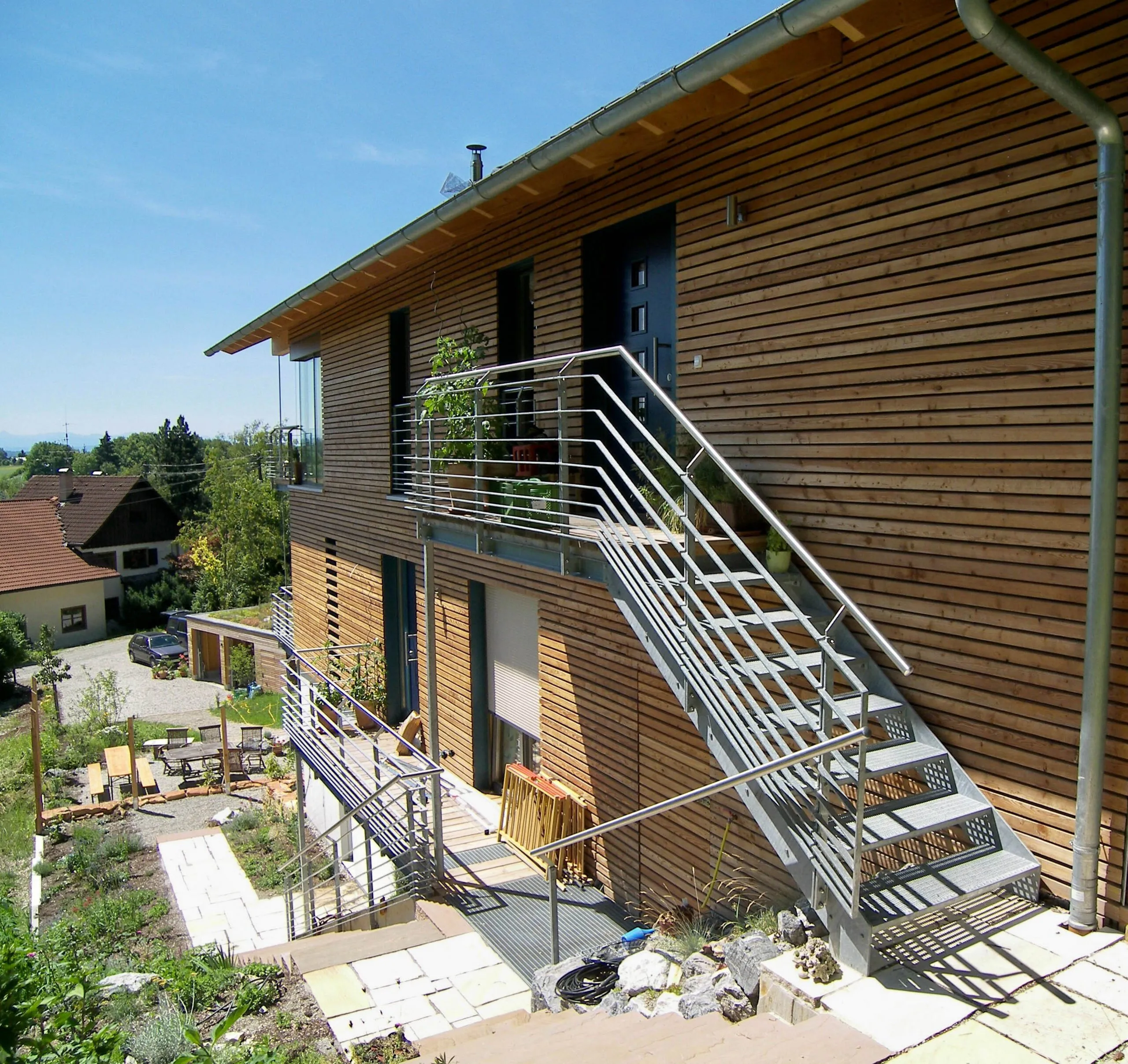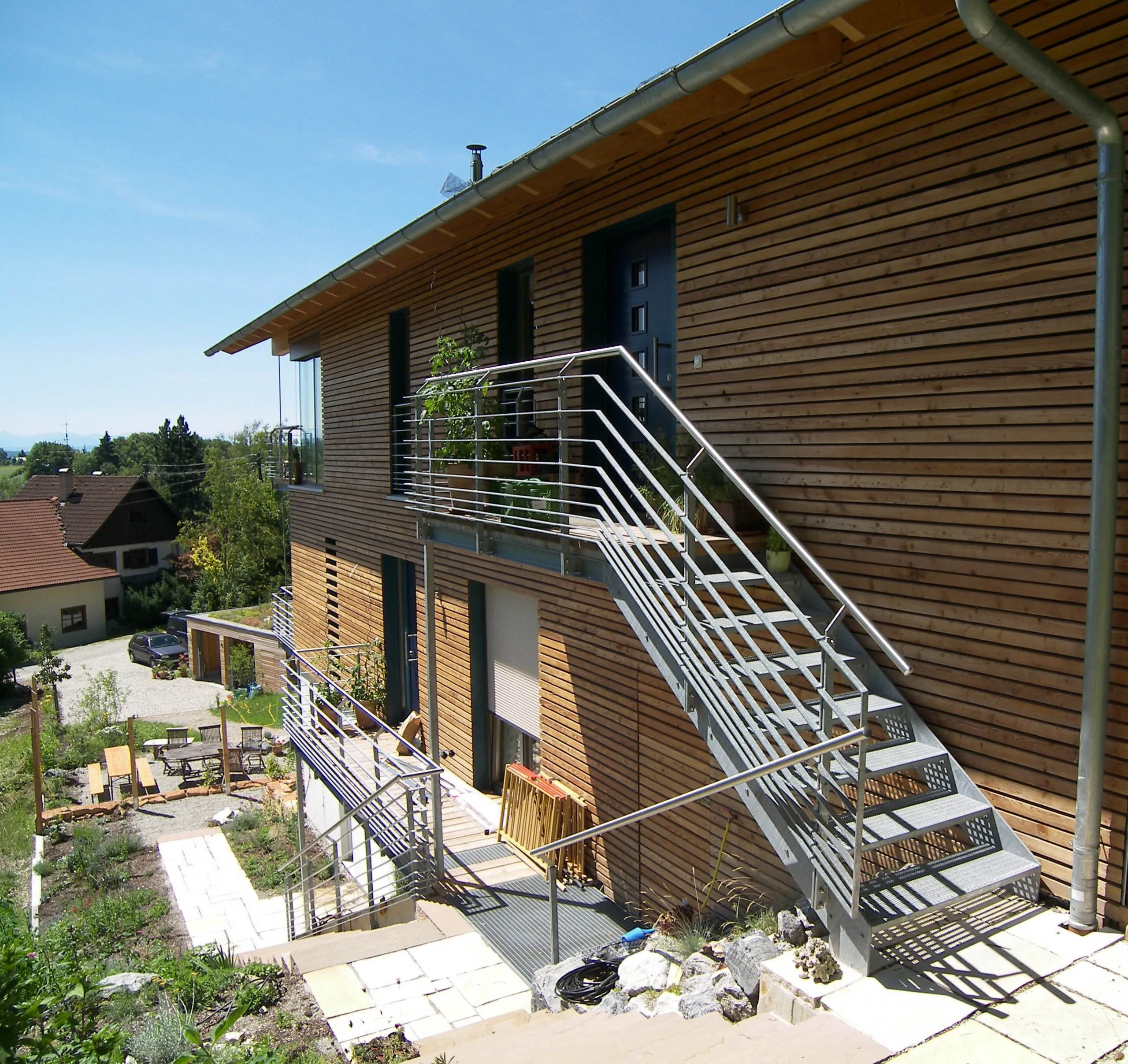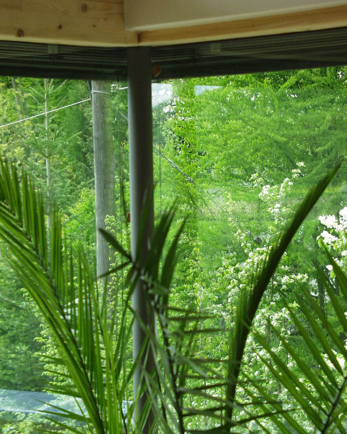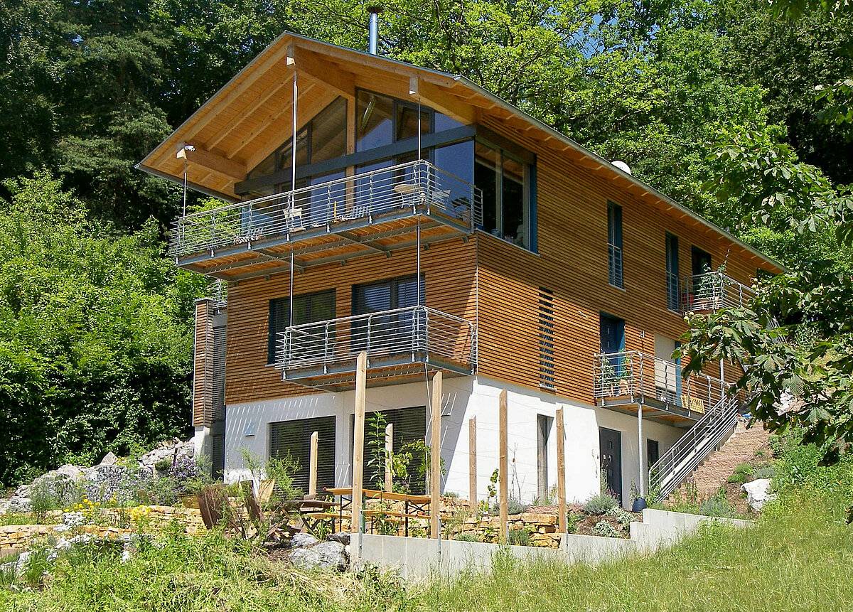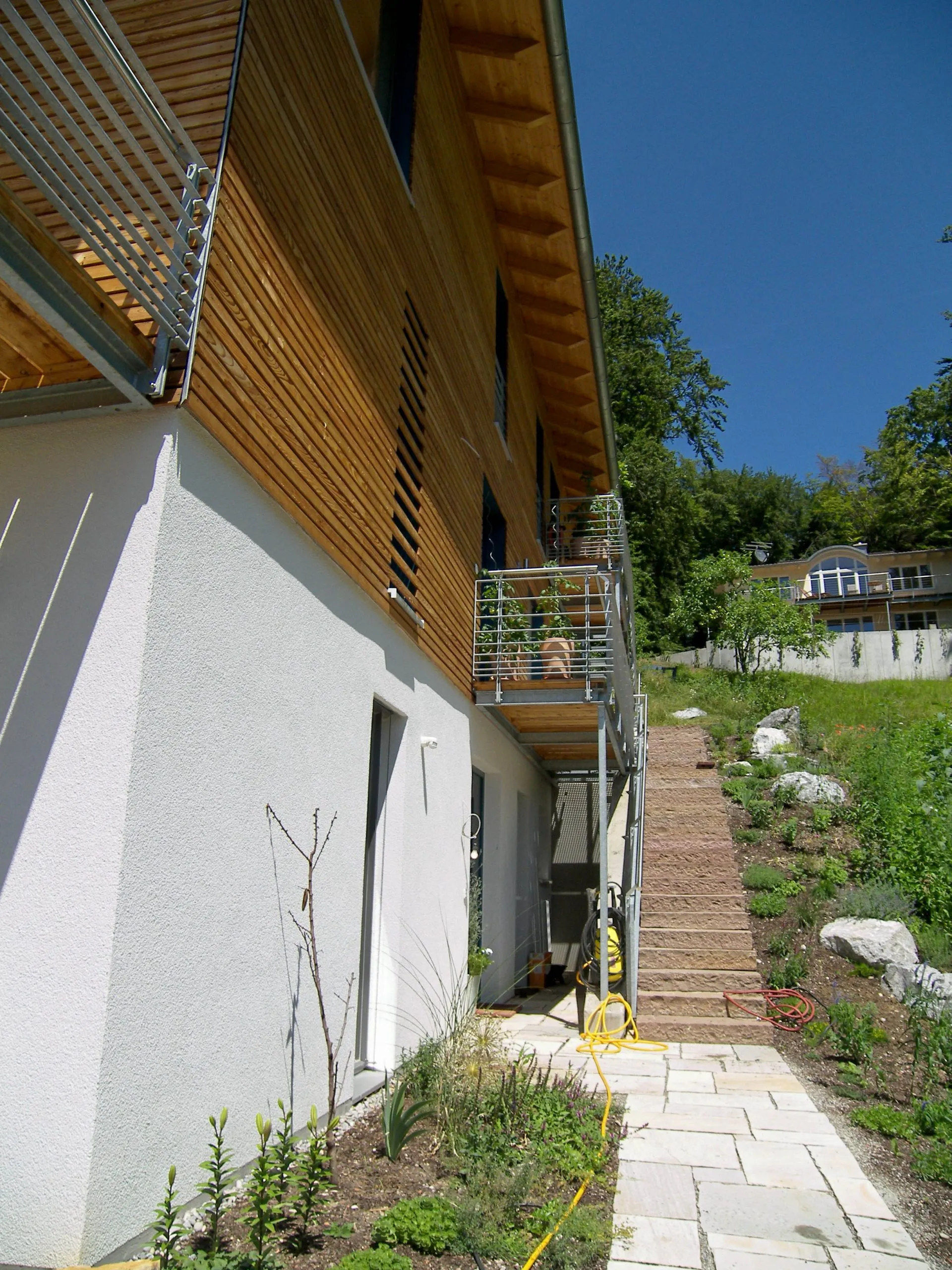 Wohnen im DG mit großem Glasgiebel für schöne Aussicht in die Berge, Balkonkonstruktion aus Stahl aufgehängt an Dachstuhl, Einliegerwohnung im KGHaus, Pelletsheizung, Abschirmgewebe unter Fassade und Dach für hochfrequente Abschirmung