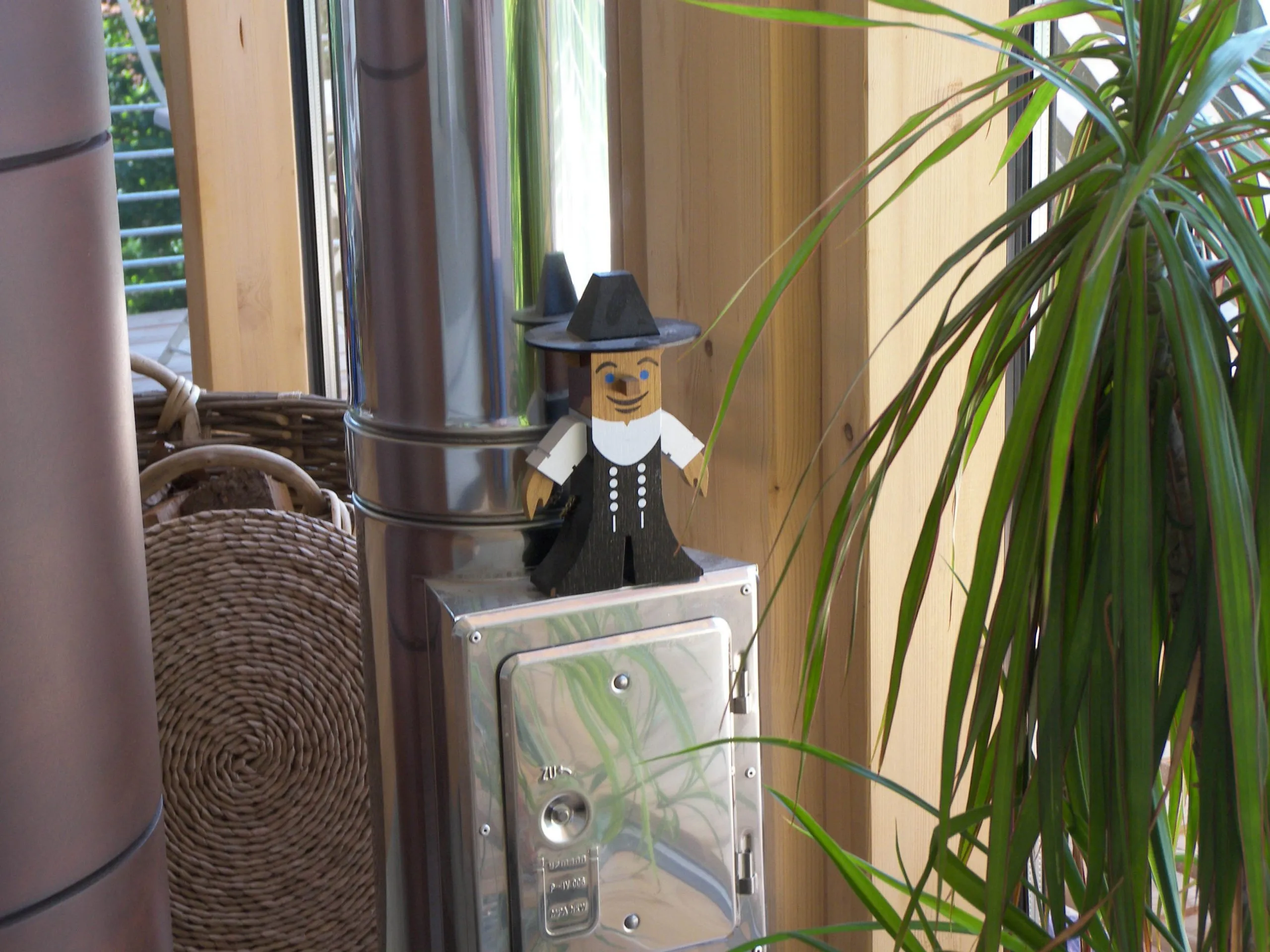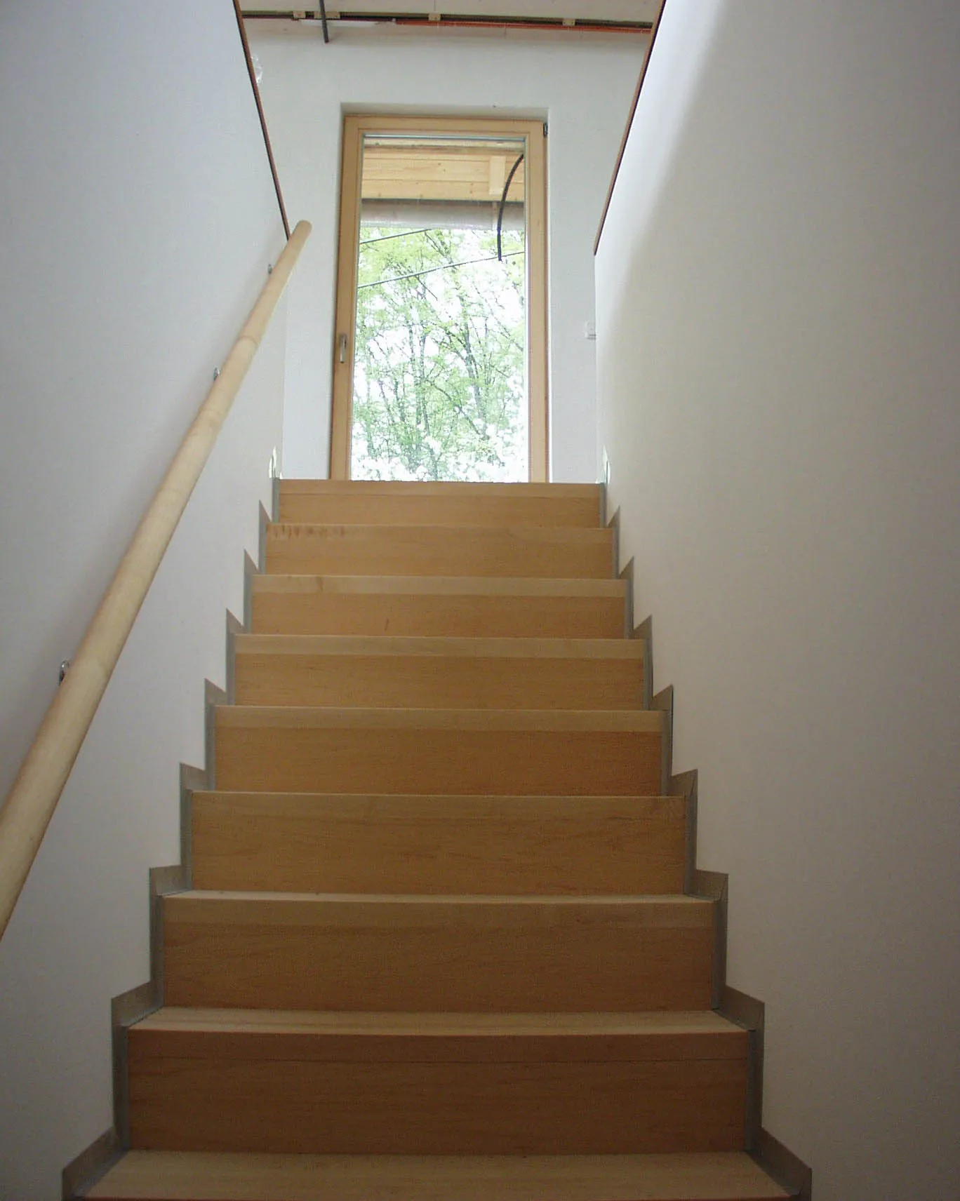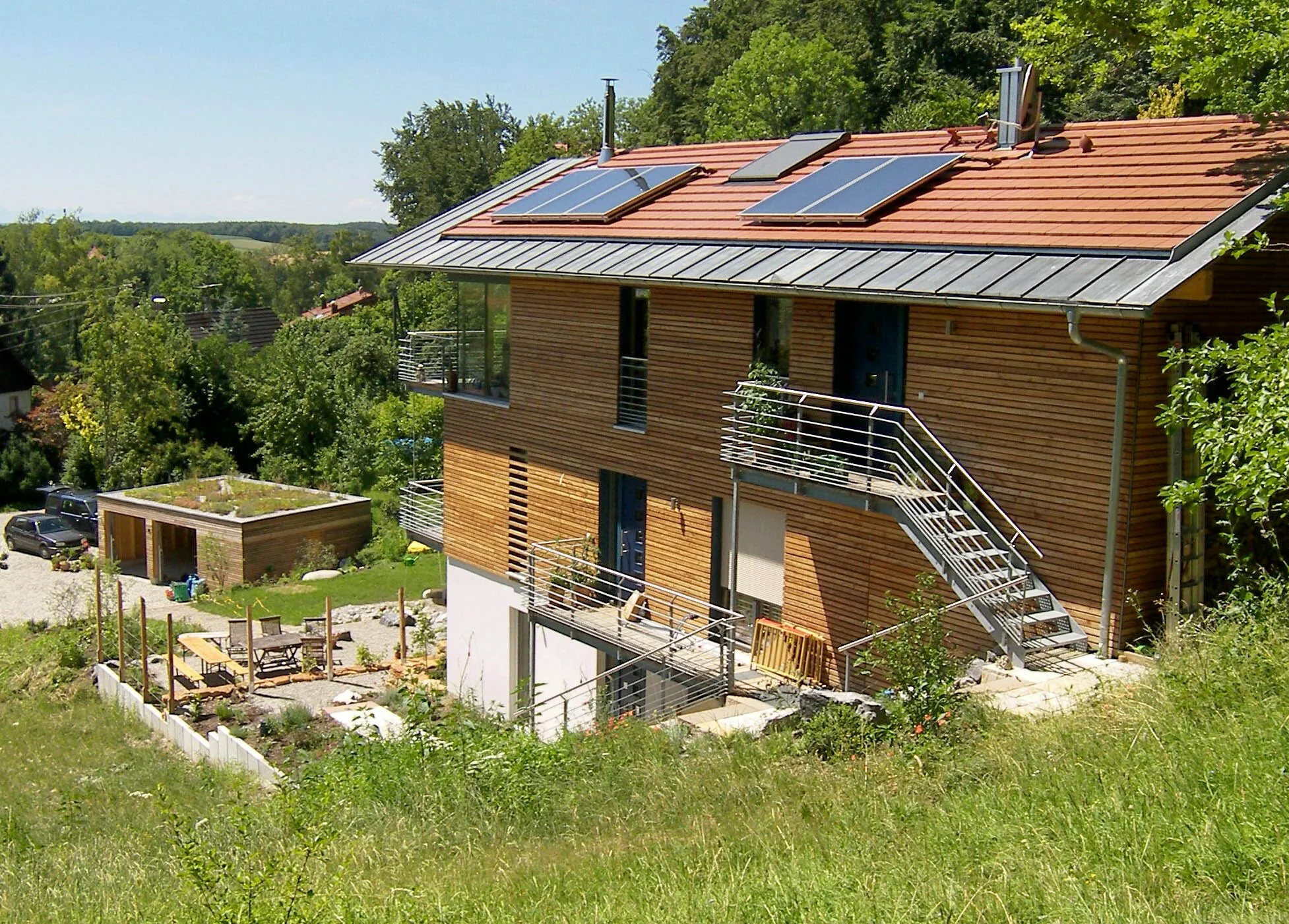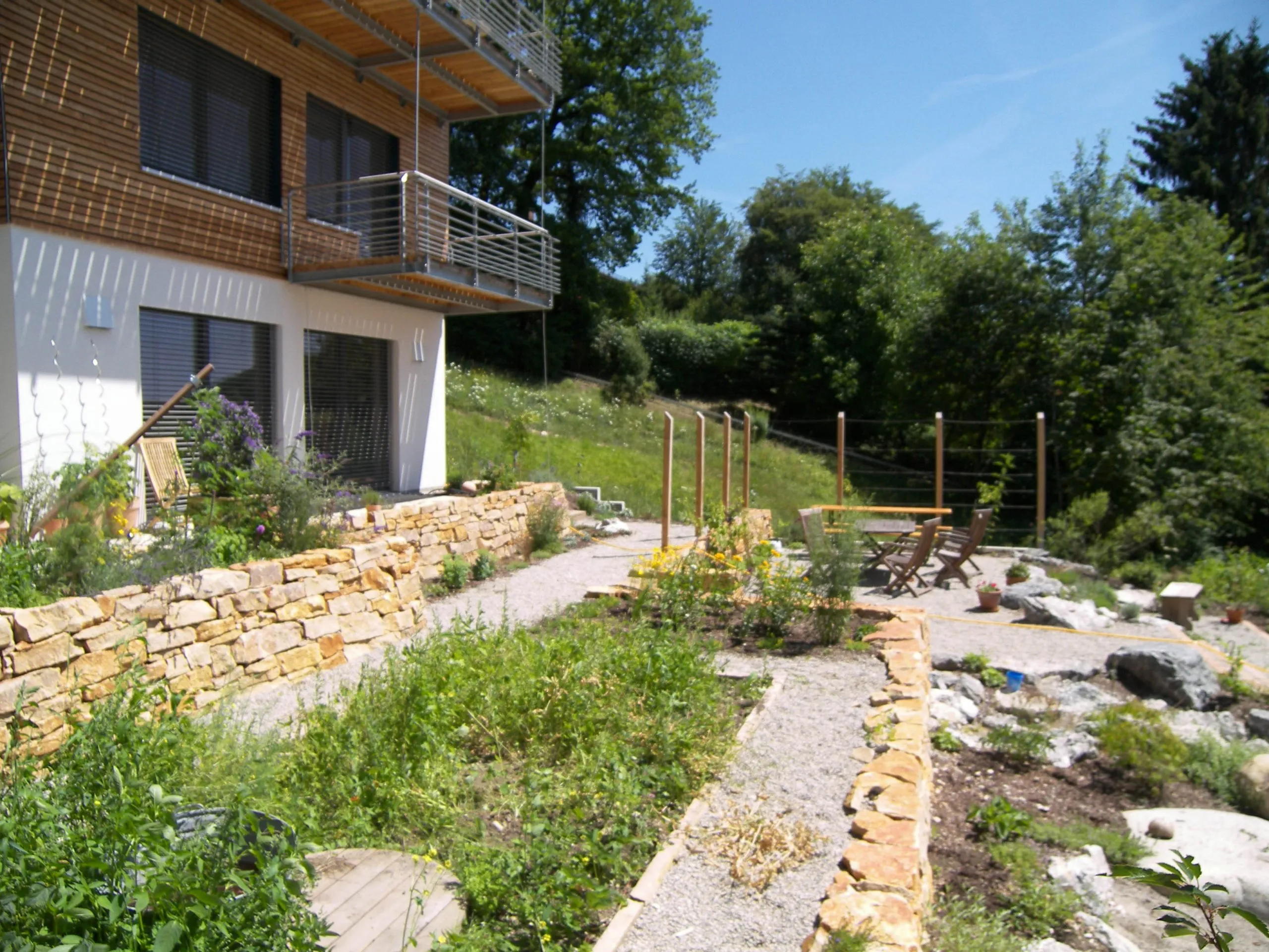Wohnen im DG mit großem Glasgiebel für schöne Aussicht in die Berge, Balkonkonstruktion aus Stahl aufgehängt an Dachstuhl, Einliegerwohnung im KGHaus, Pelletsheizung, Abschirmgewebe unter Fassade und Dach für hochfrequente Abschirmung