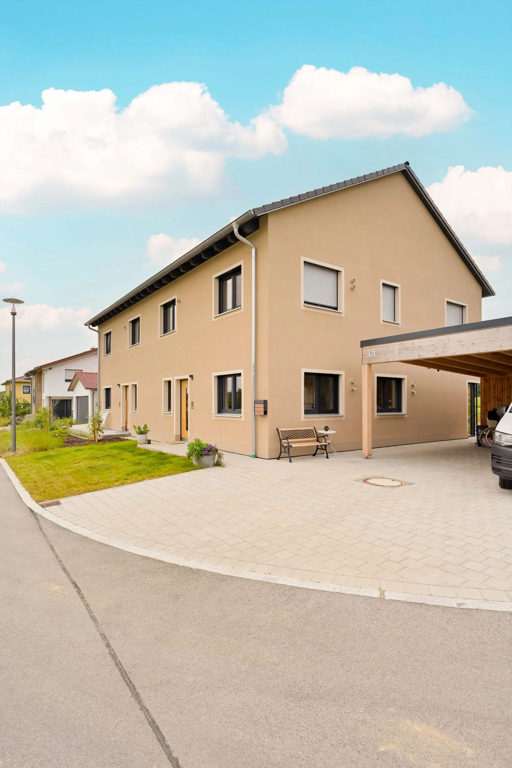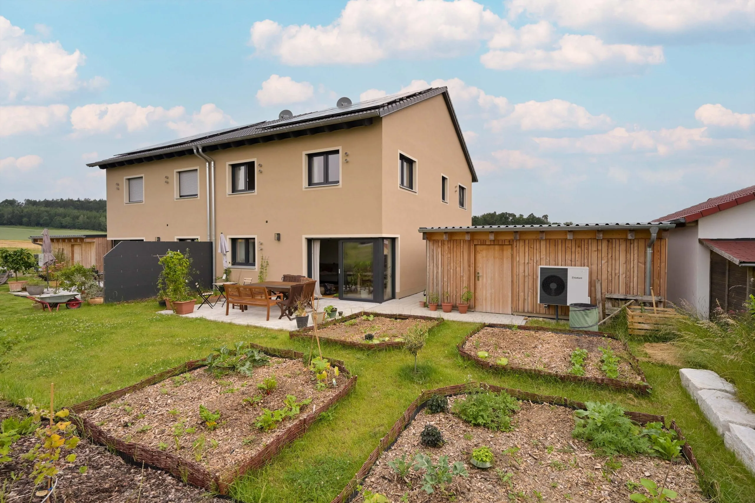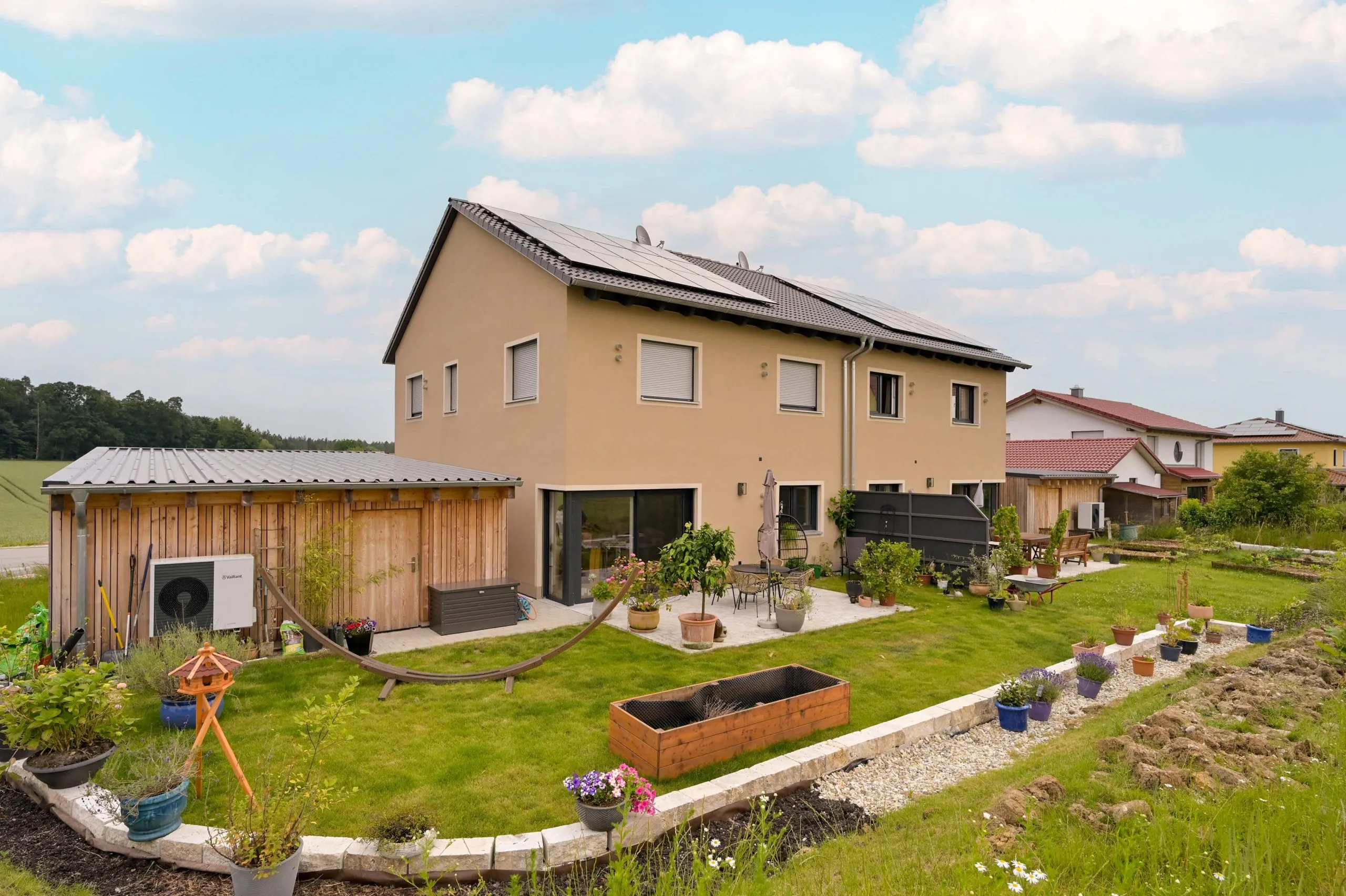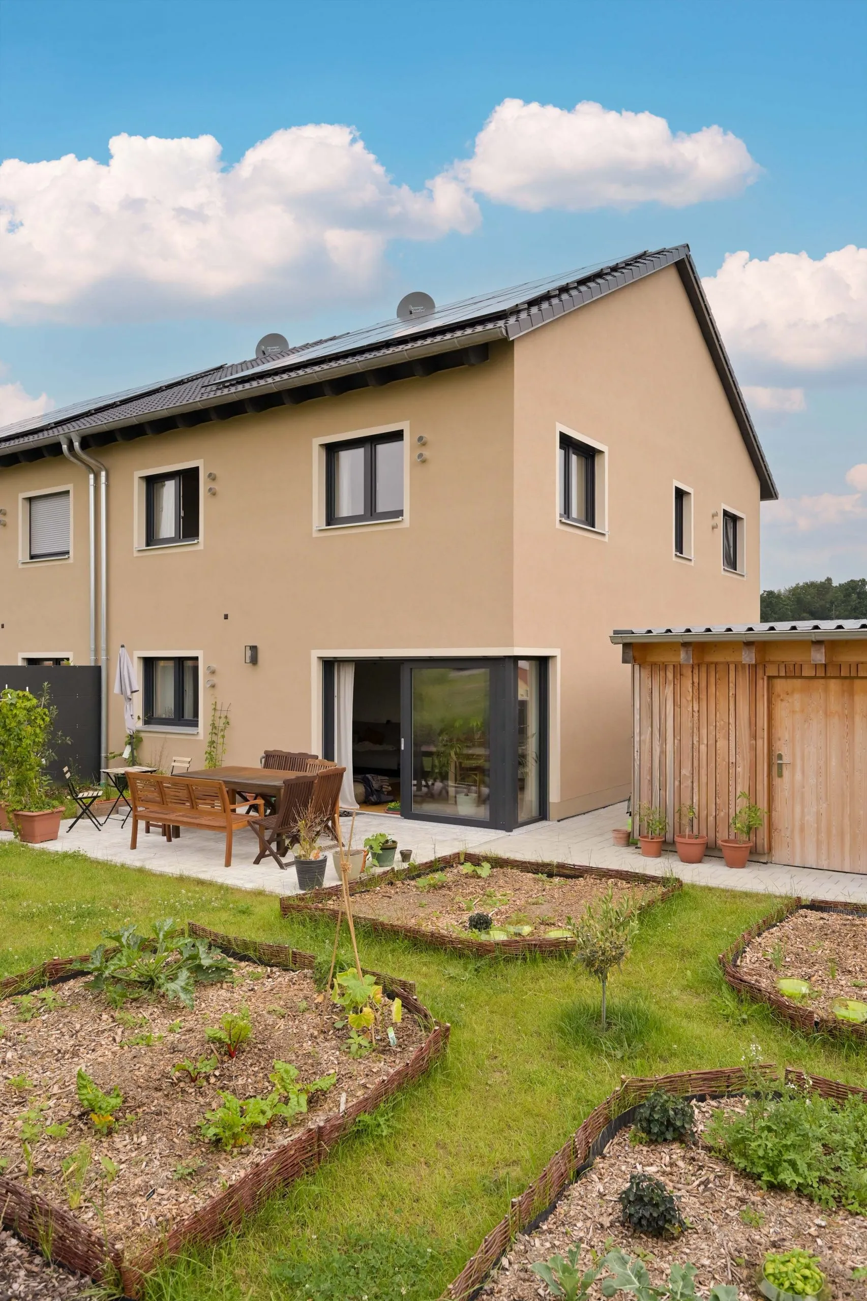 Lofttüre, LED-Leisten an der Sichtdecke, Technikraum hinter dem Carport, Sichtschutz im Gartenbereich als Abtrennung der beiden Doppelhaushälften