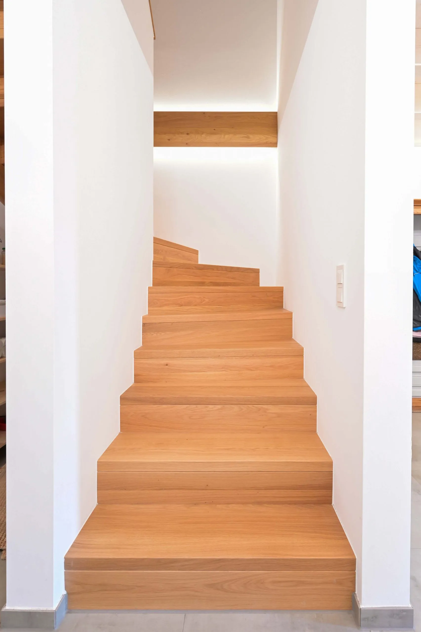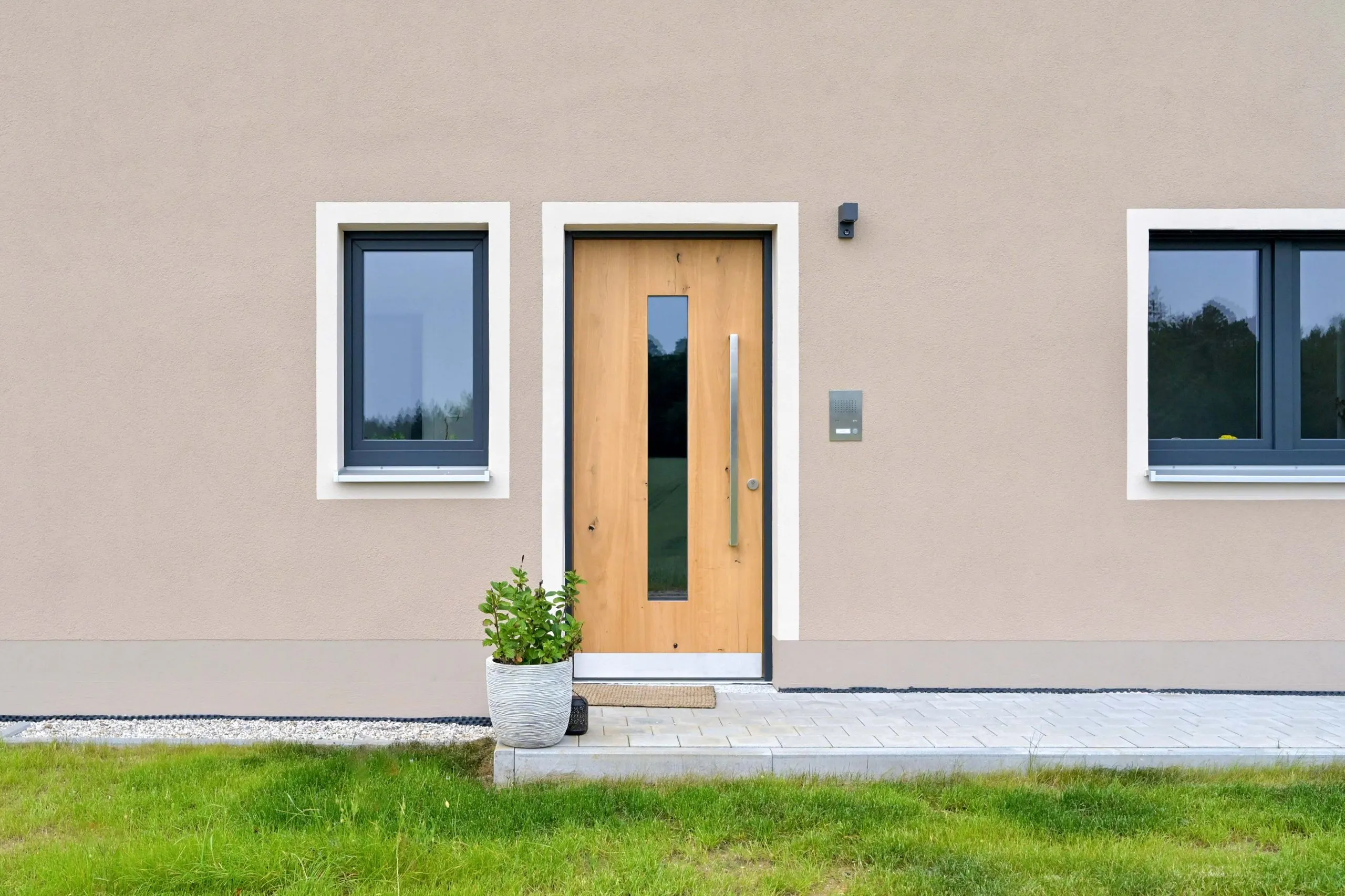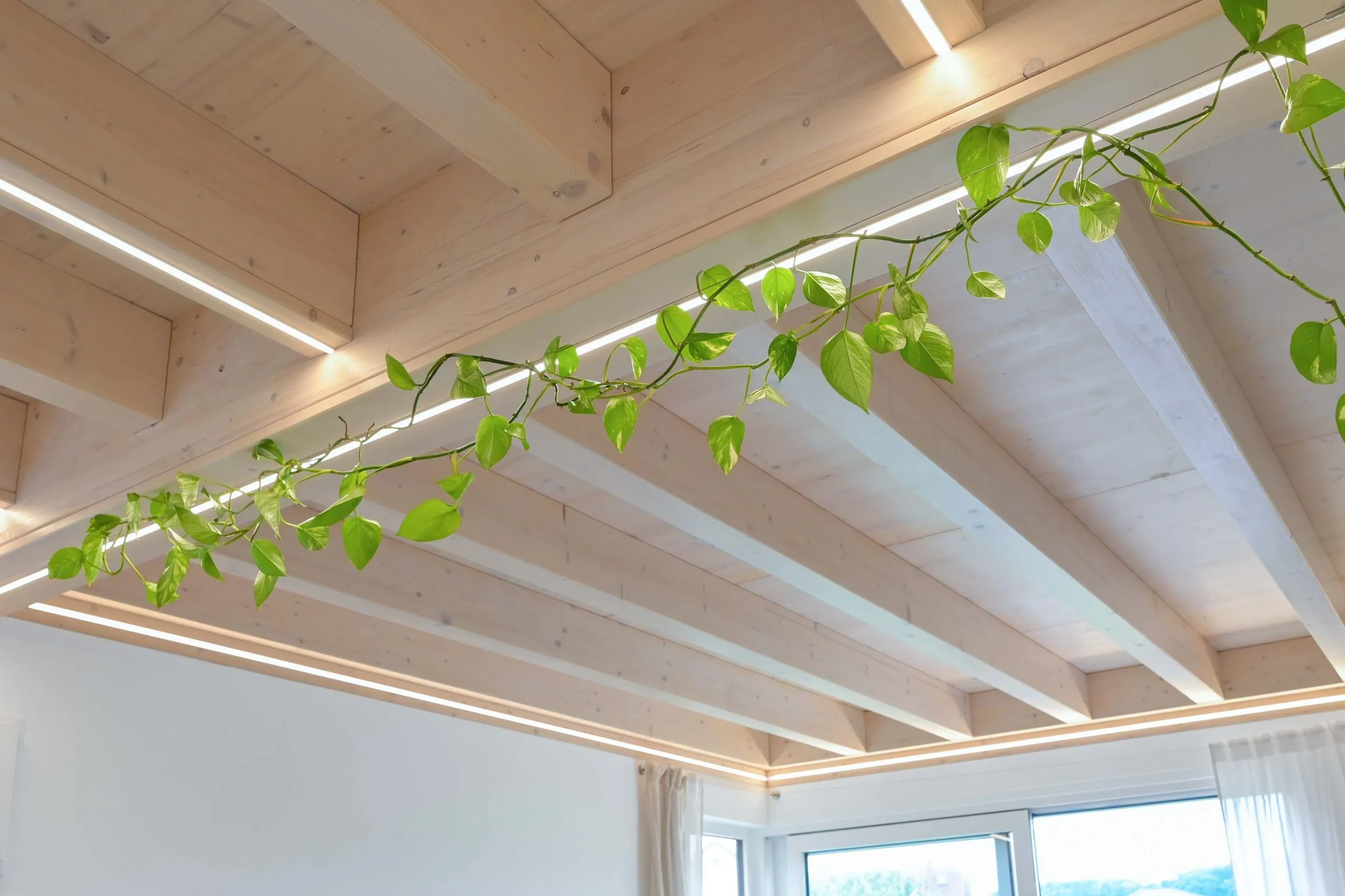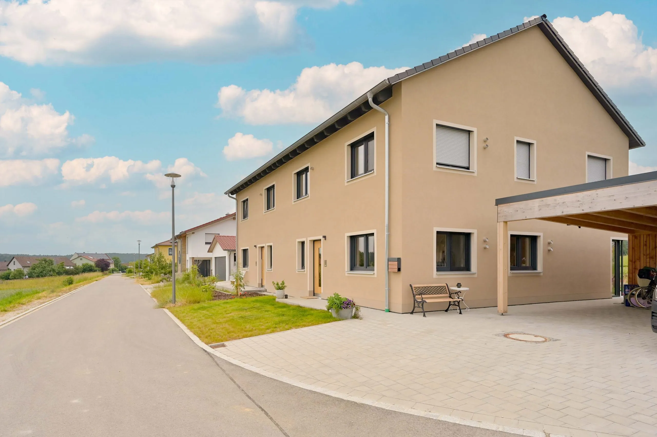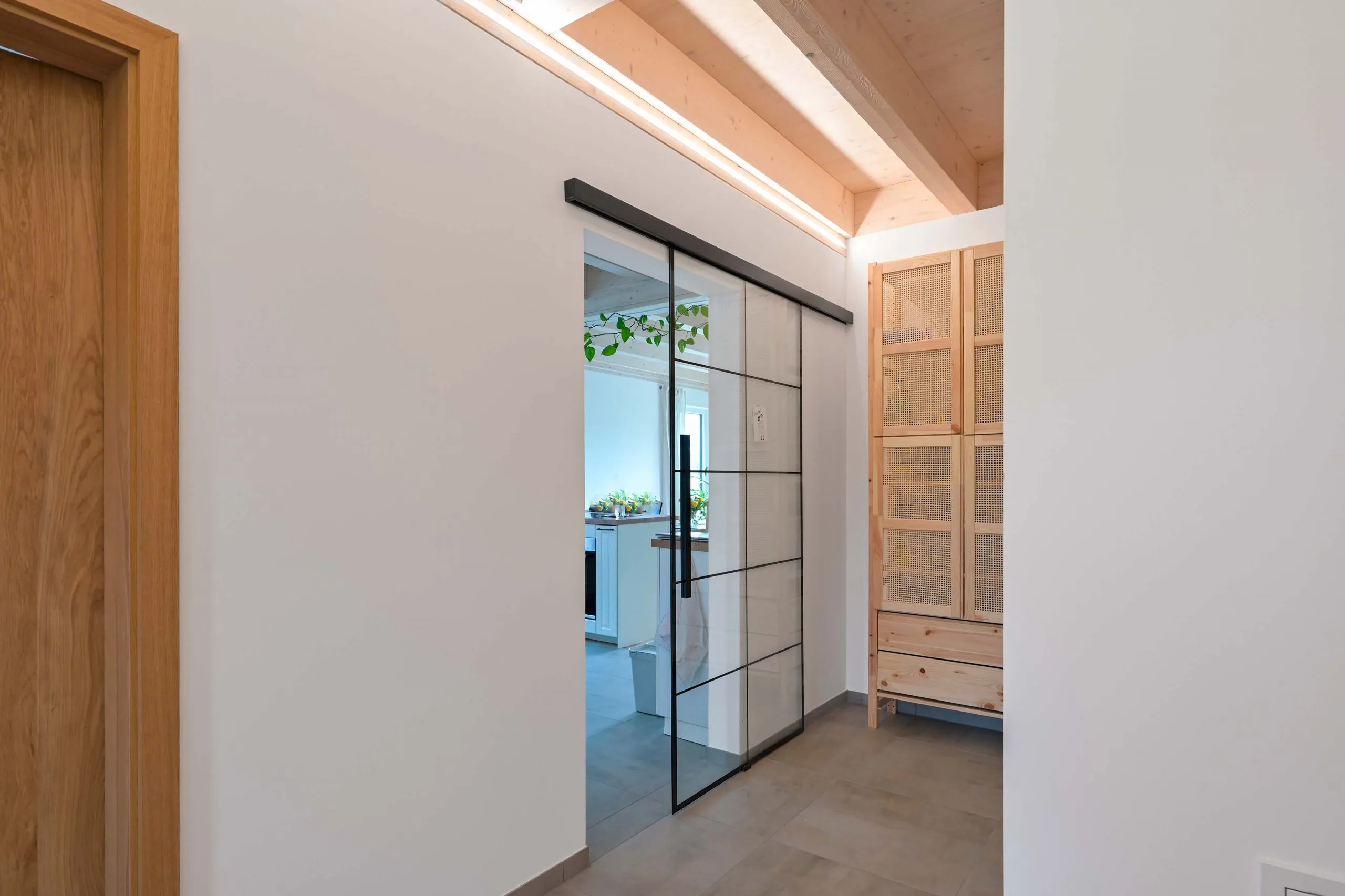 Lofttüre, LED-Leisten an der Sichtdecke, Technikraum hinter dem Carport, Sichtschutz im Gartenbereich als Abtrennung der beiden Doppelhaushälften