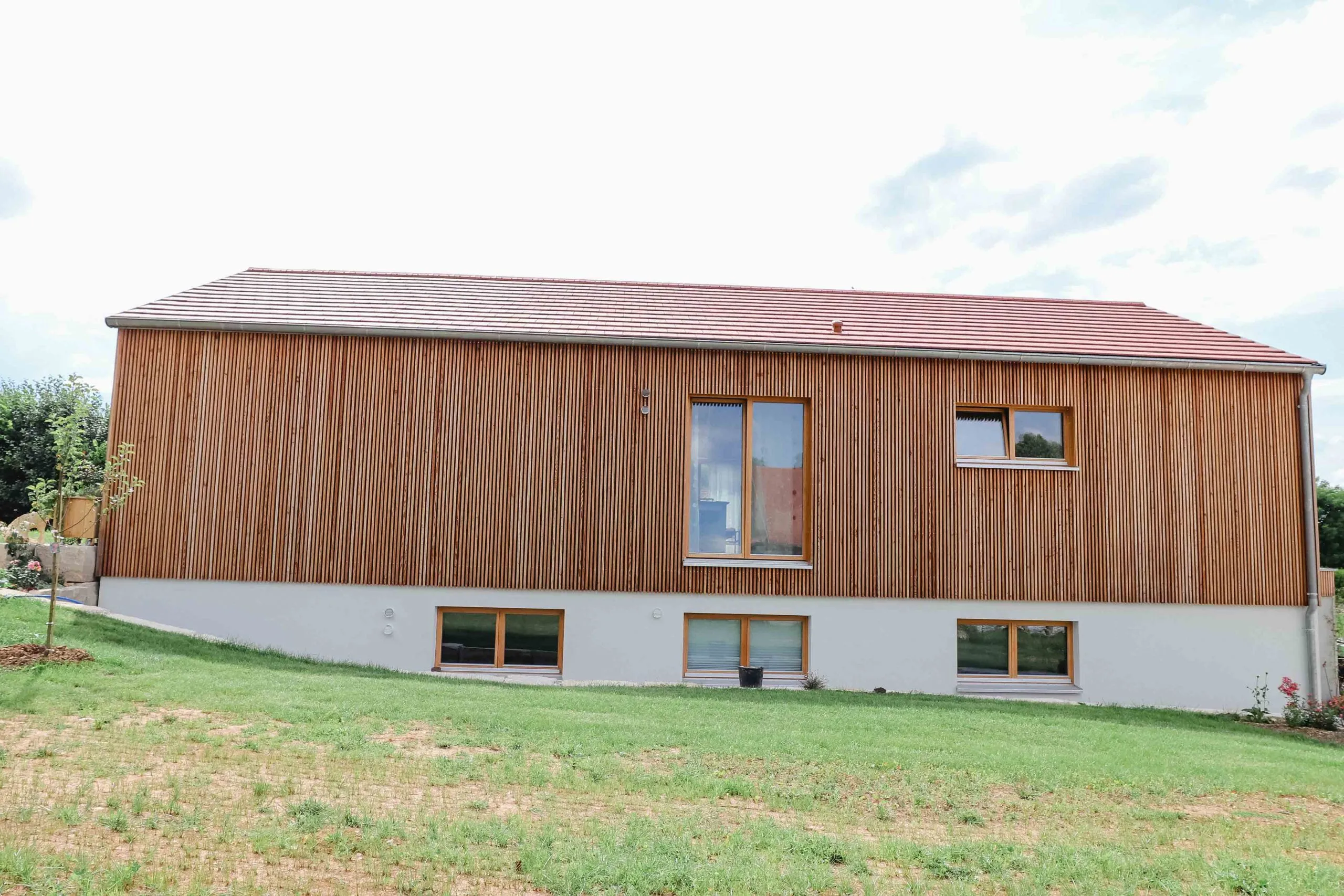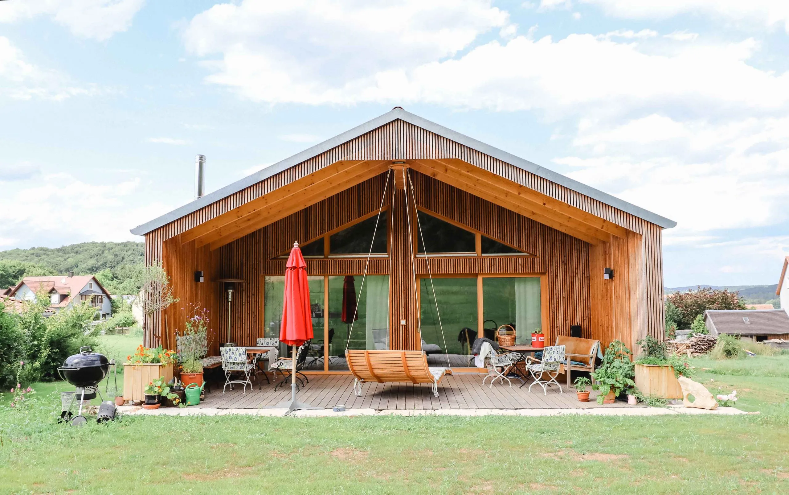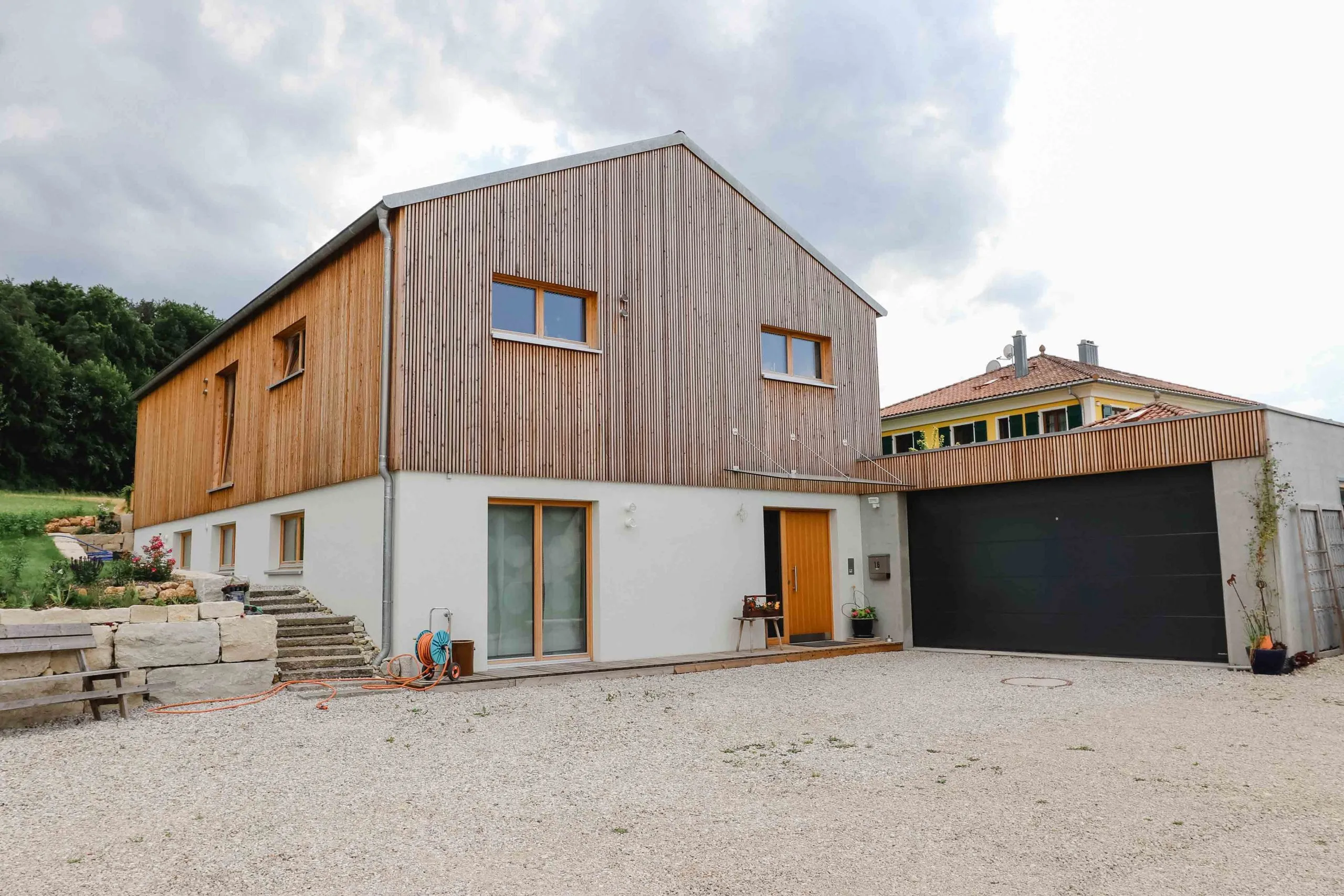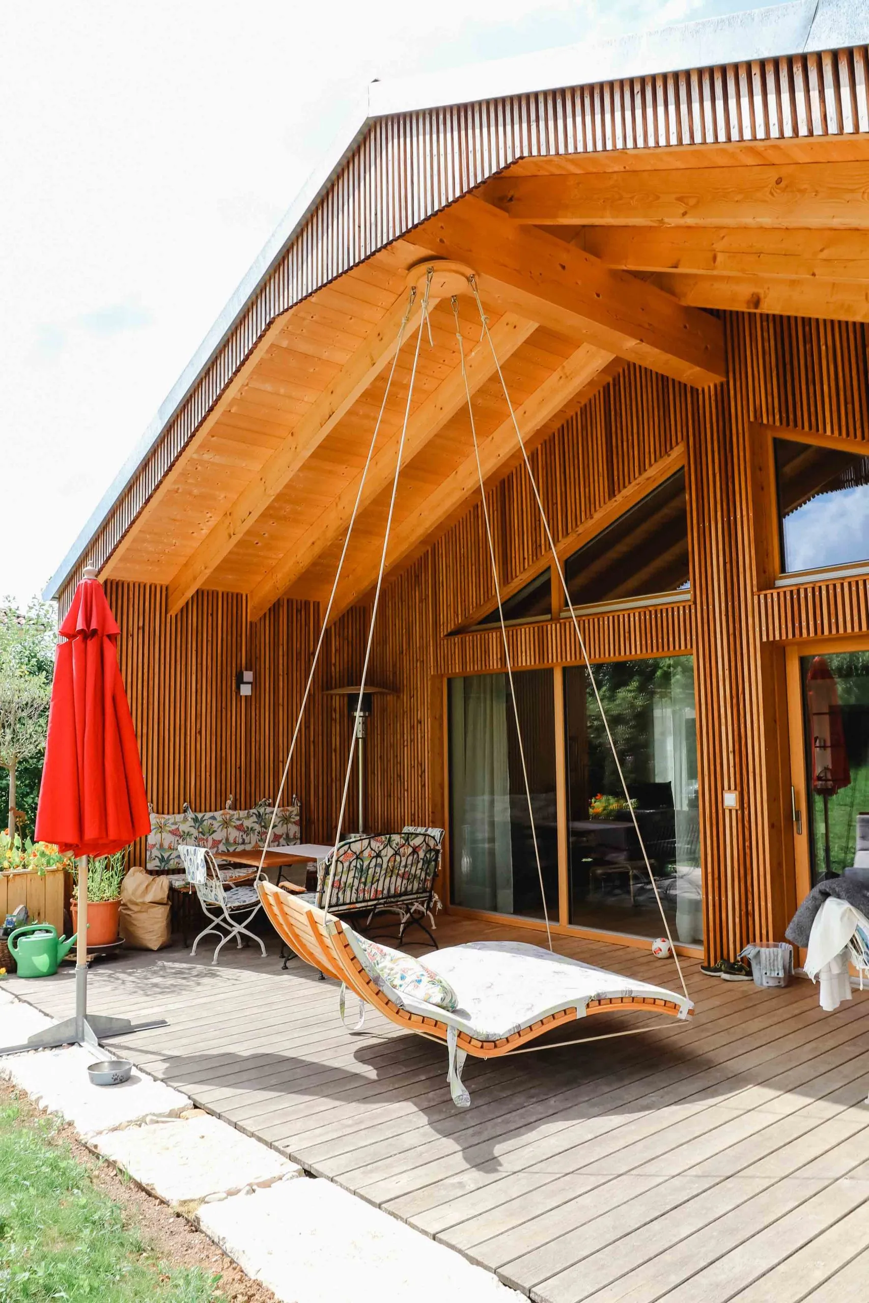 Terrasse durch großem Dachüberstand natürlich beschattet, Untergeschoss durch Hang als Einliegerwohnung genutzt, senkrechte Lärchenschalung unbehandelt
