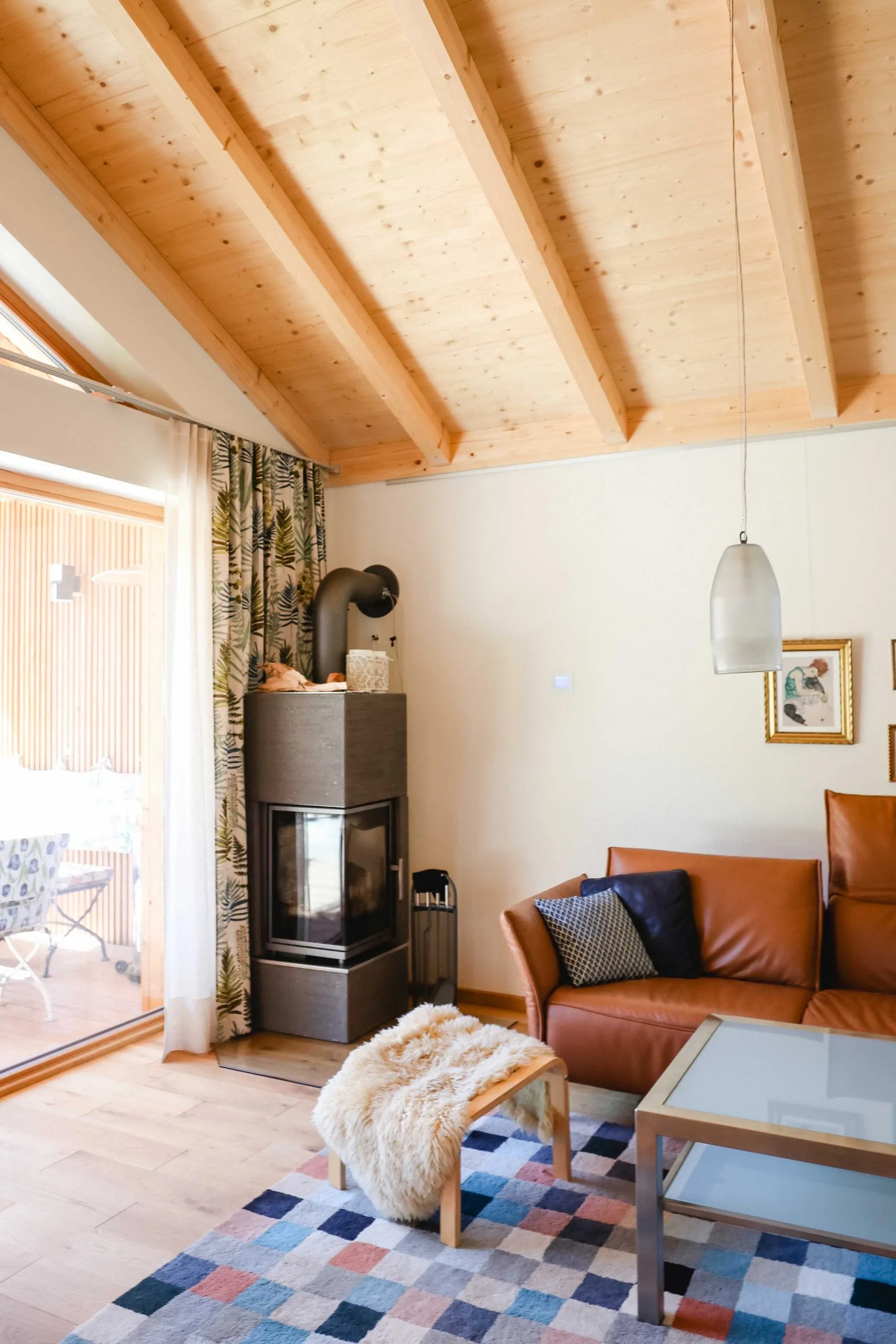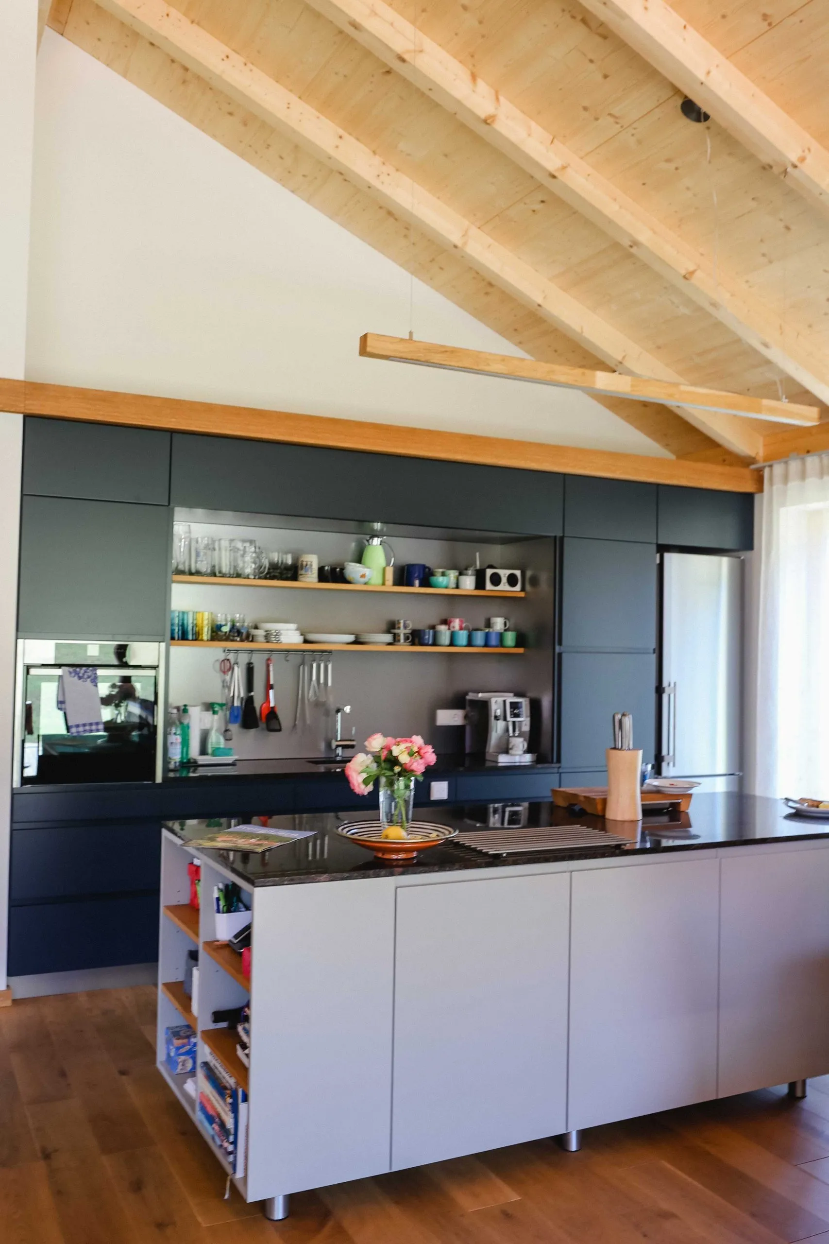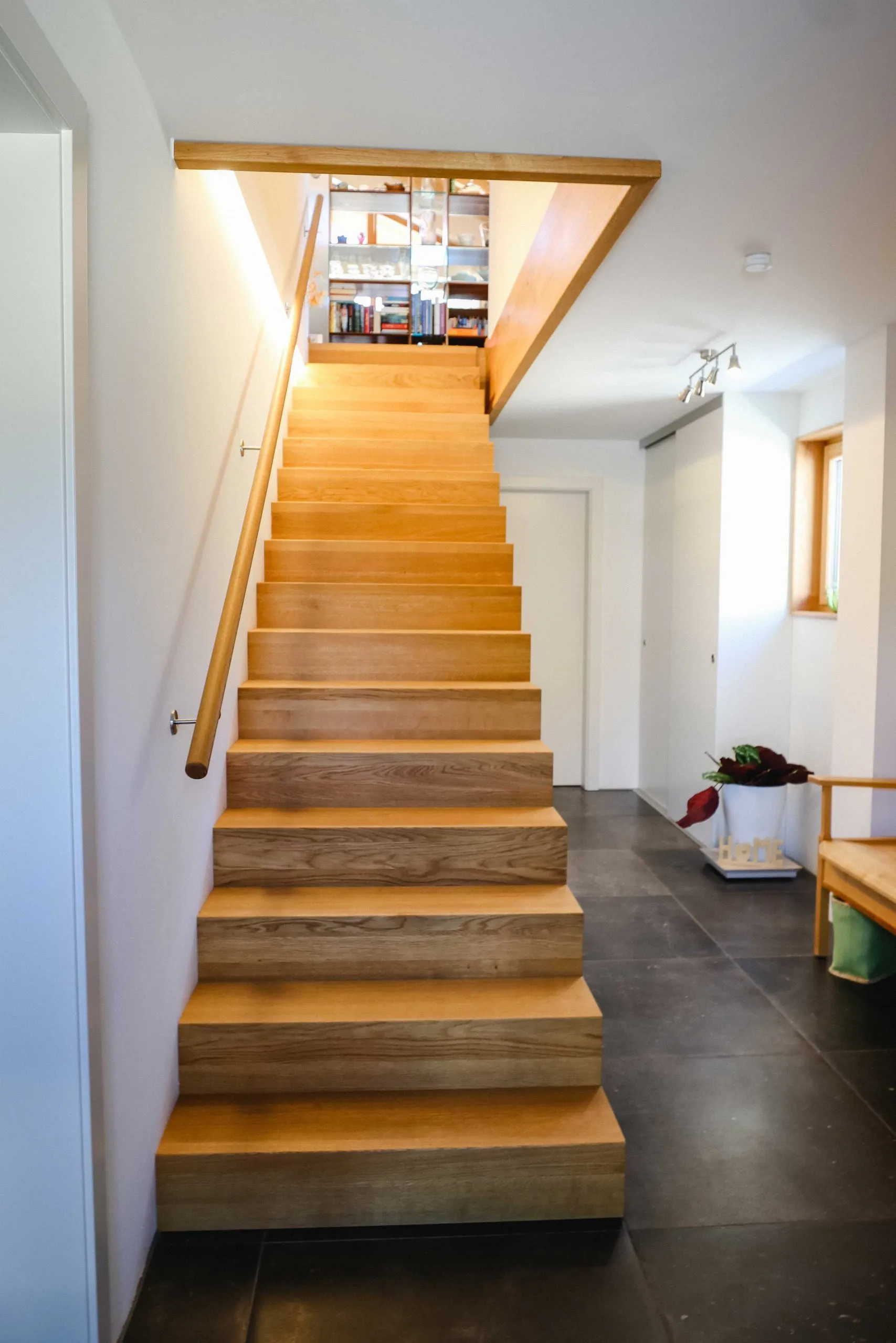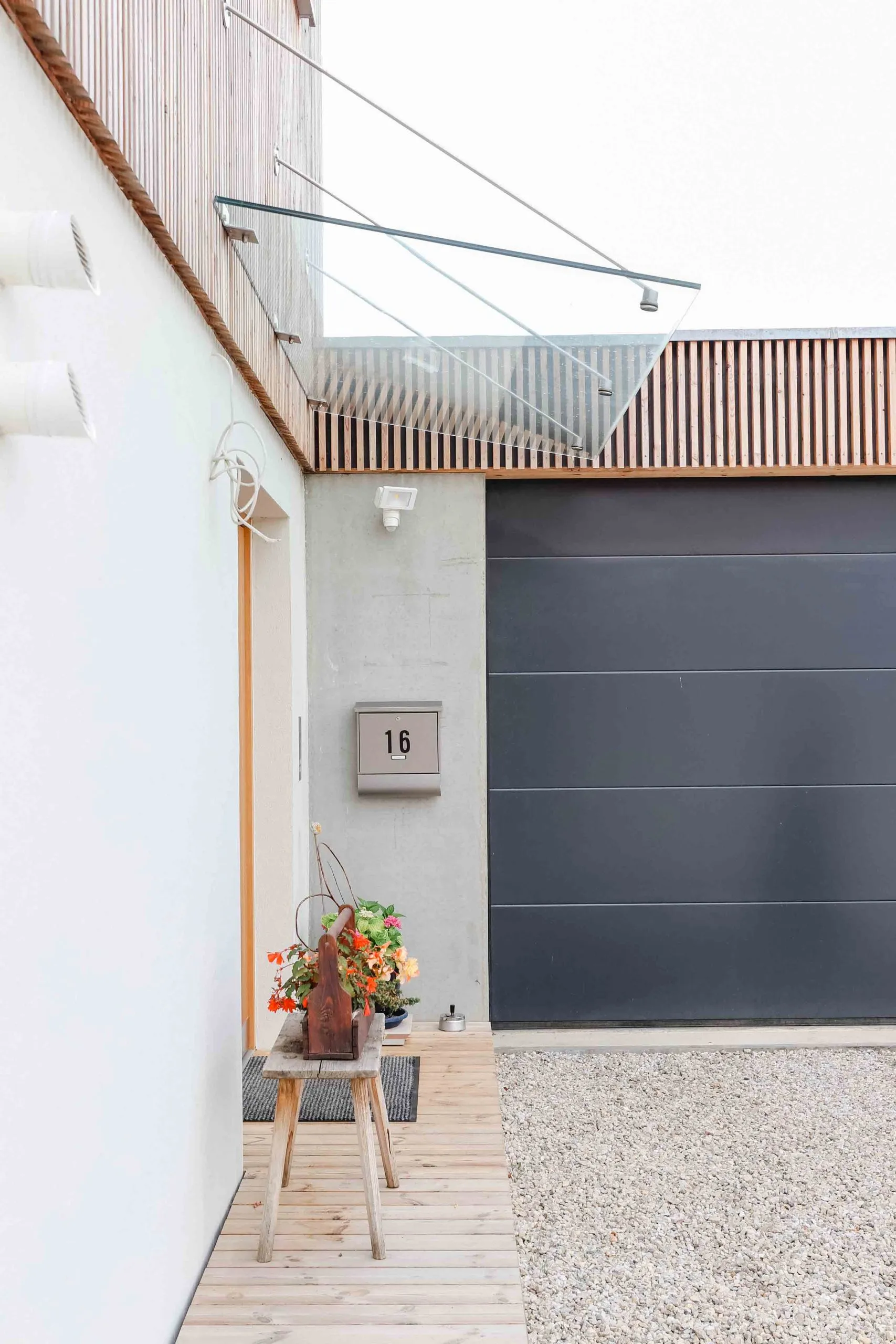 Terrasse durch großem Dachüberstand natürlich beschattet, Untergeschoss durch Hang als Einliegerwohnung genutzt, senkrechte Lärchenschalung unbehandelt