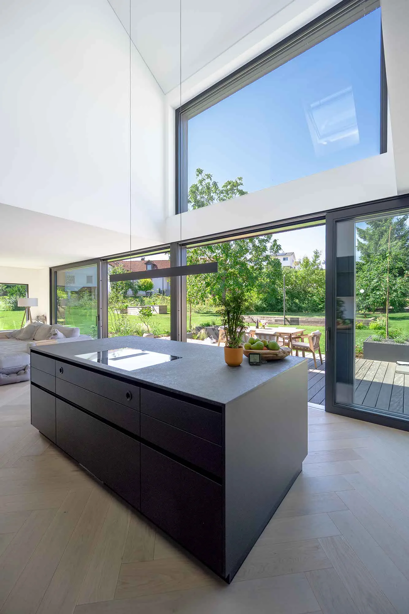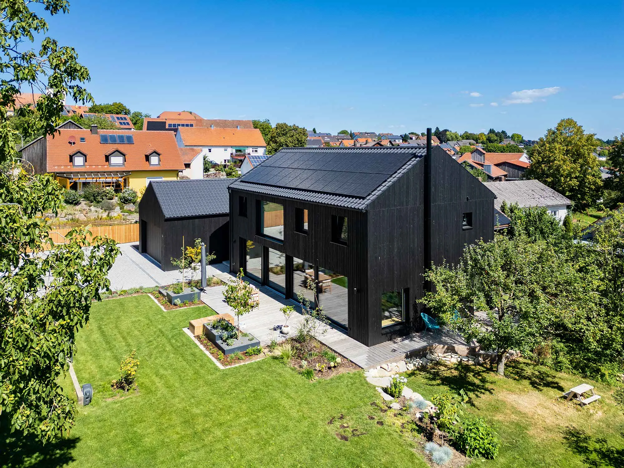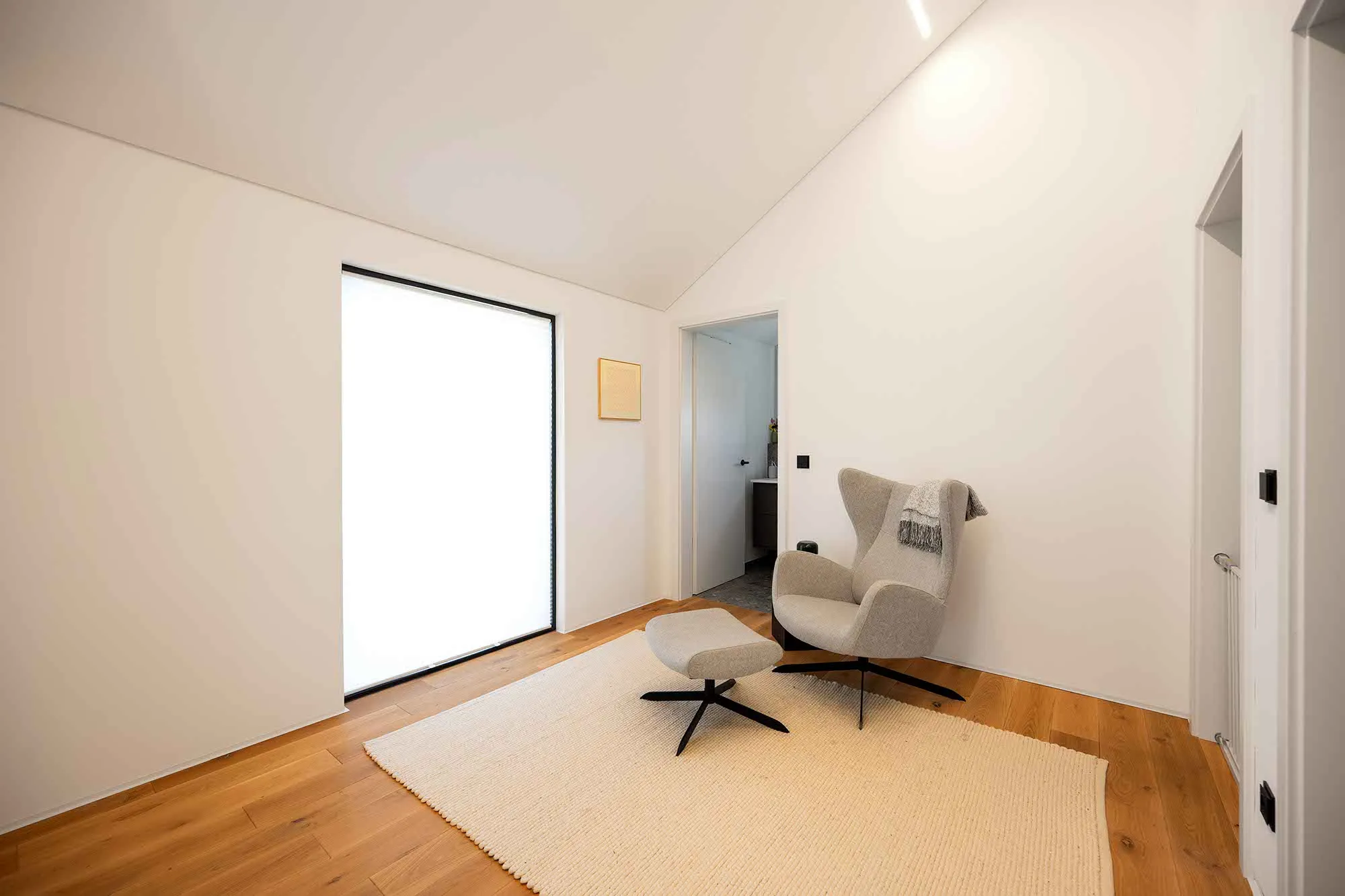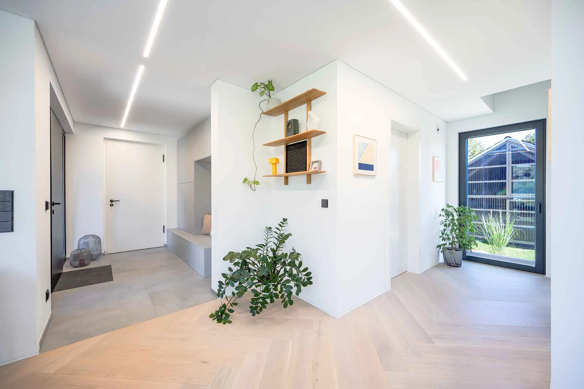 verkohlte Holzfassade, Fischgrät-Parkettboden im EG, große Fensterfront, Galerie mit Arbeitsplatz im Flur OG