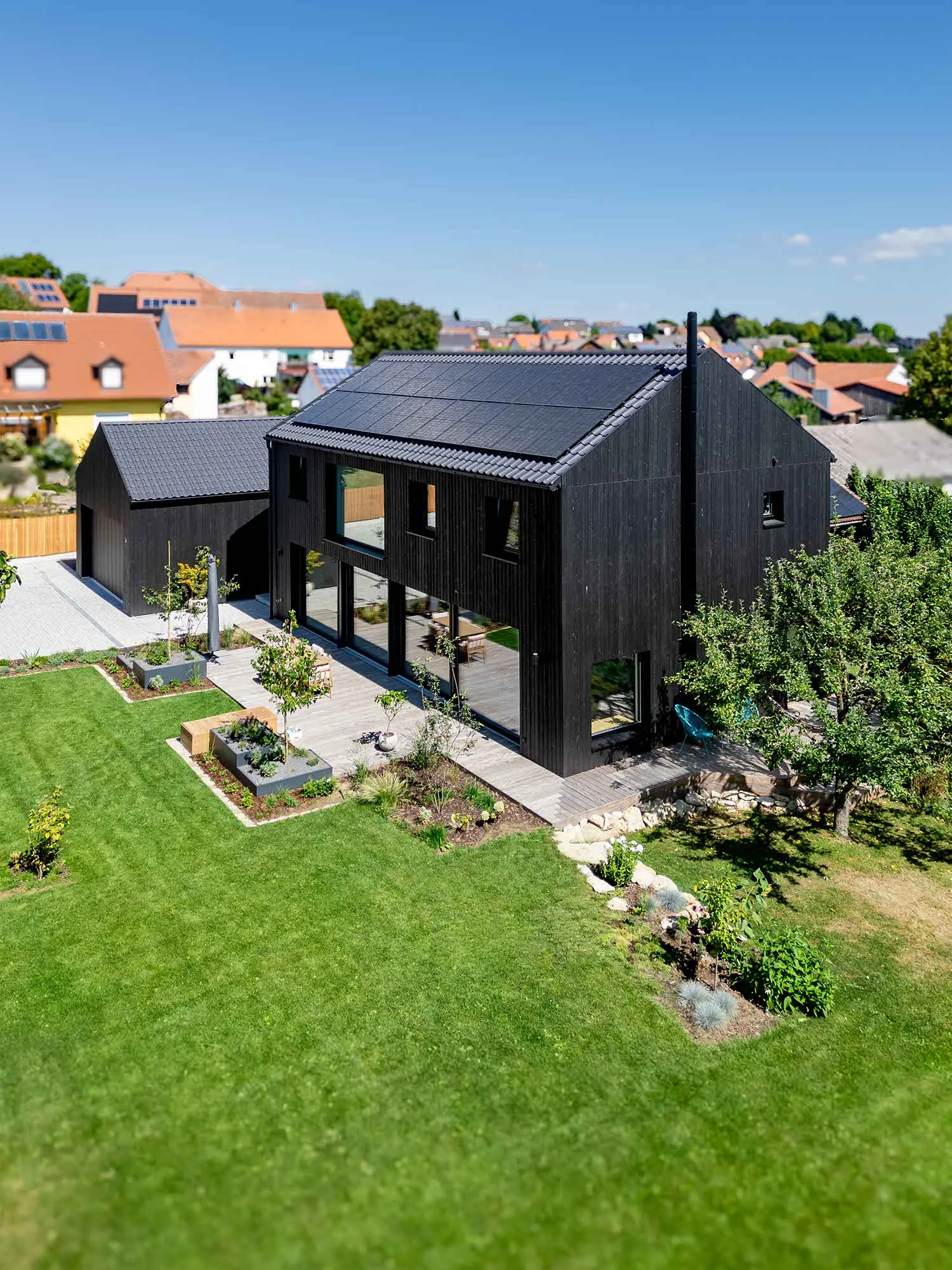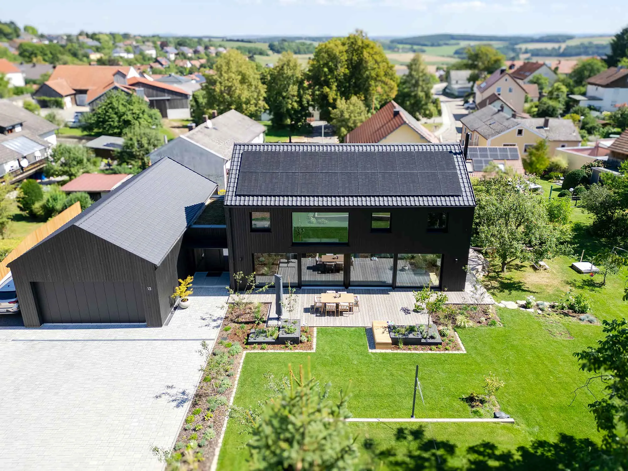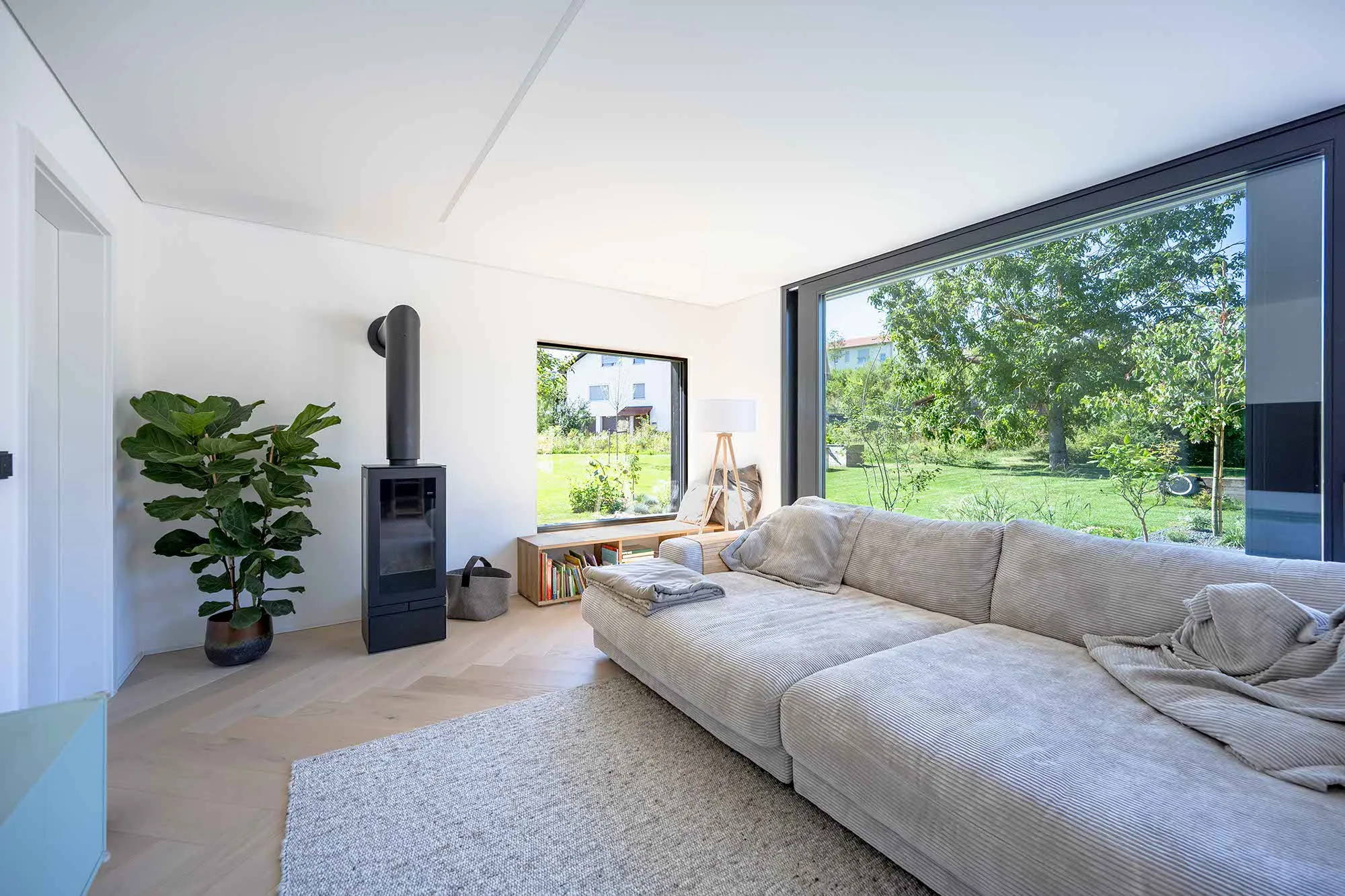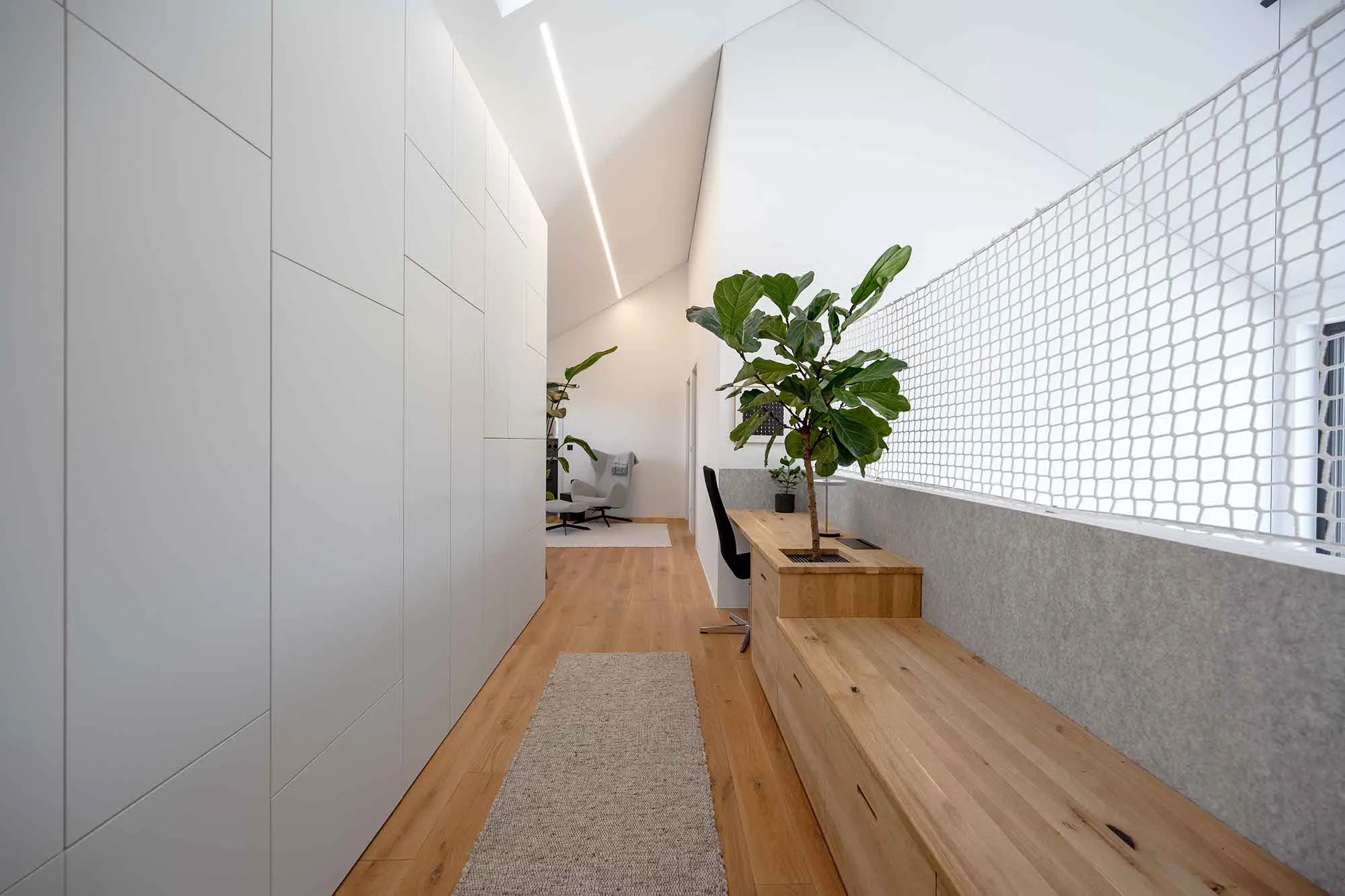 verkohlte Holzfassade, Fischgrät-Parkettboden im EG, große Fensterfront, Galerie mit Arbeitsplatz im Flur OG