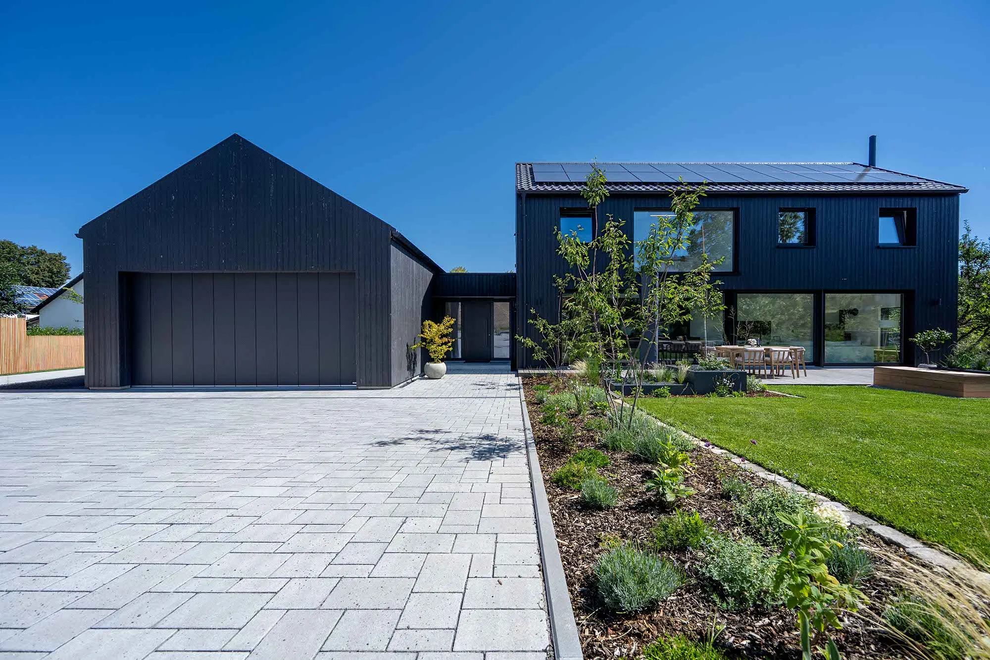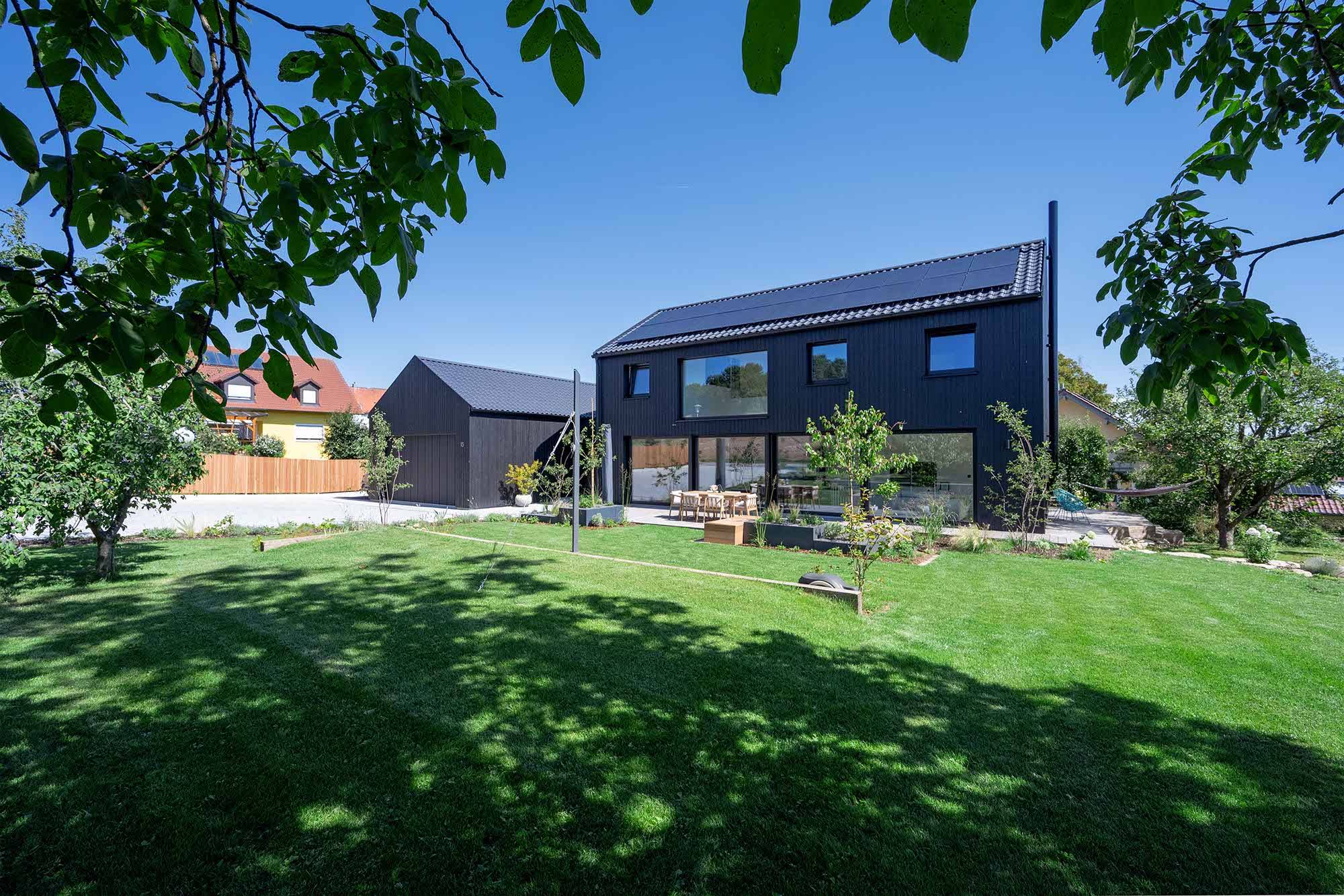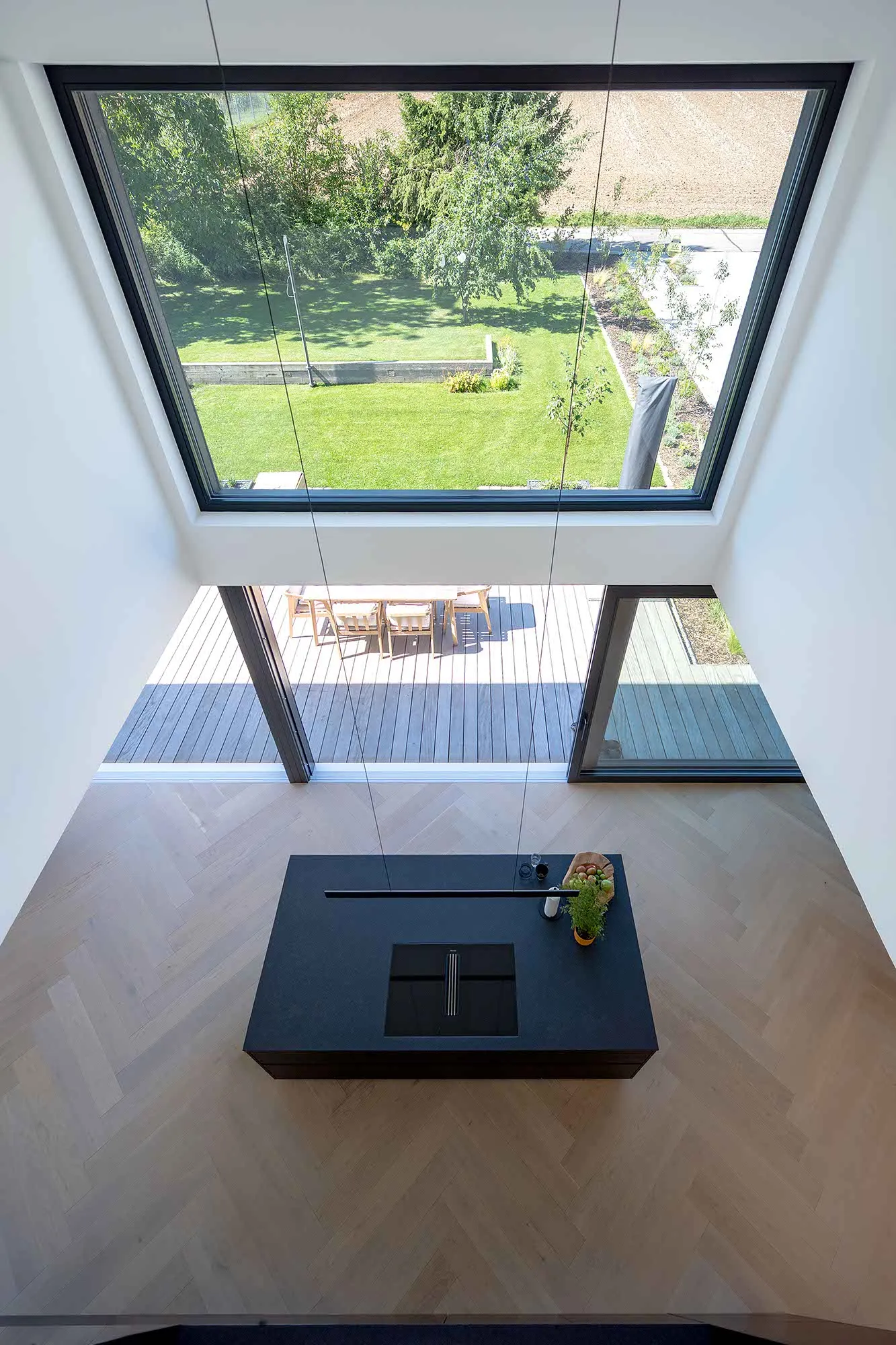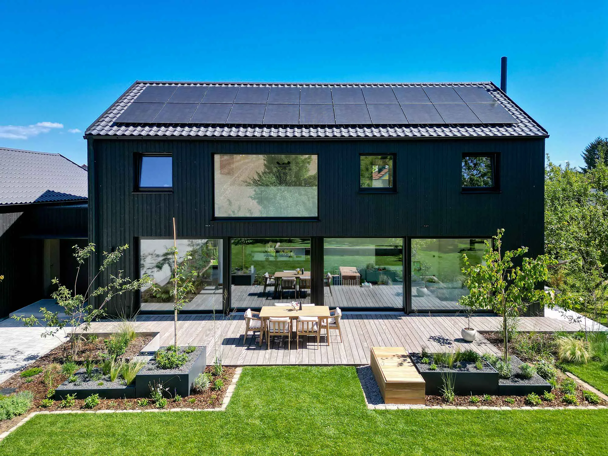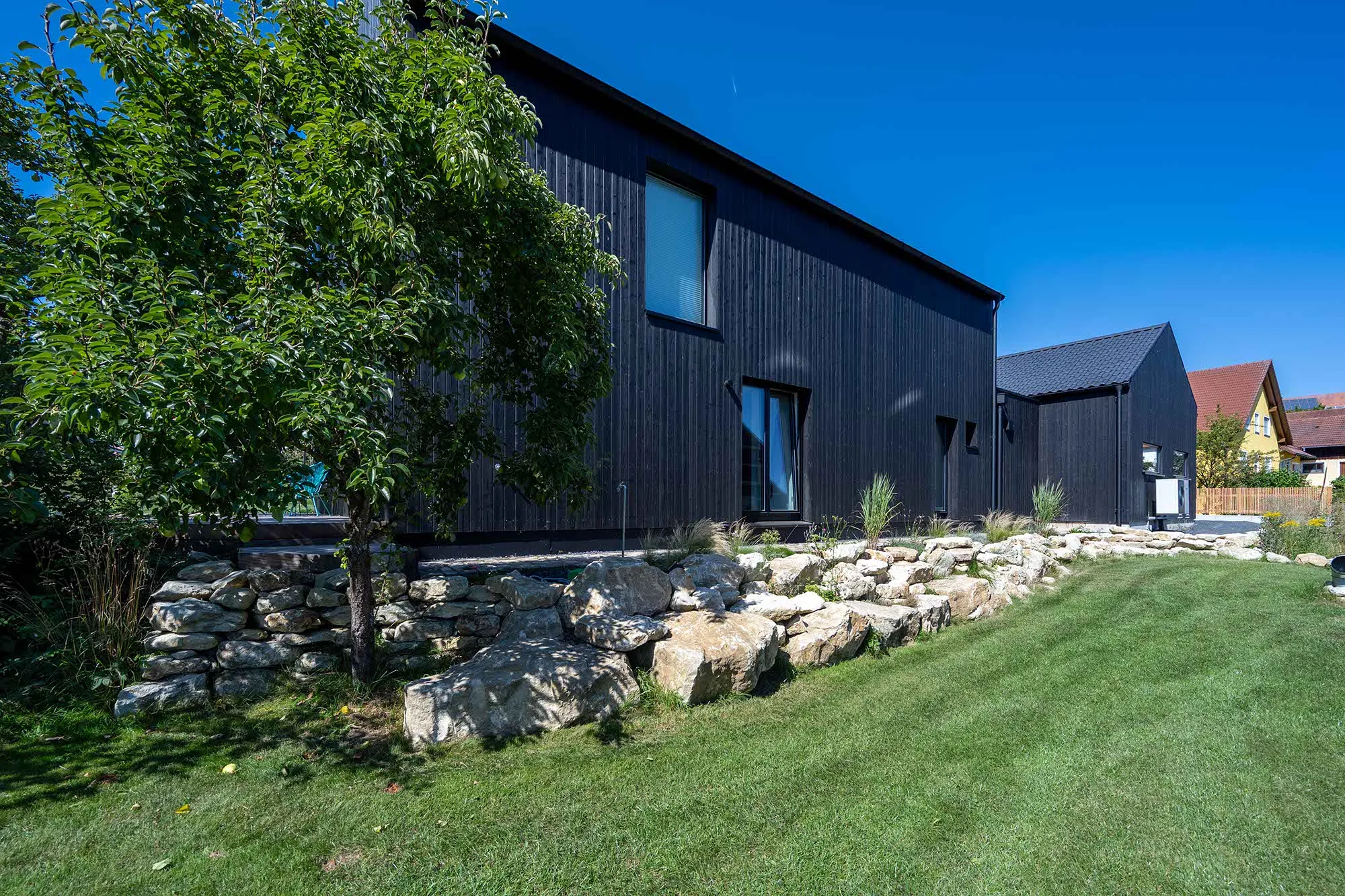 verkohlte Holzfassade, Fischgrät-Parkettboden im EG, große Fensterfront, Galerie mit Arbeitsplatz im Flur OG