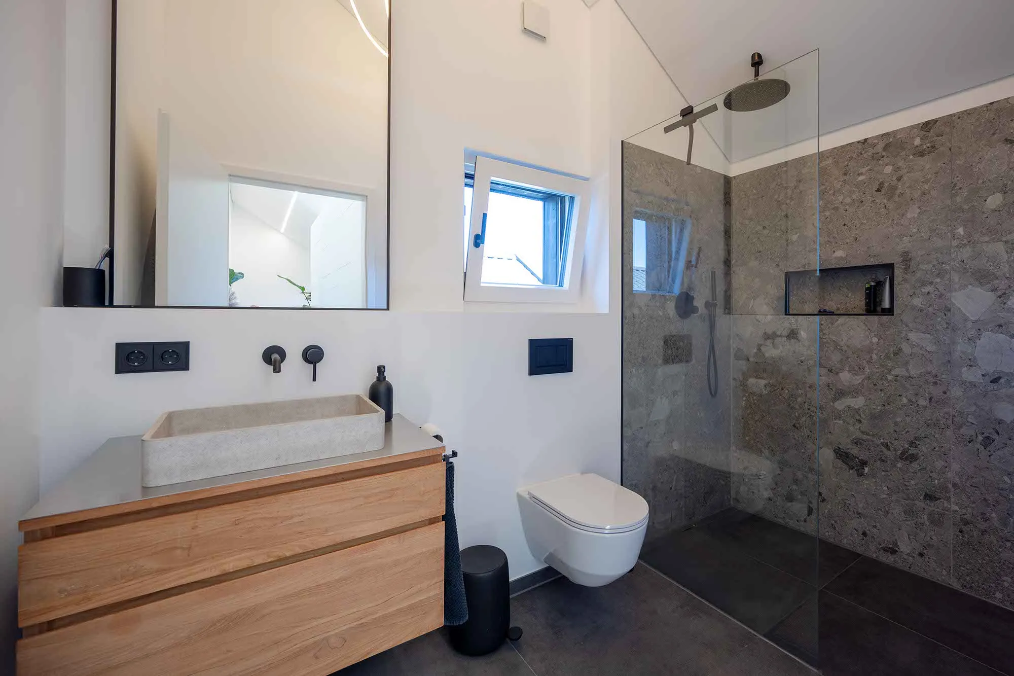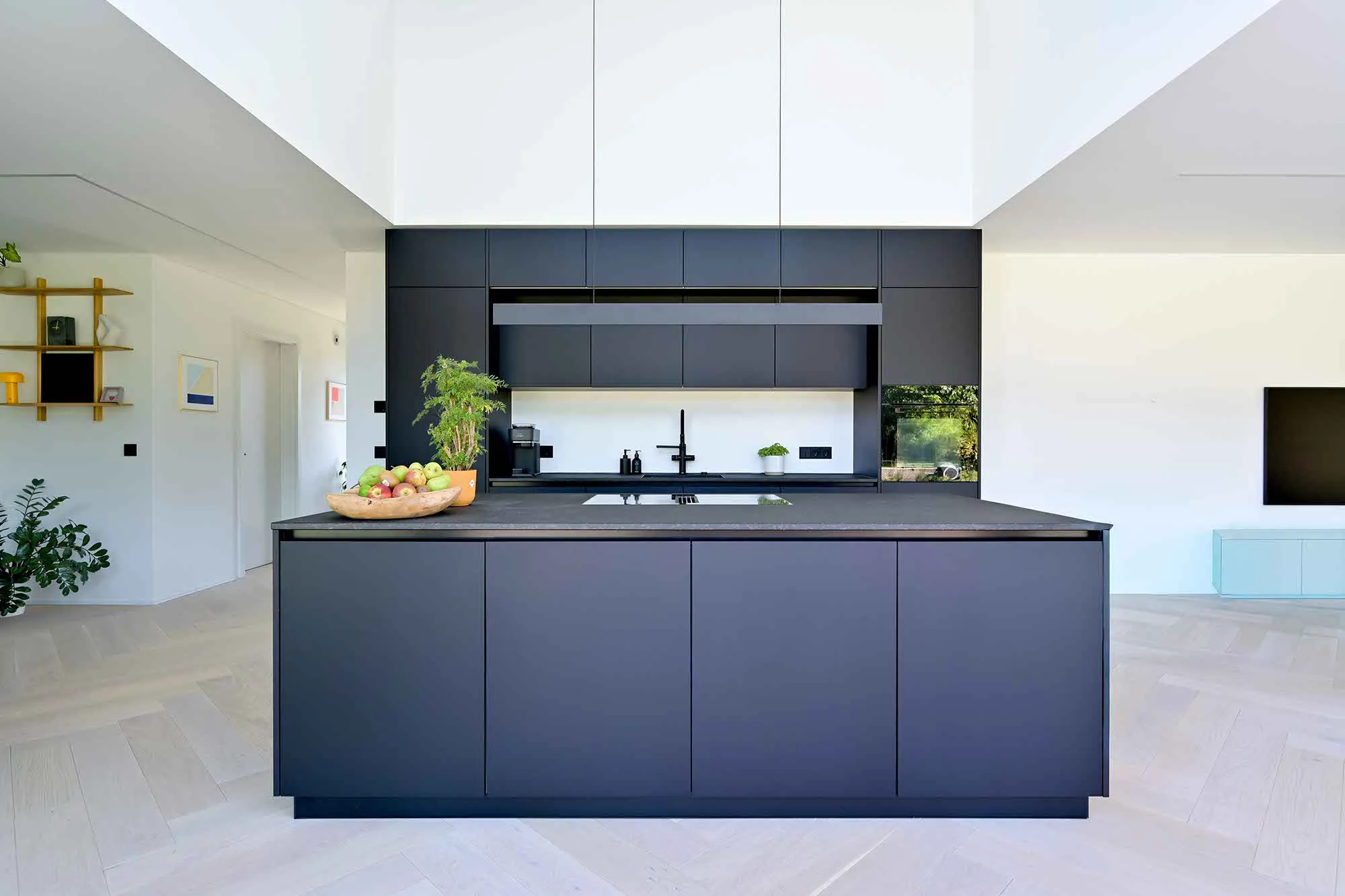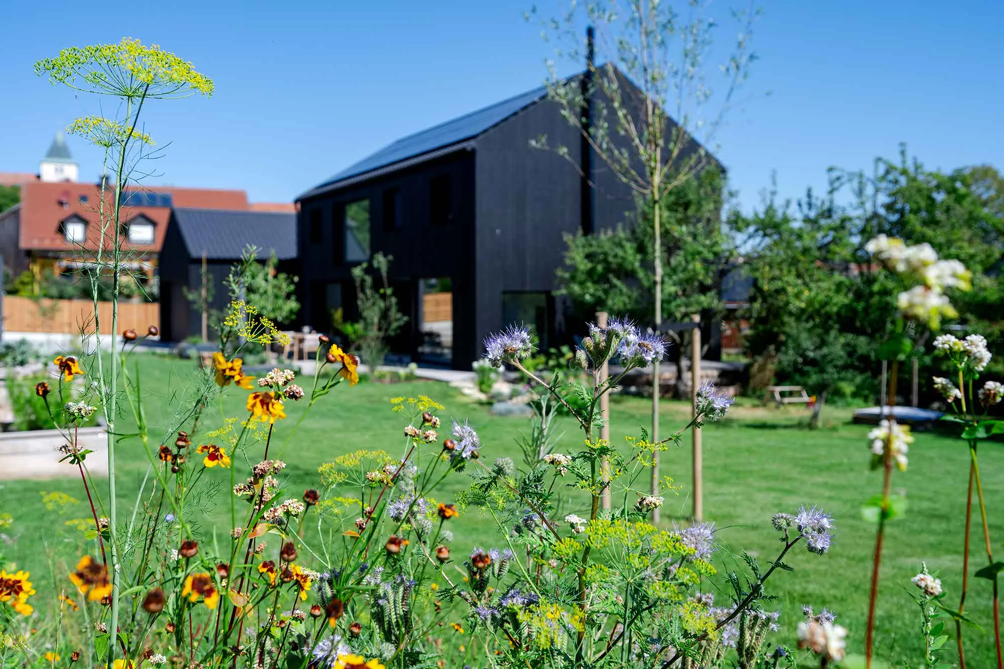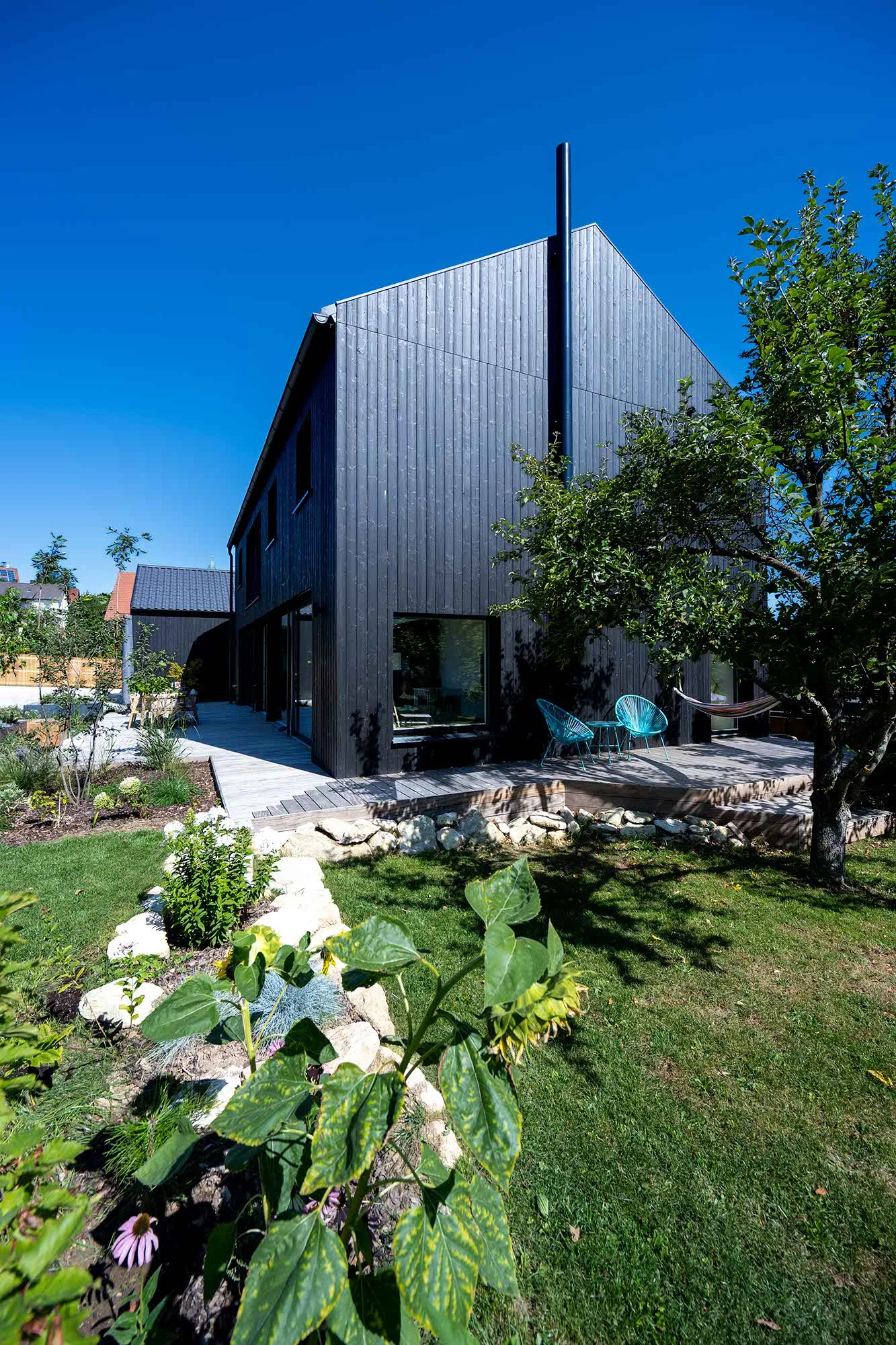 verkohlte Holzfassade, Fischgrät-Parkettboden im EG, große Fensterfront, Galerie mit Arbeitsplatz im Flur OG