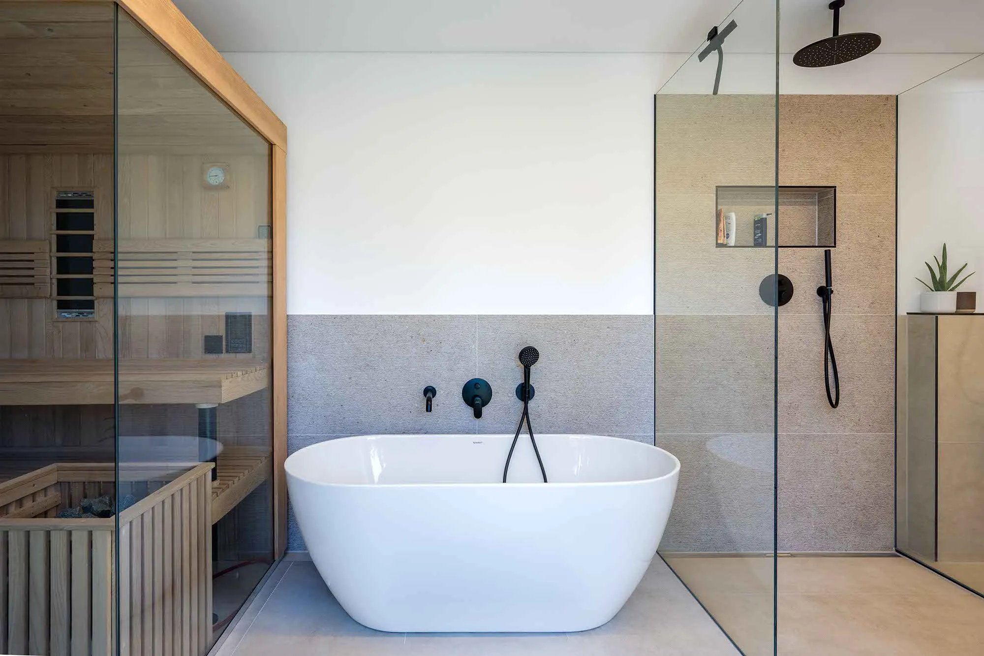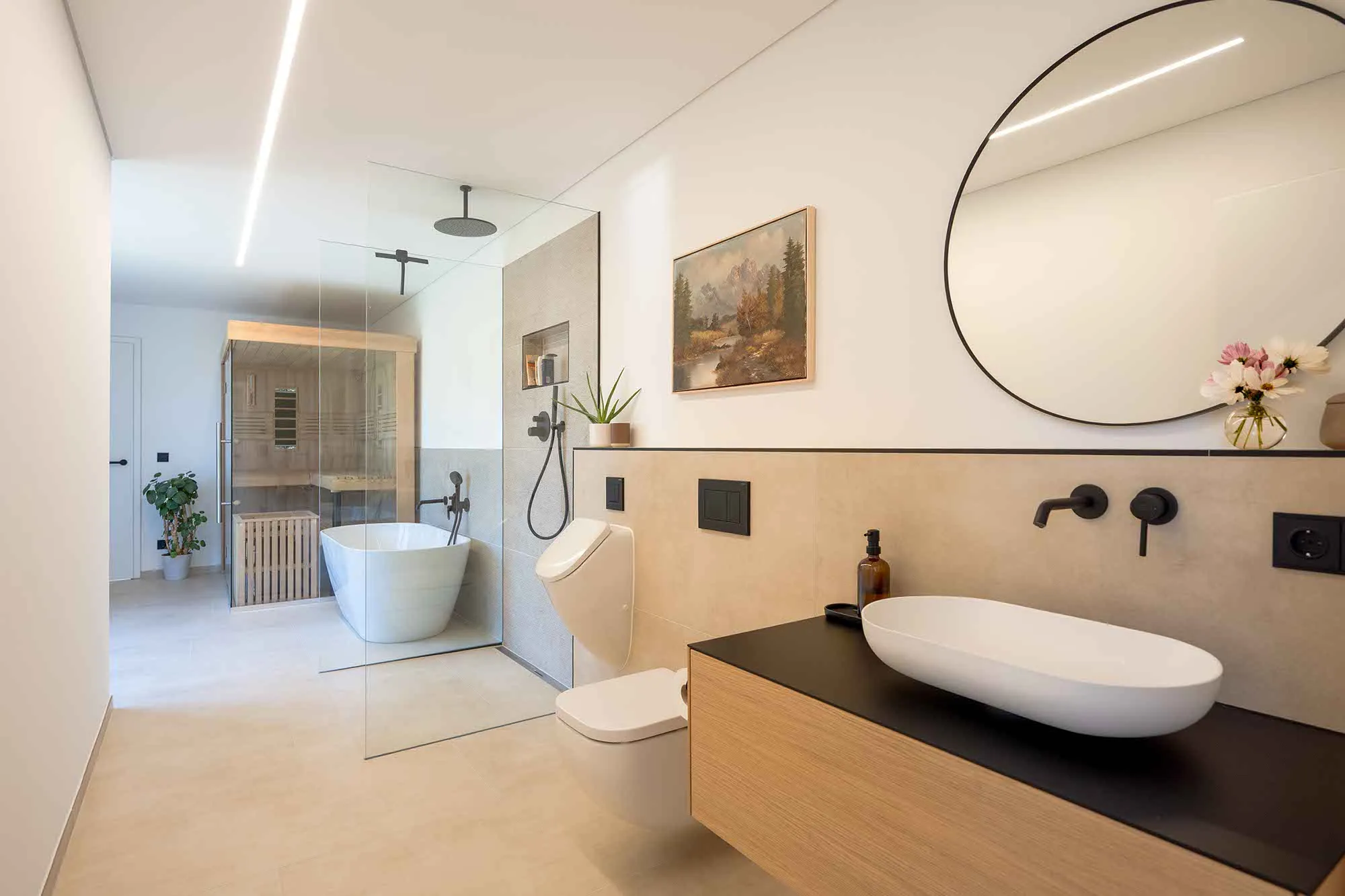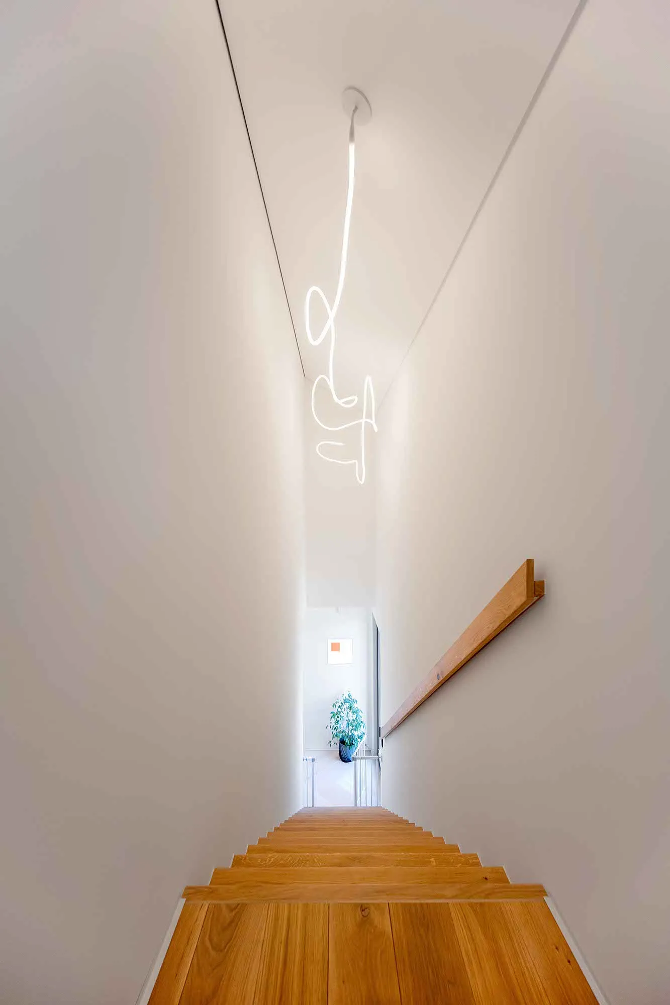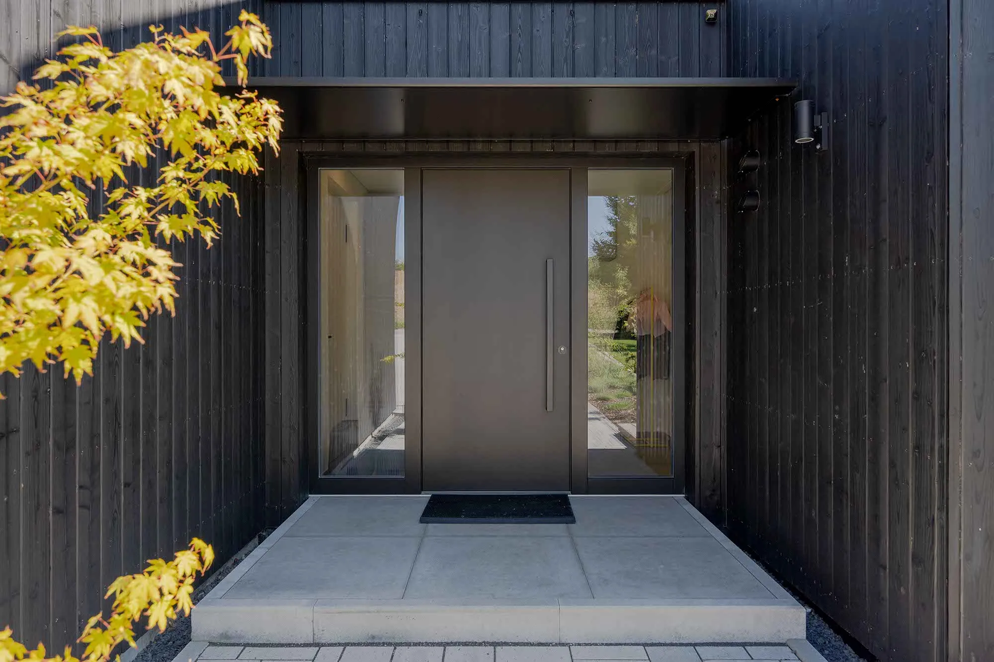 verkohlte Holzfassade, Fischgrät-Parkettboden im EG, große Fensterfront, Galerie mit Arbeitsplatz im Flur OG