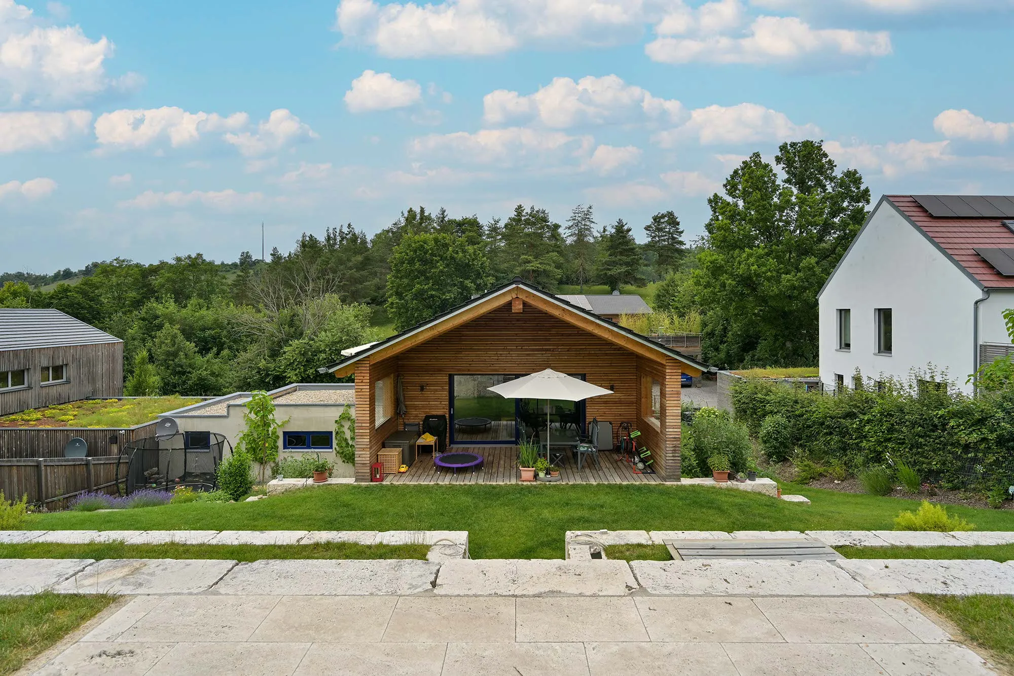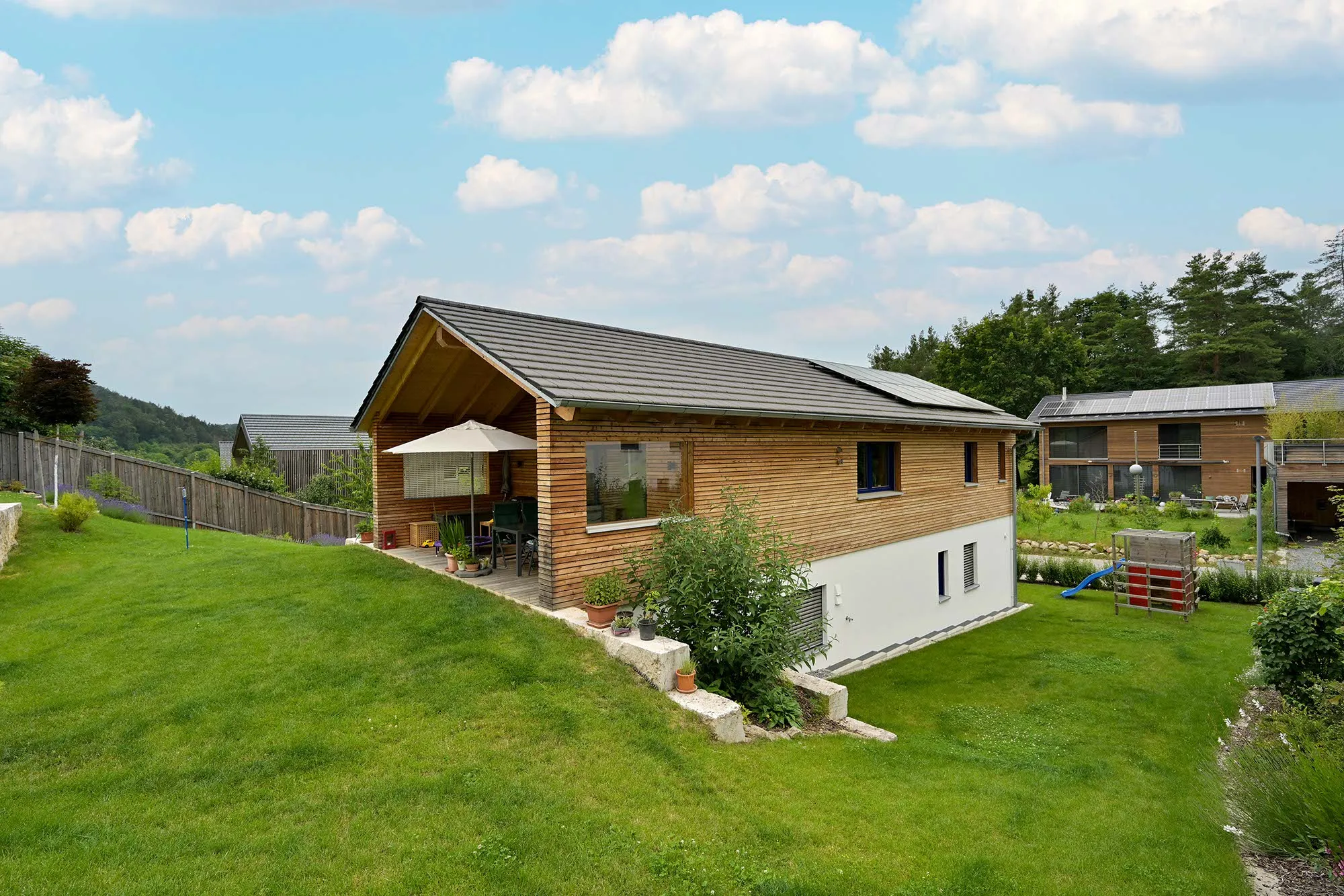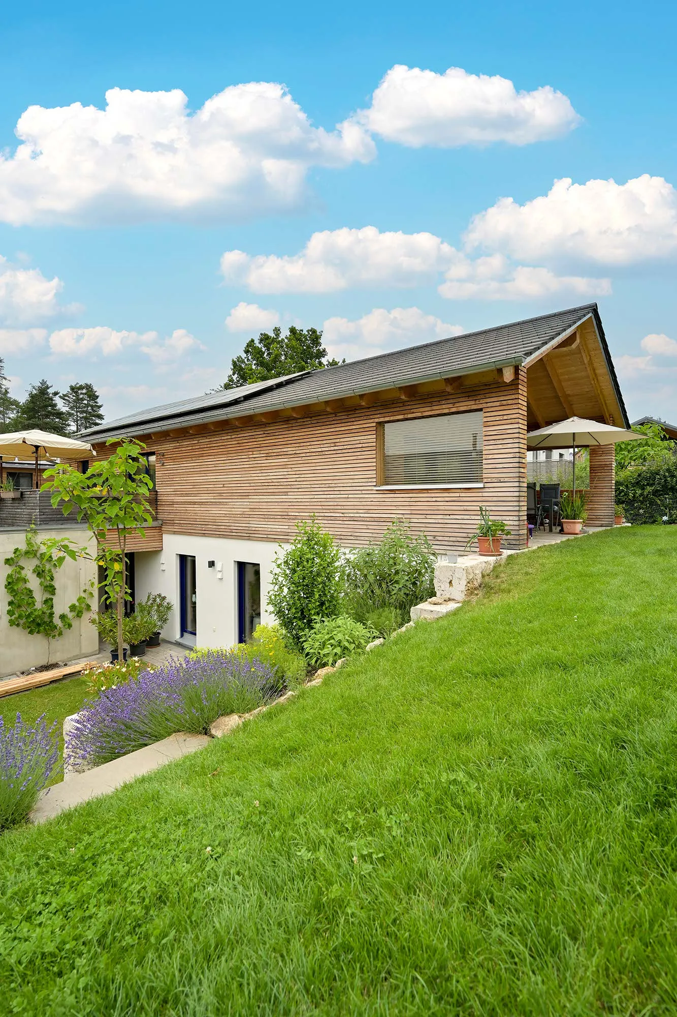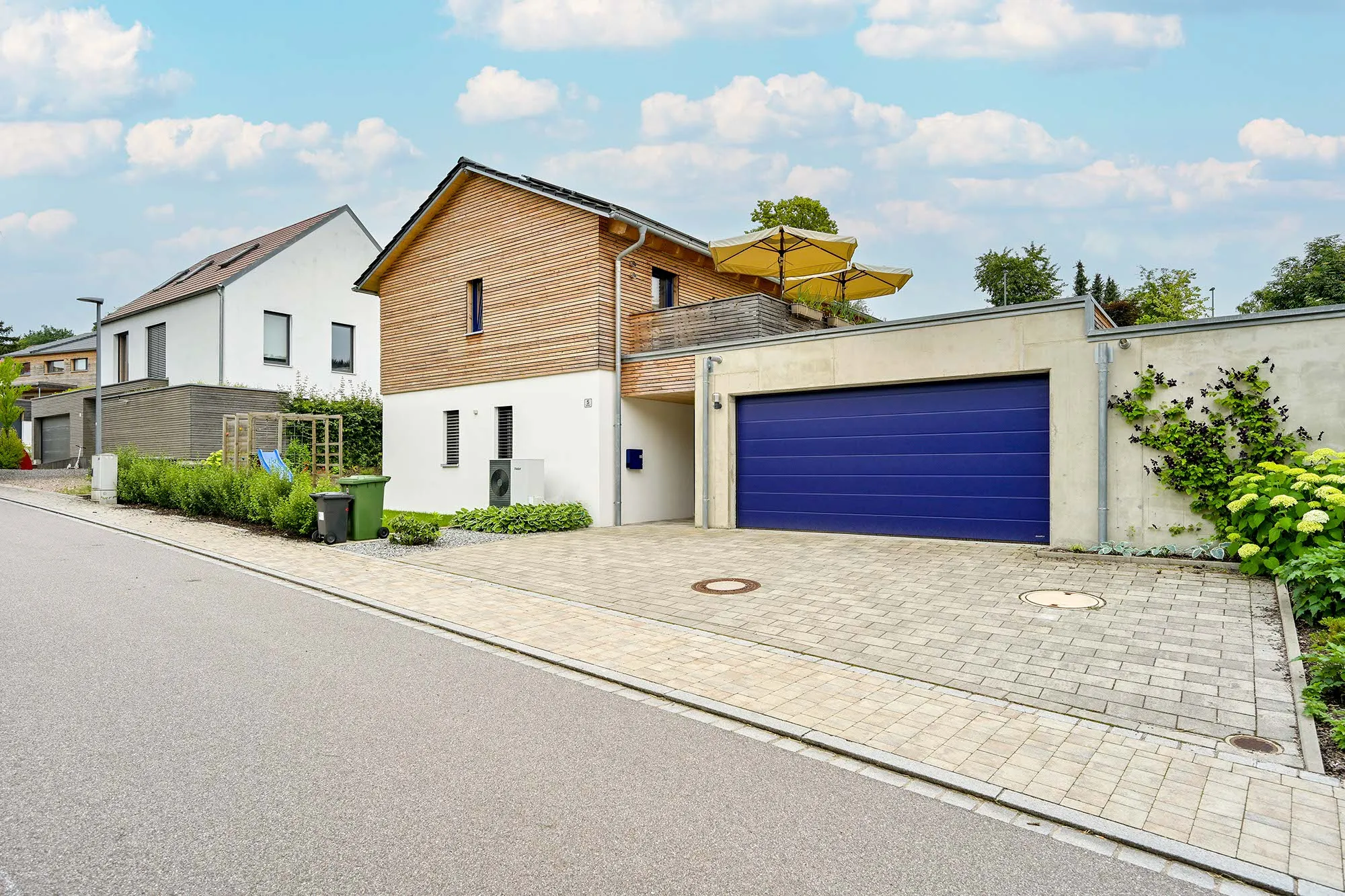 Wohn- und Essbereich durch Hanglage im Obergeschoss mit Sichtdachstuhl, Garage in Sichtbetonbauweise, überdachter Eingangsbereich durch Flachdachverlängerung der Garage, Dach- und Wandverlängerung als Freisitz