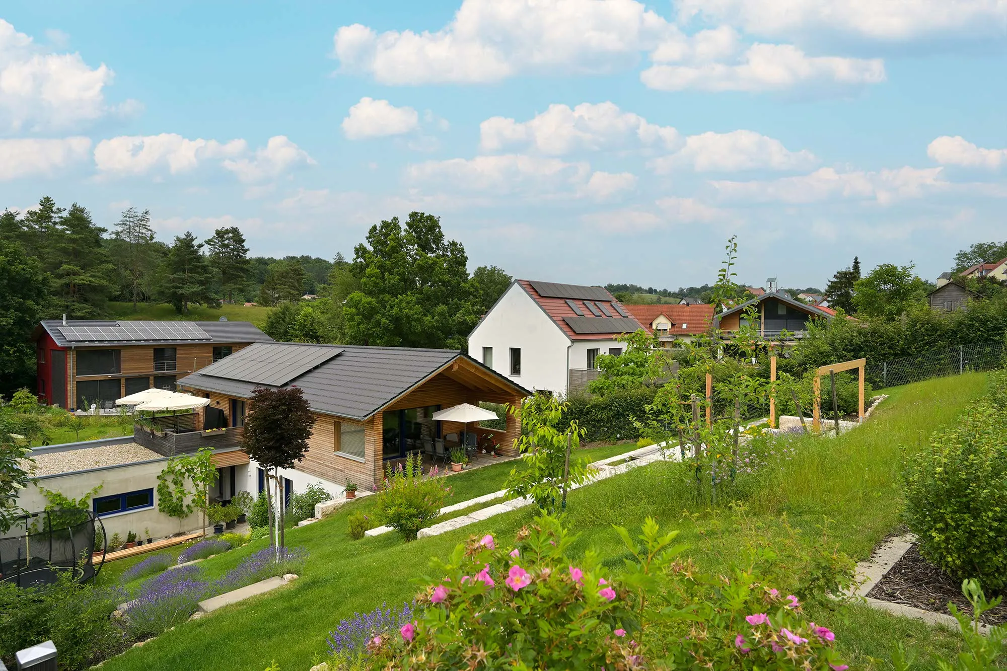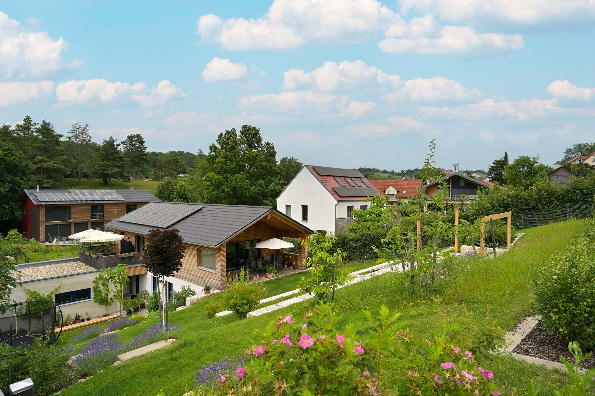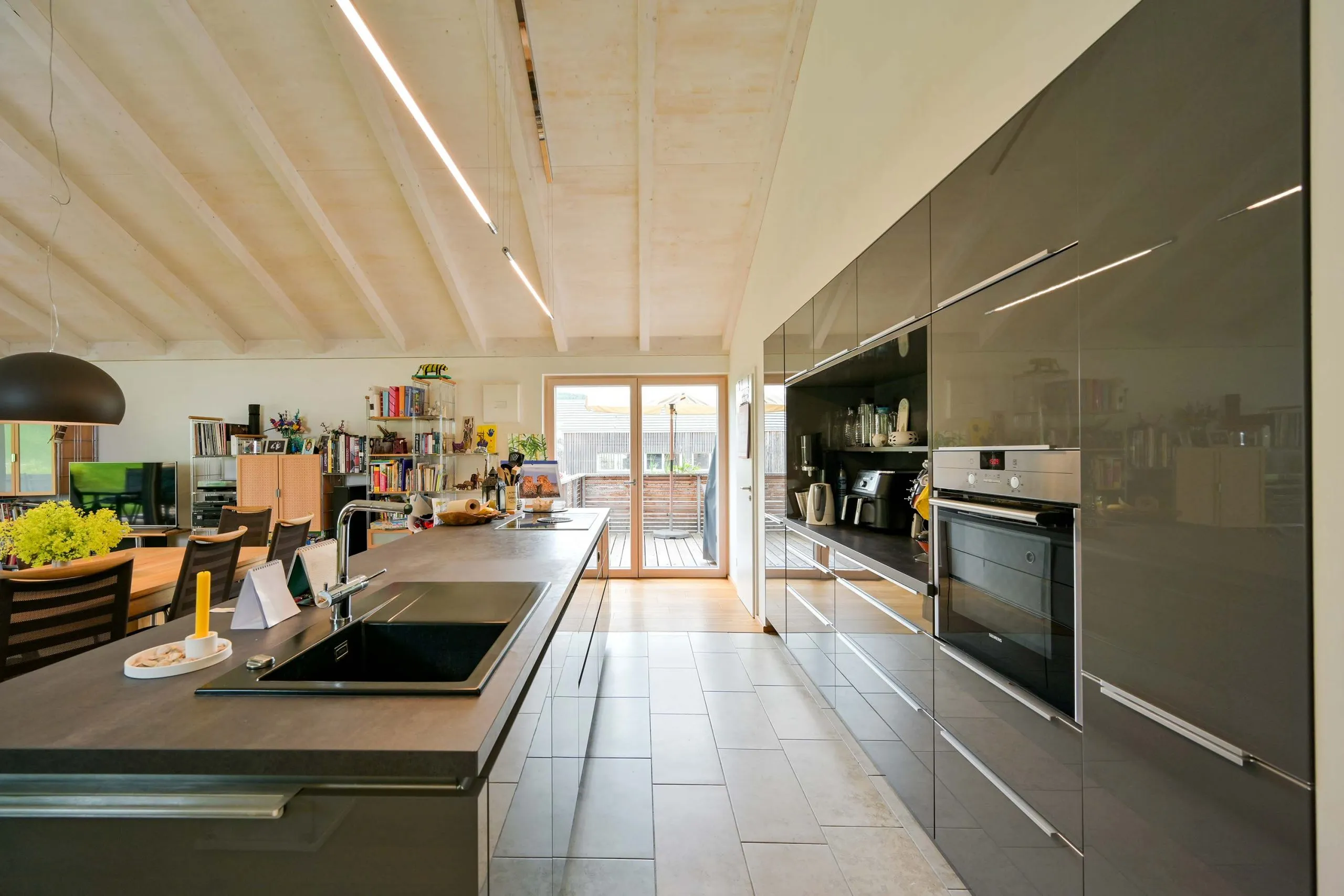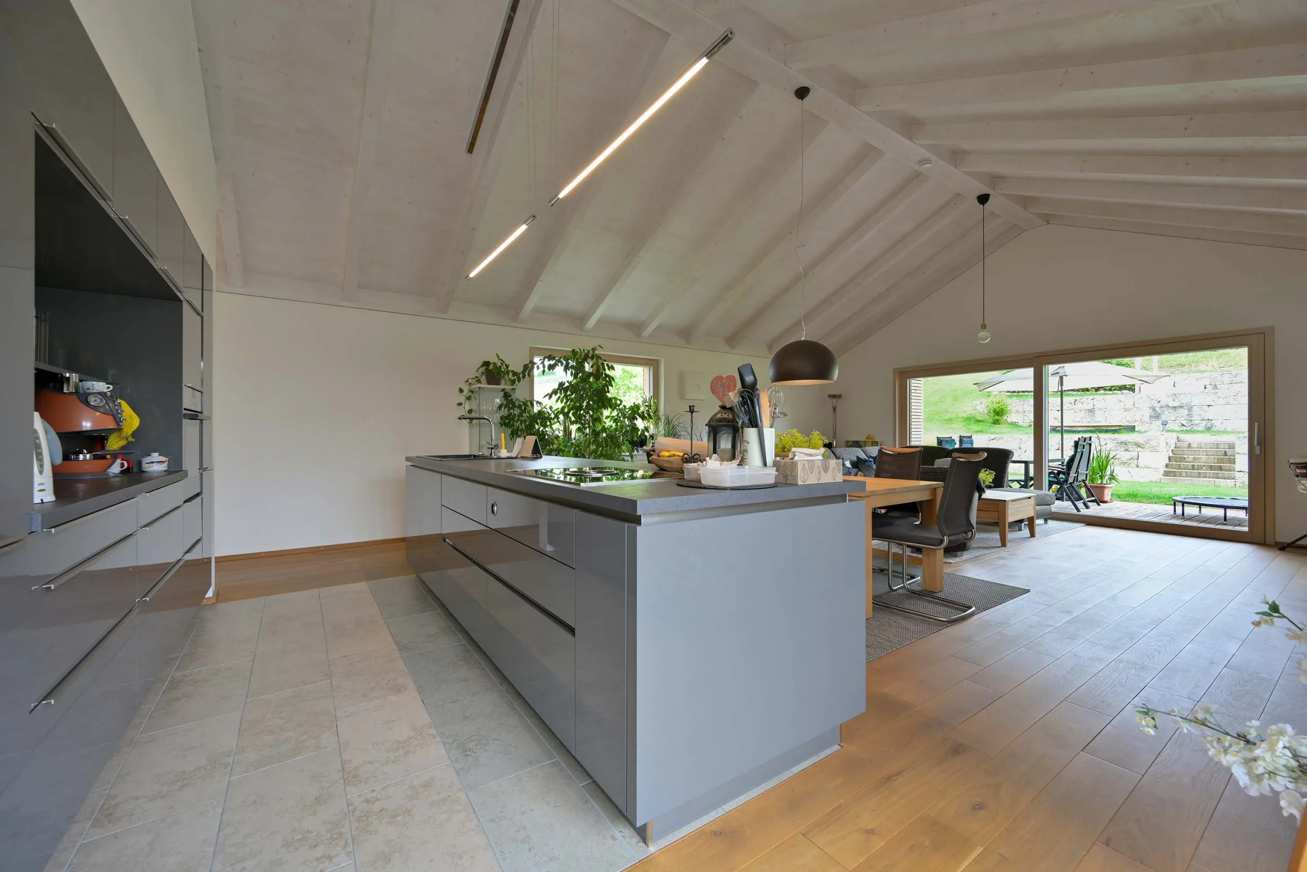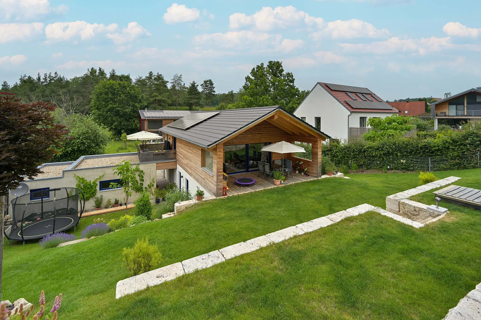 Wohn- und Essbereich durch Hanglage im Obergeschoss mit Sichtdachstuhl, Garage in Sichtbetonbauweise, überdachter Eingangsbereich durch Flachdachverlängerung der Garage, Dach- und Wandverlängerung als Freisitz