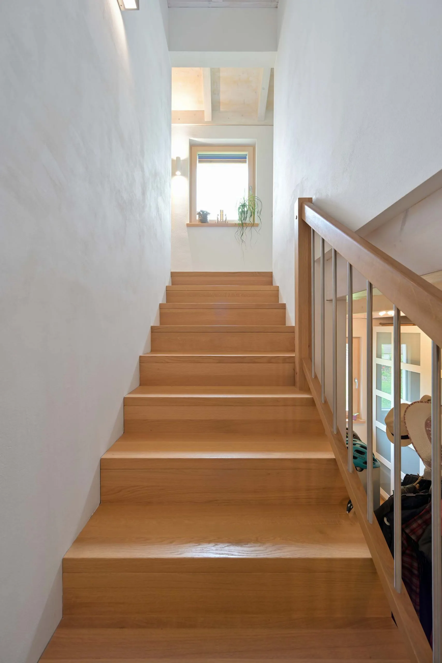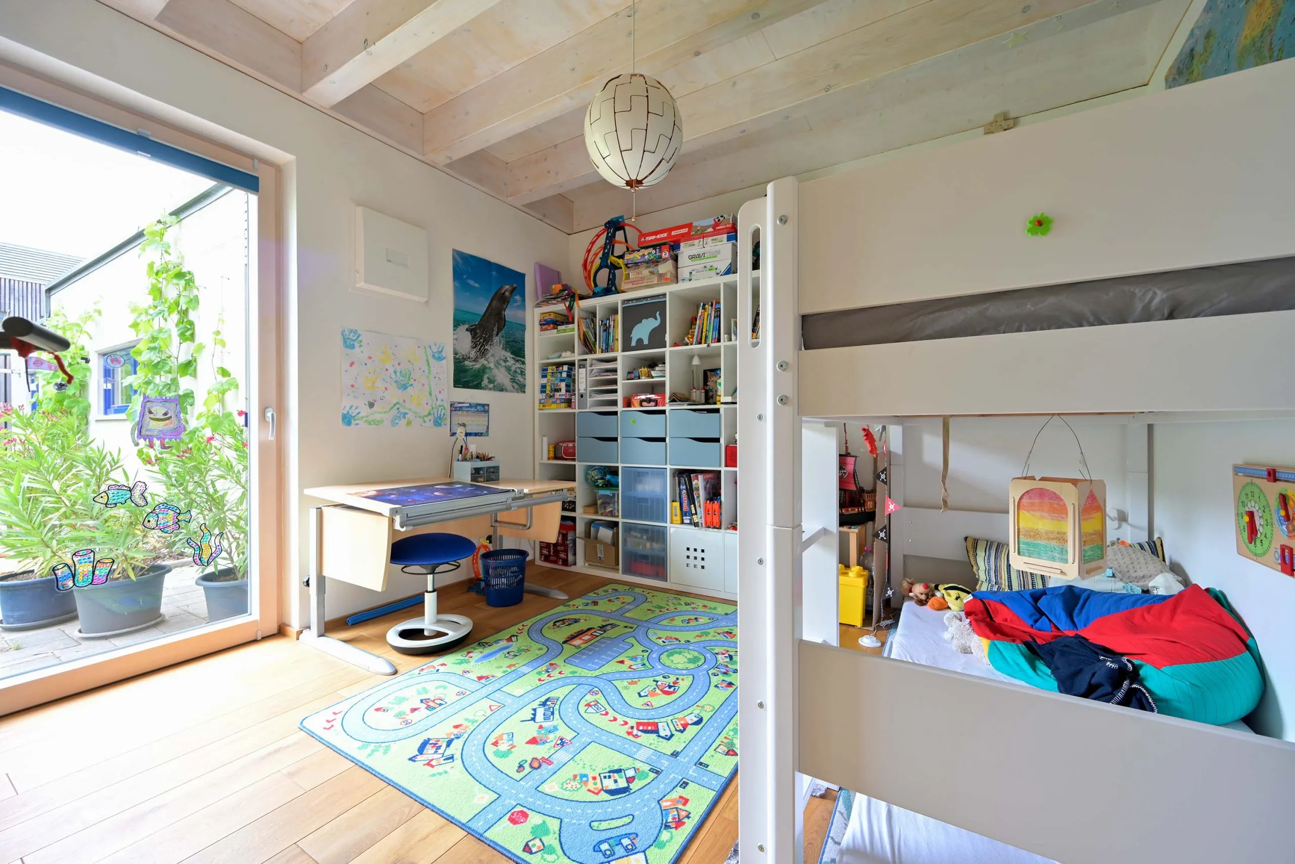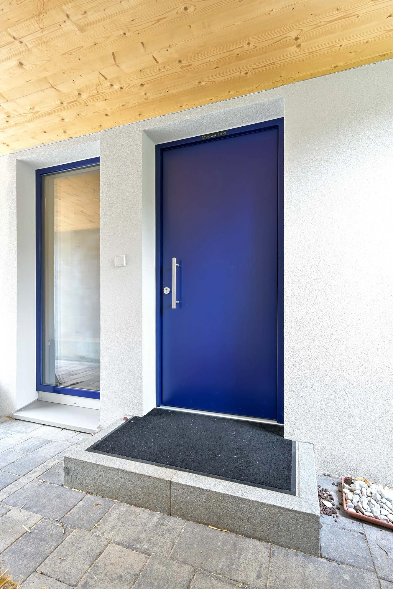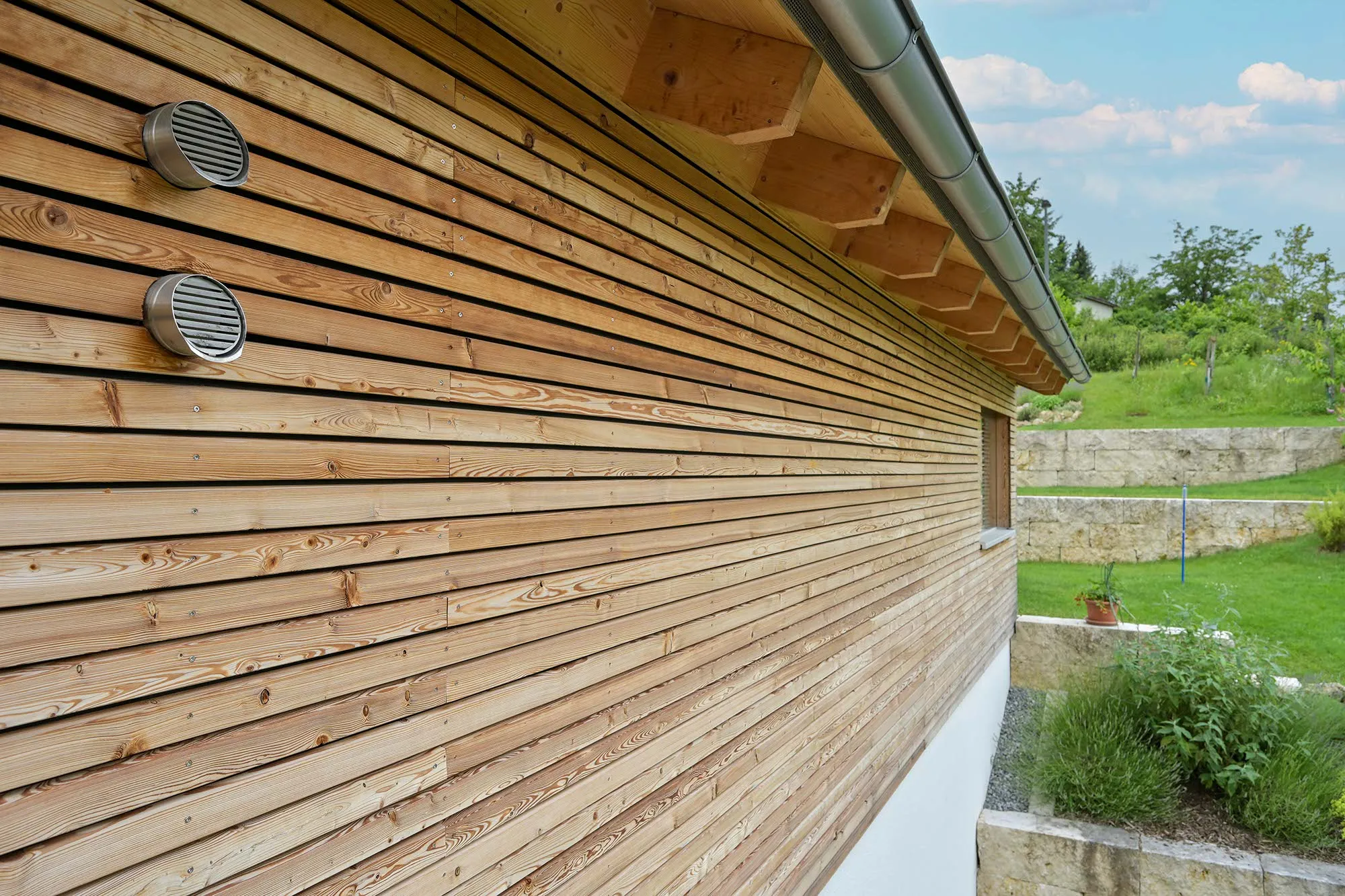 Wohn- und Essbereich durch Hanglage im Obergeschoss mit Sichtdachstuhl, Garage in Sichtbetonbauweise, überdachter Eingangsbereich durch Flachdachverlängerung der Garage, Dach- und Wandverlängerung als Freisitz