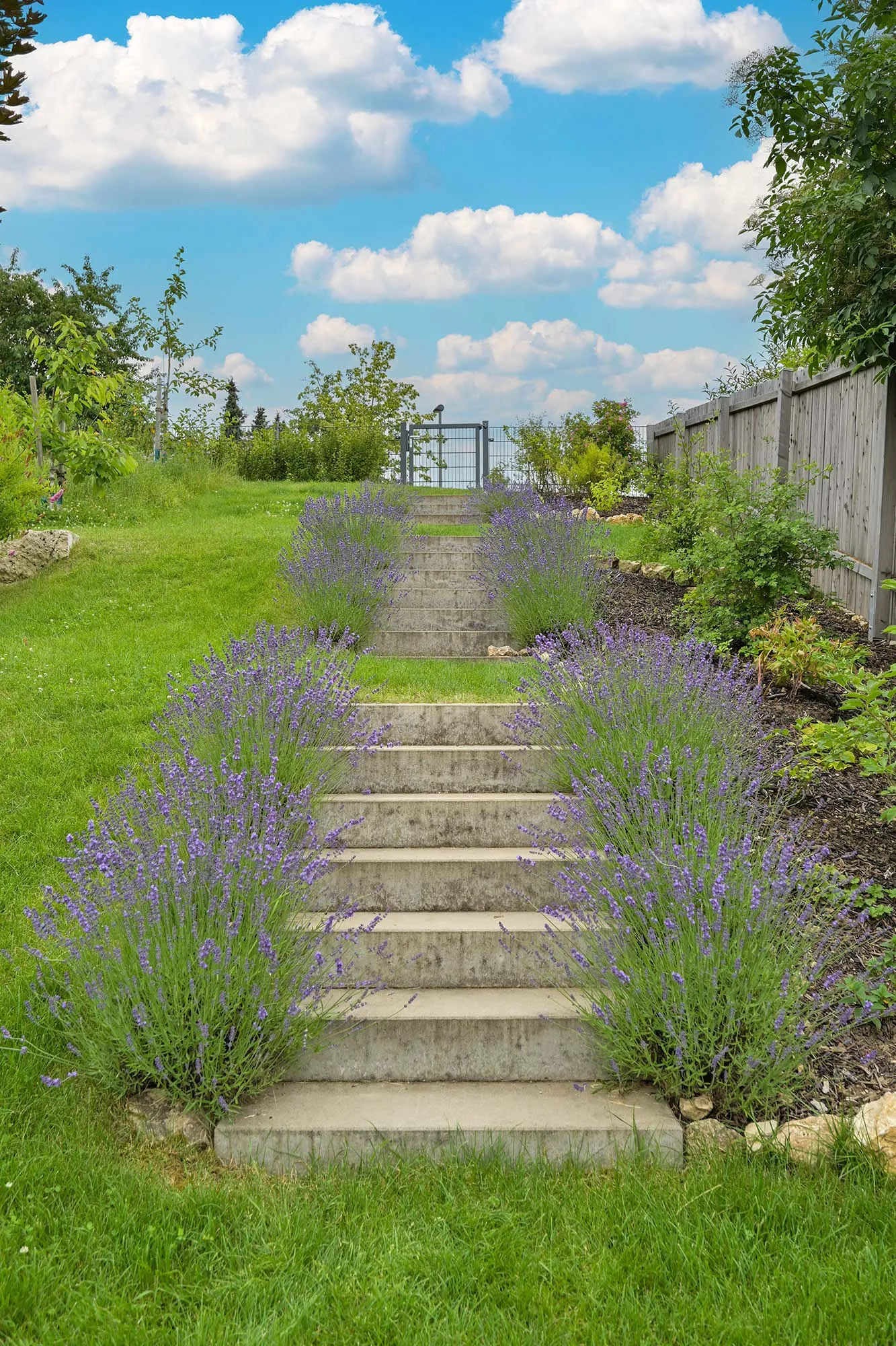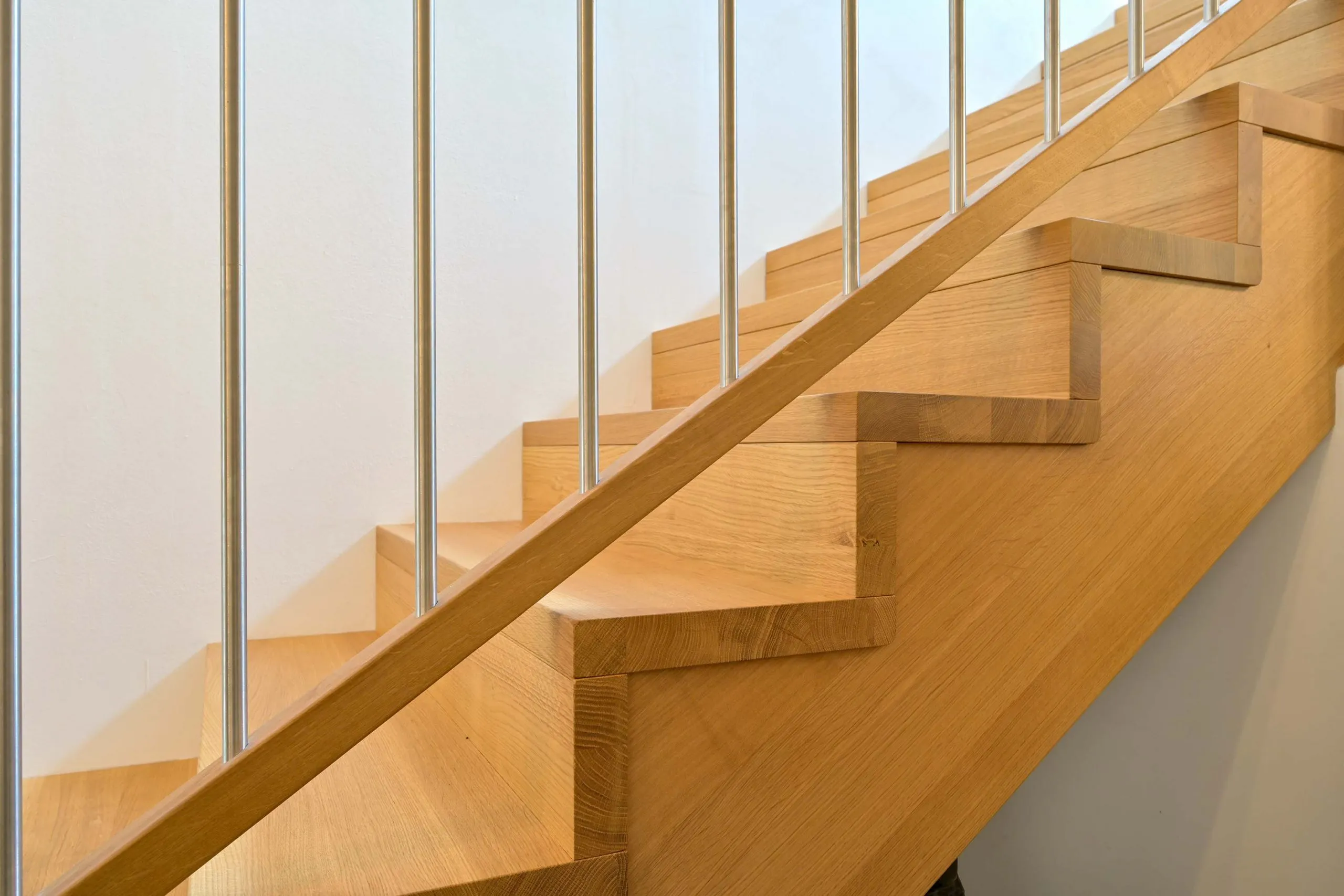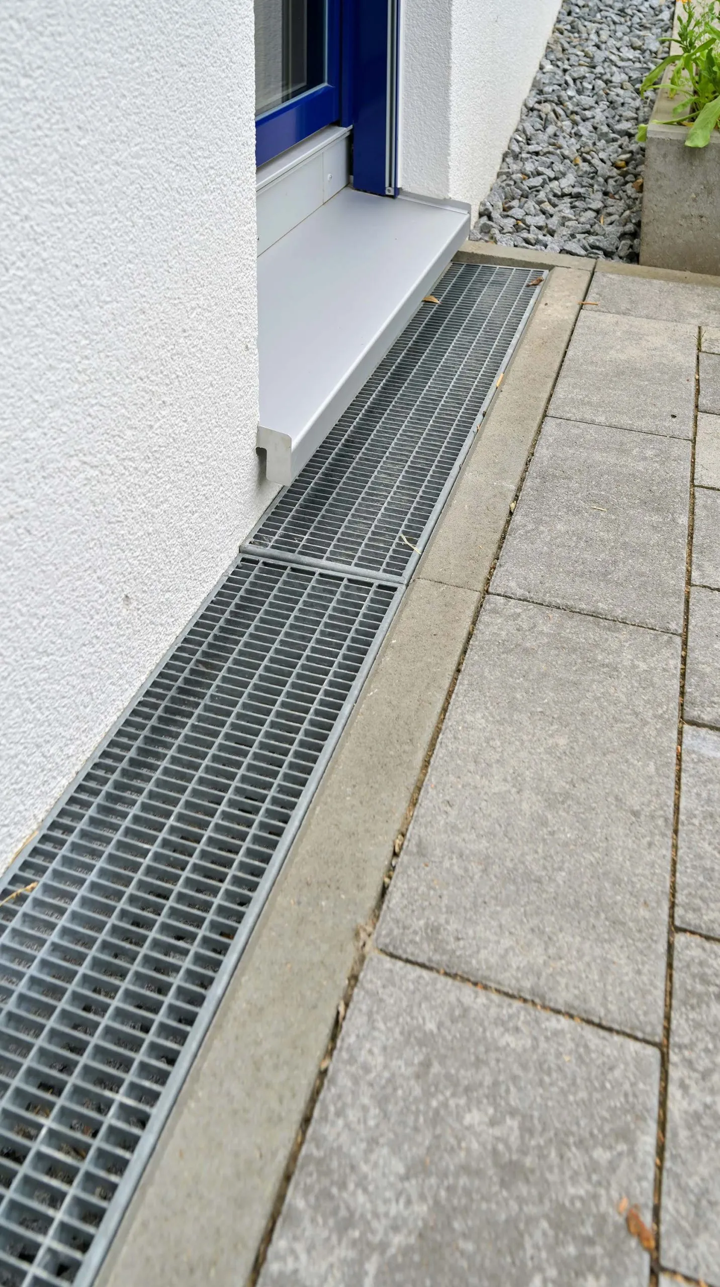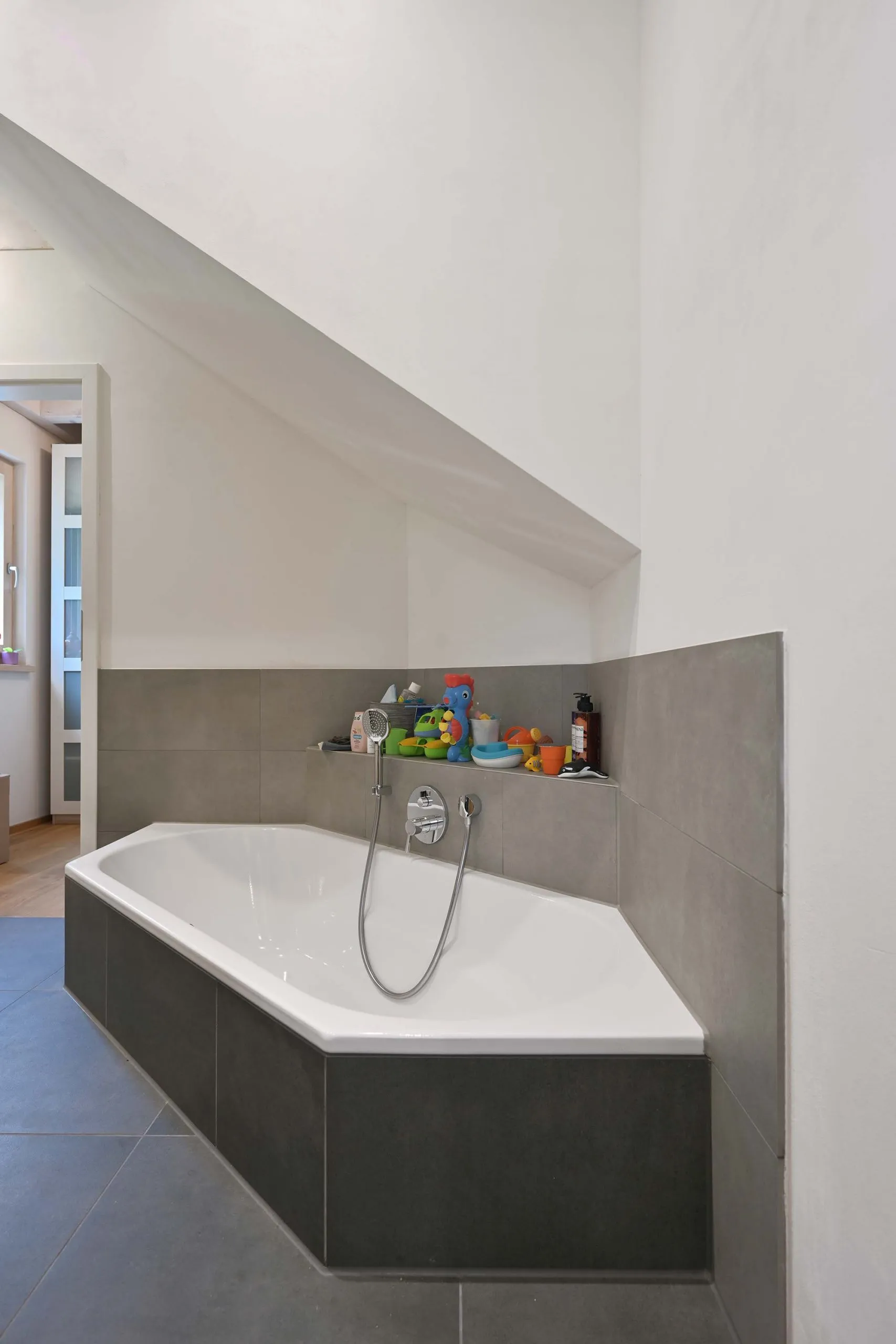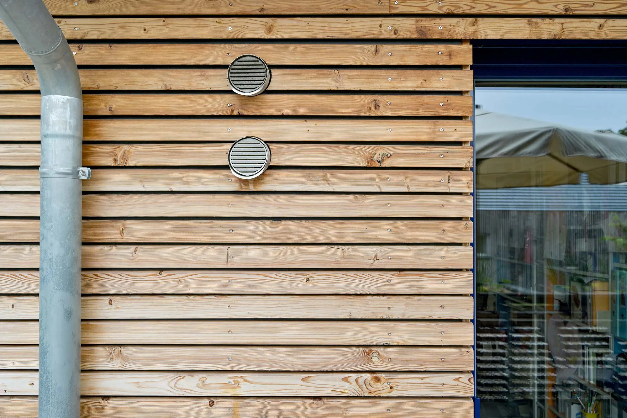 Wohn- und Essbereich durch Hanglage im Obergeschoss mit Sichtdachstuhl, Garage in Sichtbetonbauweise, überdachter Eingangsbereich durch Flachdachverlängerung der Garage, Dach- und Wandverlängerung als Freisitz