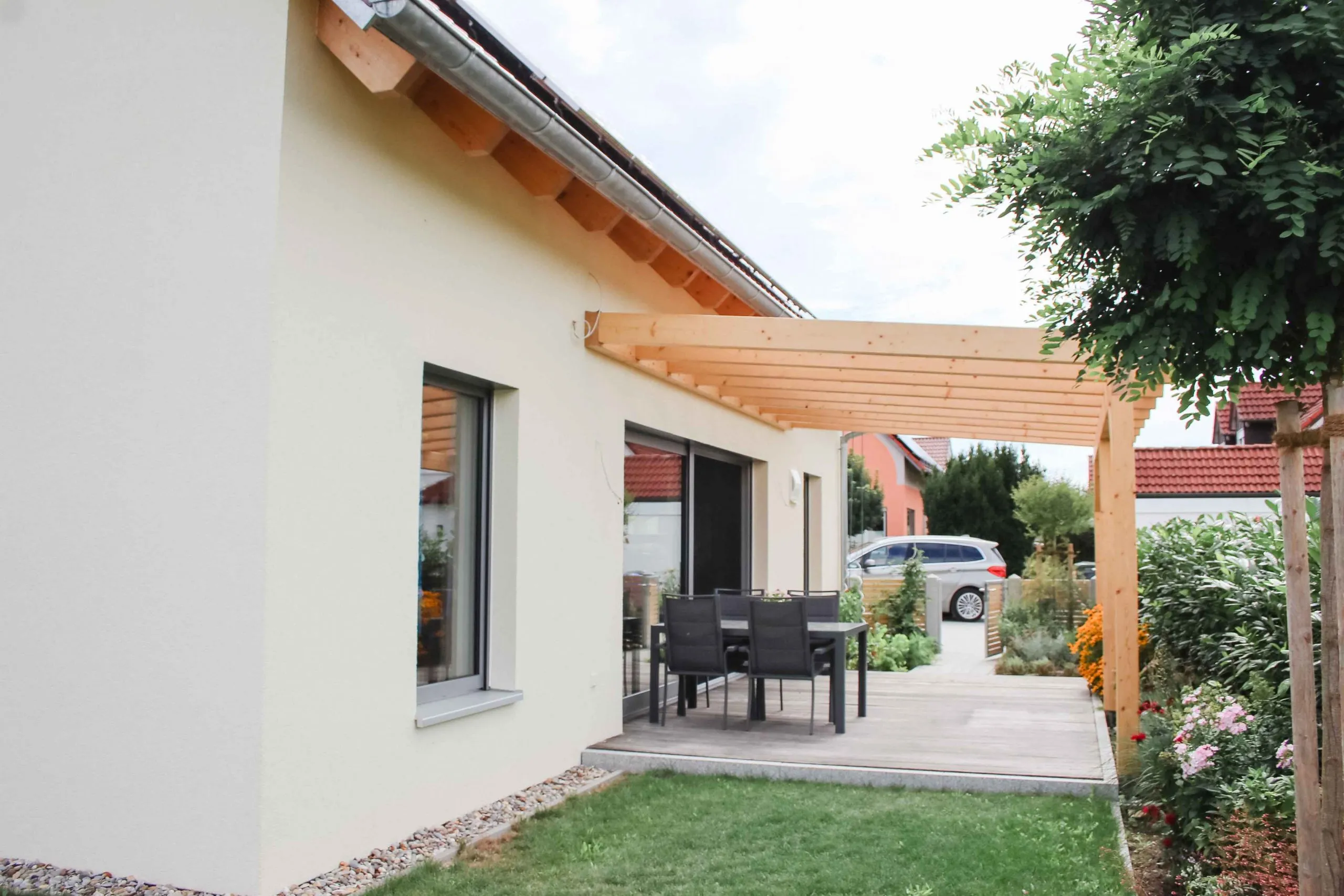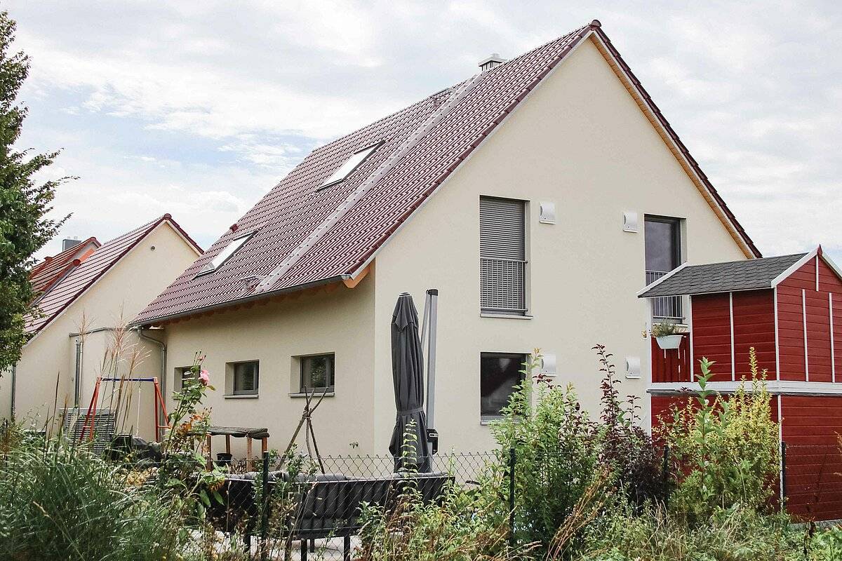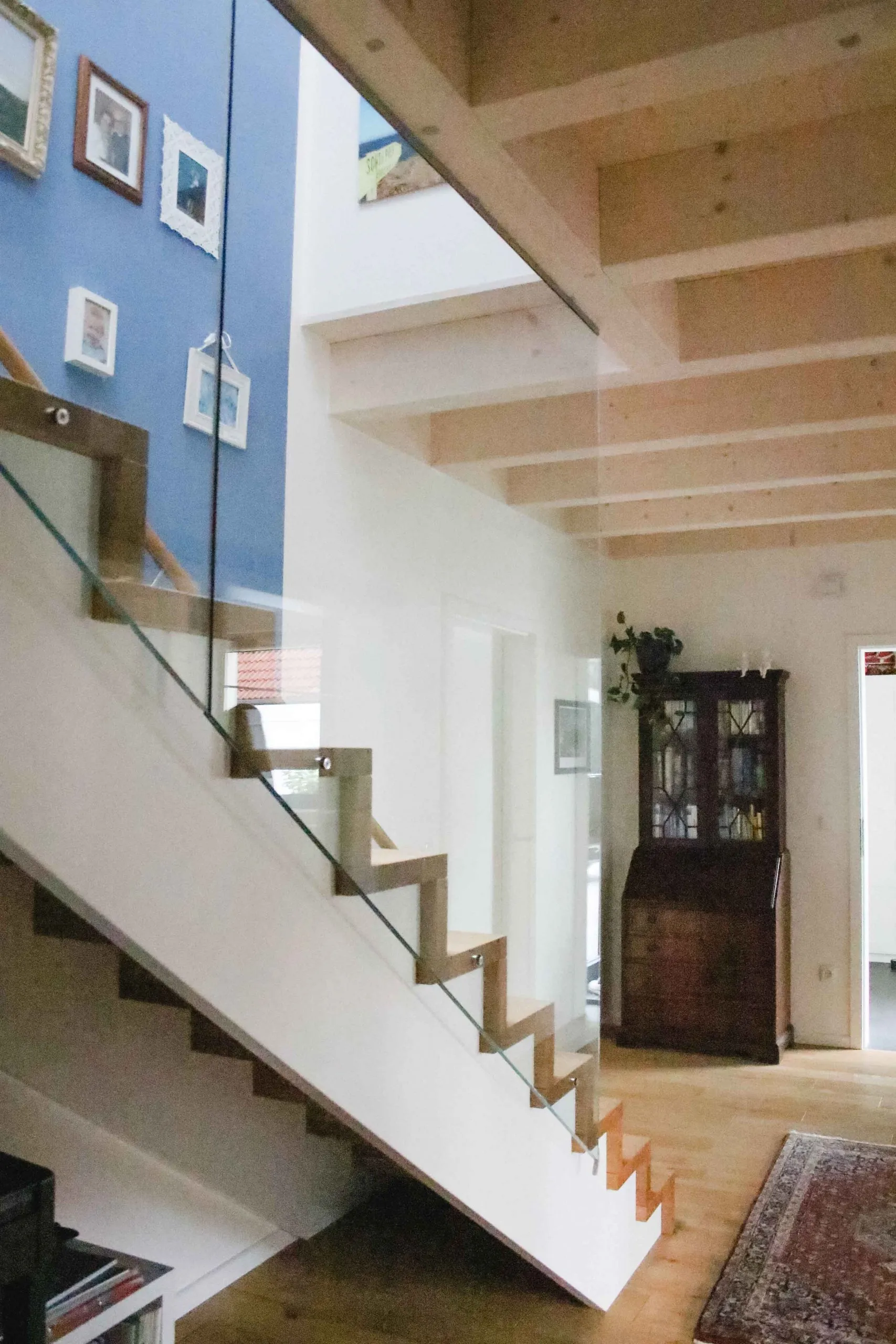 Faltwerktreppe mit Glasgeländer, Vollholzküche, Gründach