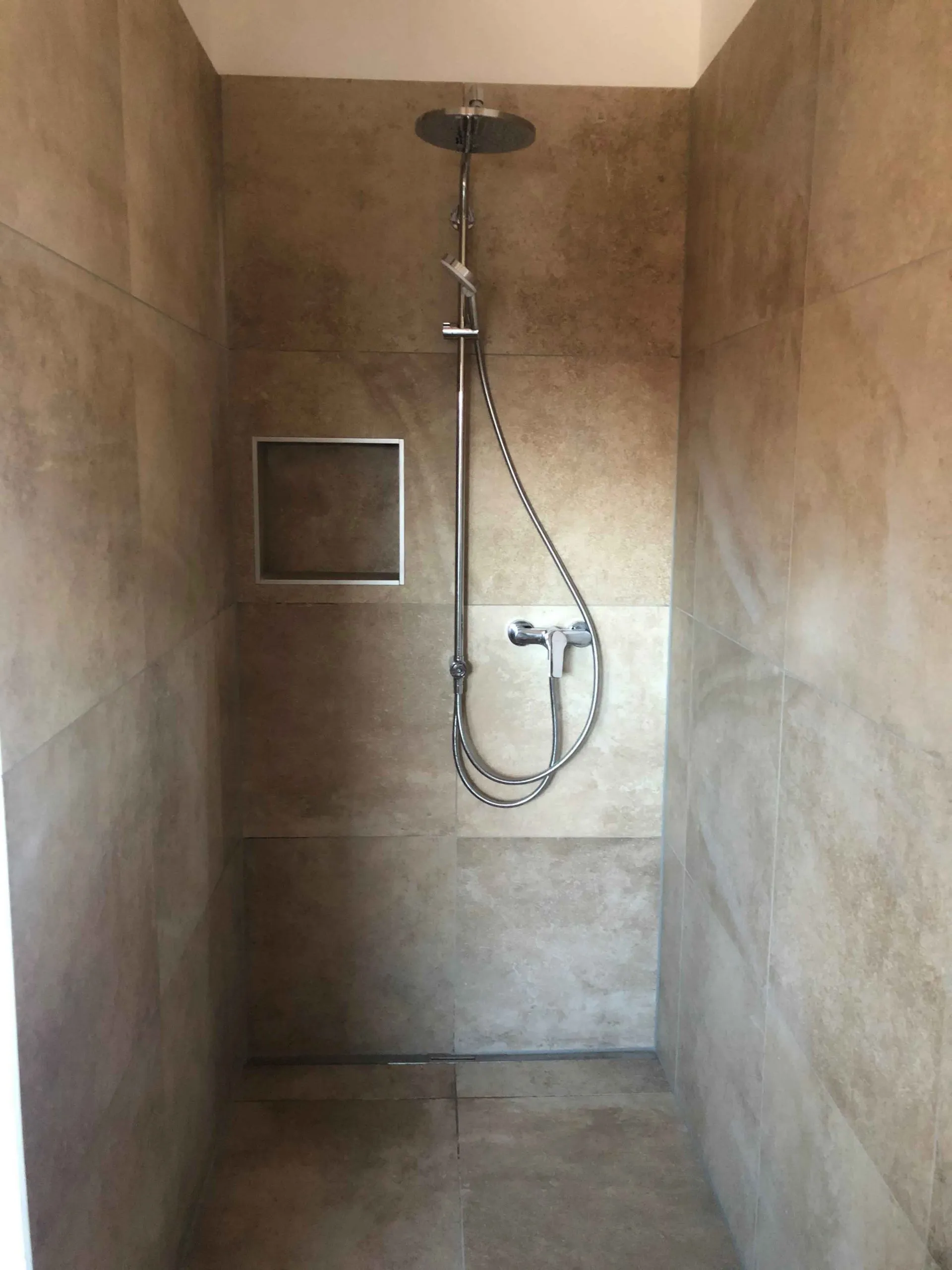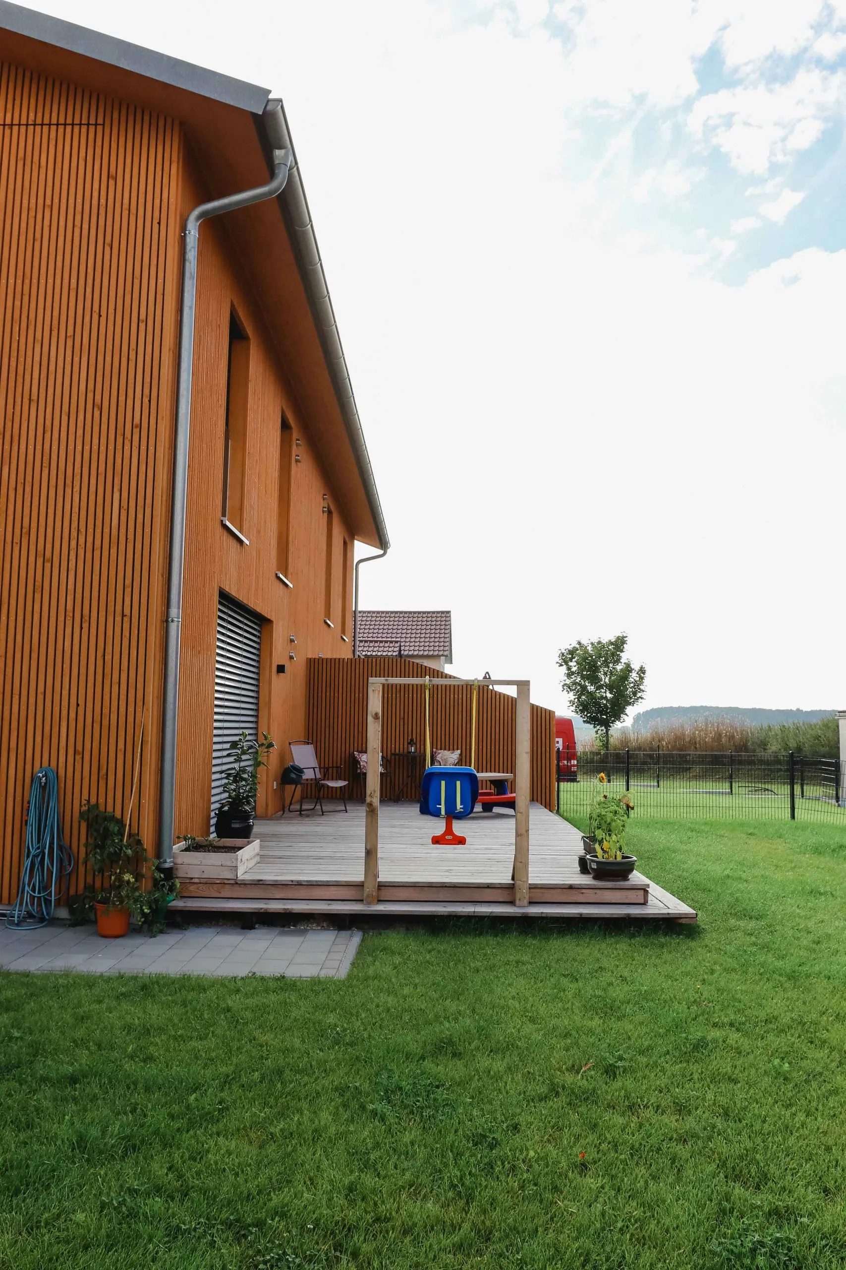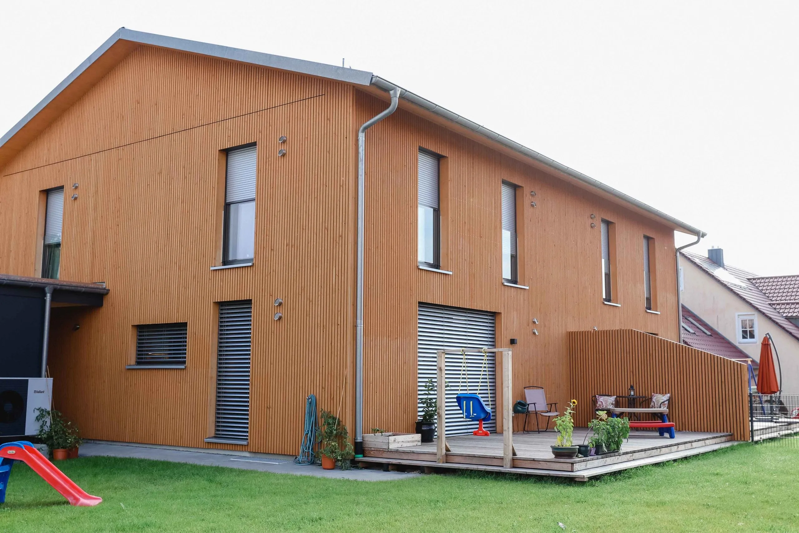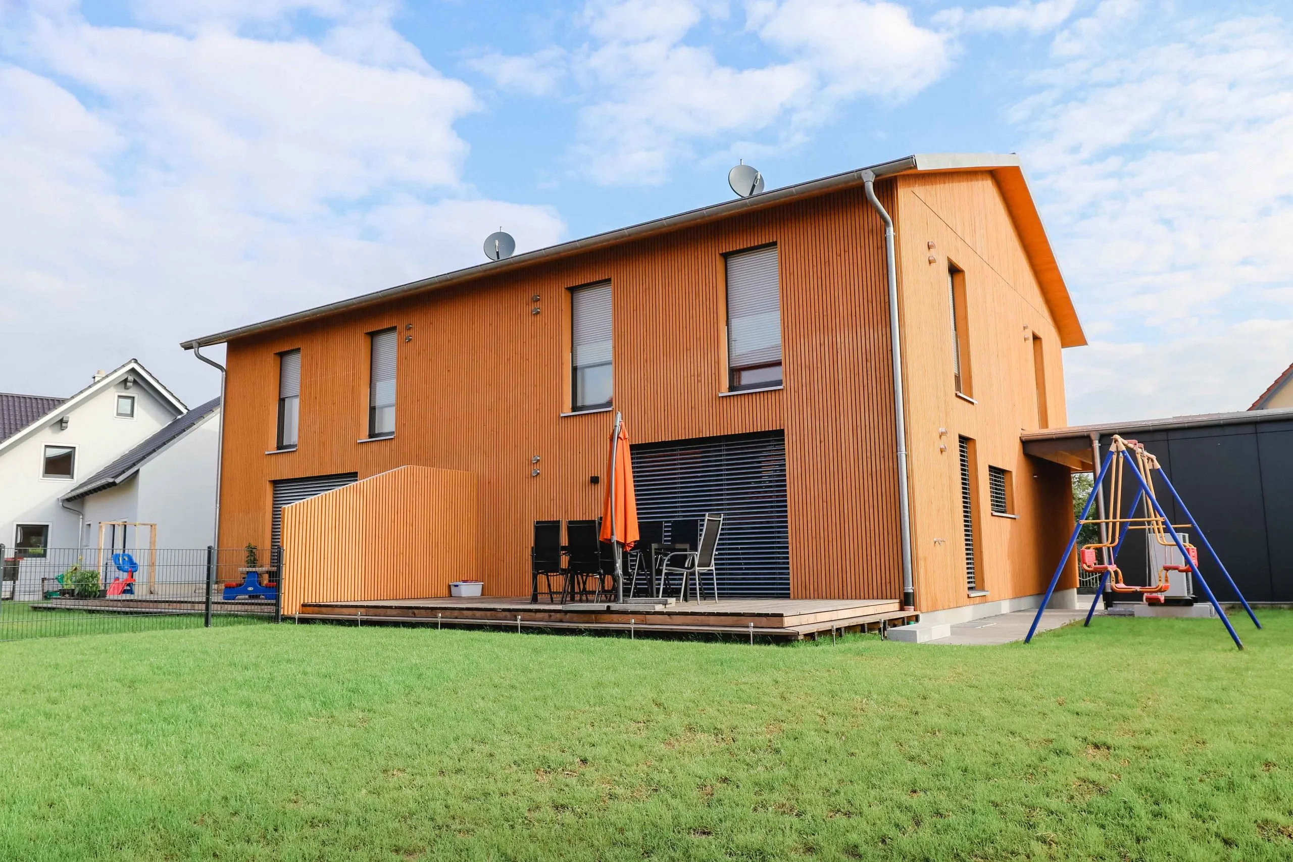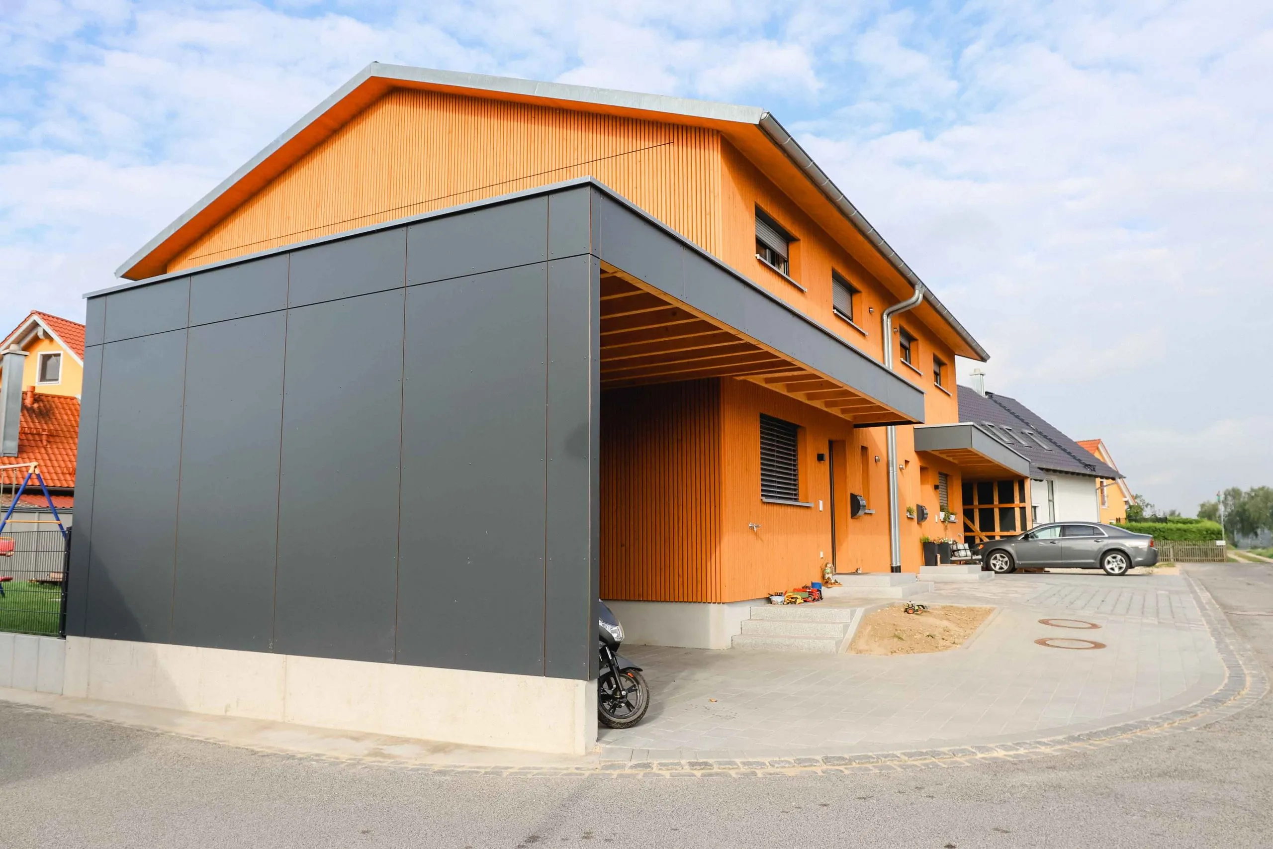 Doppelhaus mit Holzfassade (senkrechte Fichtenlatten) Farbe: Nussbraun, Carports mit graunen Fasercementplatten Kellerinnenwände Holzständerbauweise, Kellerdecke als Brettstapeldecke