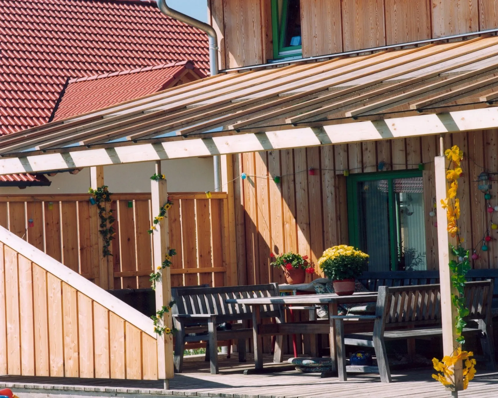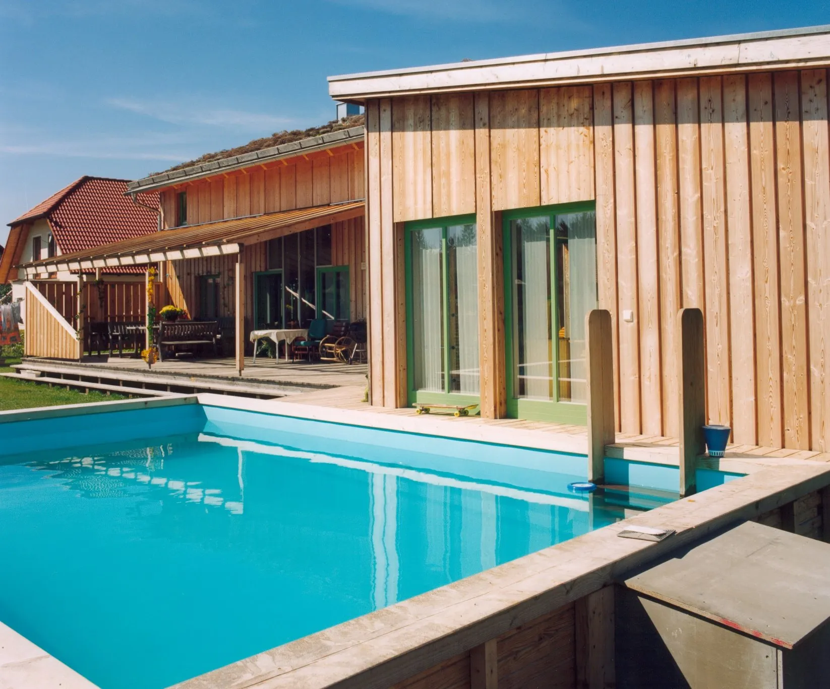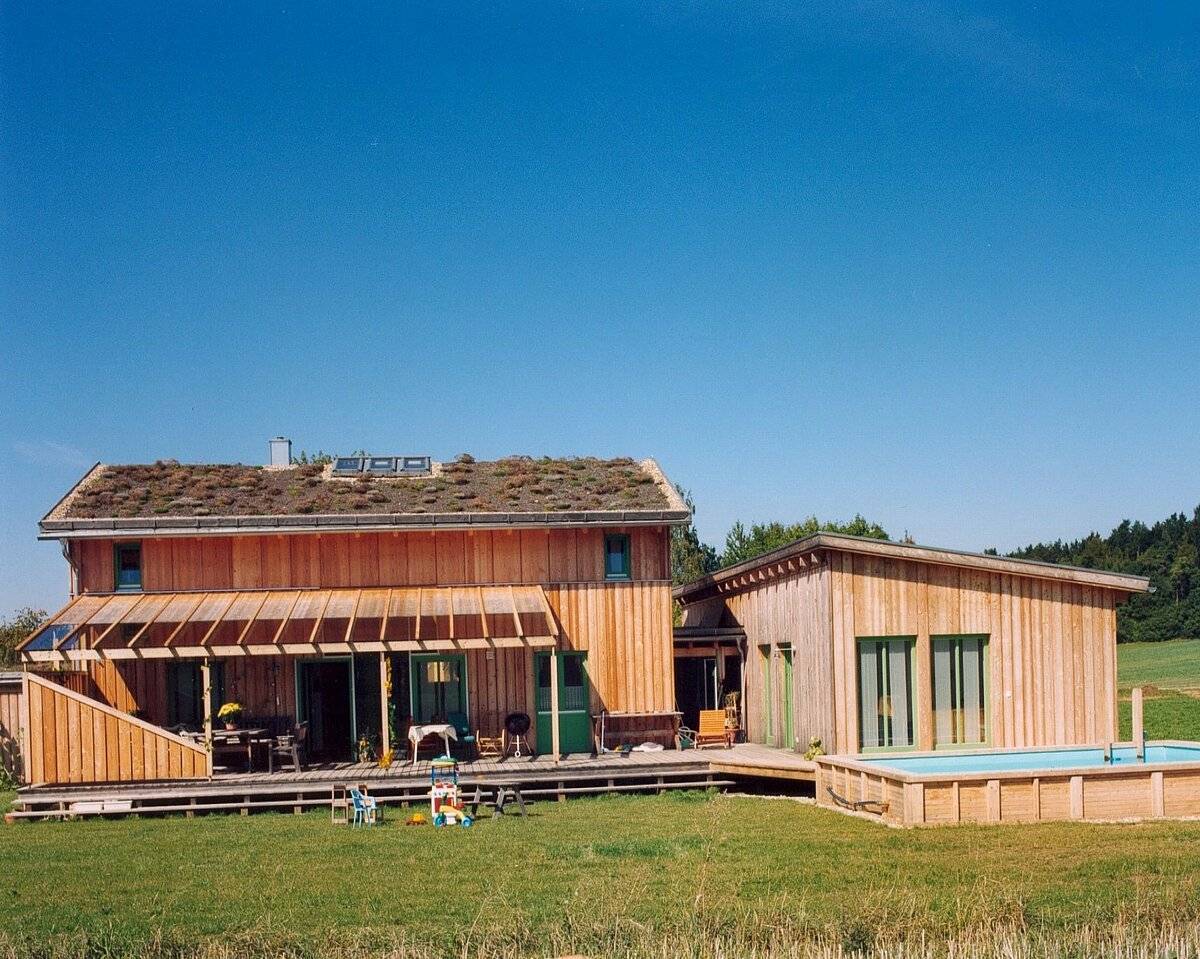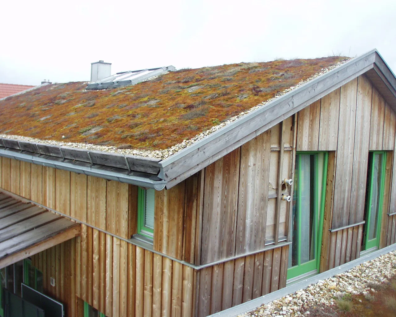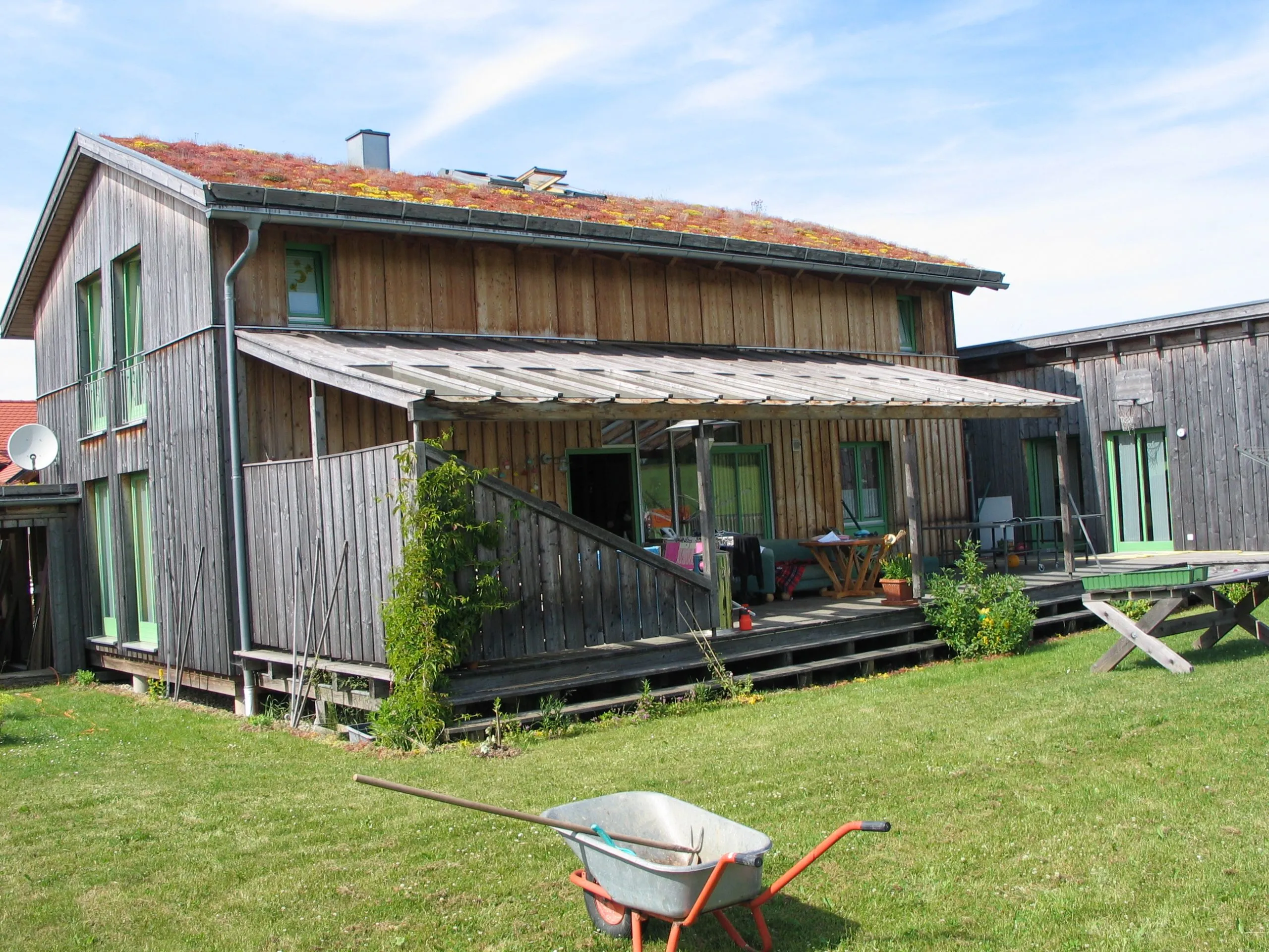 Dachbegrünung auf Garage, Pelletsheizung mit 30 qm Solarkollektoren