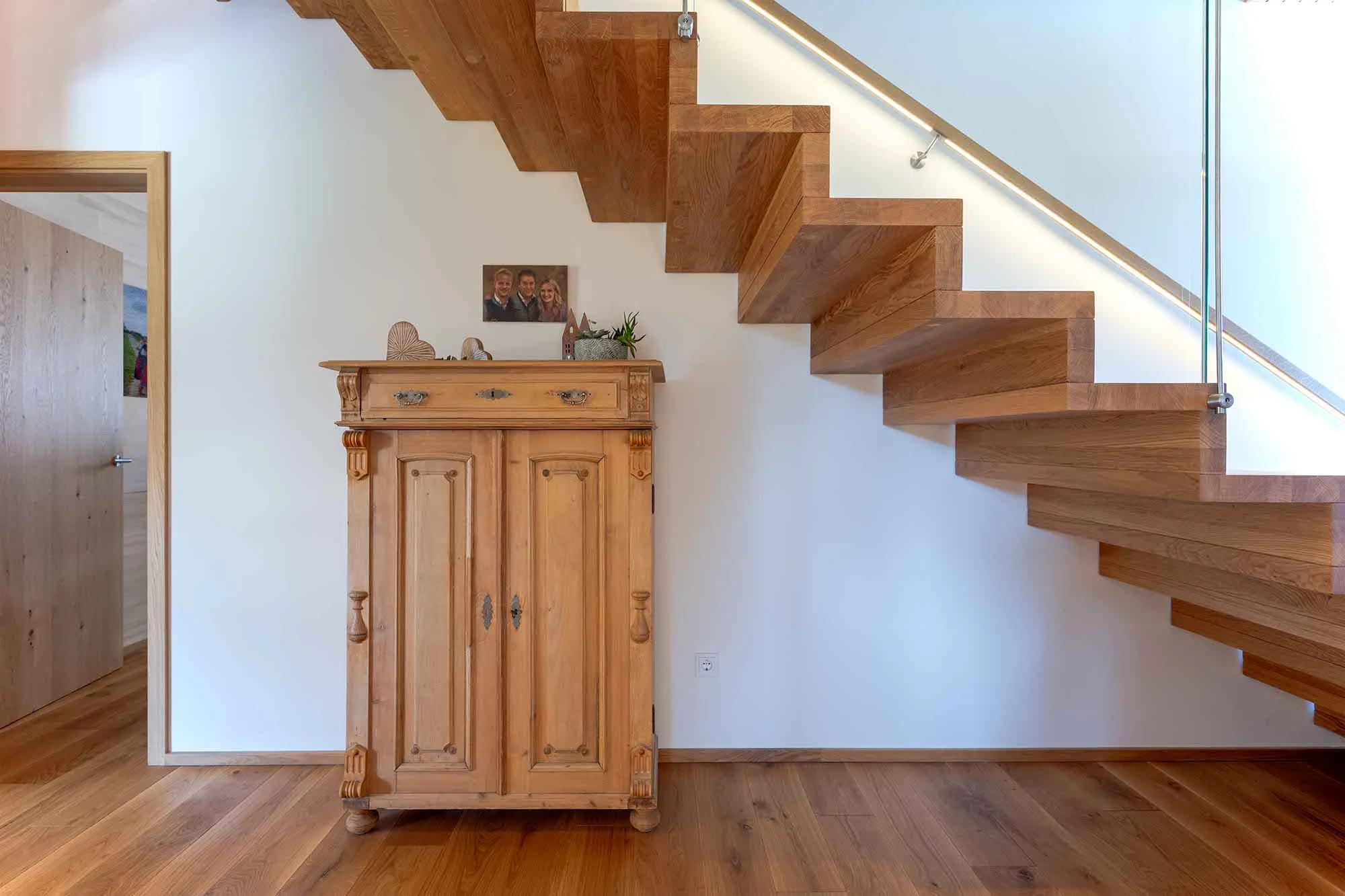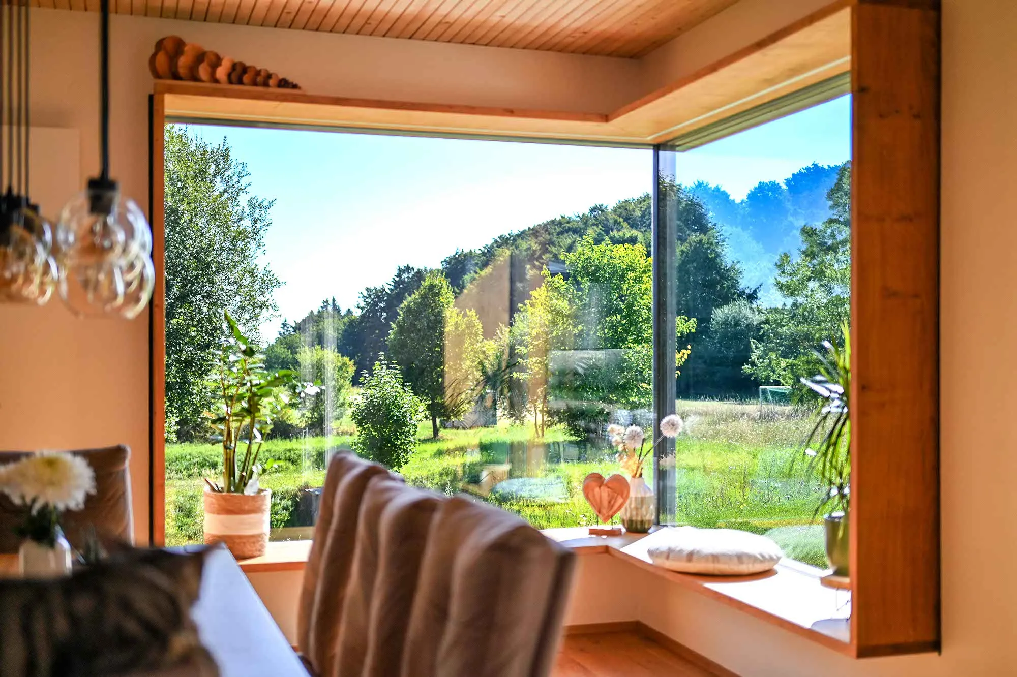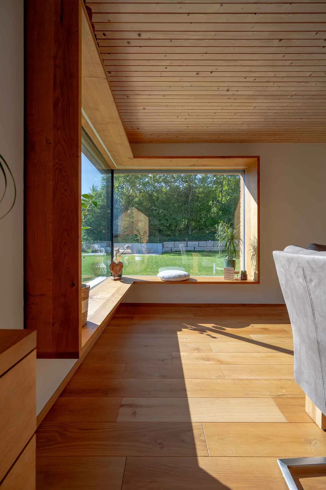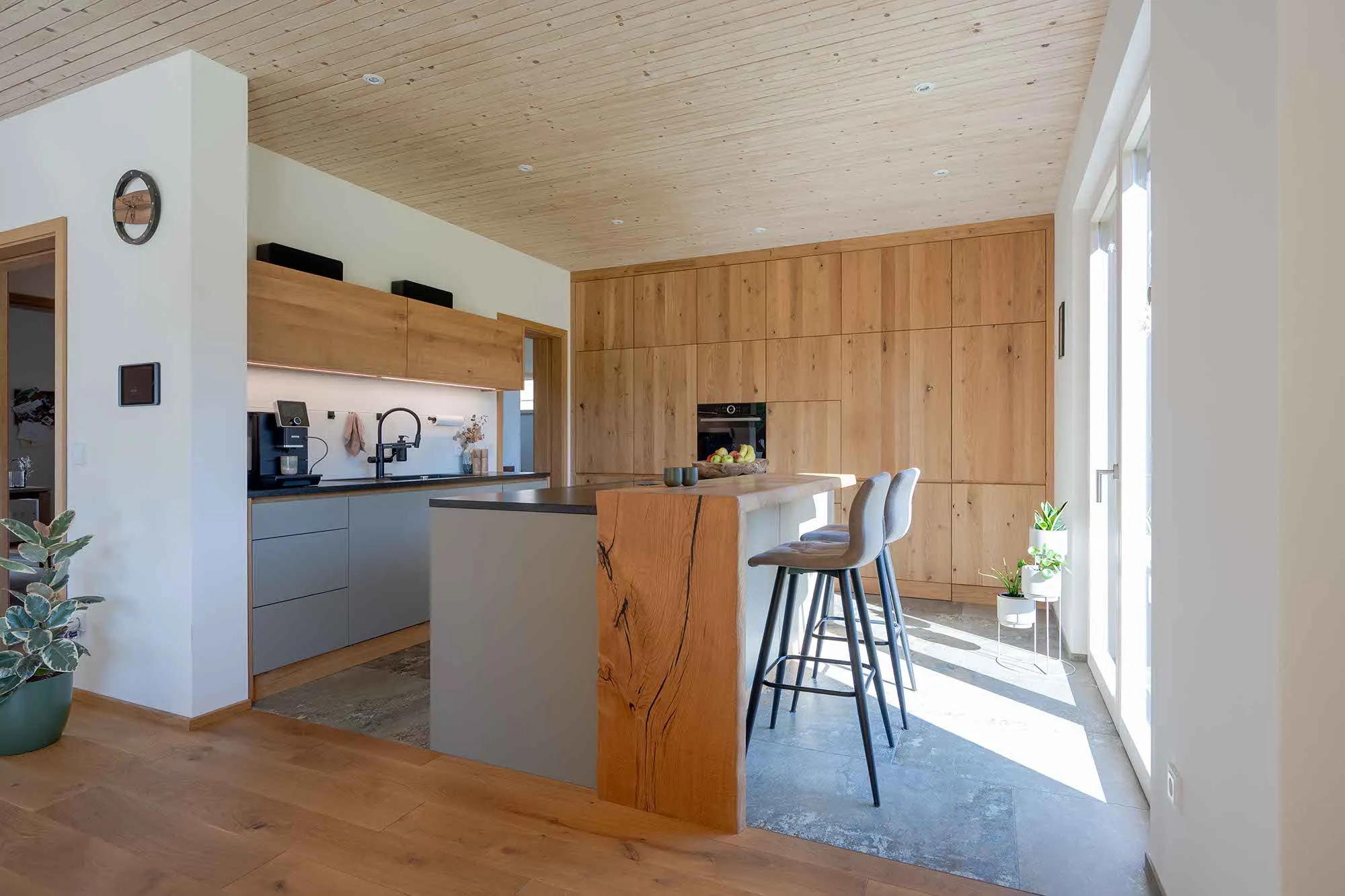 Eck-Sitzfenster, Holzvertäfelungen (Eiche gehackt), Faltwerktreppe mit Glas-Absturzsicherung, Massivholzküche mit versteckter Türe zur Vorratskammer