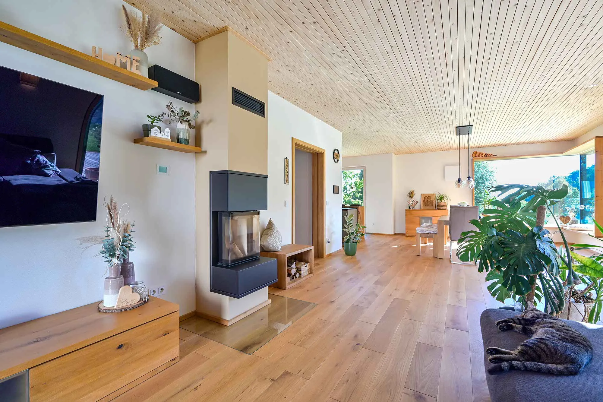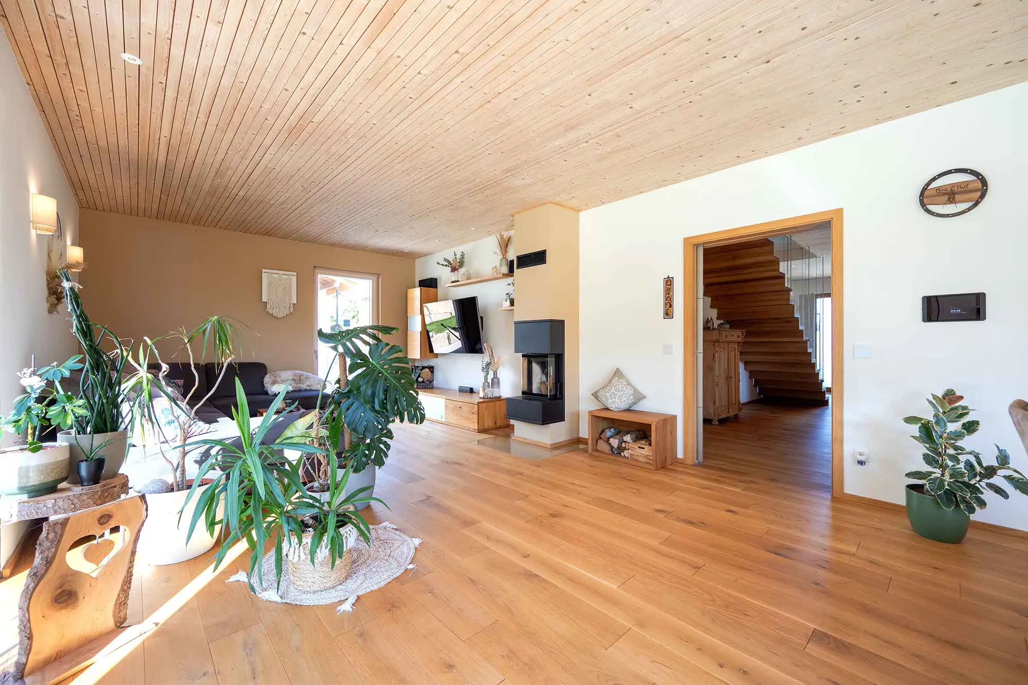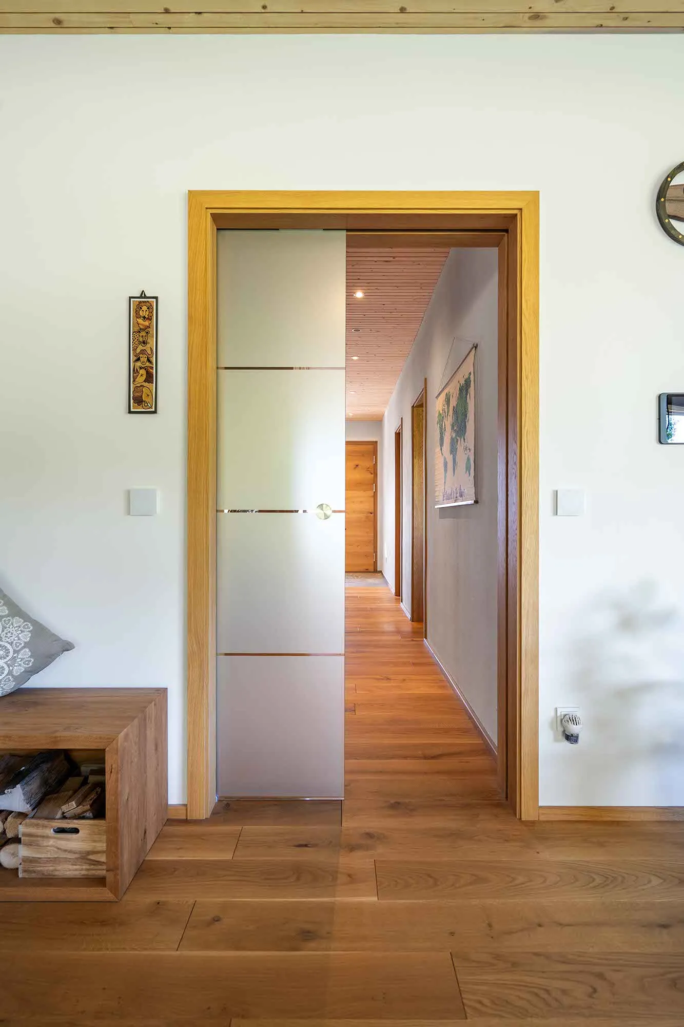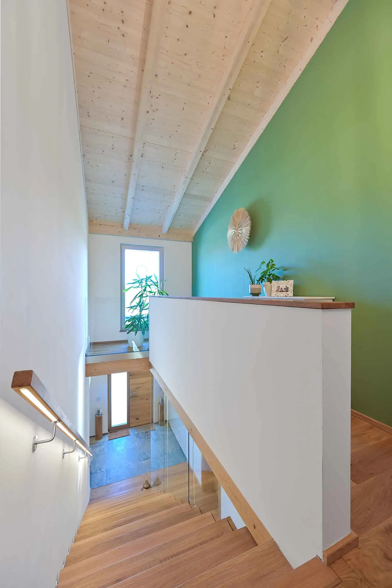 Eck-Sitzfenster, Holzvertäfelungen (Eiche gehackt), Faltwerktreppe mit Glas-Absturzsicherung, Massivholzküche mit versteckter Türe zur Vorratskammer