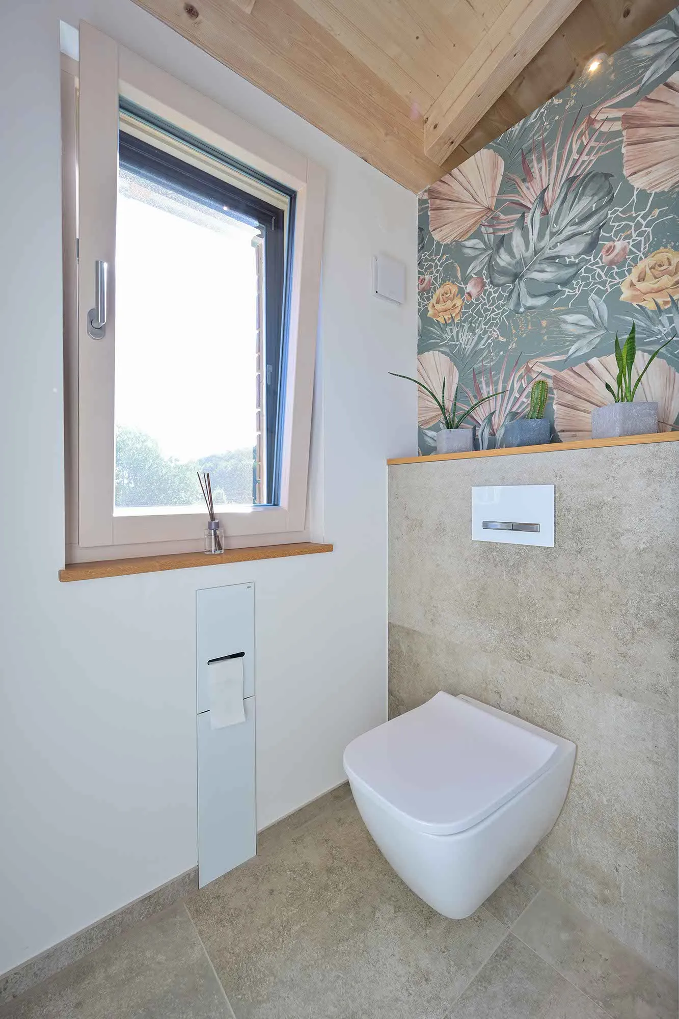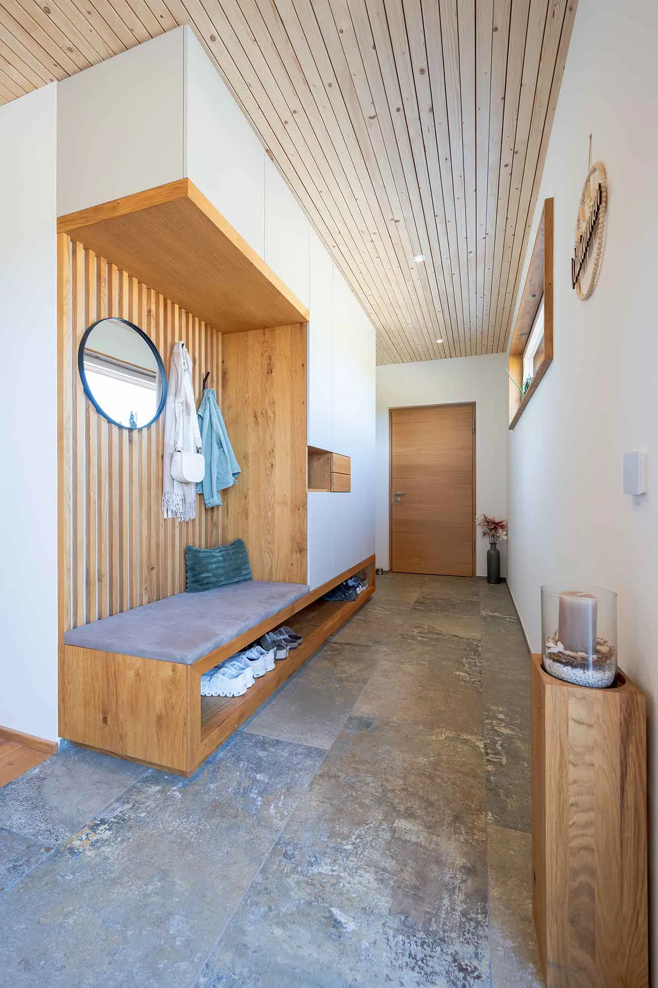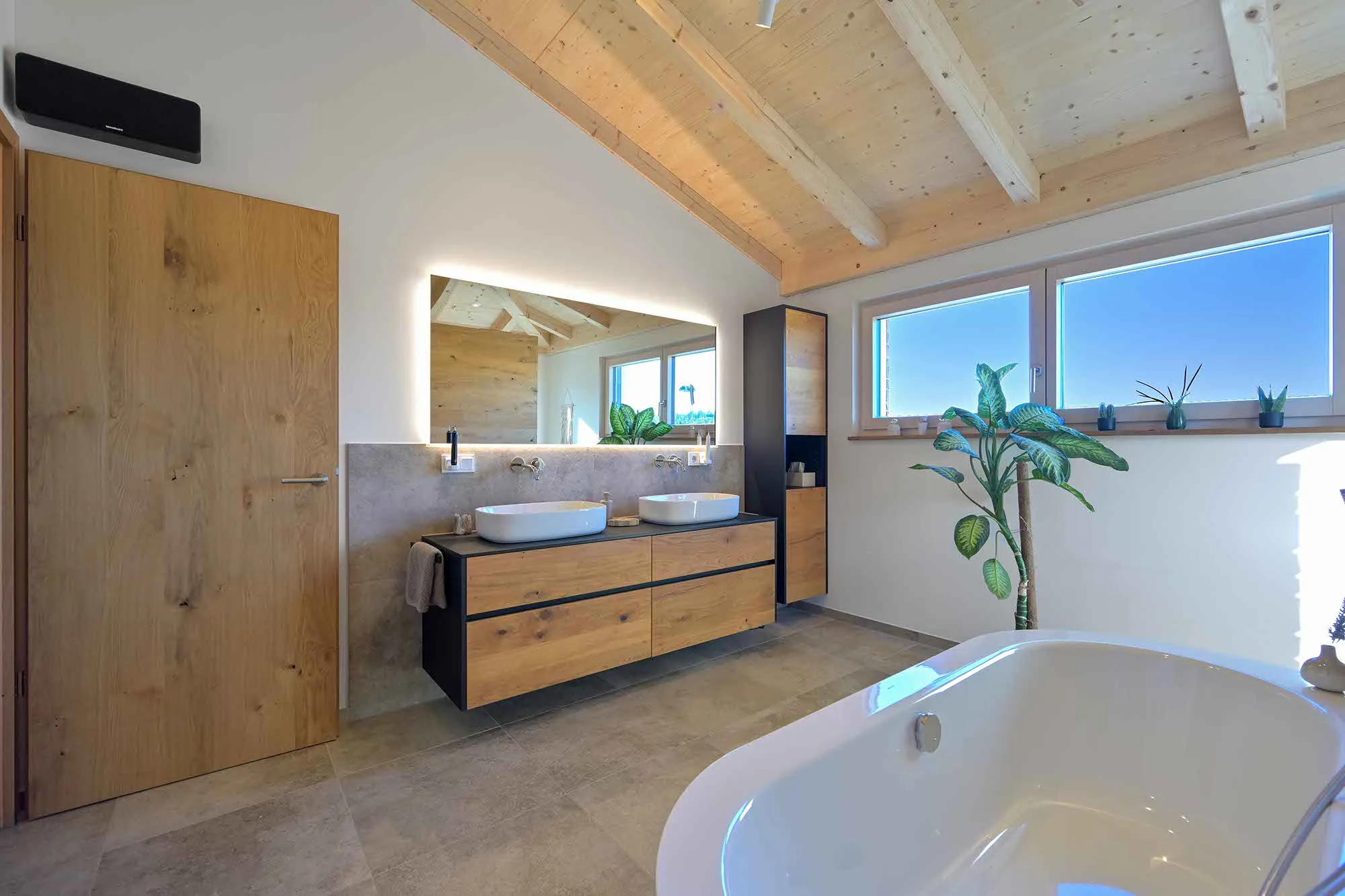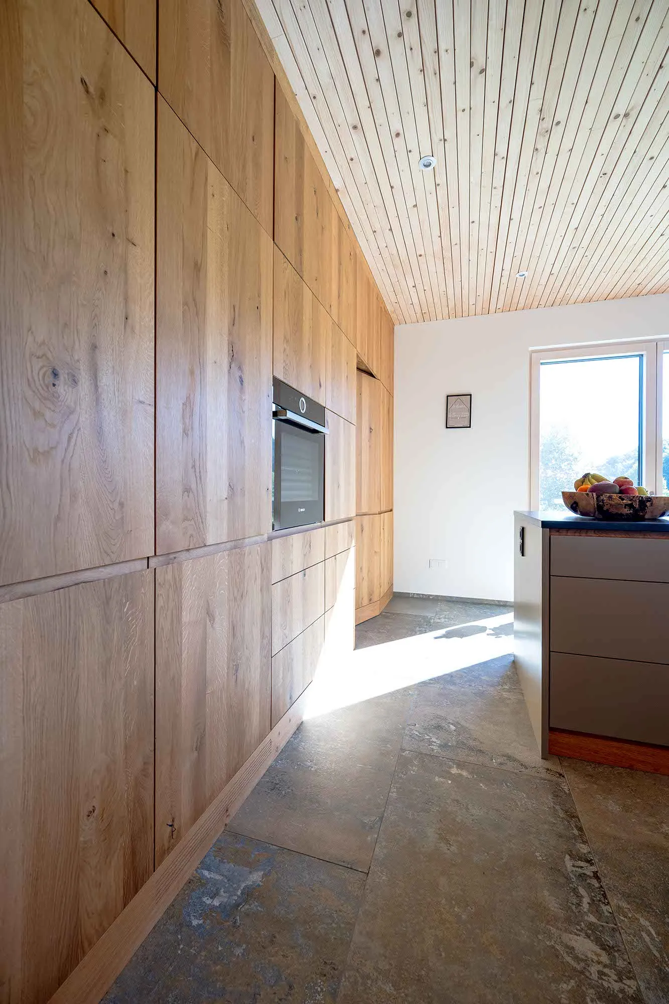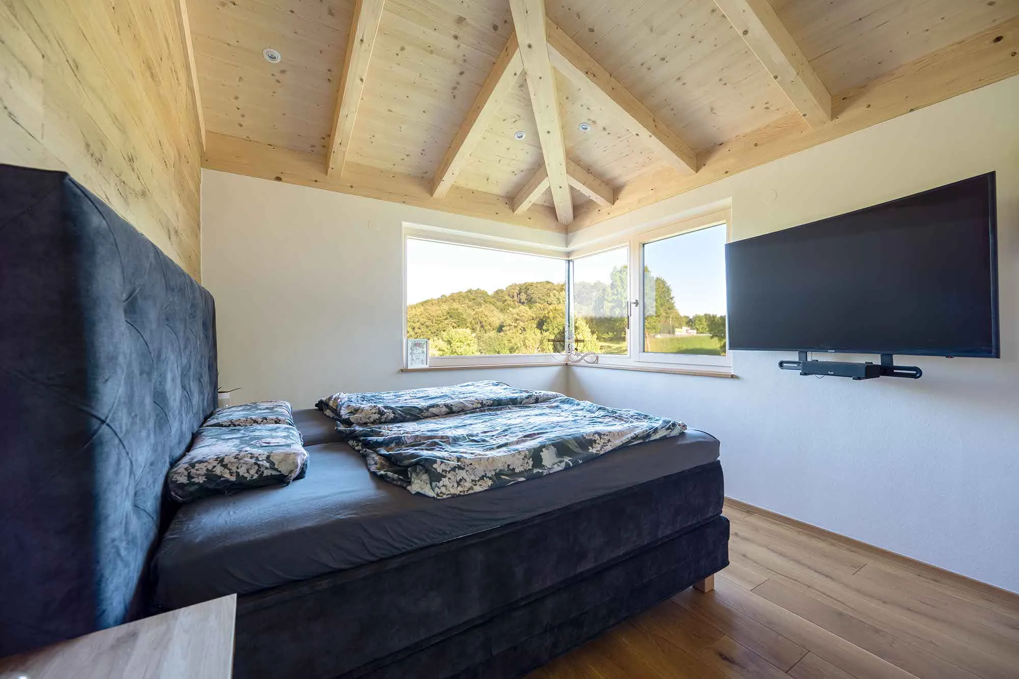 Eck-Sitzfenster, Holzvertäfelungen (Eiche gehackt), Faltwerktreppe mit Glas-Absturzsicherung, Massivholzküche mit versteckter Türe zur Vorratskammer