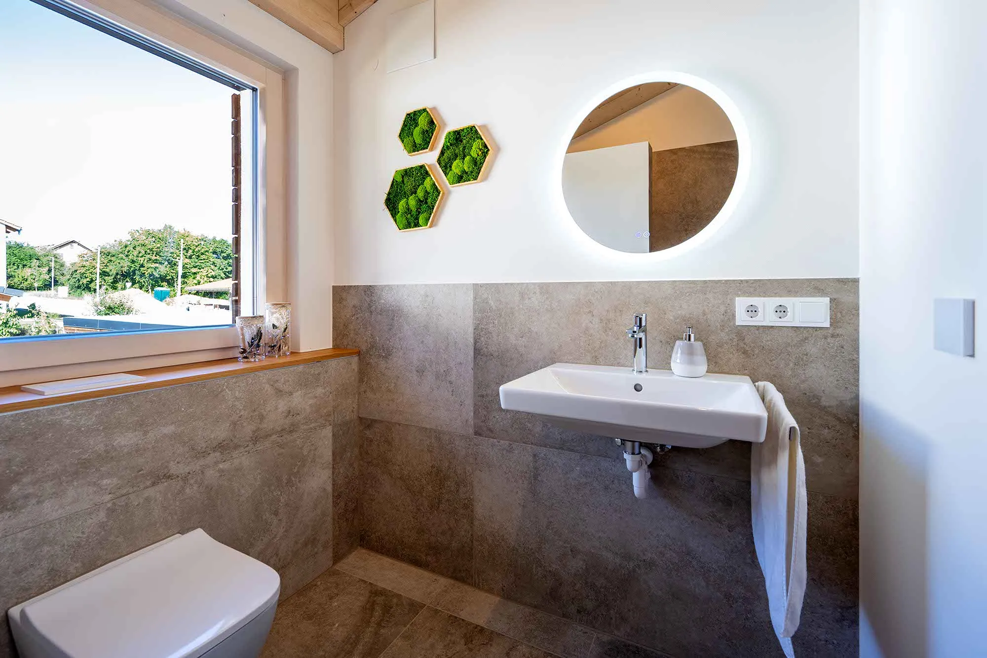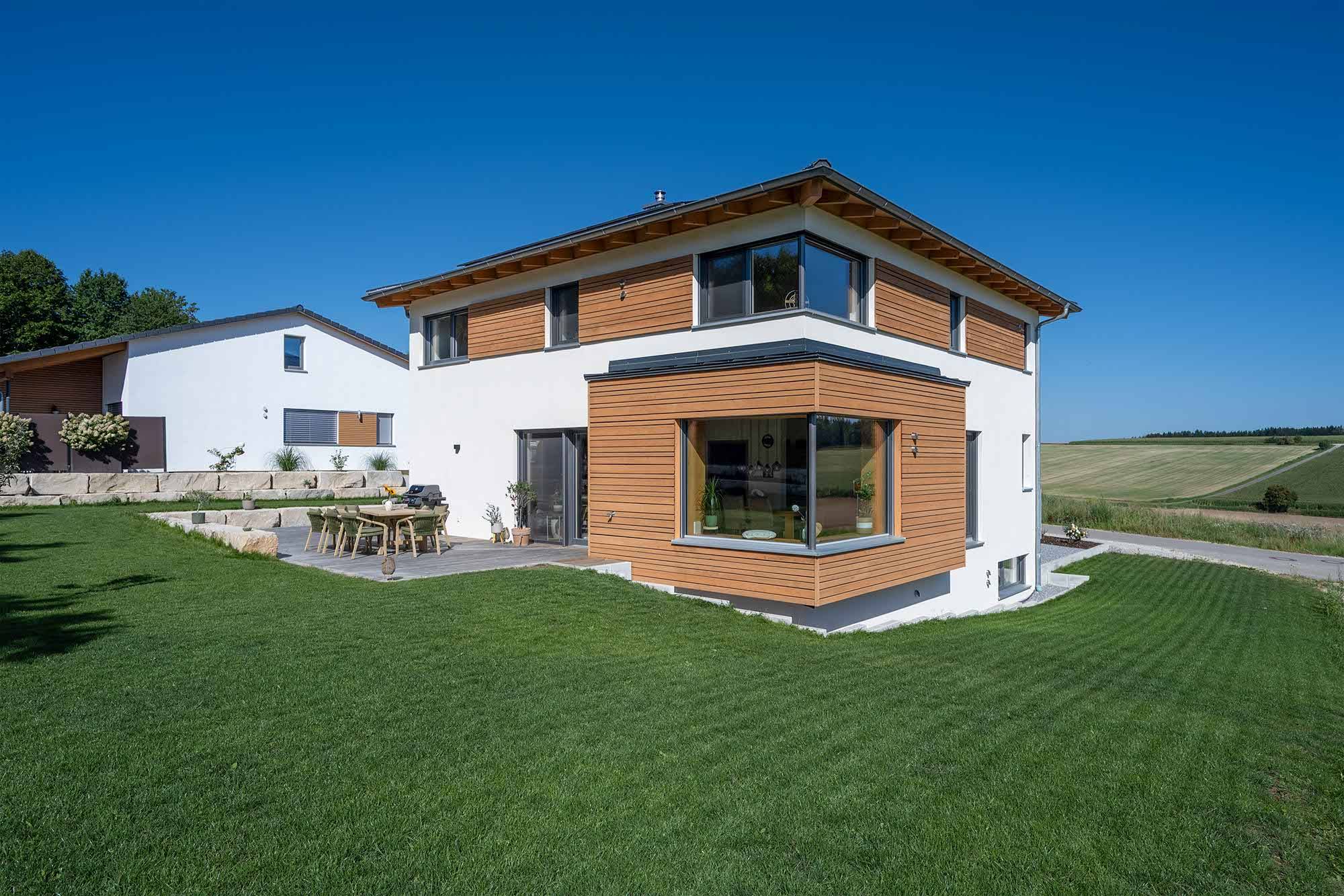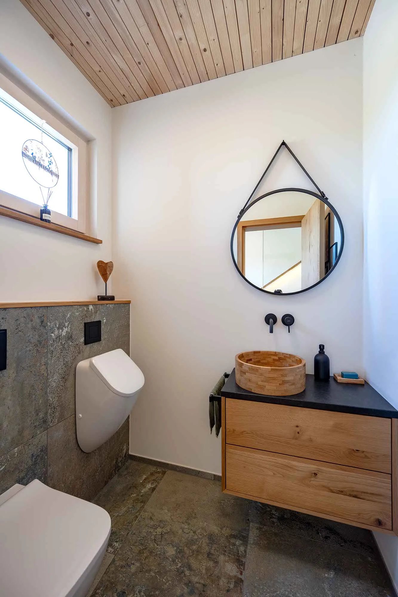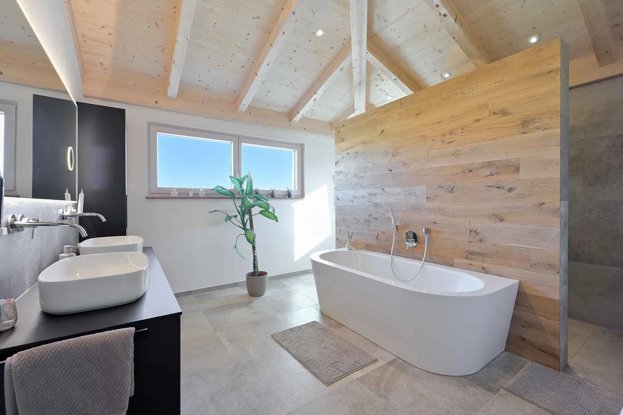Eck-Sitzfenster, Holzvertäfelungen (Eiche gehackt), Faltwerktreppe mit Glas-Absturzsicherung, Massivholzküche mit versteckter Türe zur Vorratskammer