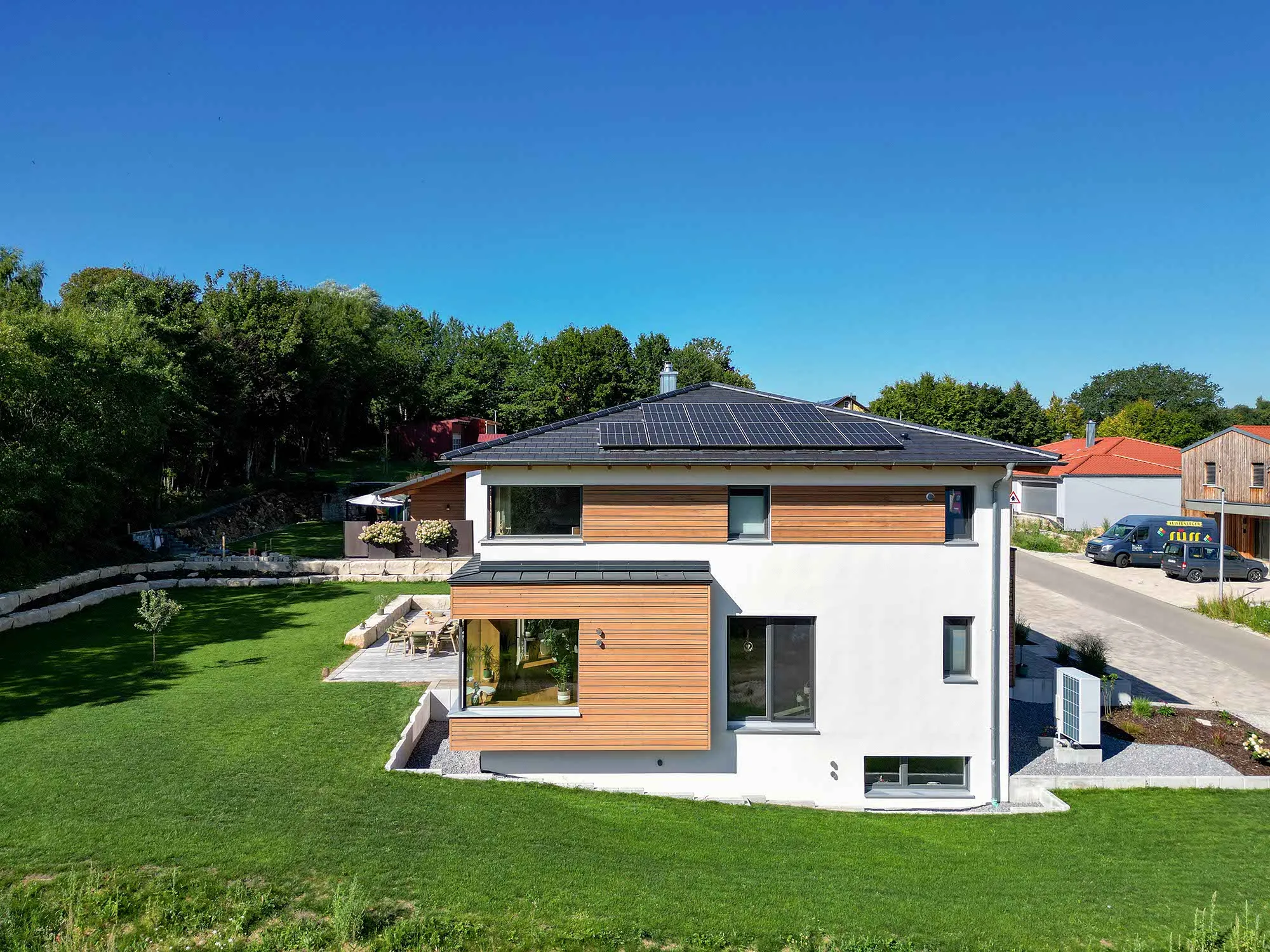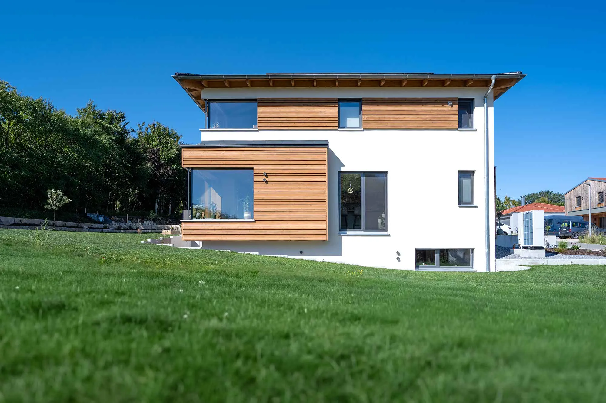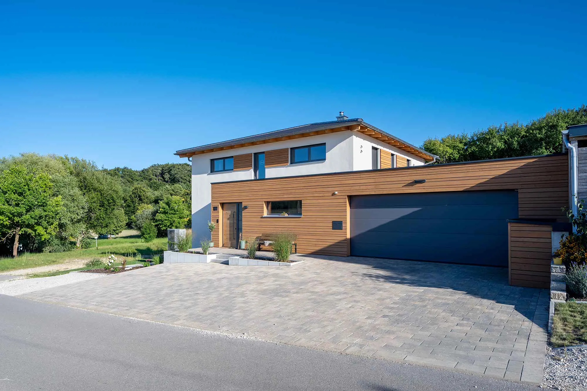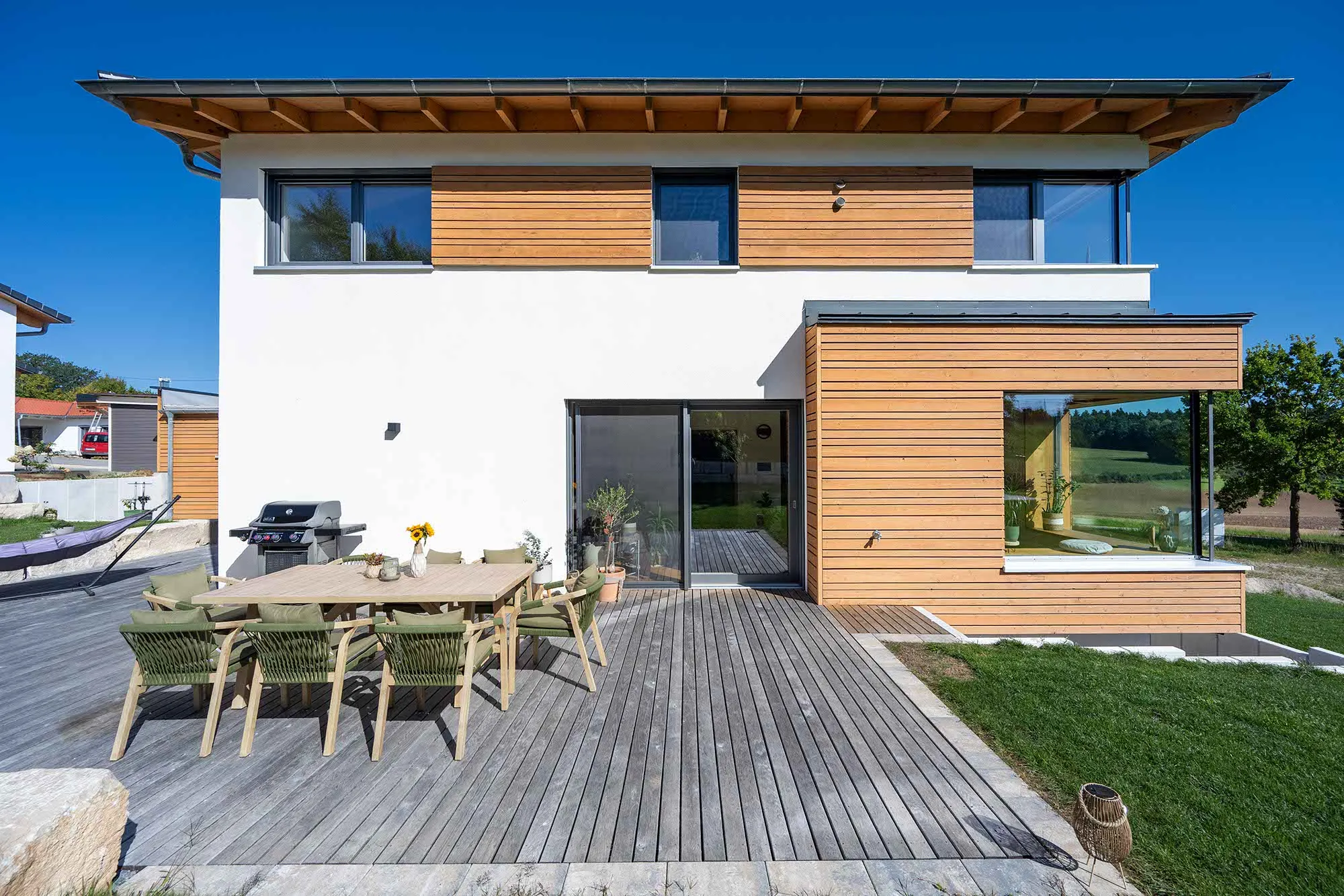 Eck-Sitzfenster, Holzvertäfelungen (Eiche gehackt), Faltwerktreppe mit Glas-Absturzsicherung, Massivholzküche mit versteckter Türe zur Vorratskammer