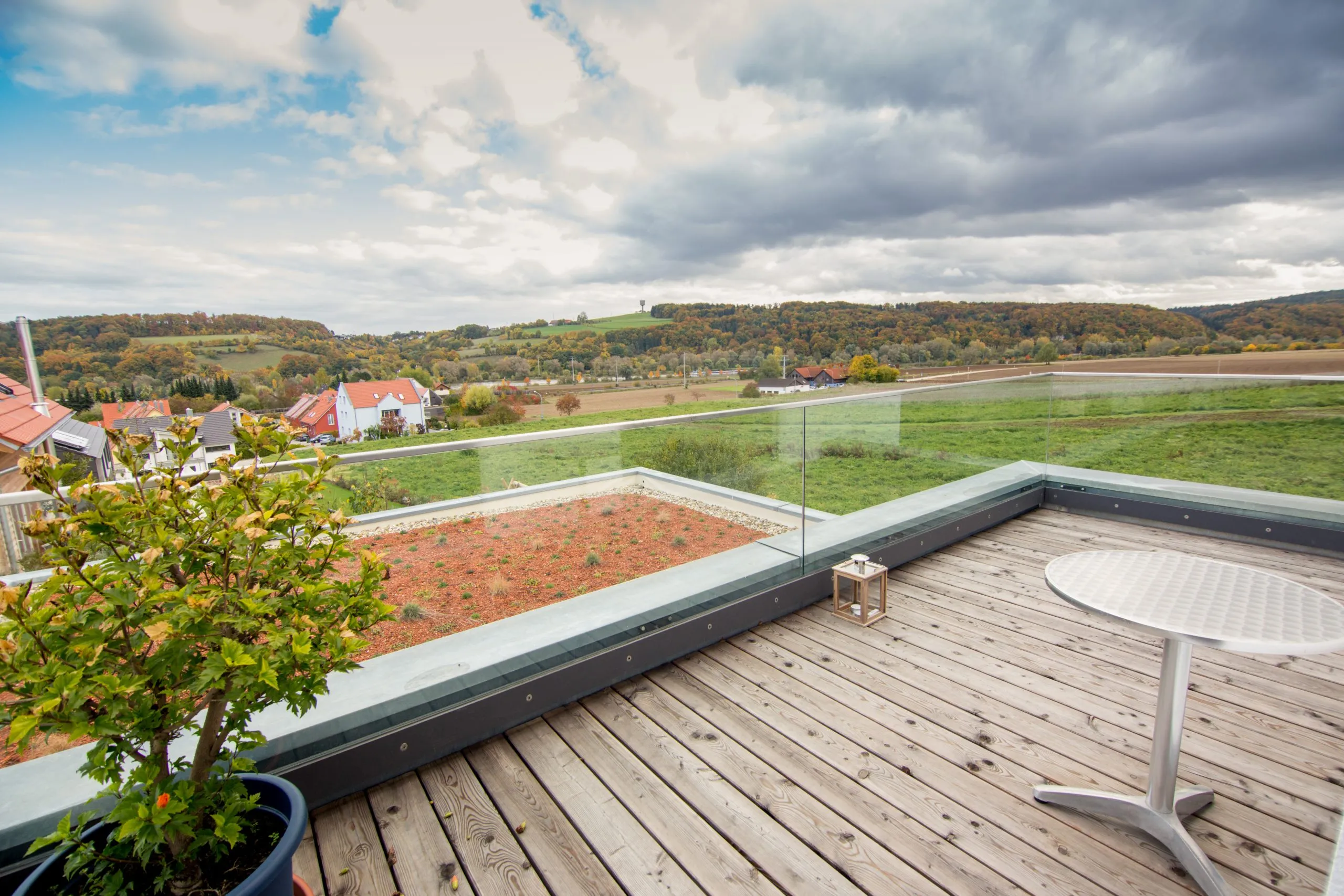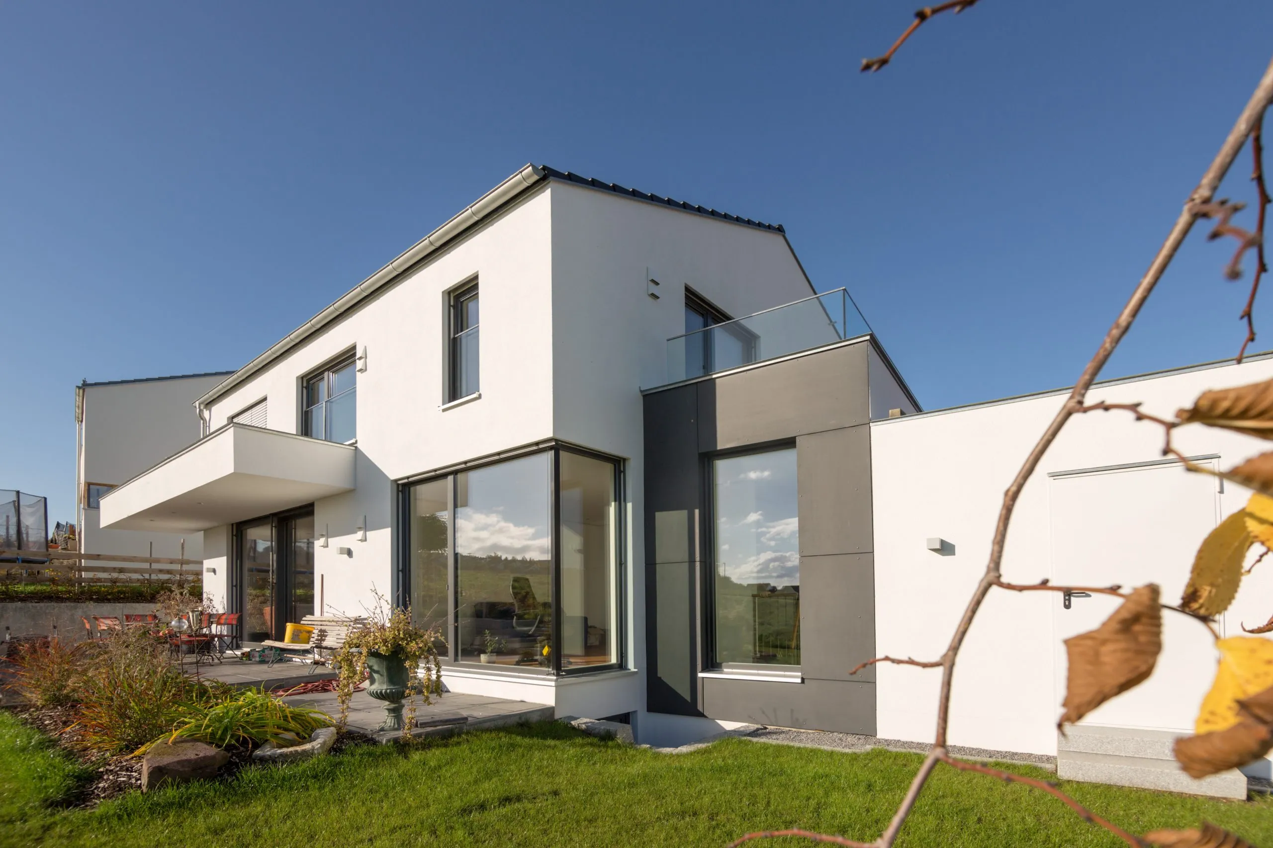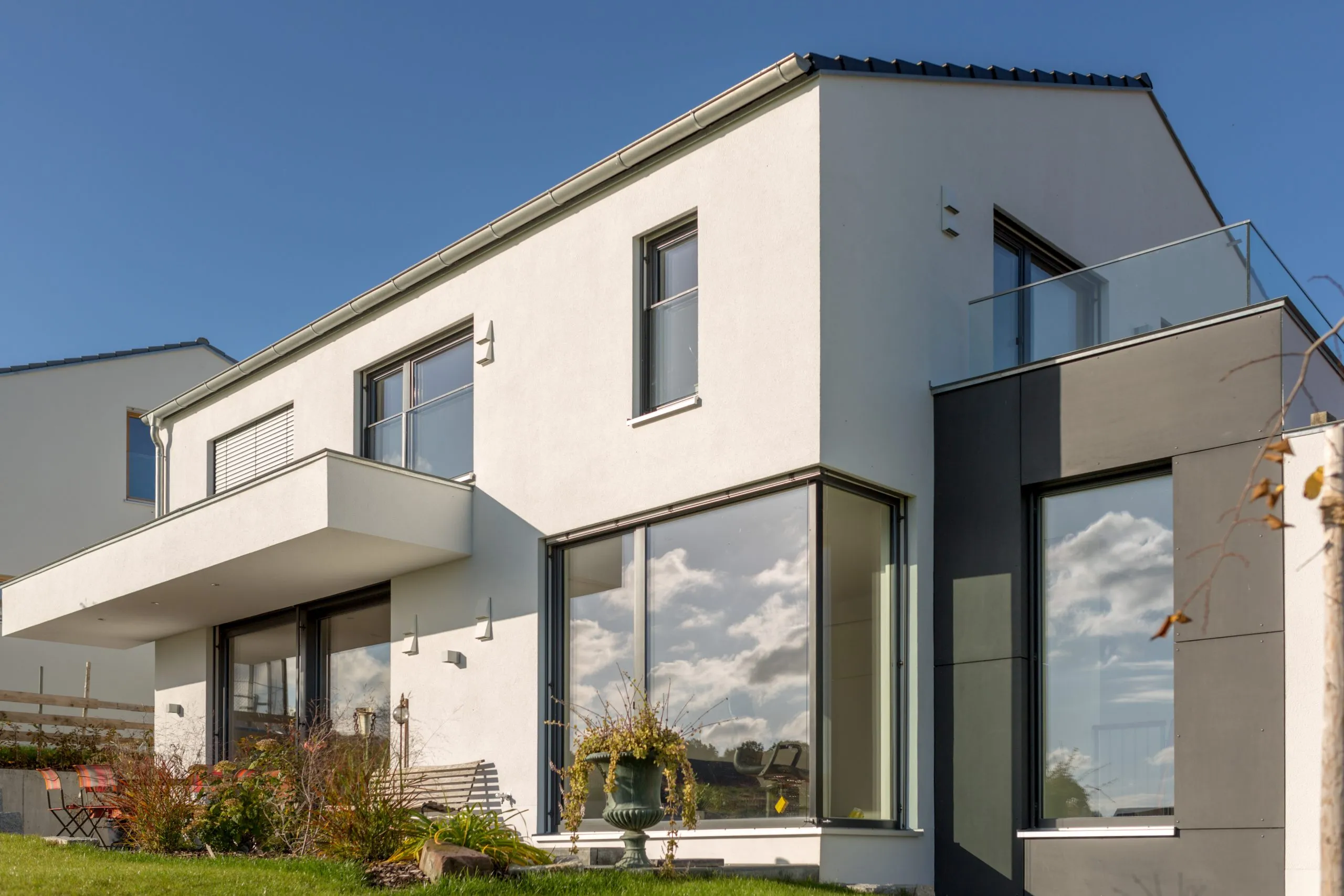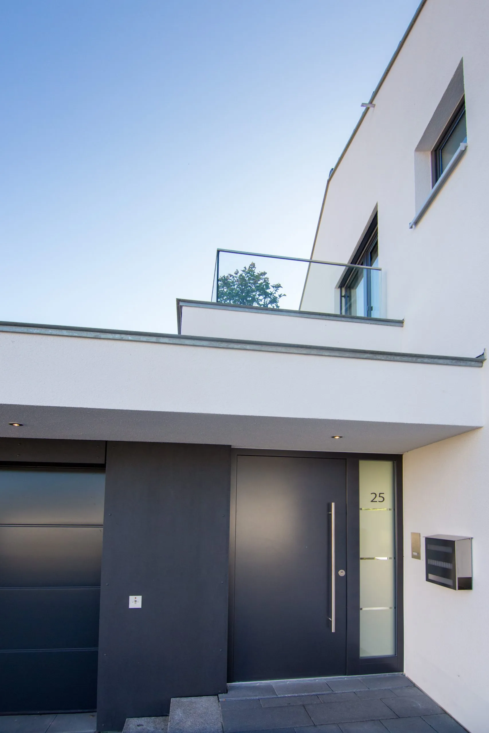 Glasgeländer in Ganzglas, Fassadenplatten am Anbau mit grauen Faserzementplatten