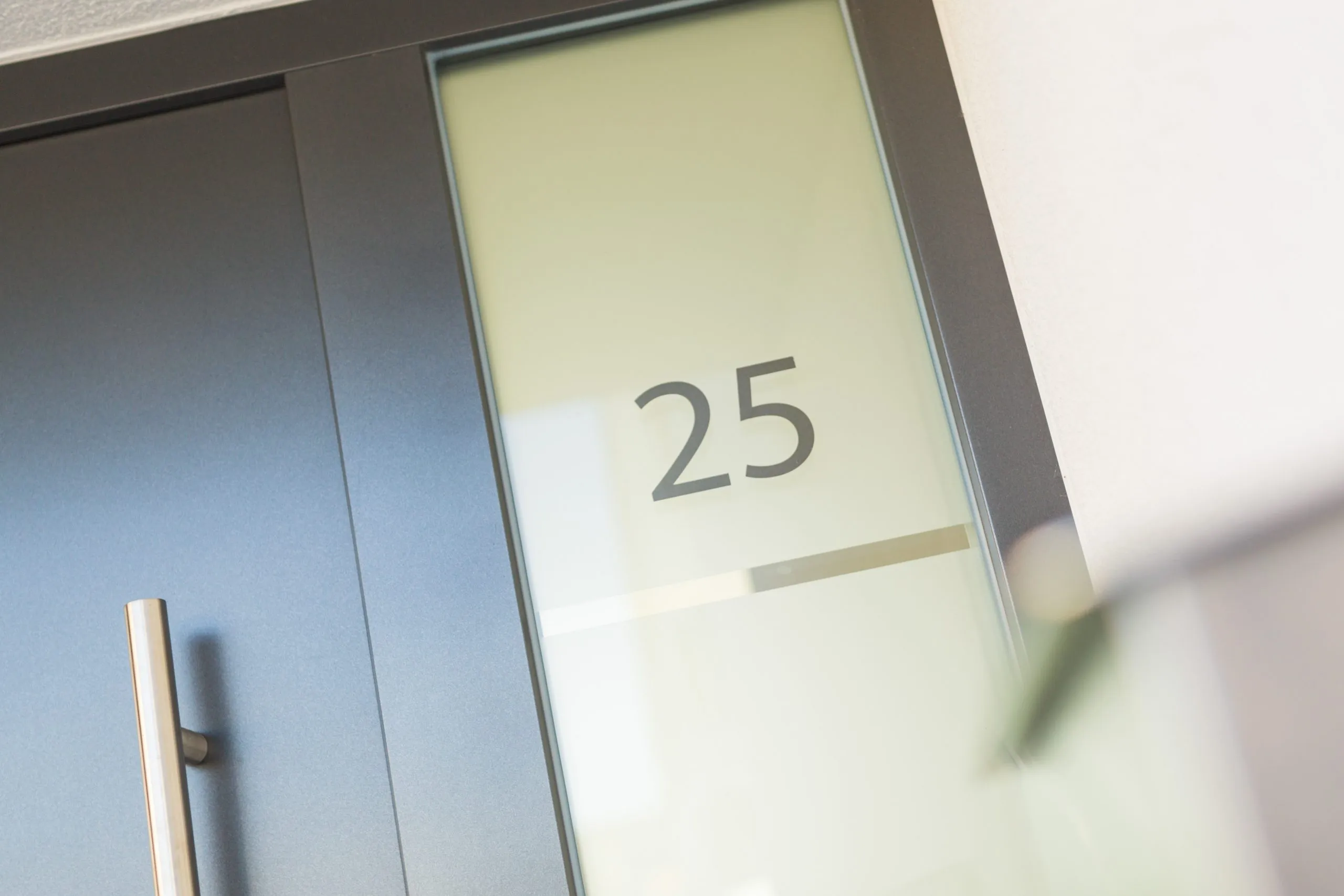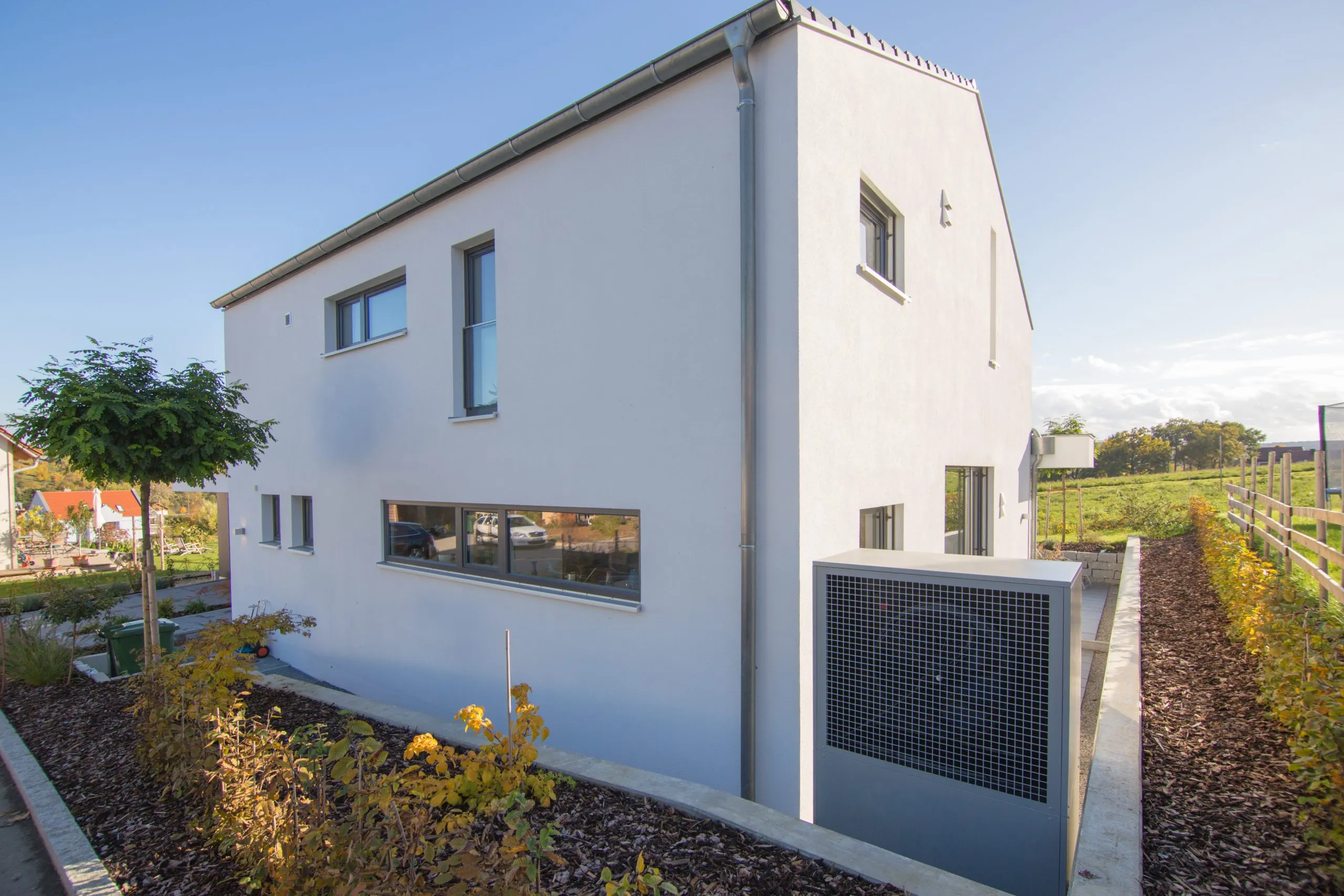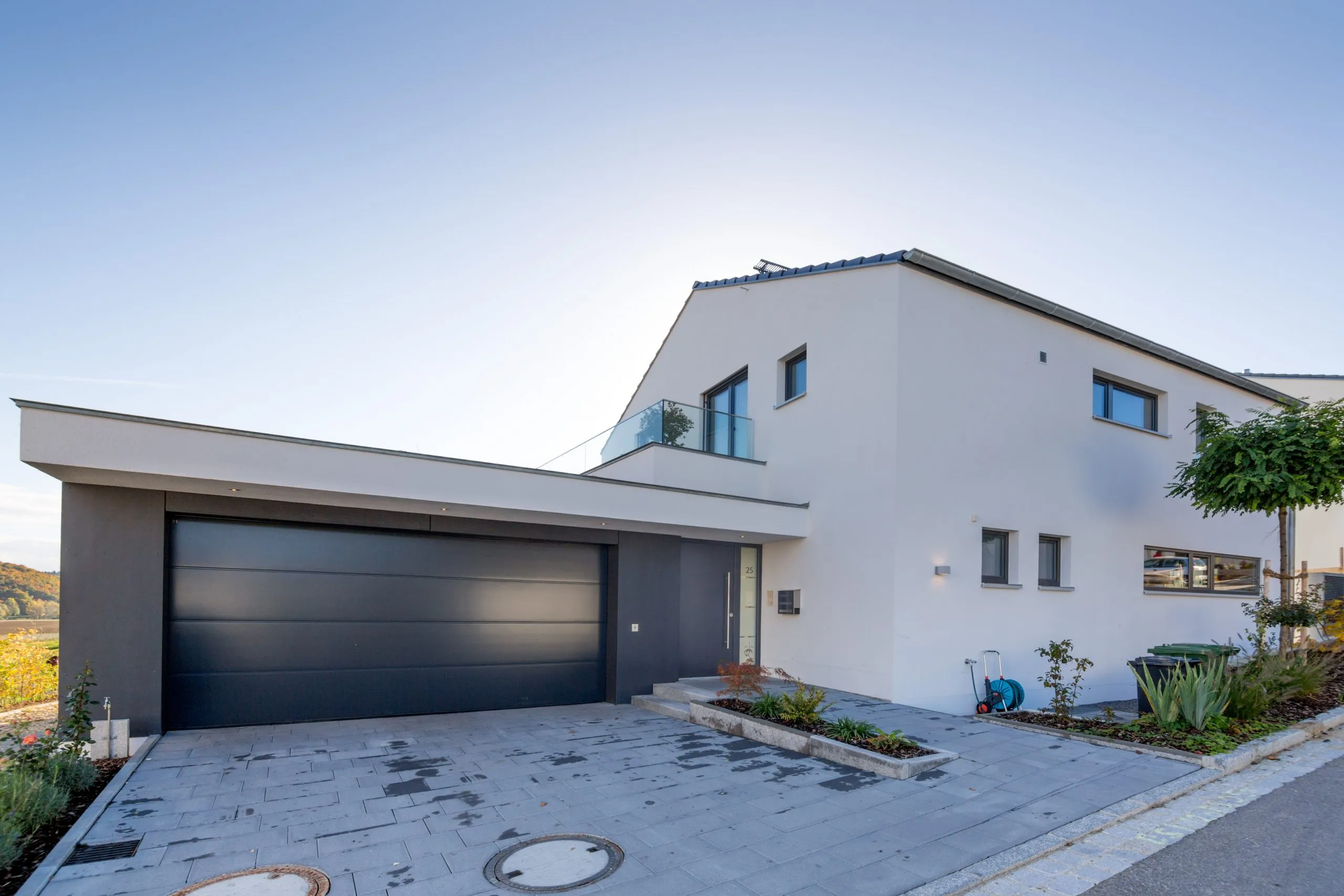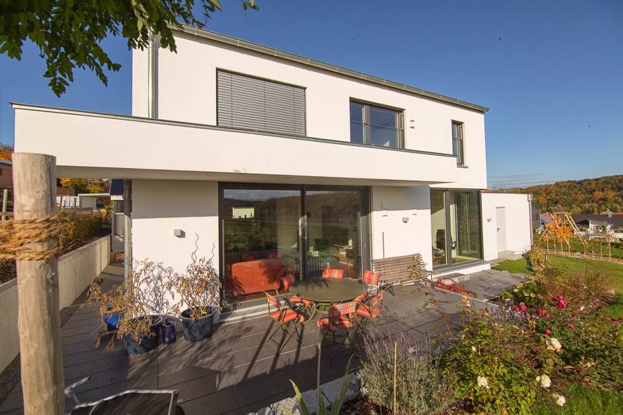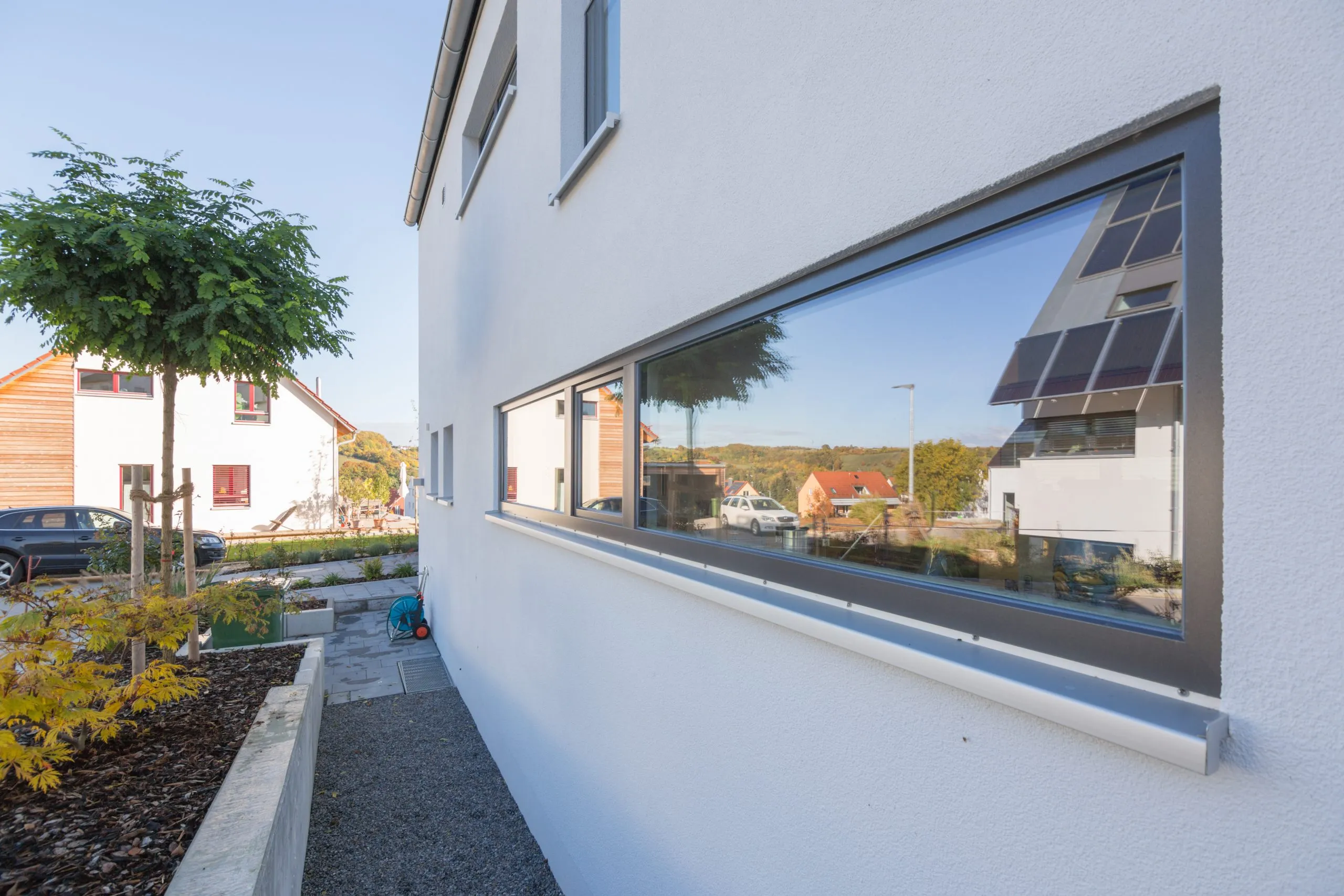 Glasgeländer in Ganzglas, Fassadenplatten am Anbau mit grauen Faserzementplatten