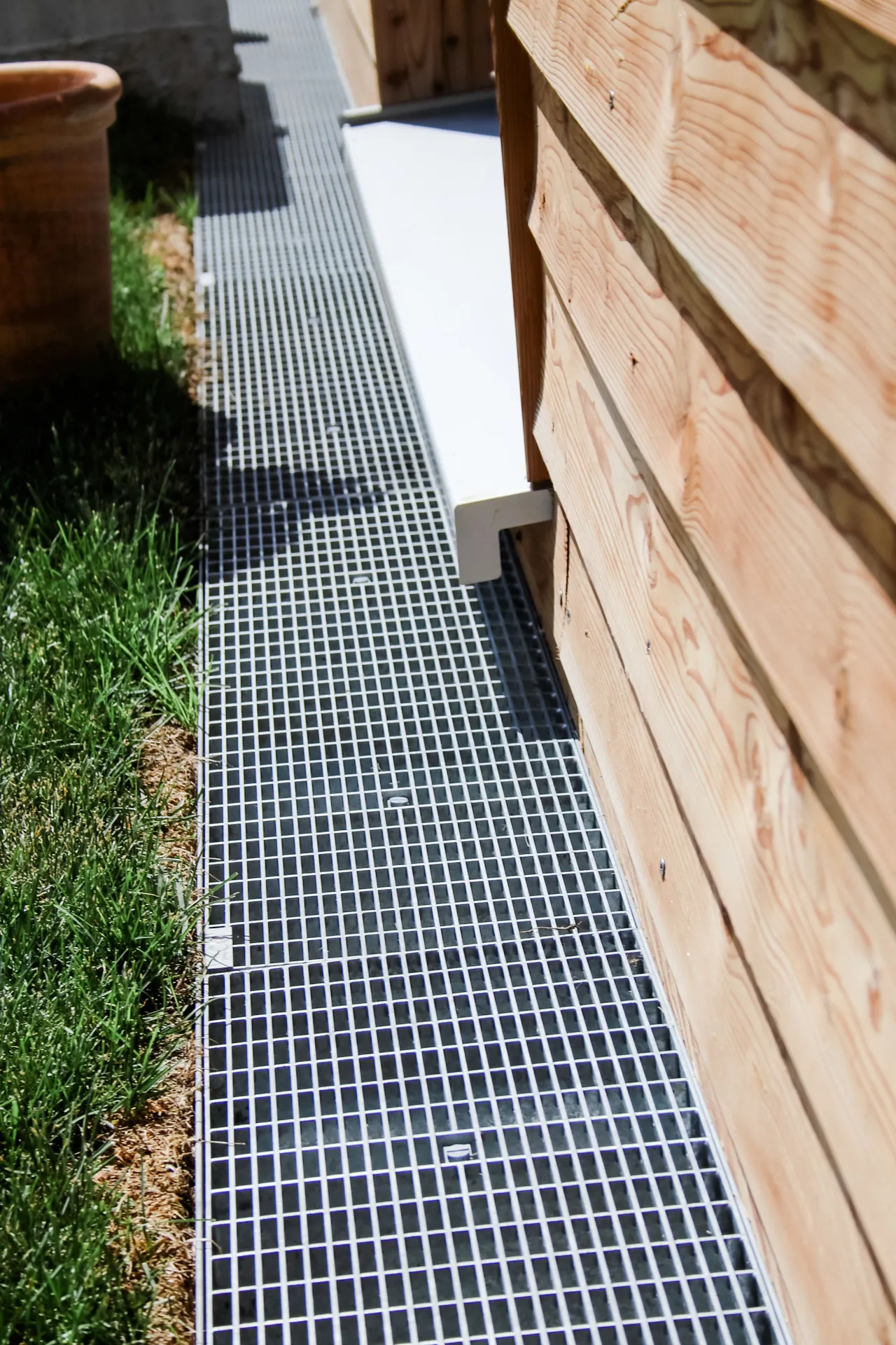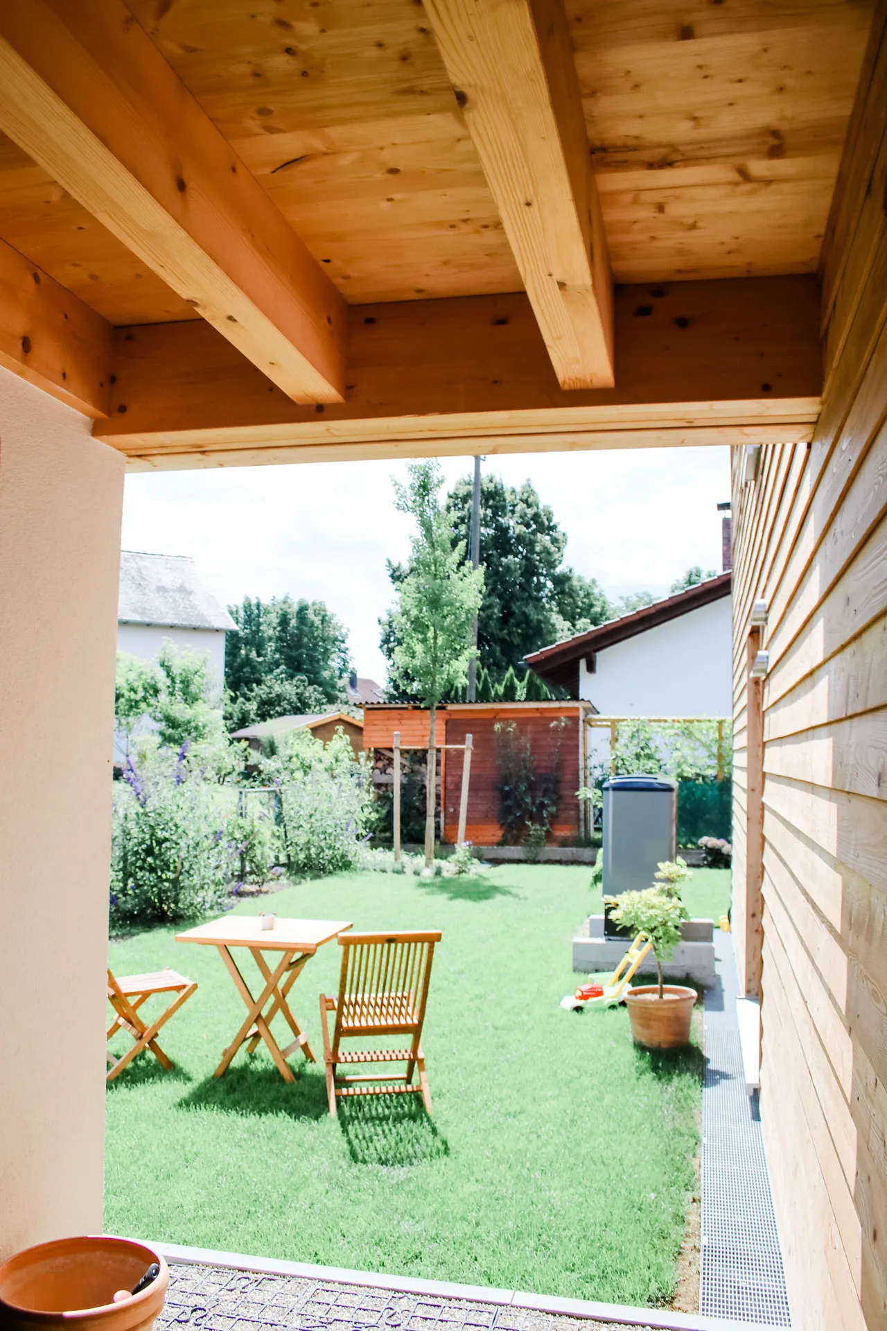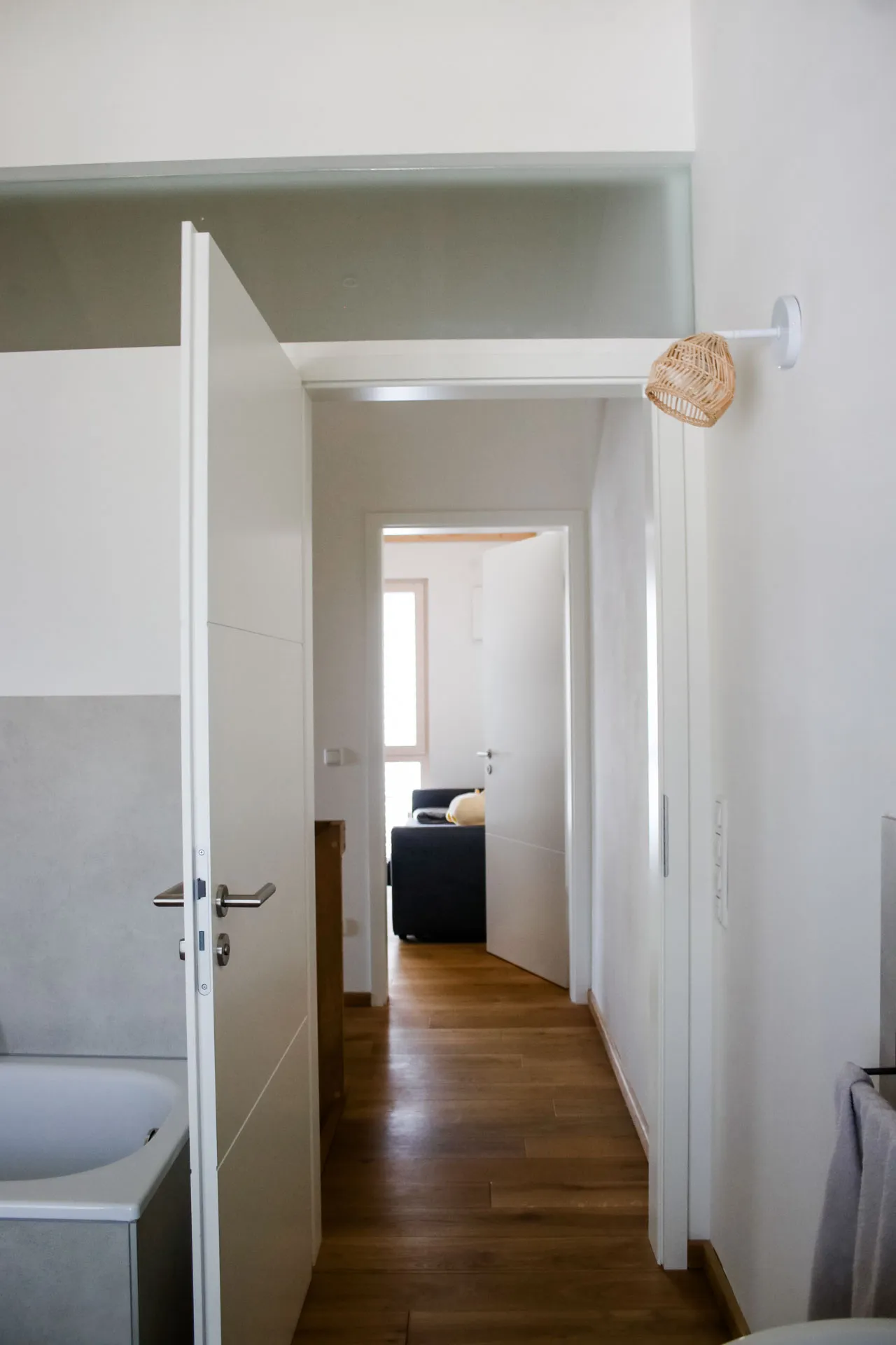 Doppelhaushälfte, Dielenboden im Bad, versteckte Speis unter der Treppe, Fassadenrinne für optimalen Schwellenschutz