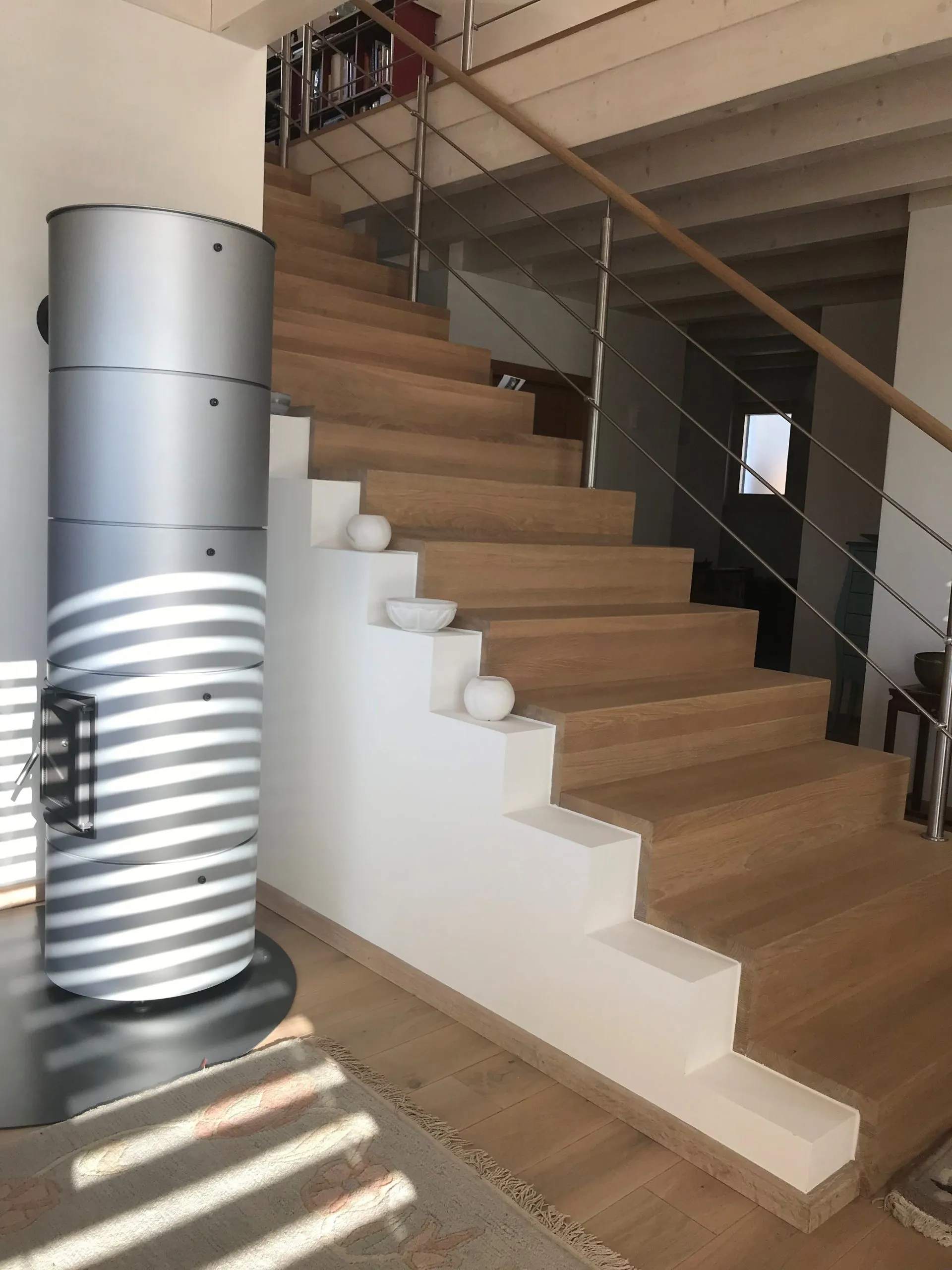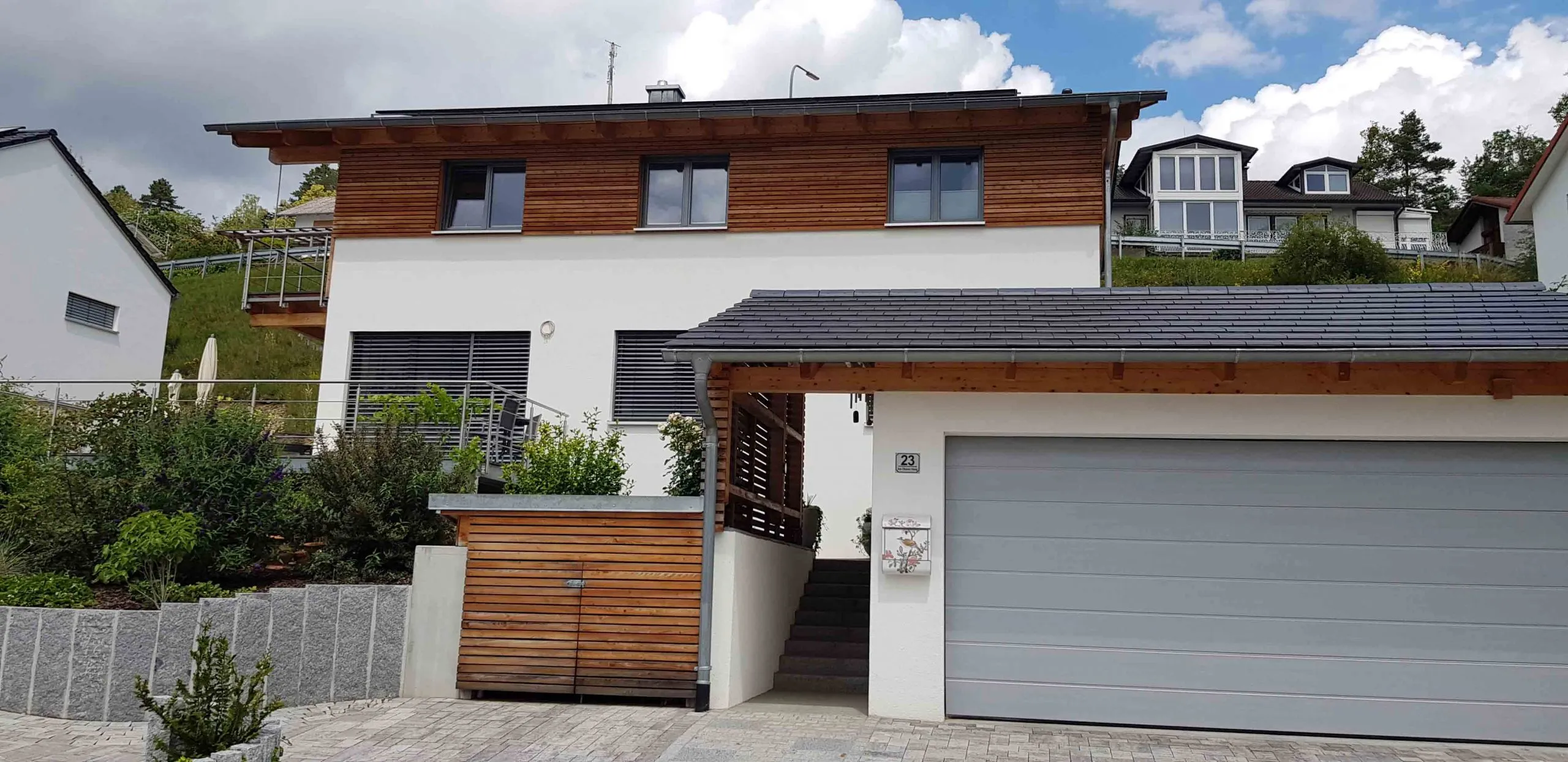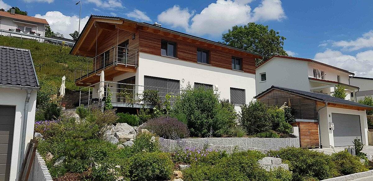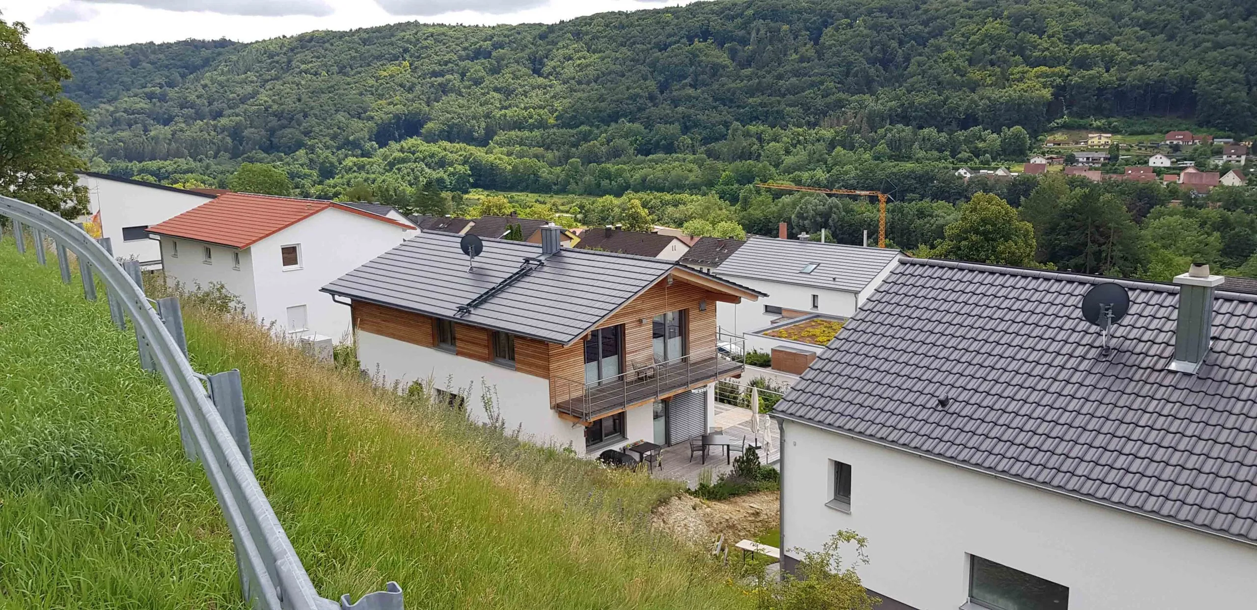 sehr steile Hanglage, großer Dachüberstand, Praxisräume im Kellergeschoss, Kellerdecke als sichtbare Holzbalkendecke