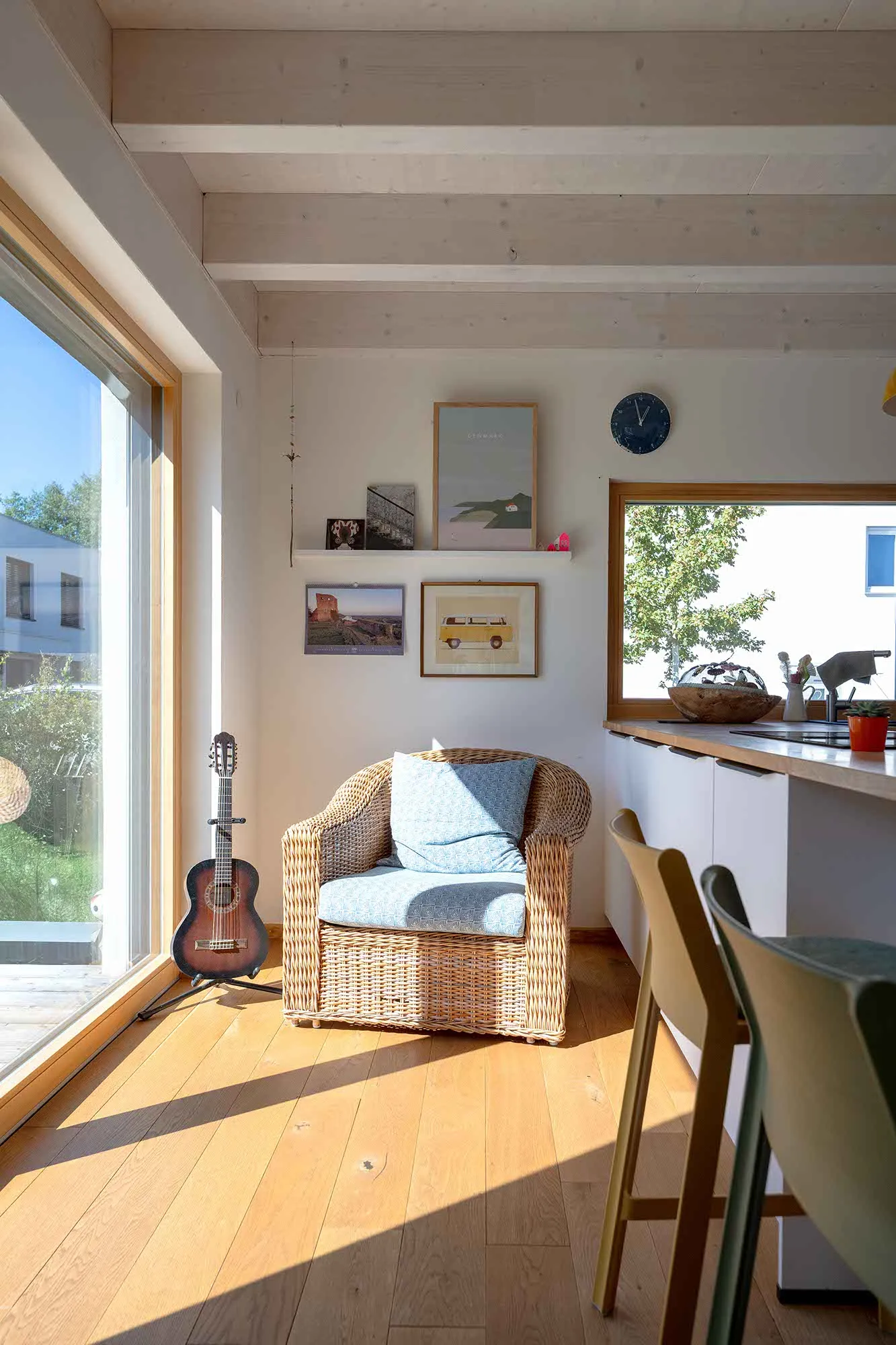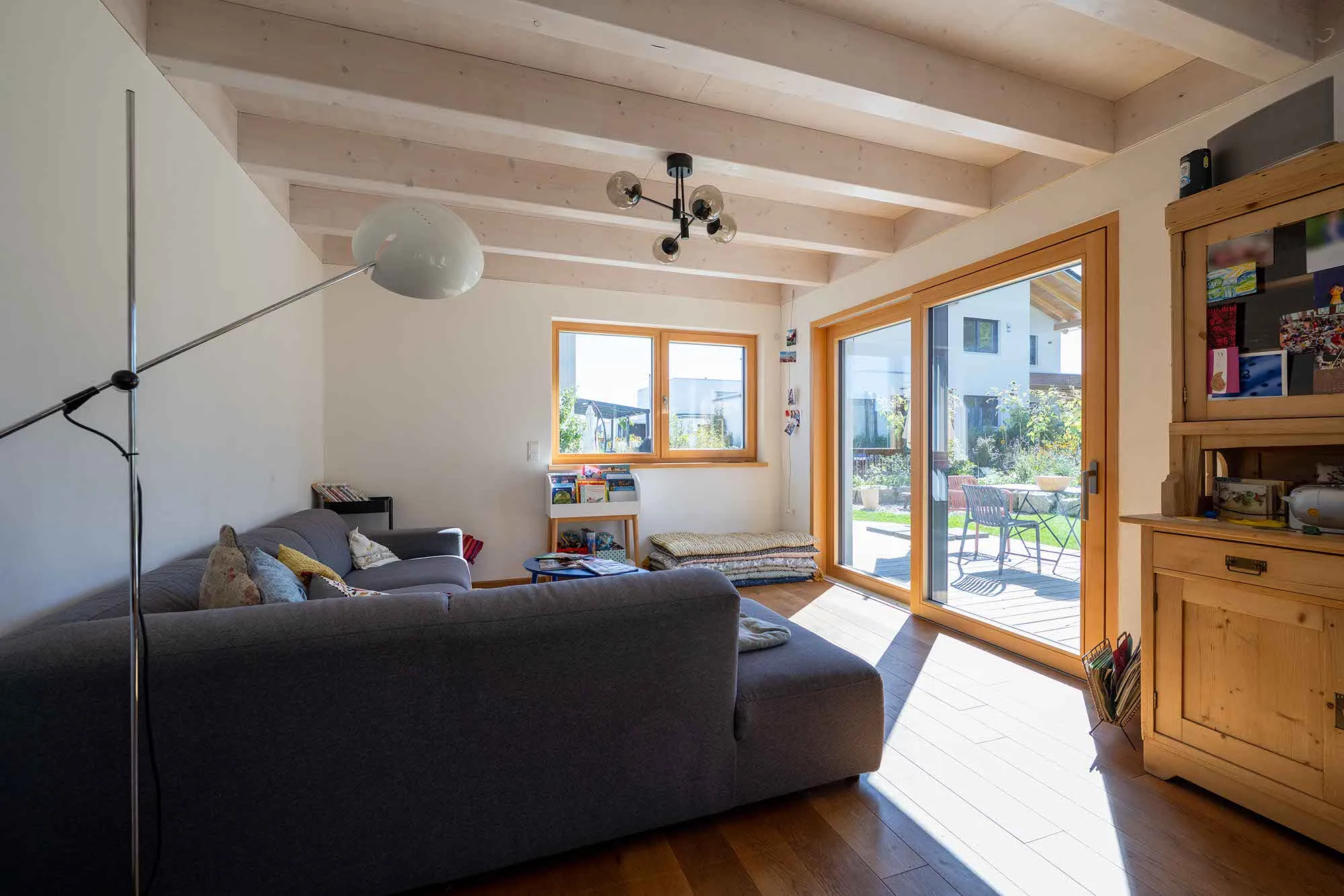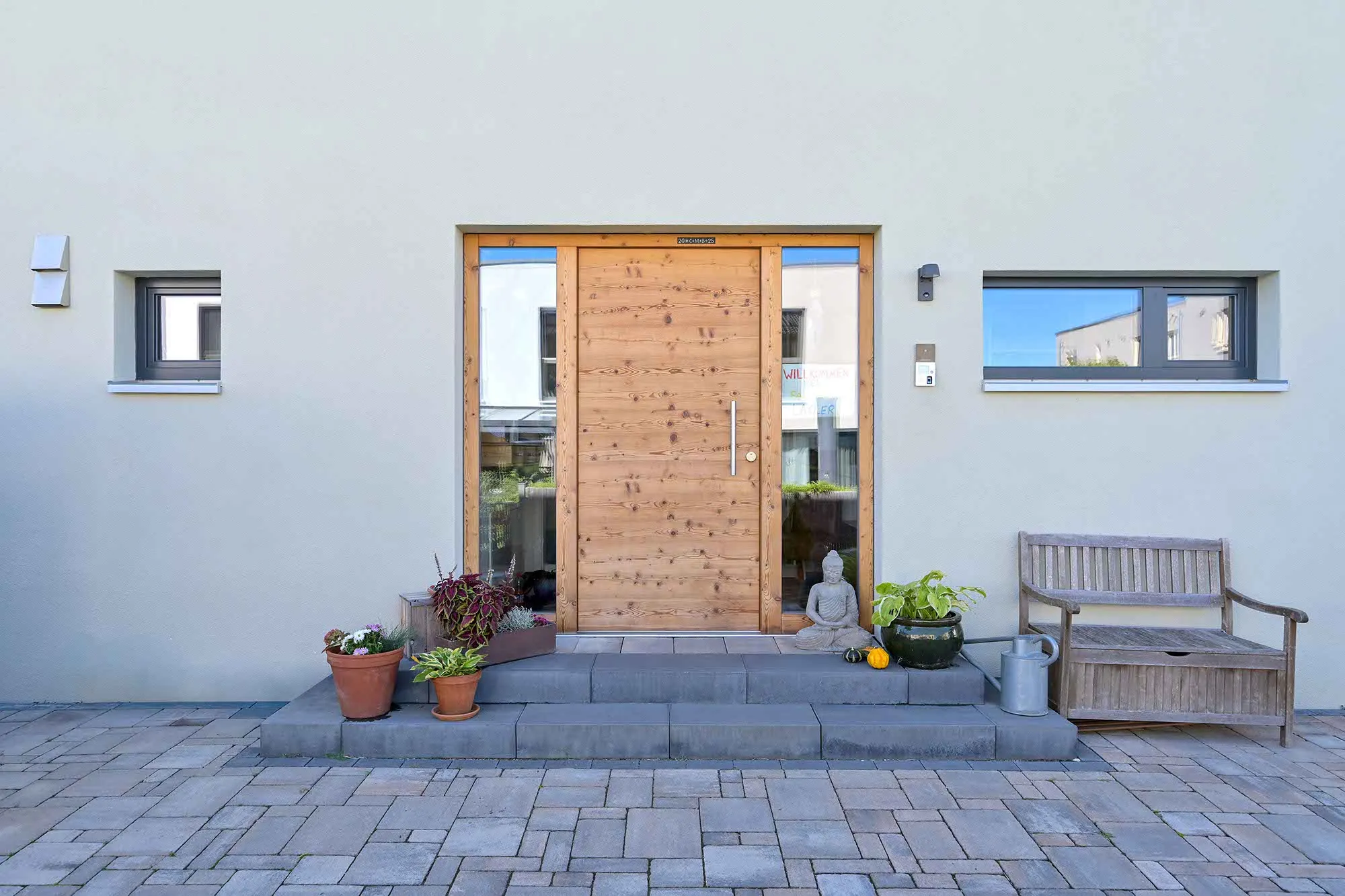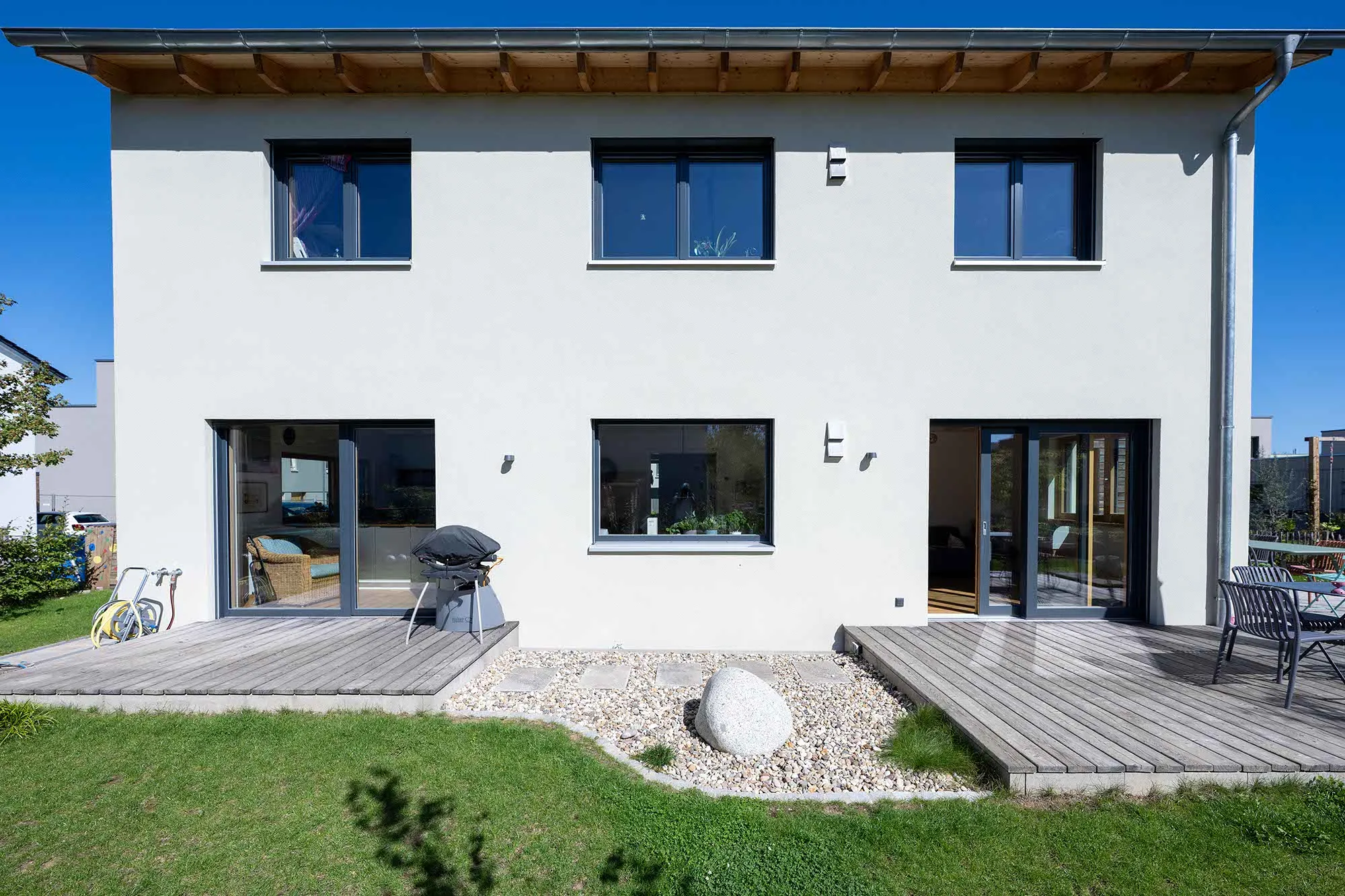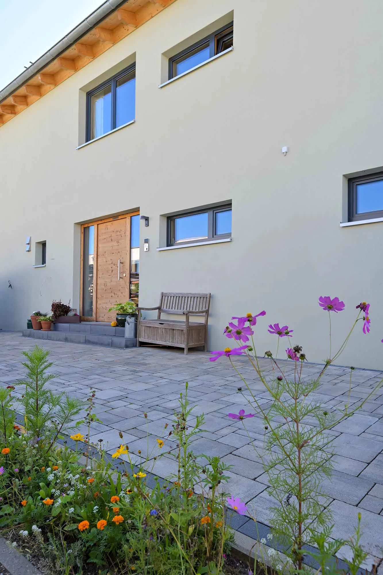 Einliegerwohnung im Erdgeschoss, Dreh-Kipp-Fenster mit untenliegender Festverglasung (OG), optische Auflockerung durch Anbau mit Stülpschalung