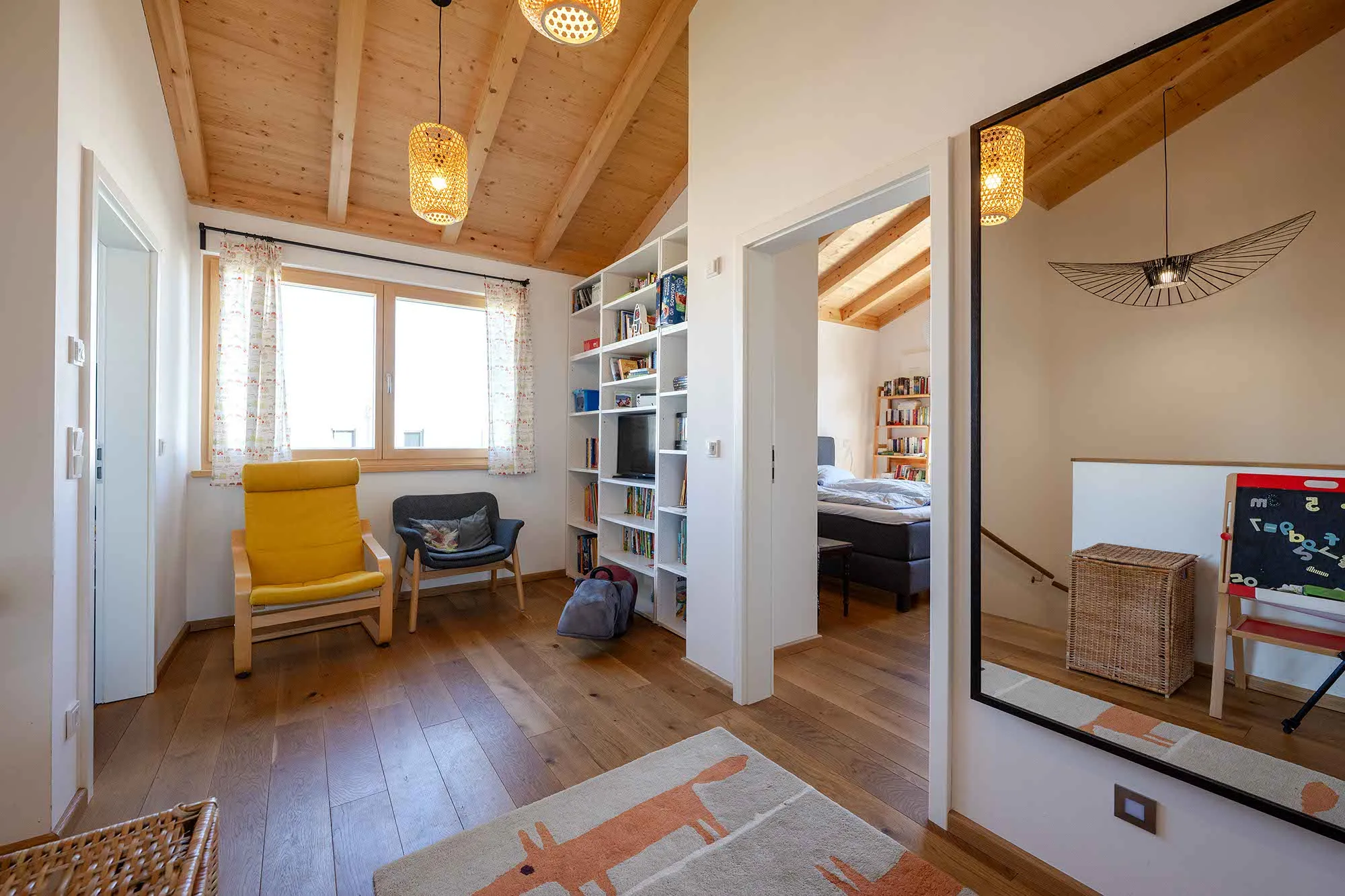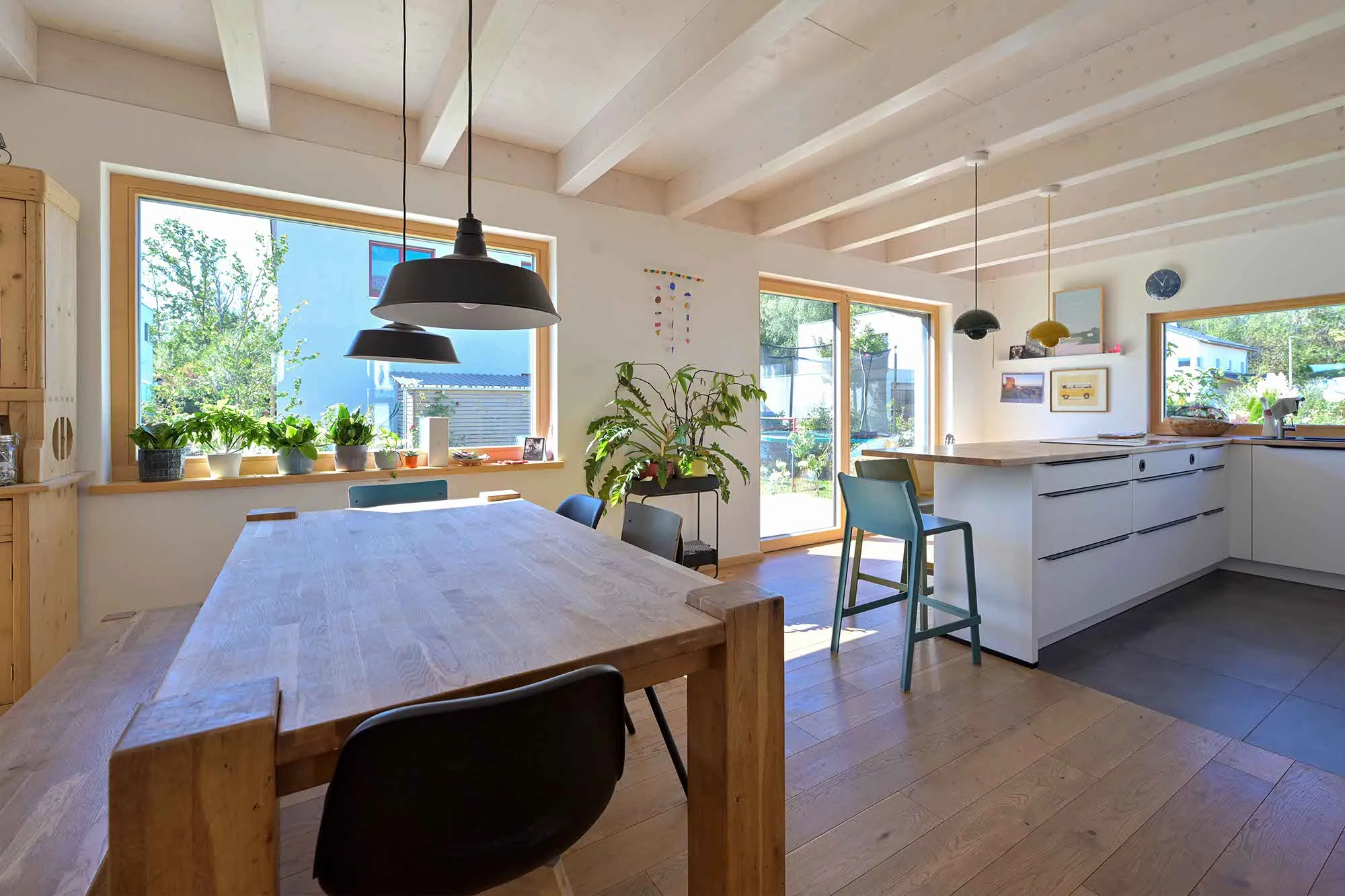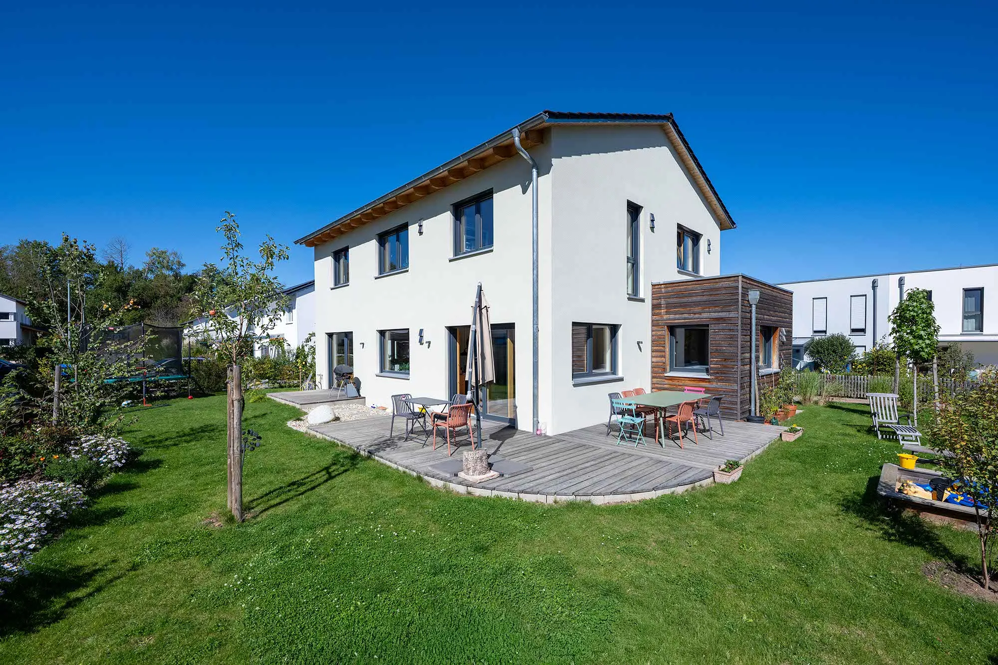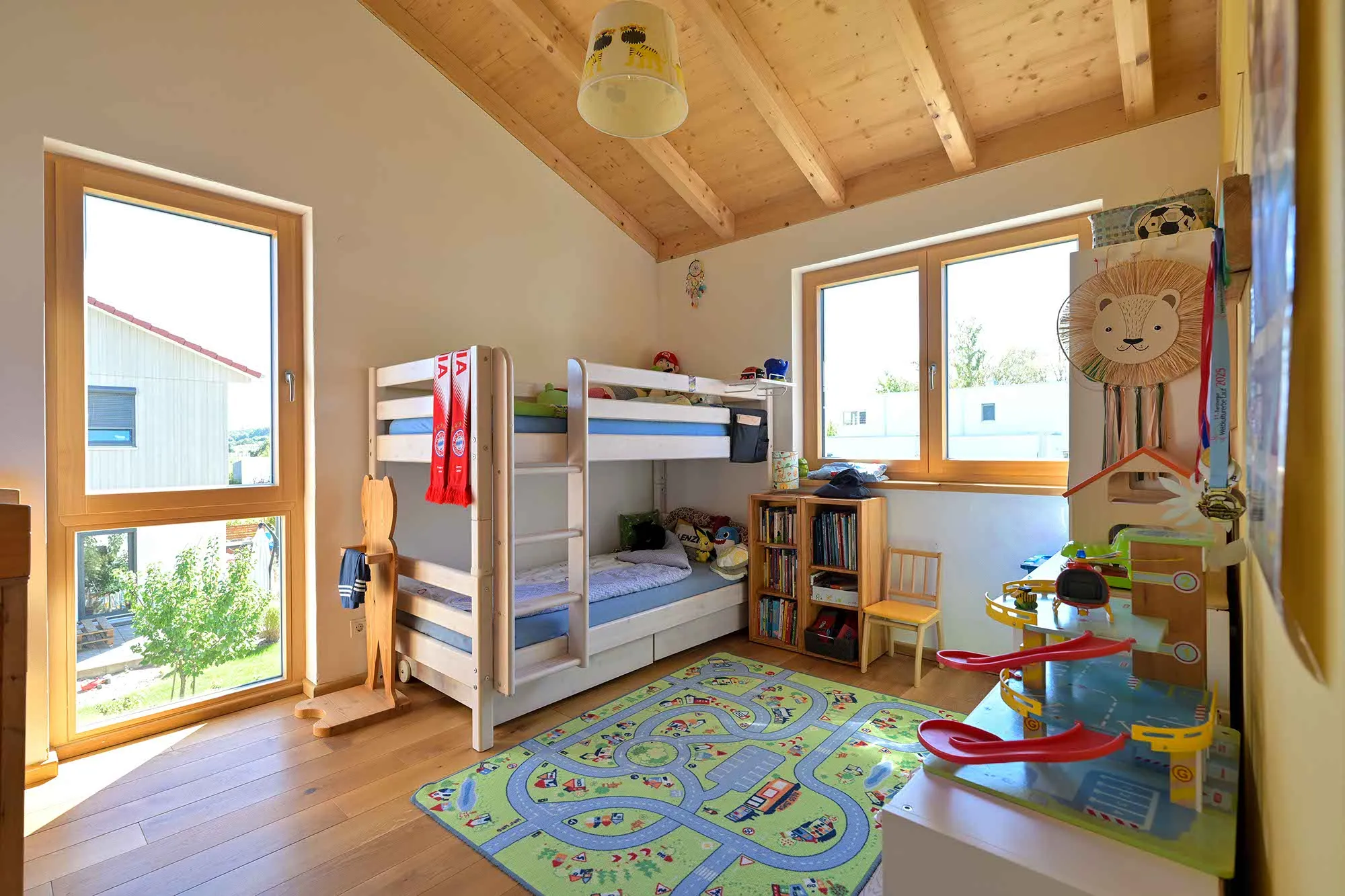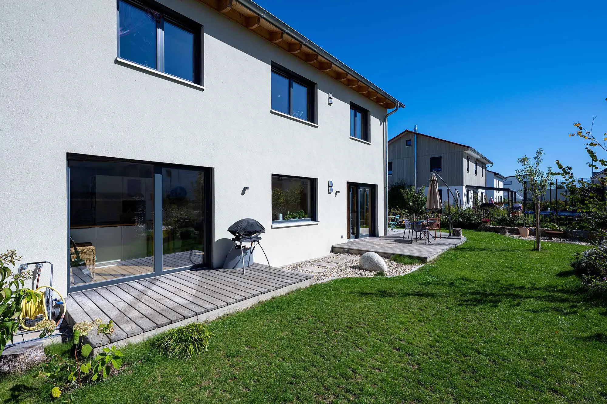 Einliegerwohnung im Erdgeschoss, Dreh-Kipp-Fenster mit untenliegender Festverglasung (OG), optische Auflockerung durch Anbau mit Stülpschalung