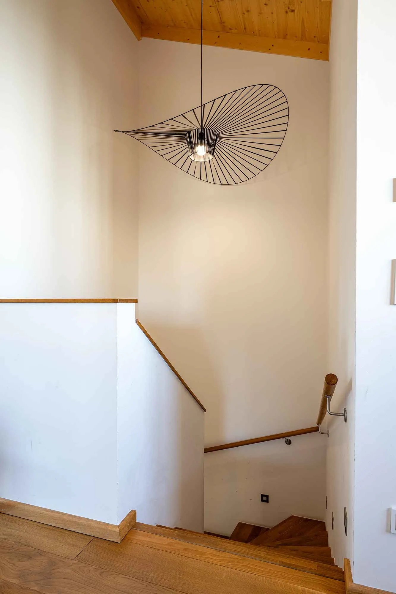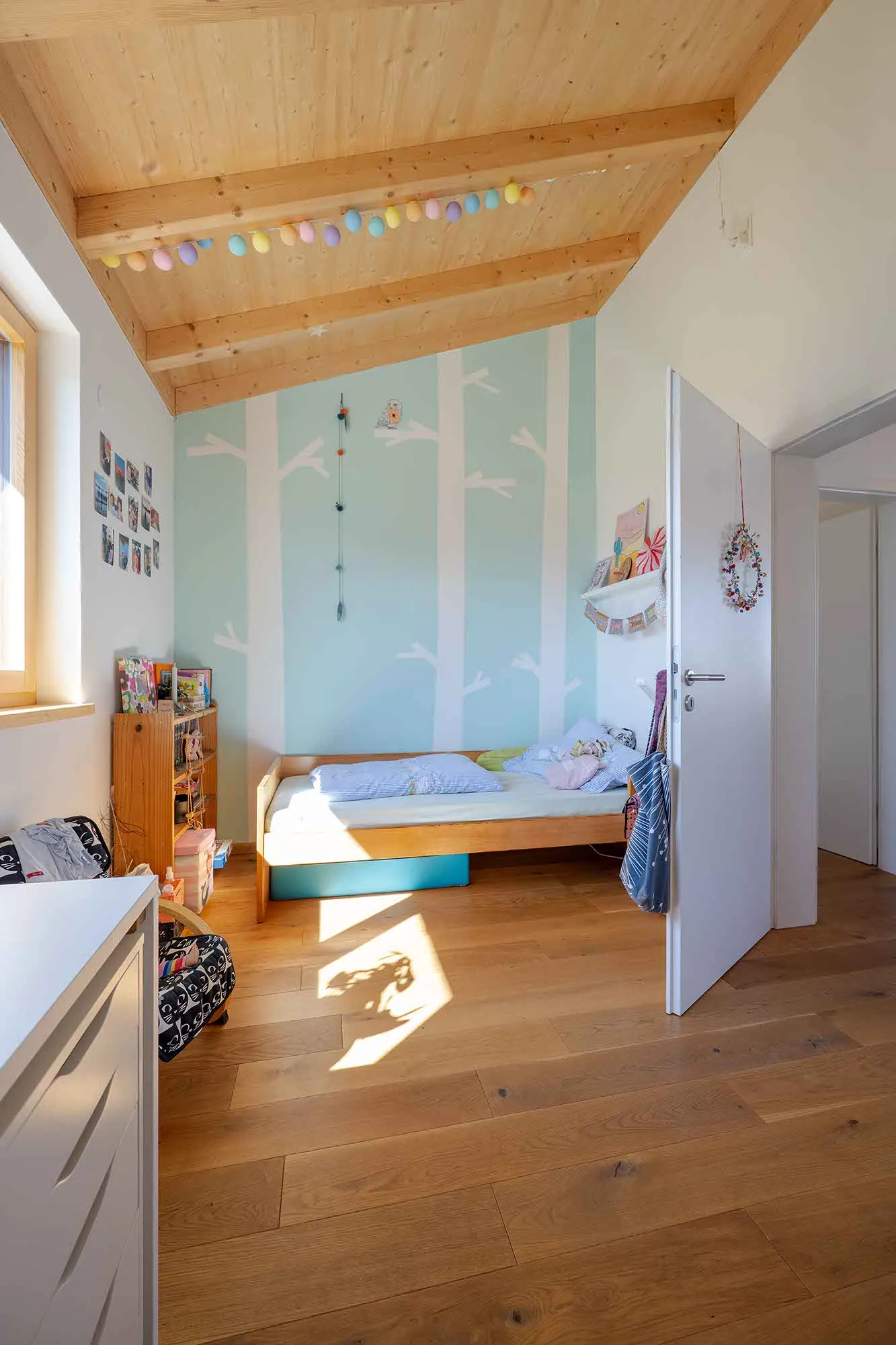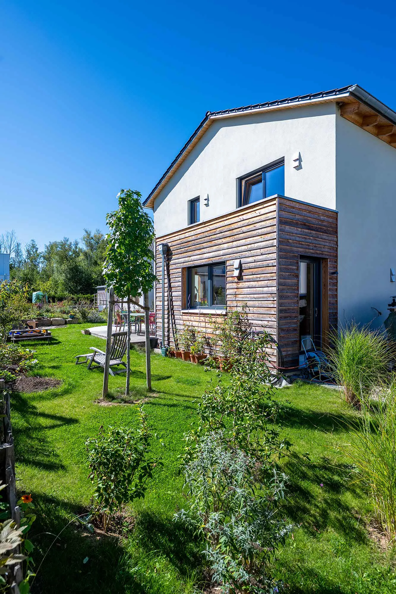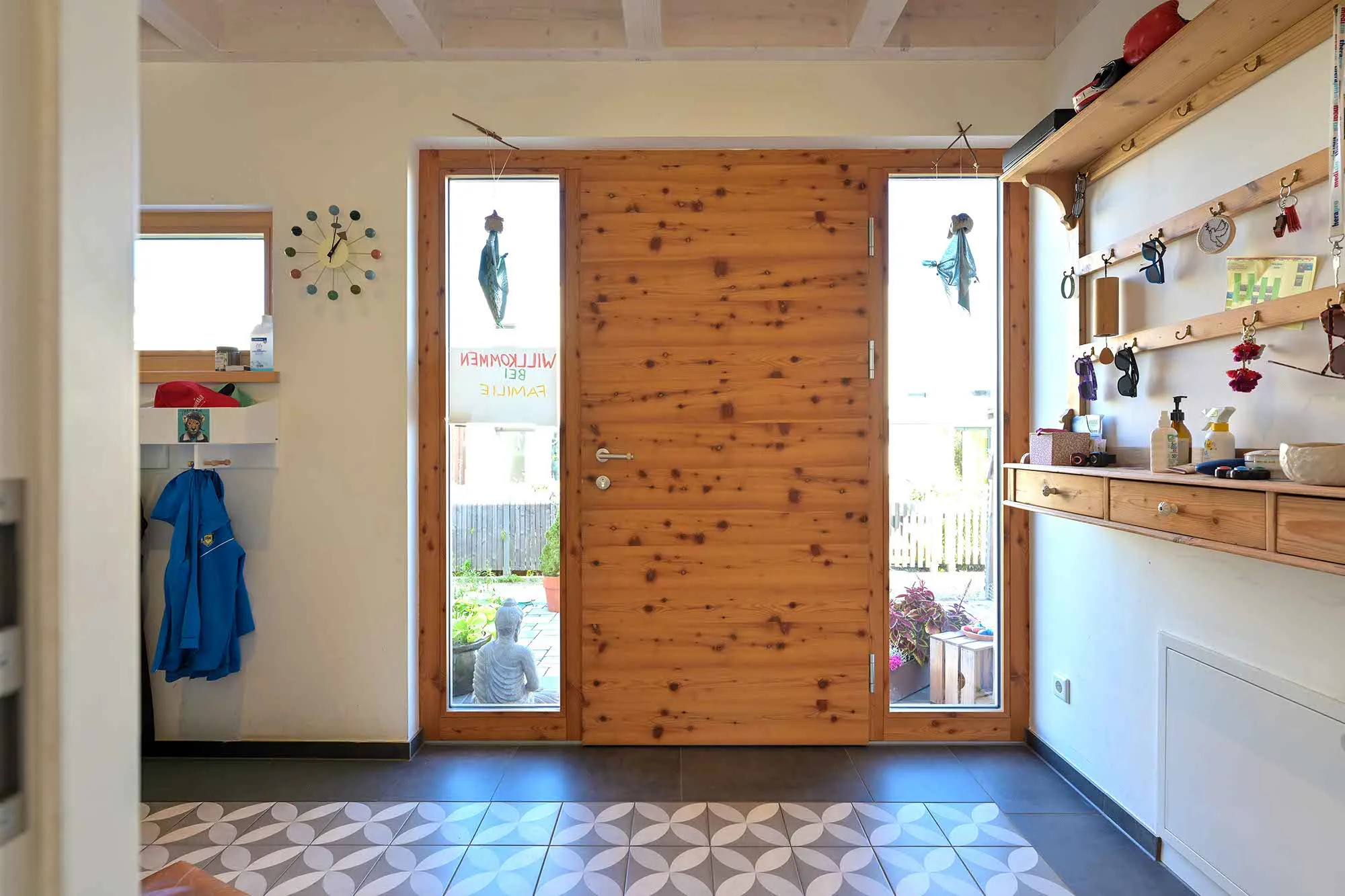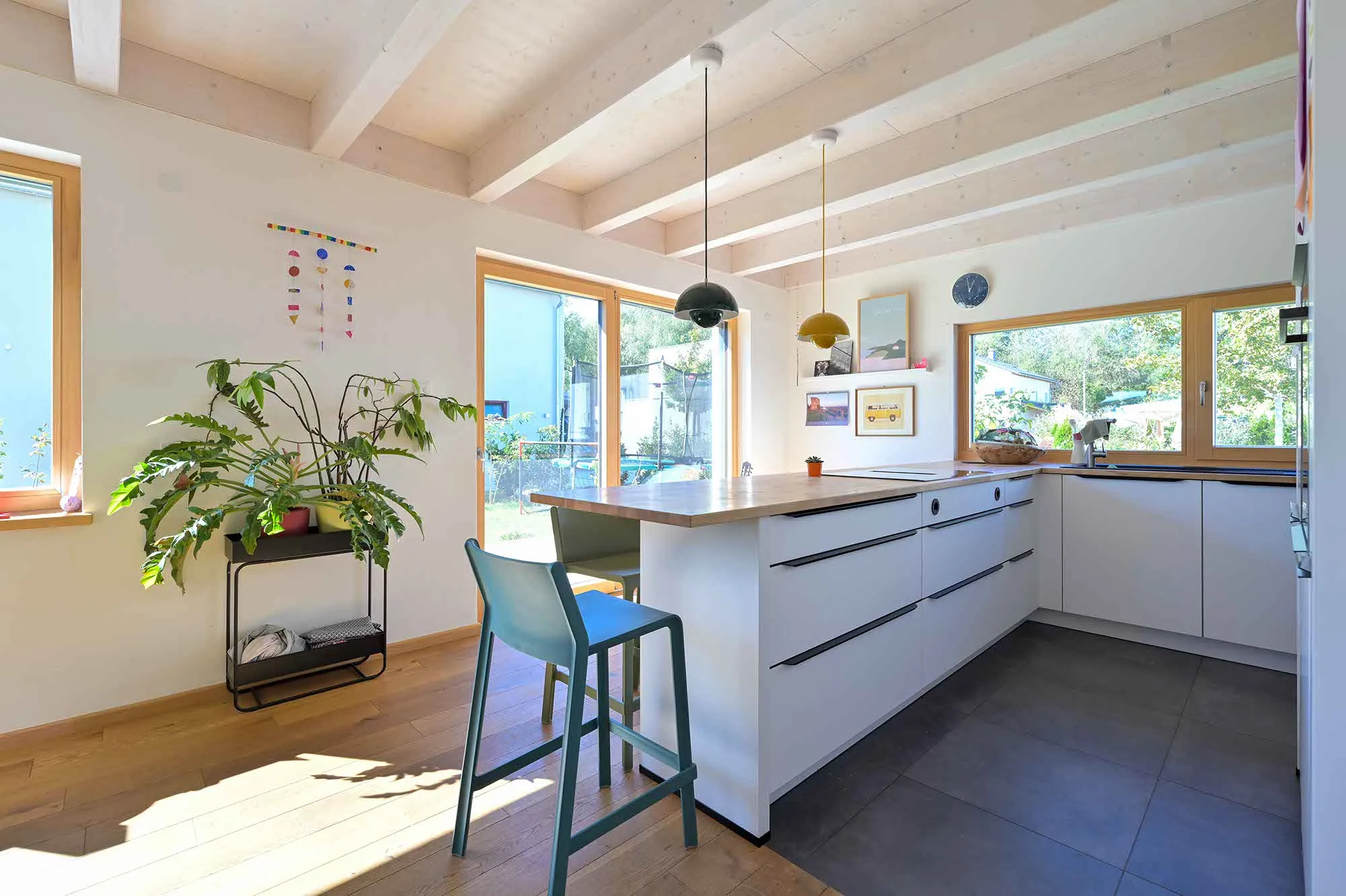Einliegerwohnung im Erdgeschoss, Dreh-Kipp-Fenster mit untenliegender Festverglasung (OG), optische Auflockerung durch Anbau mit Stülpschalung