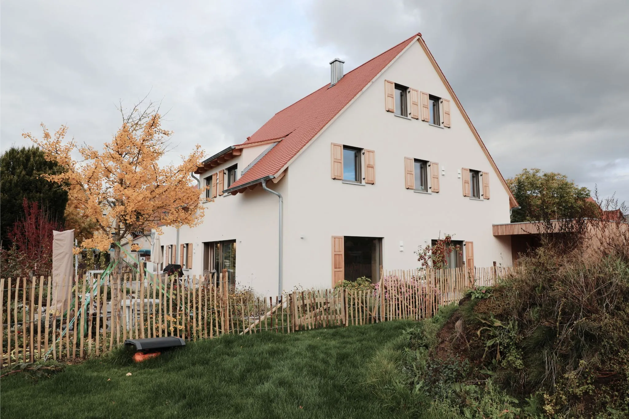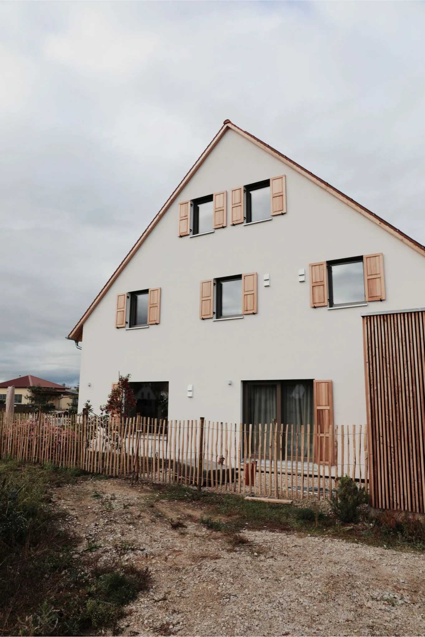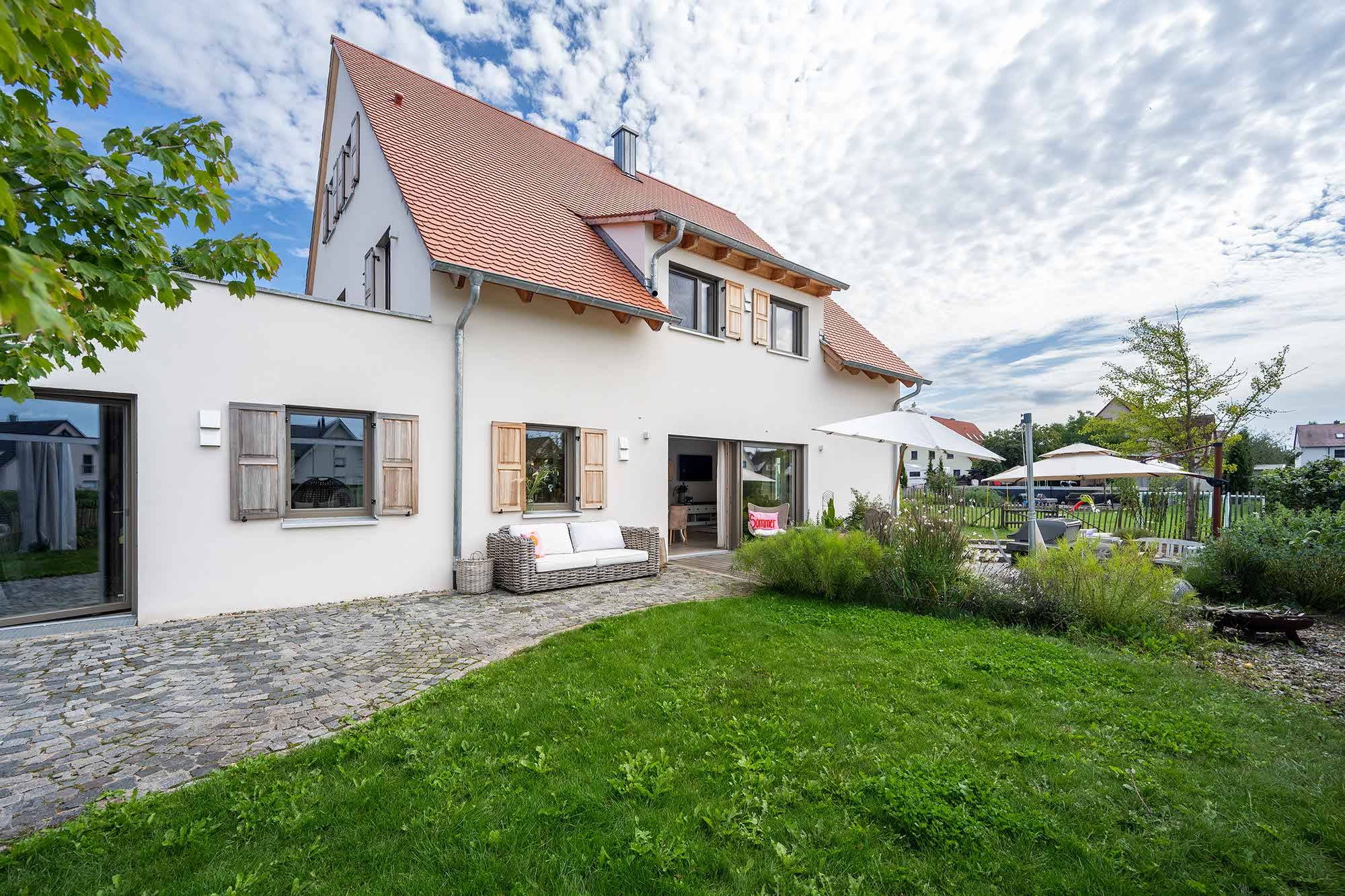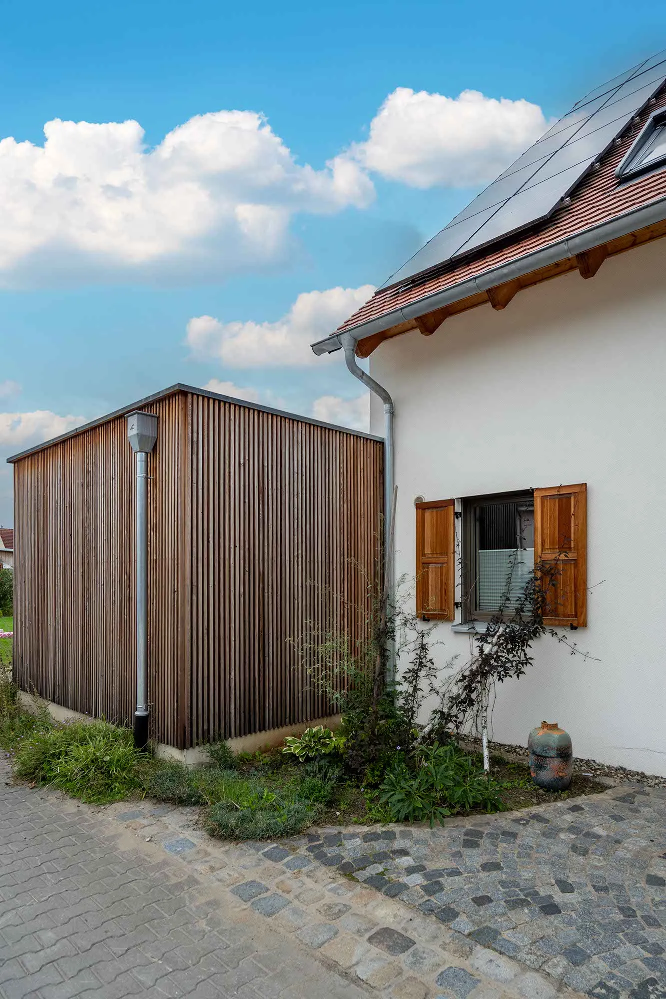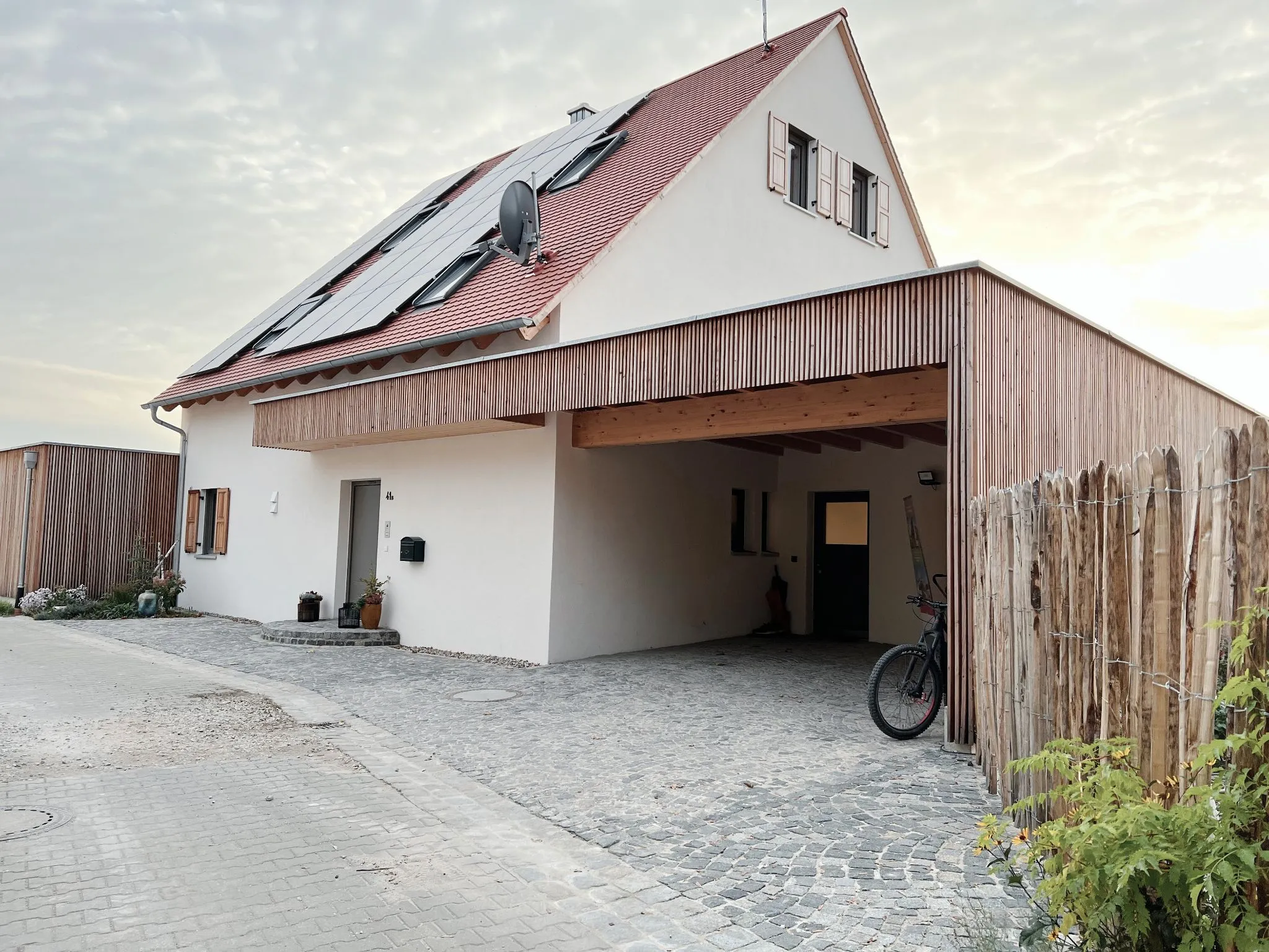 traditionelle, fränkische Bauweise mit Schleppgaube und Fensterläden; versteckter Durchgang in der Küchenfront zur Speisekammer; große Fliesenformate in Marmor-Optik; Mix aus puristischer Inneneinrichtung mit modernen Landhauselementen; mit Leistenschalung optisch abgesetztes Carport