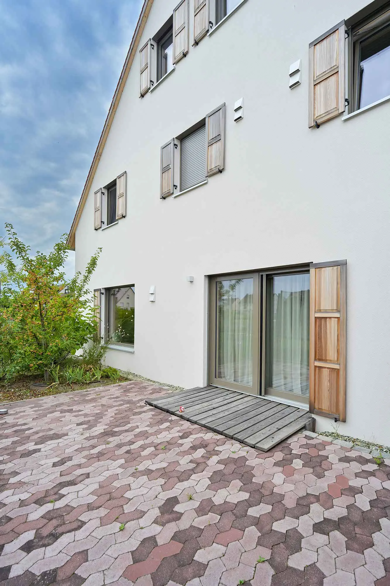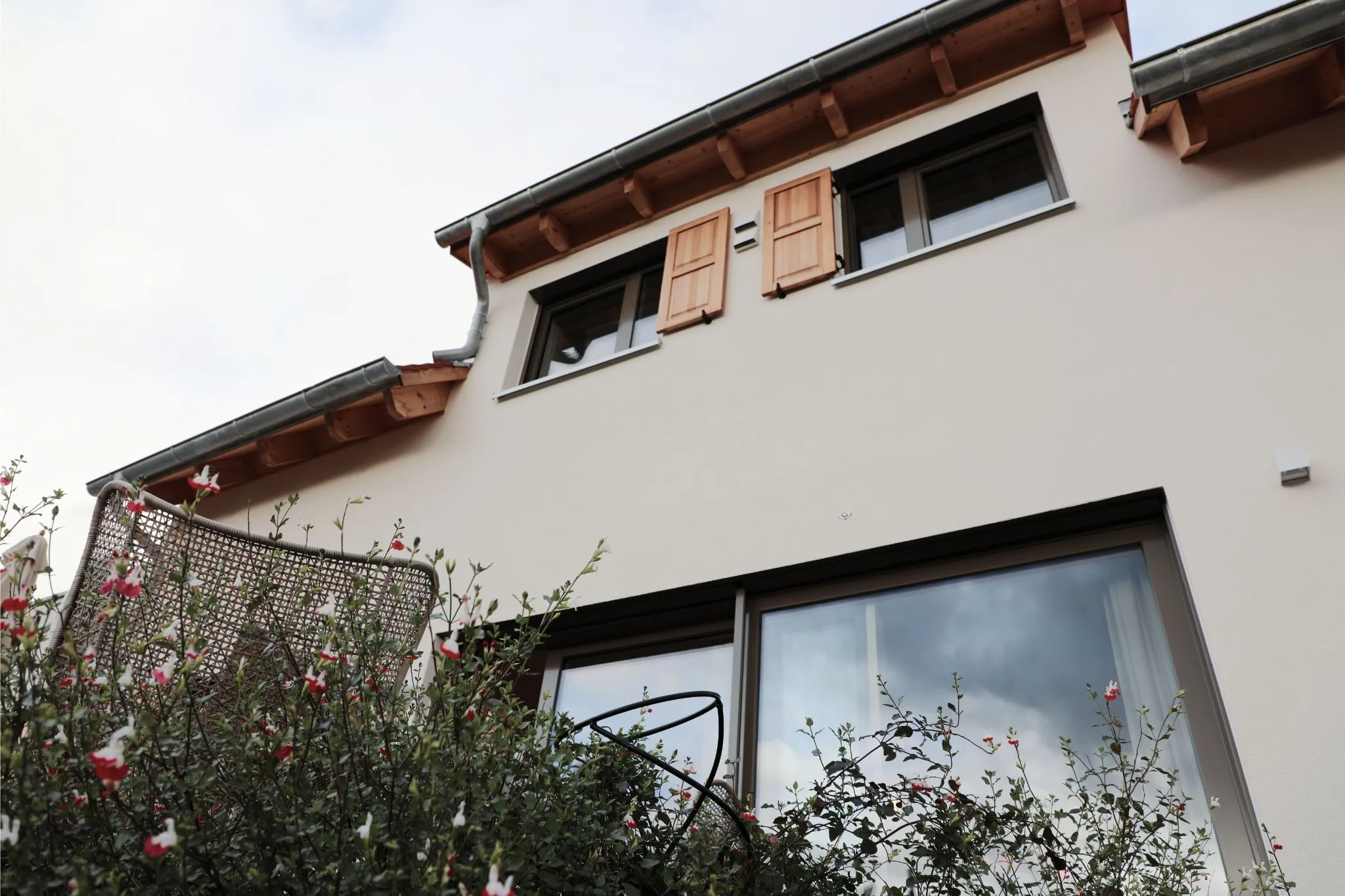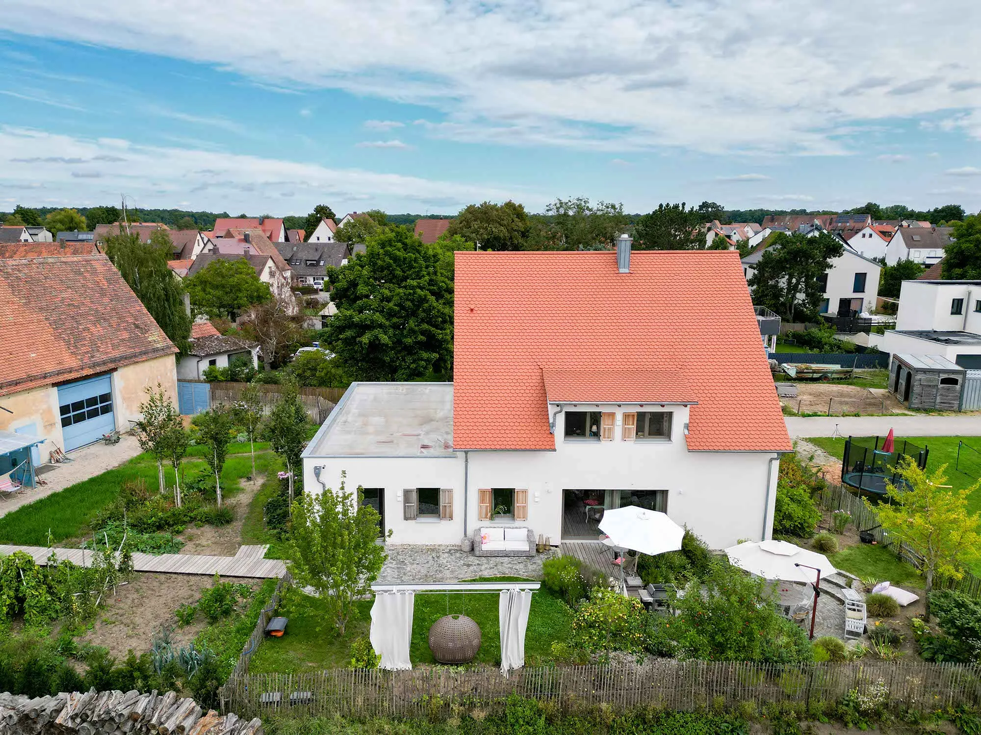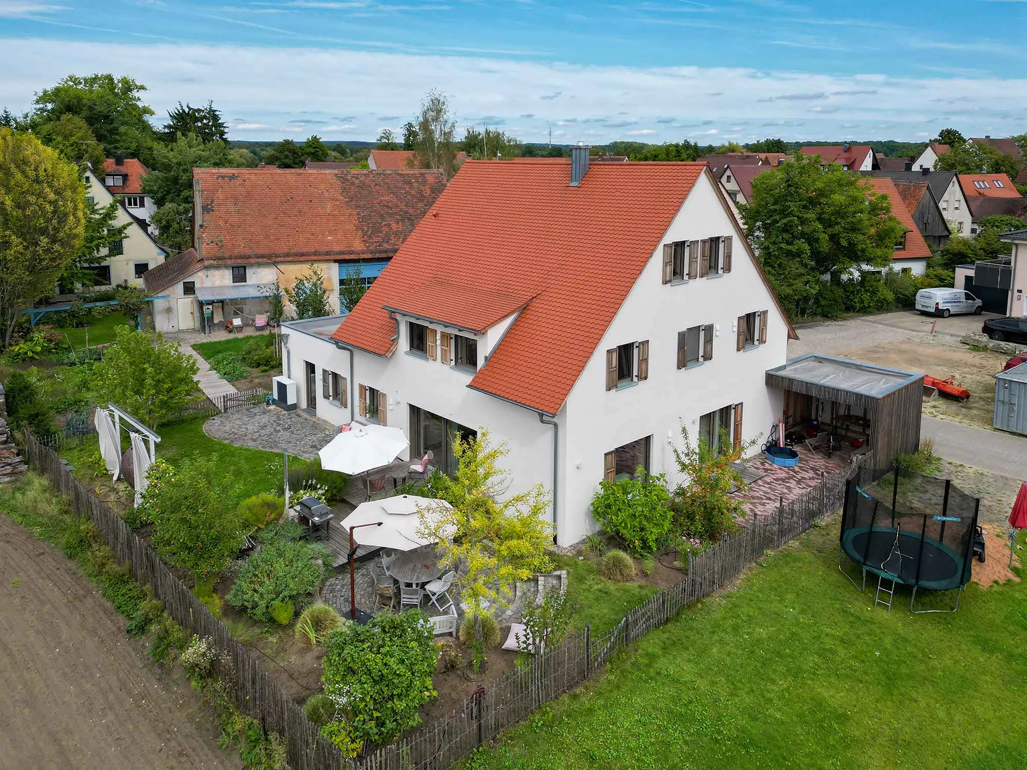 traditionelle, fränkische Bauweise mit Schleppgaube und Fensterläden; versteckter Durchgang in der Küchenfront zur Speisekammer; große Fliesenformate in Marmor-Optik; Mix aus puristischer Inneneinrichtung mit modernen Landhauselementen; mit Leistenschalung optisch abgesetztes Carport