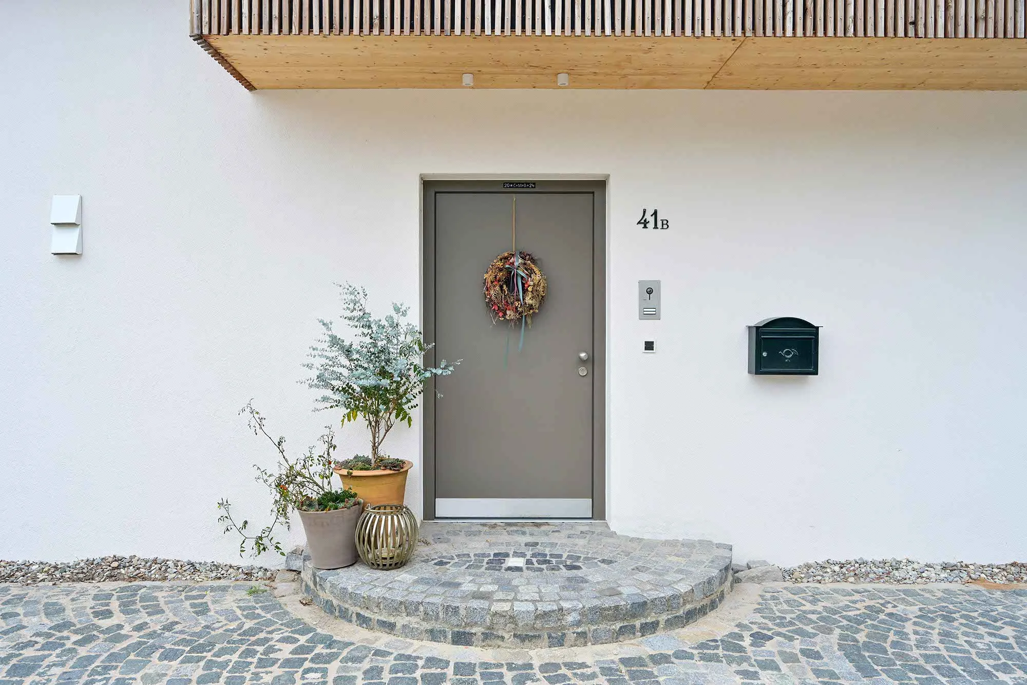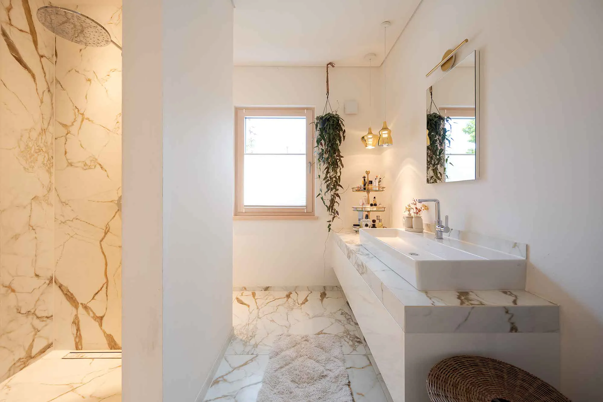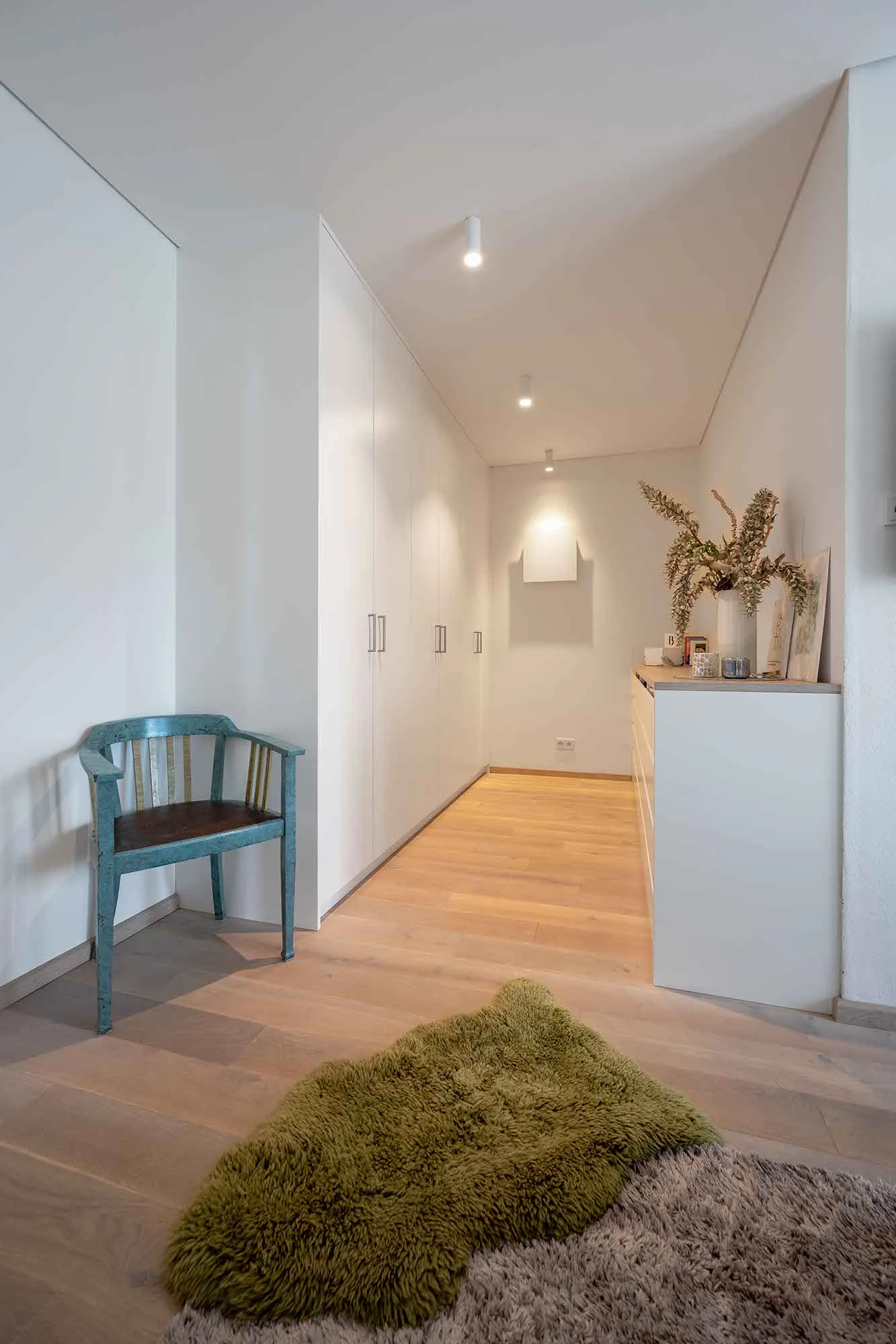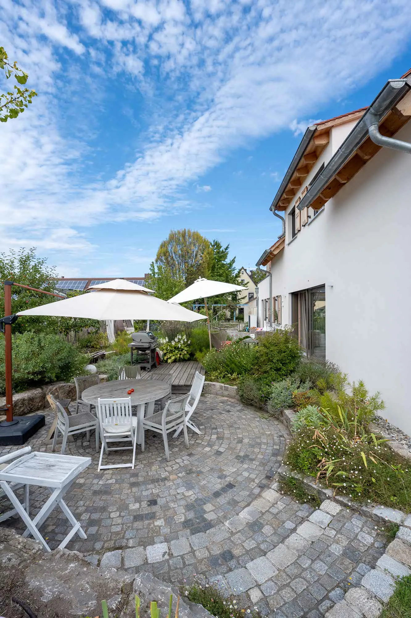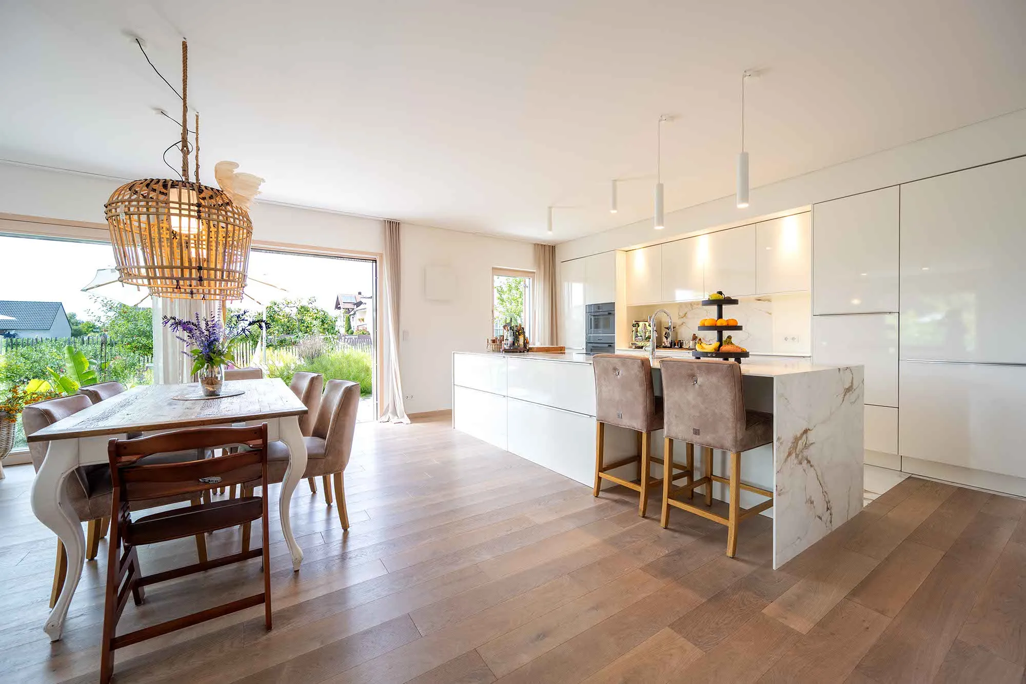traditionelle, fränkische Bauweise mit Schleppgaube und Fensterläden; versteckter Durchgang in der Küchenfront zur Speisekammer; große Fliesenformate in Marmor-Optik; Mix aus puristischer Inneneinrichtung mit modernen Landhauselementen; mit Leistenschalung optisch abgesetztes Carport
