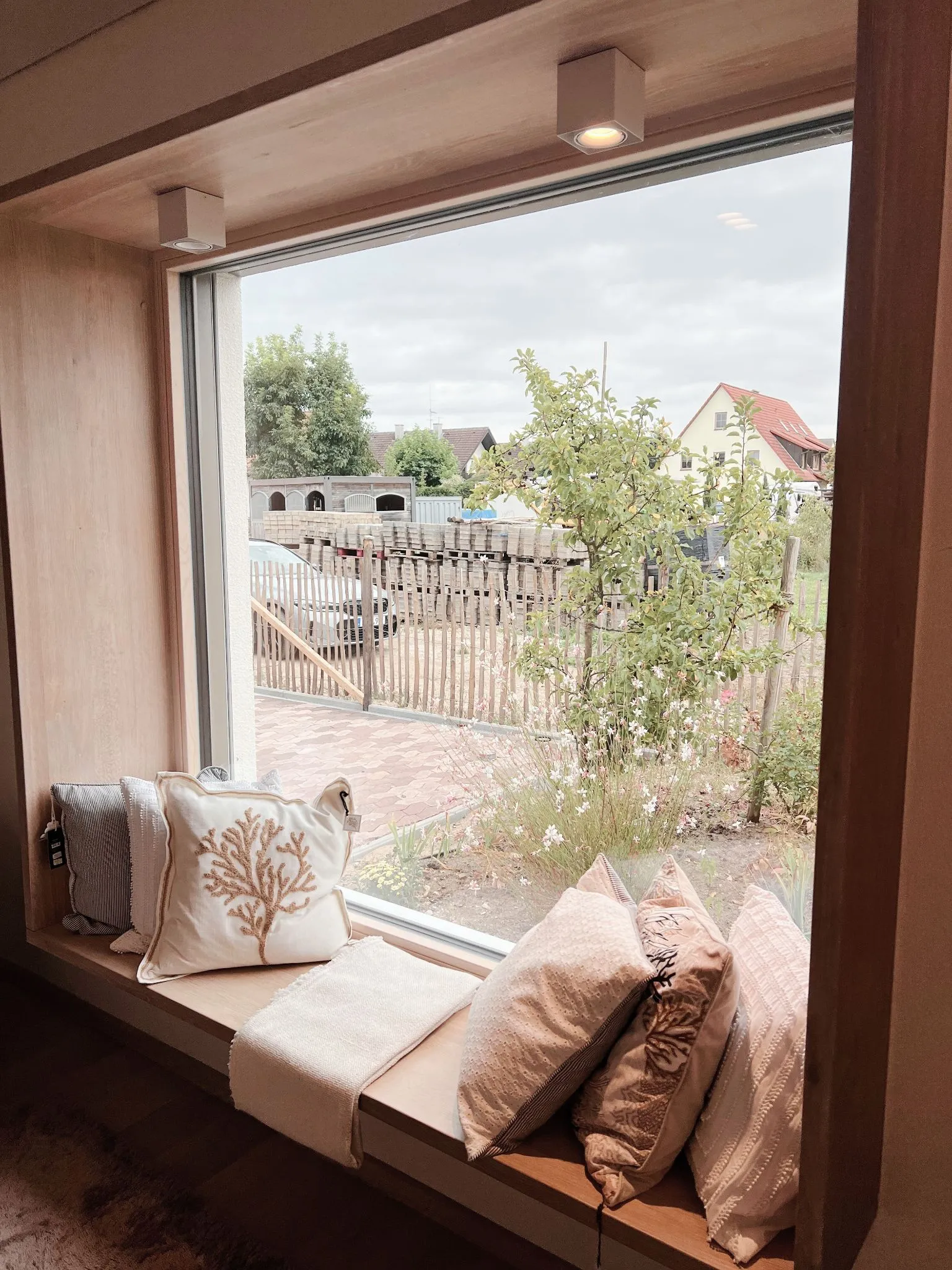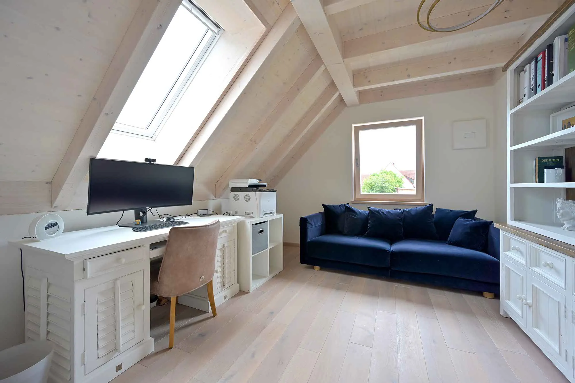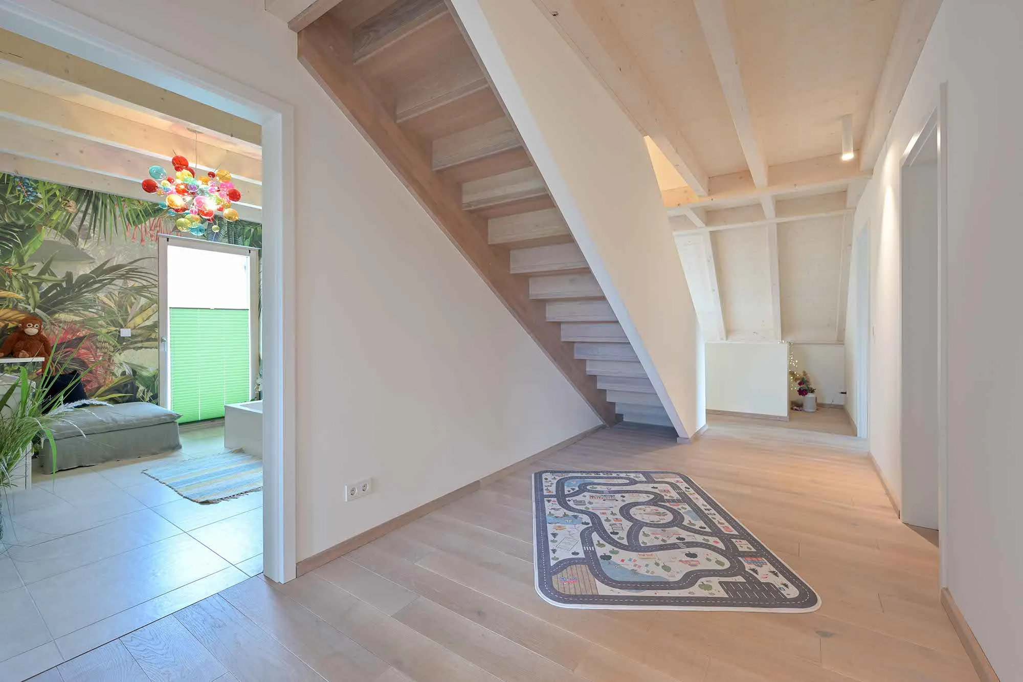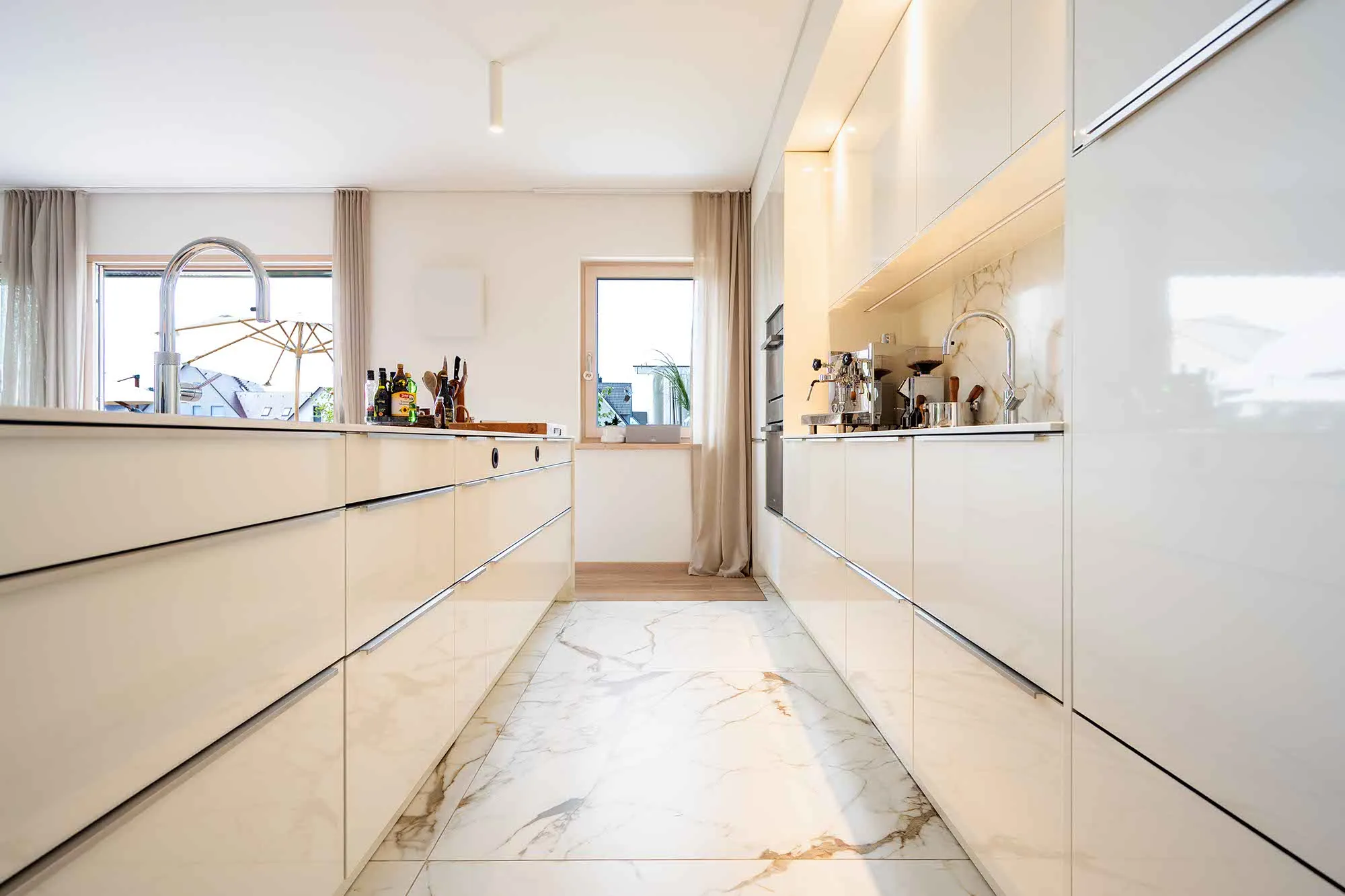 traditionelle, fränkische Bauweise mit Schleppgaube und Fensterläden; versteckter Durchgang in der Küchenfront zur Speisekammer; große Fliesenformate in Marmor-Optik; Mix aus puristischer Inneneinrichtung mit modernen Landhauselementen; mit Leistenschalung optisch abgesetztes Carport
