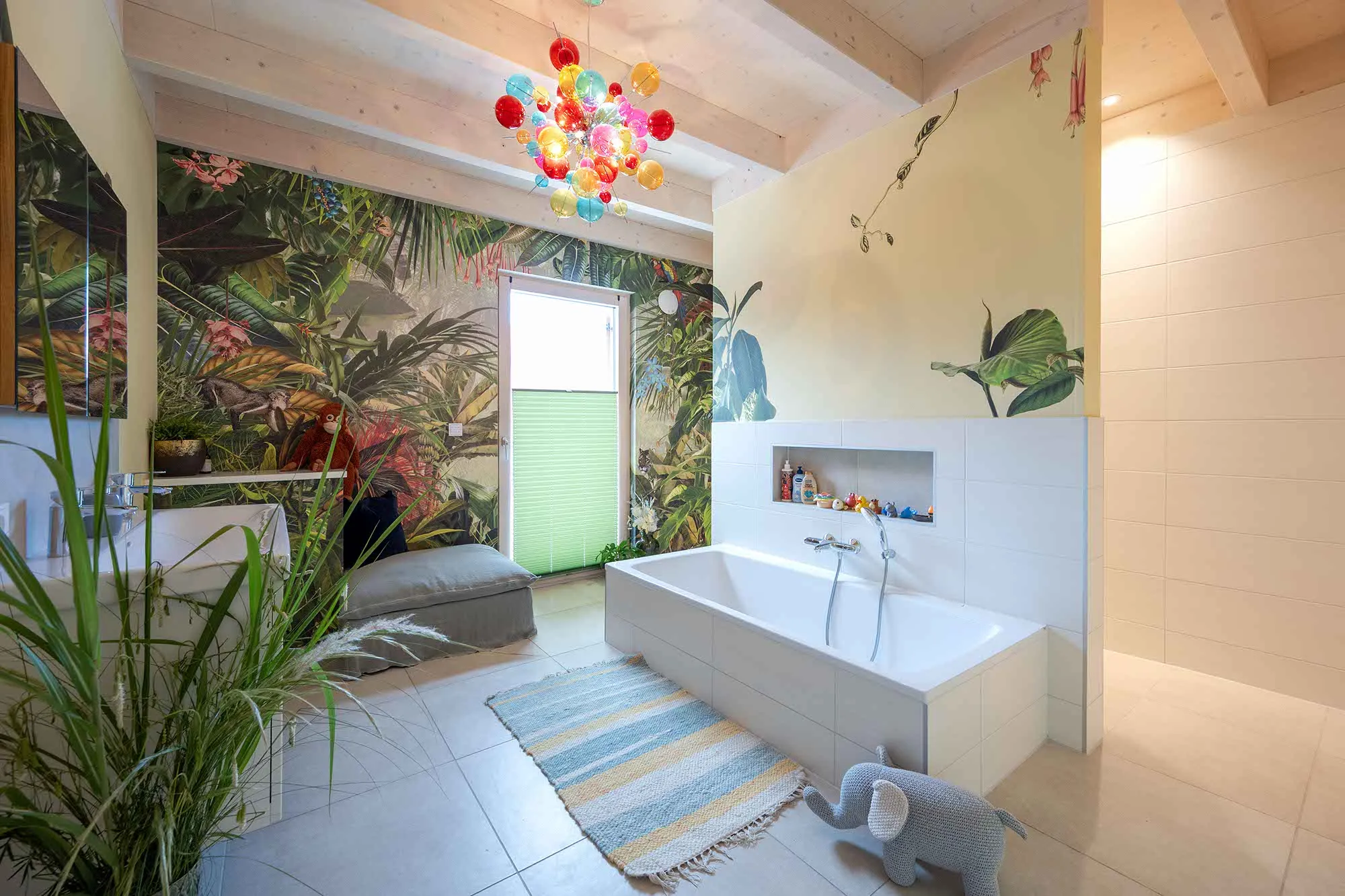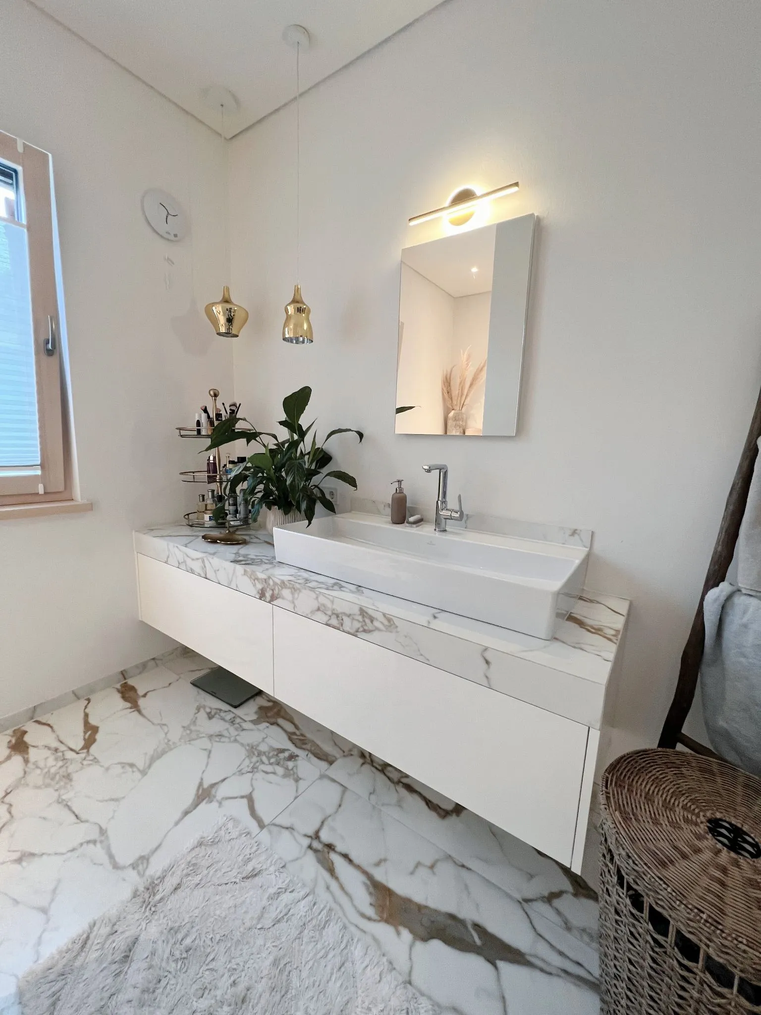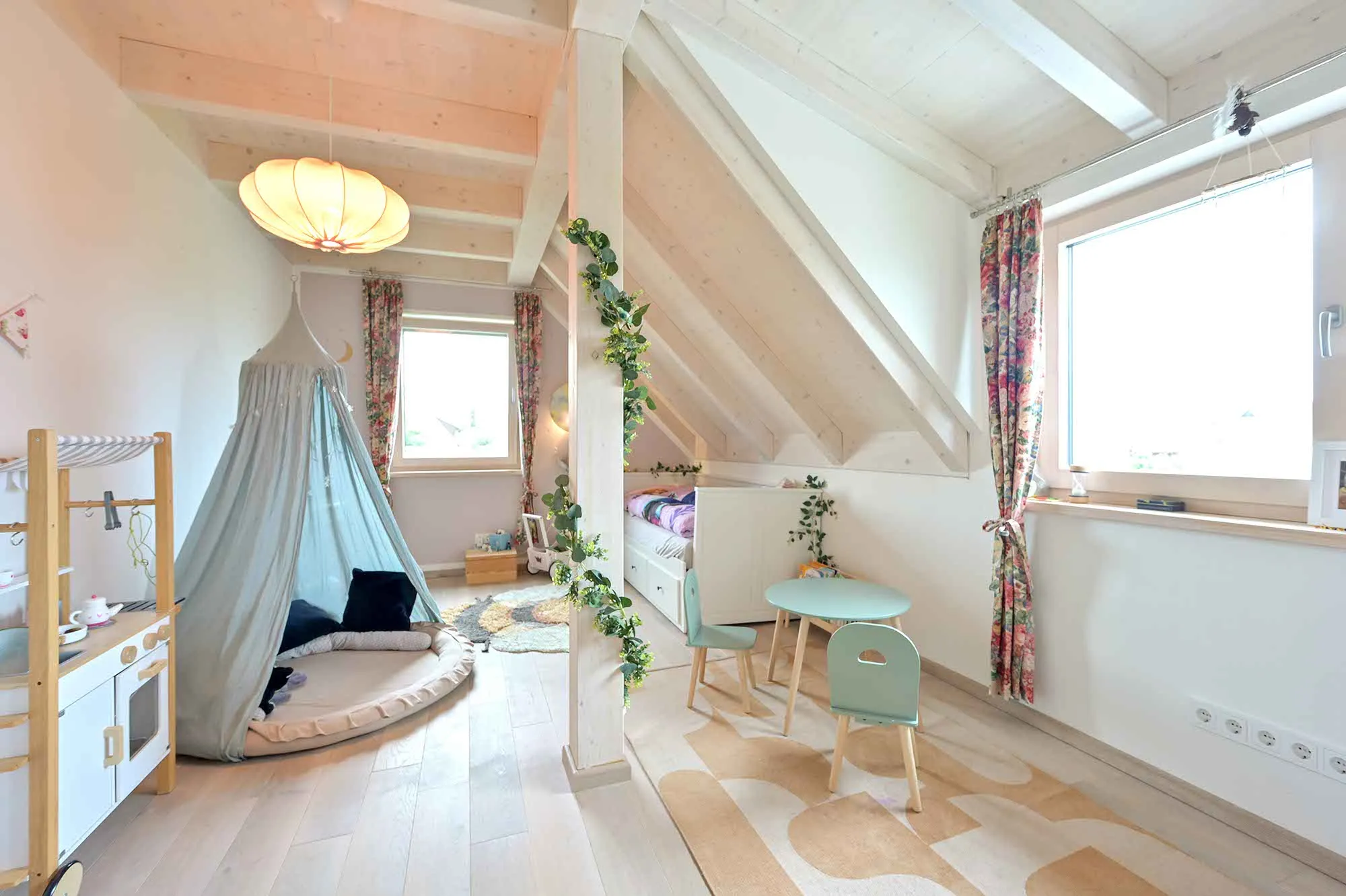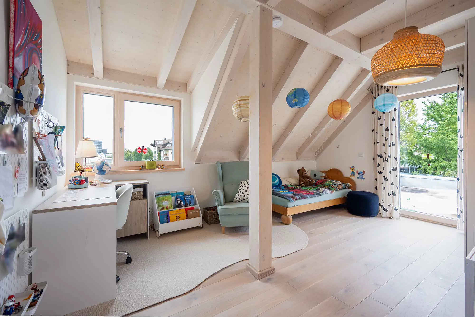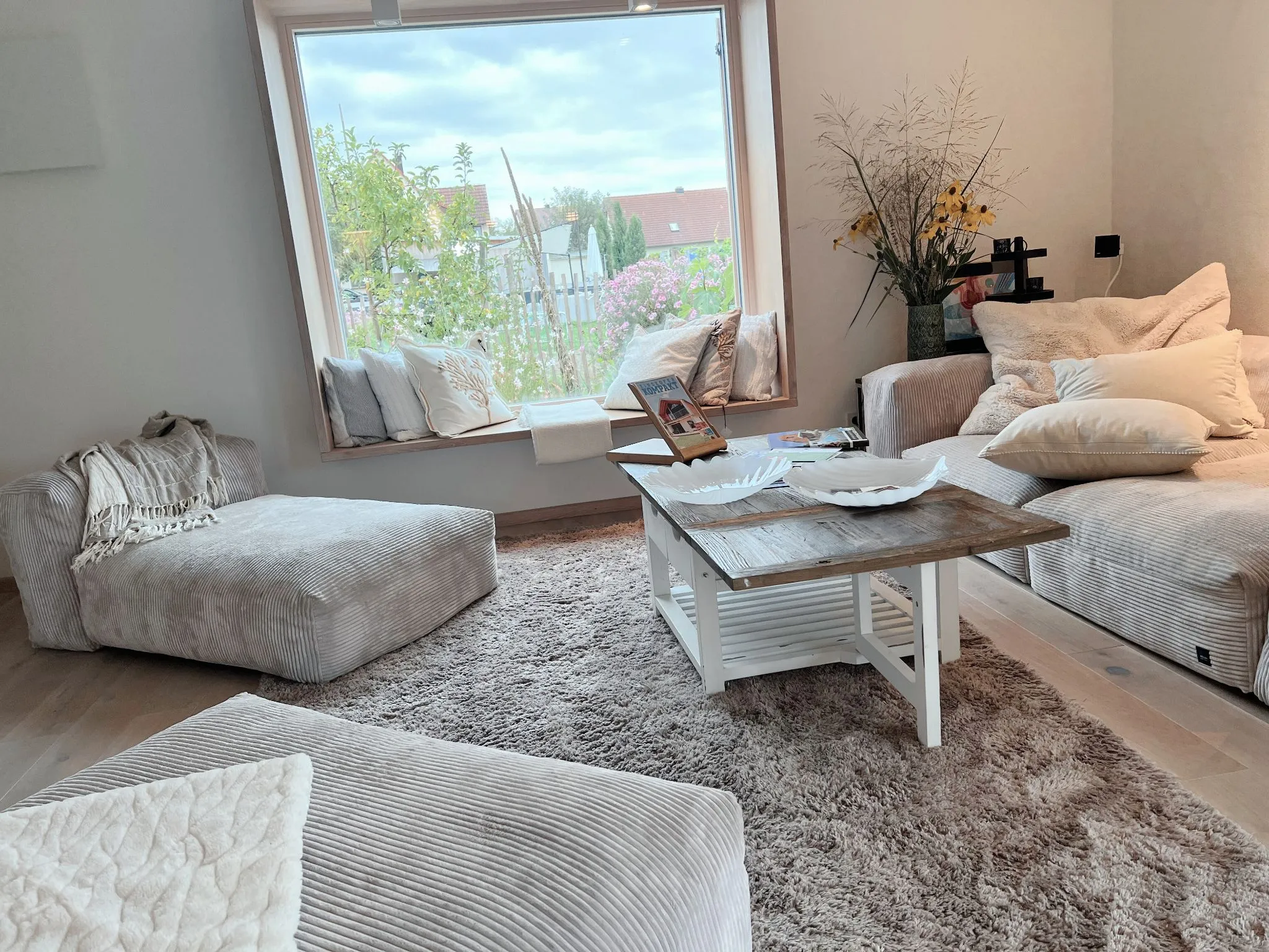 traditionelle, fränkische Bauweise mit Schleppgaube und Fensterläden; versteckter Durchgang in der Küchenfront zur Speisekammer; große Fliesenformate in Marmor-Optik; Mix aus puristischer Inneneinrichtung mit modernen Landhauselementen; mit Leistenschalung optisch abgesetztes Carport